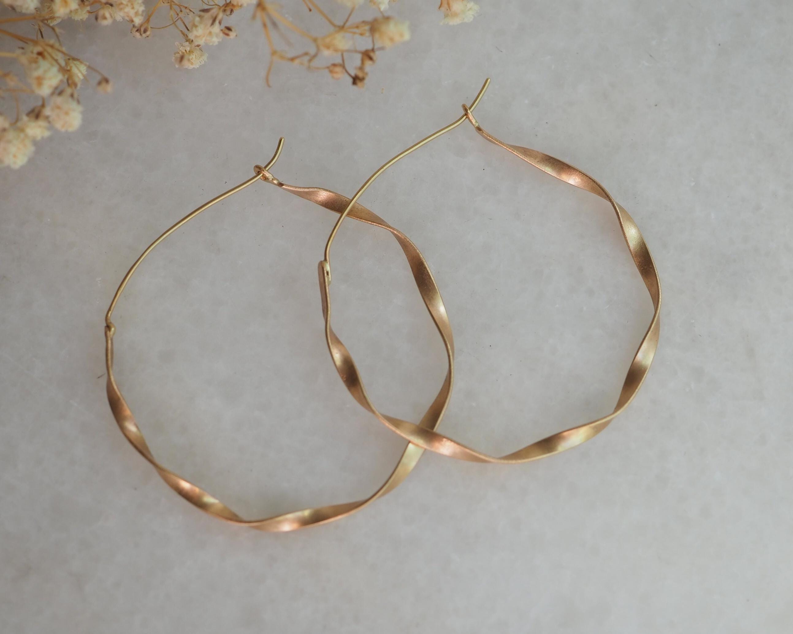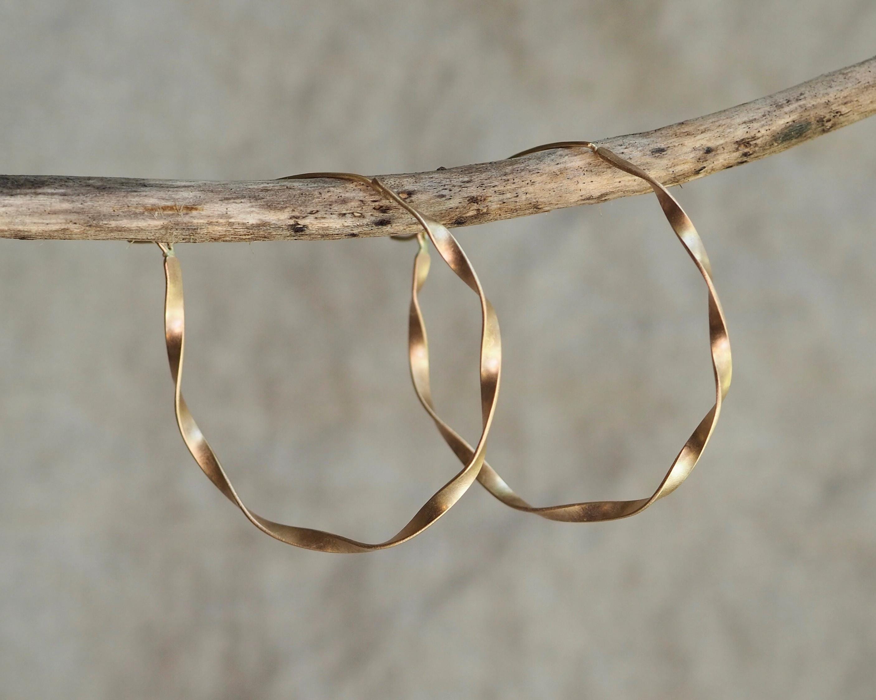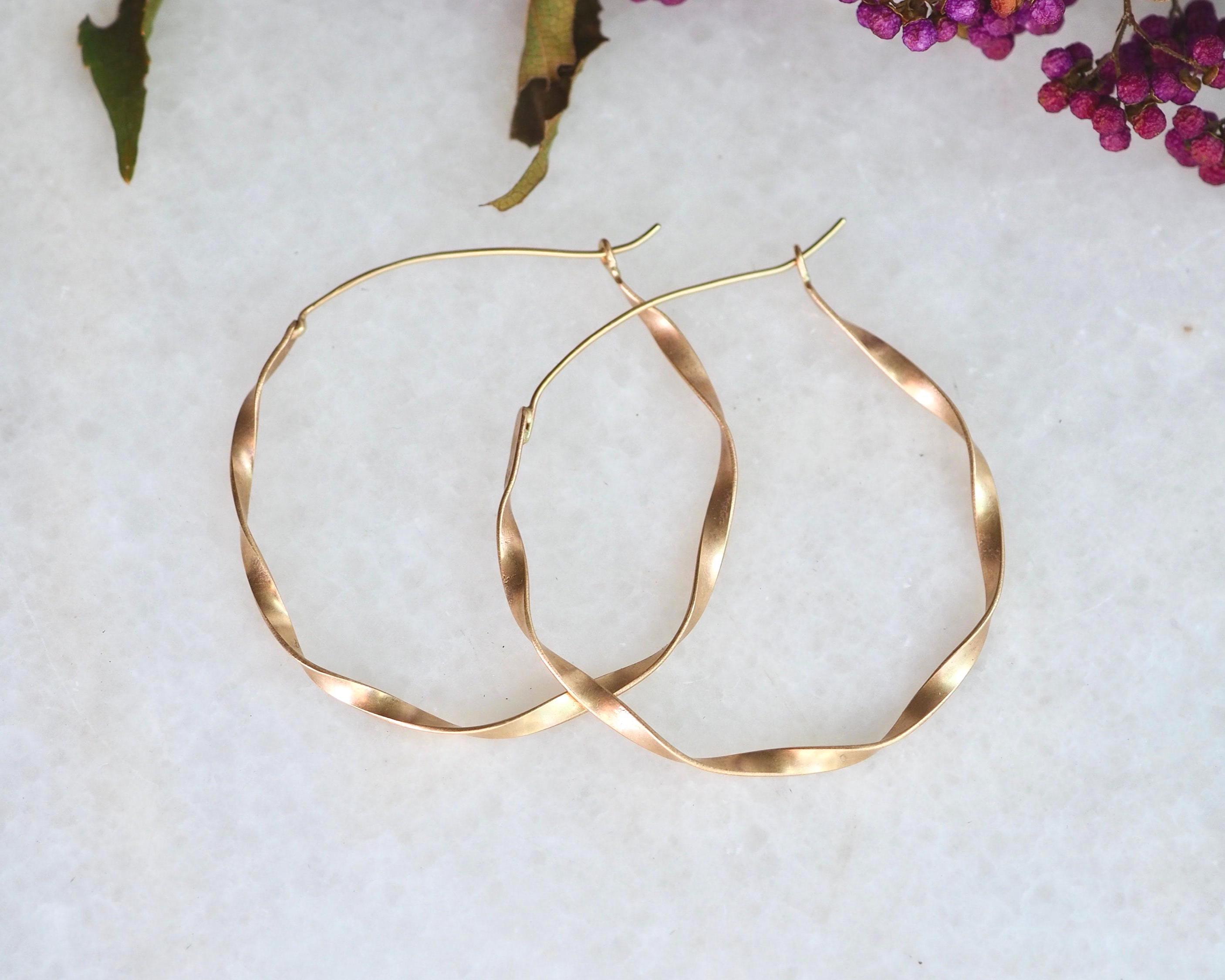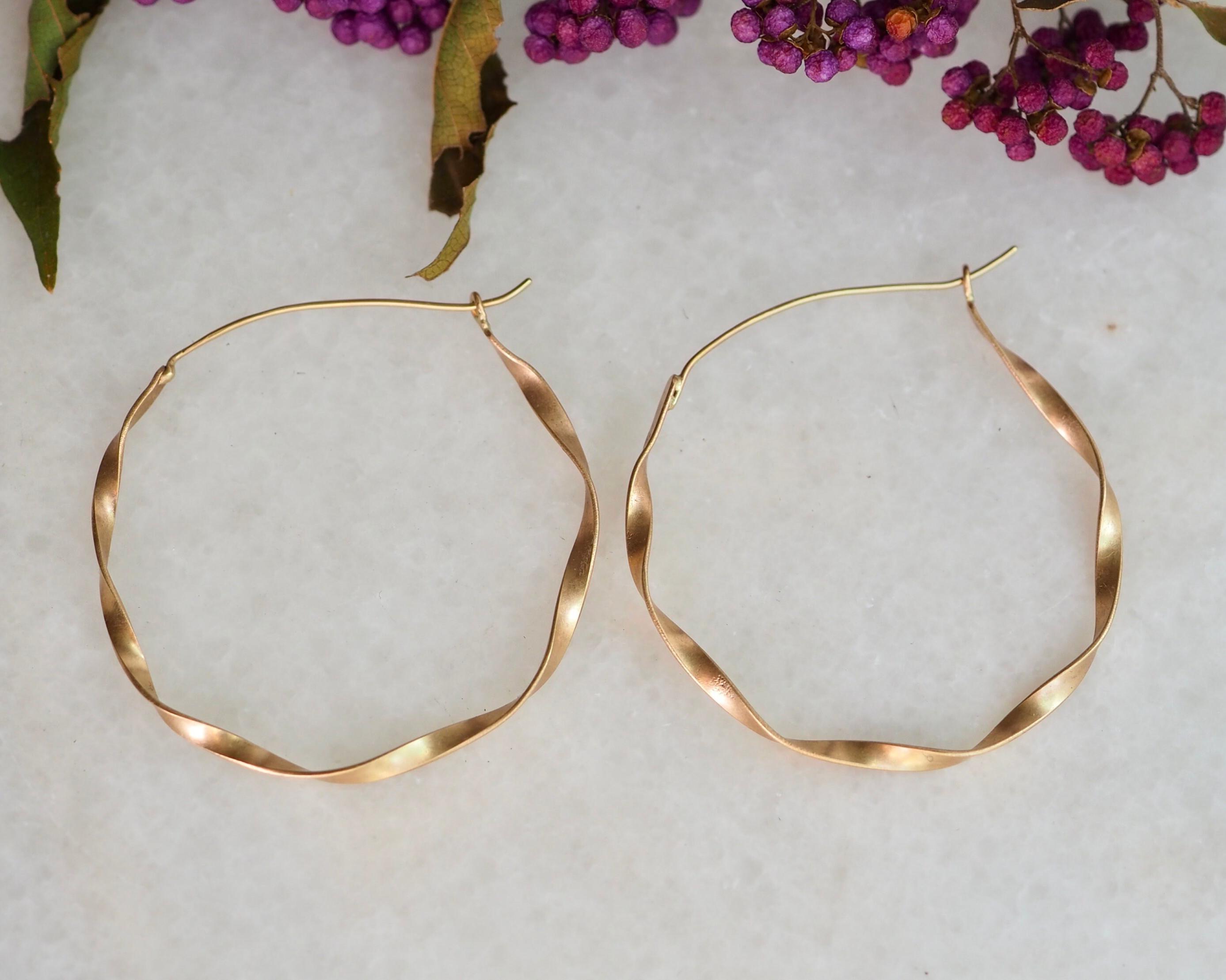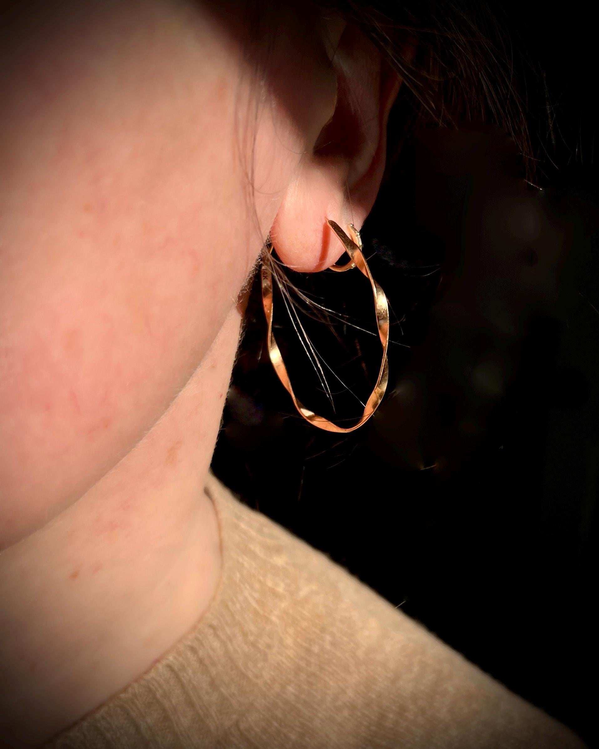 These classic and elegant ribbon hoops were hand twisted, each one in opposite direction. The width of the gold ribbon is 2.5mm and diameter is approximately 1.75 inch (45mm), the ear wires are 21 gauge. These earrings are solid 14k gold, not hollow.