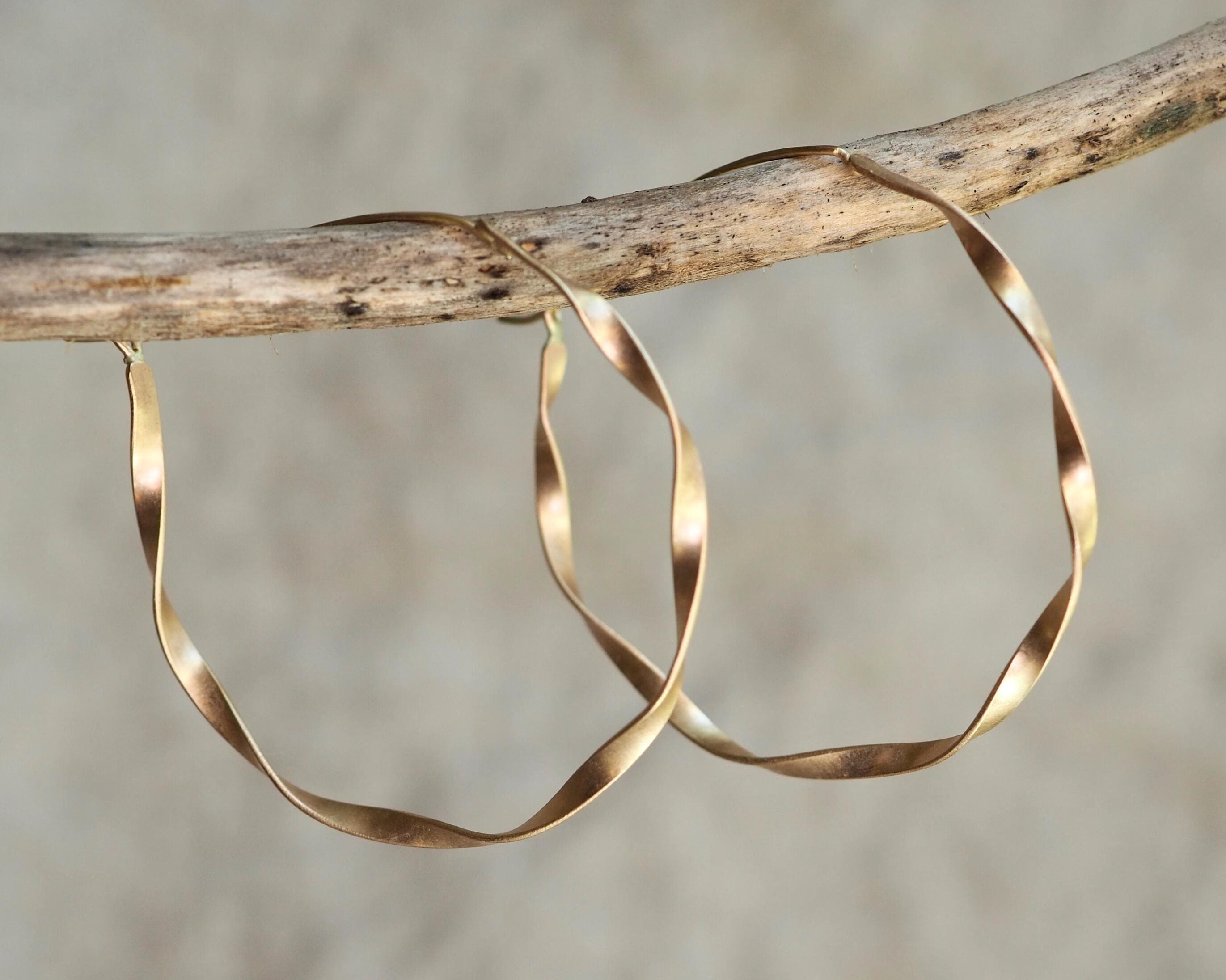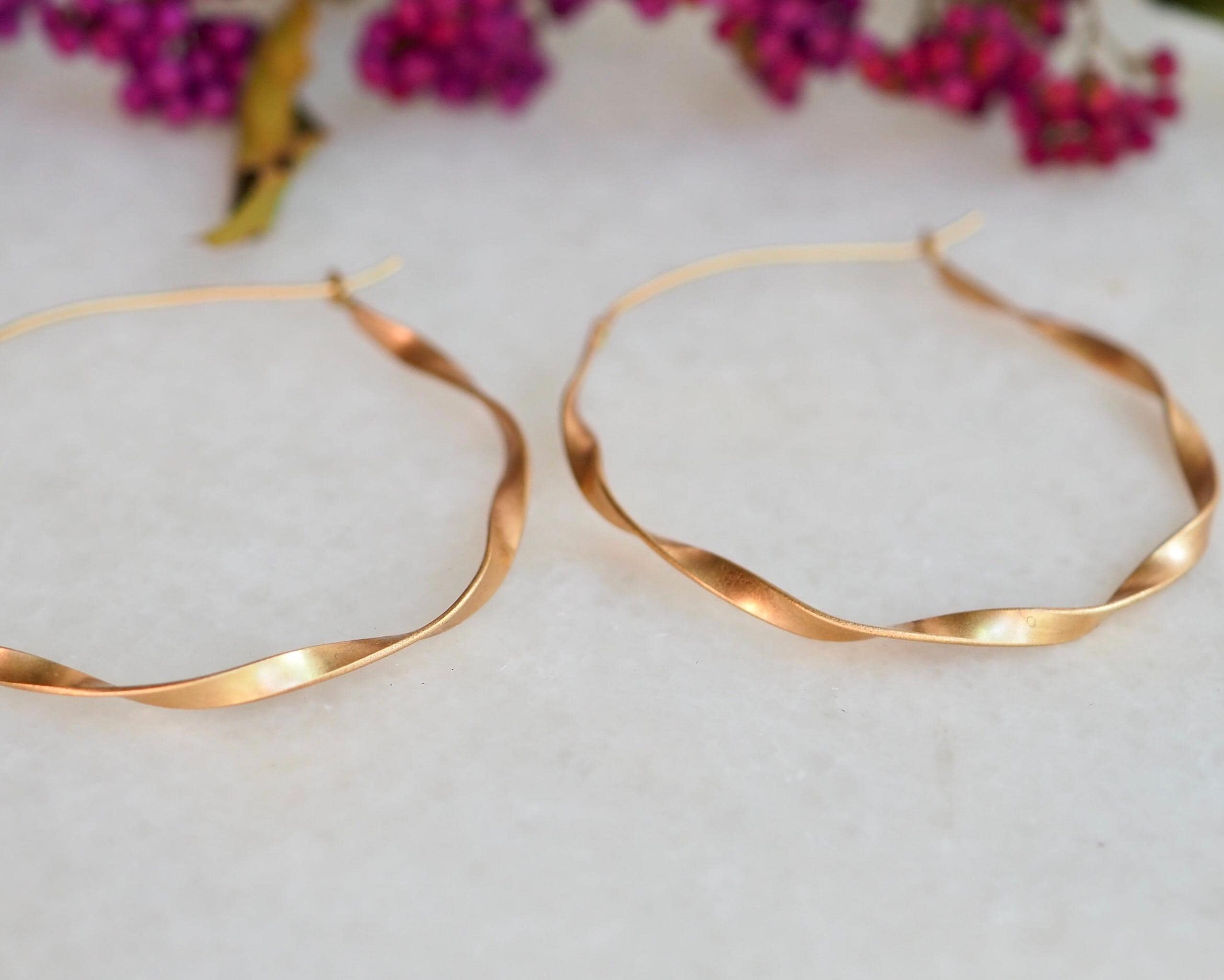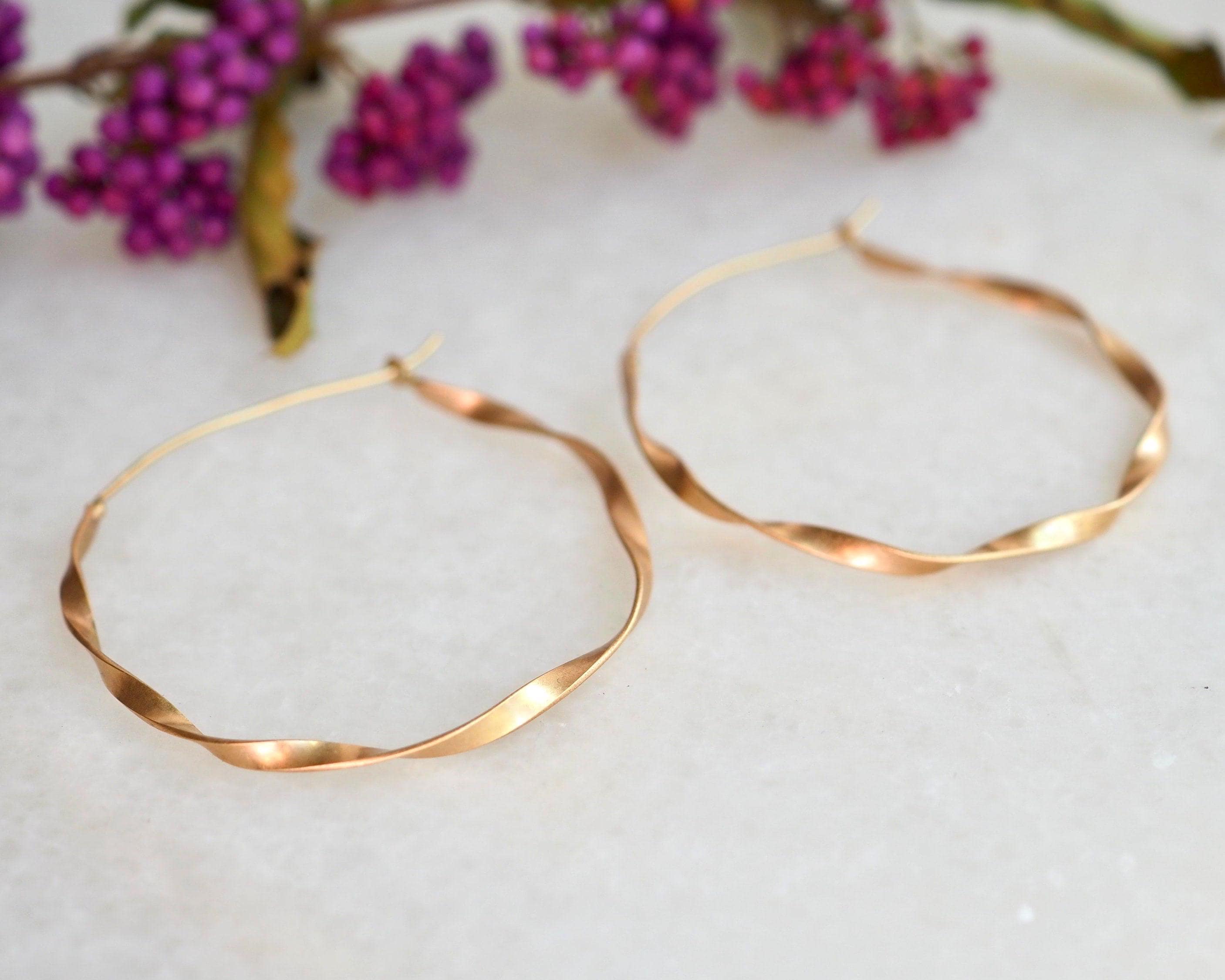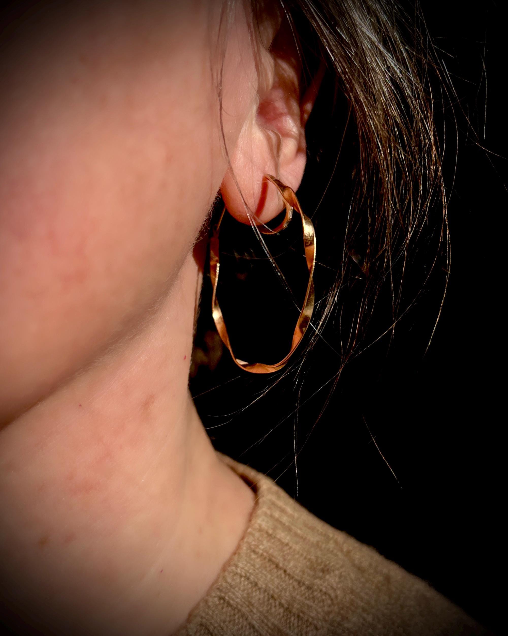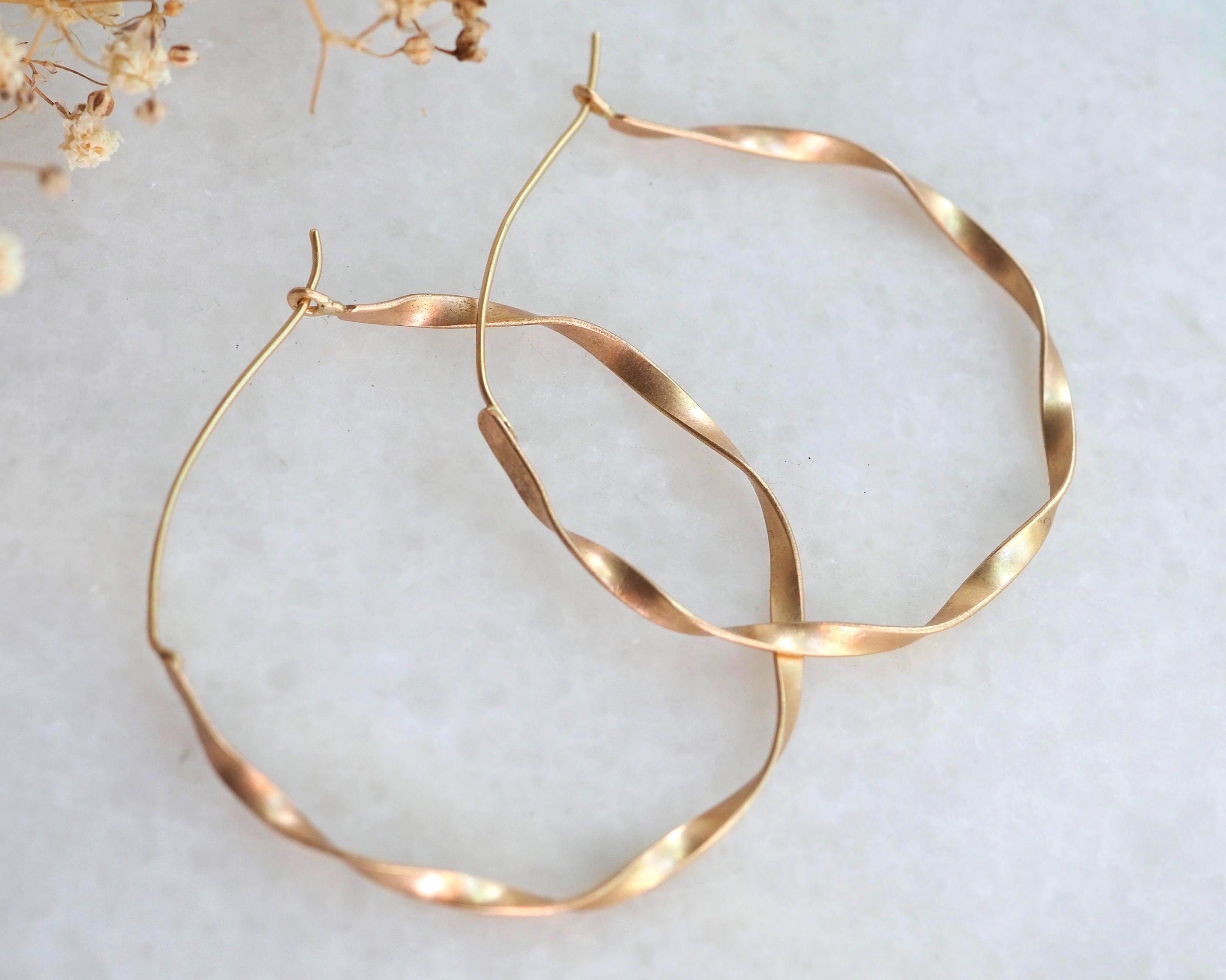 These classic and elegant ribbon hoops were hand twisted, each one in opposite direction. The width of the gold ribbon is 2.5mm and diameter is approximately 1.75 inch (45mm), the ear wires are 21 gauge. These earrings are solid 14k gold, not hollow.