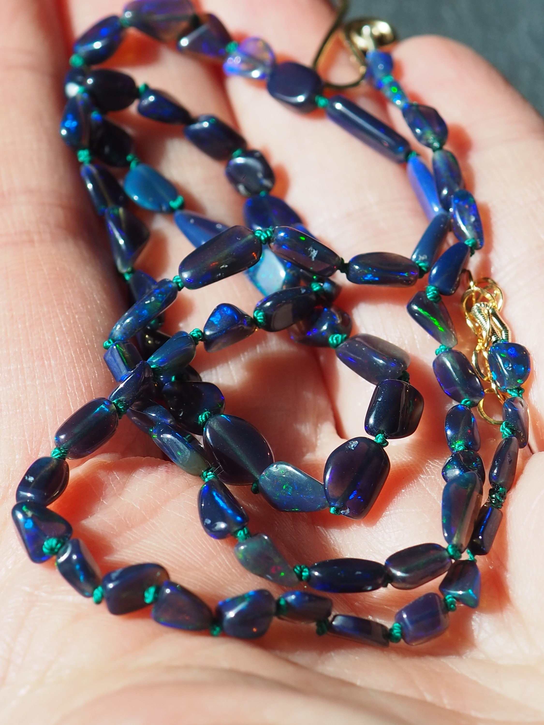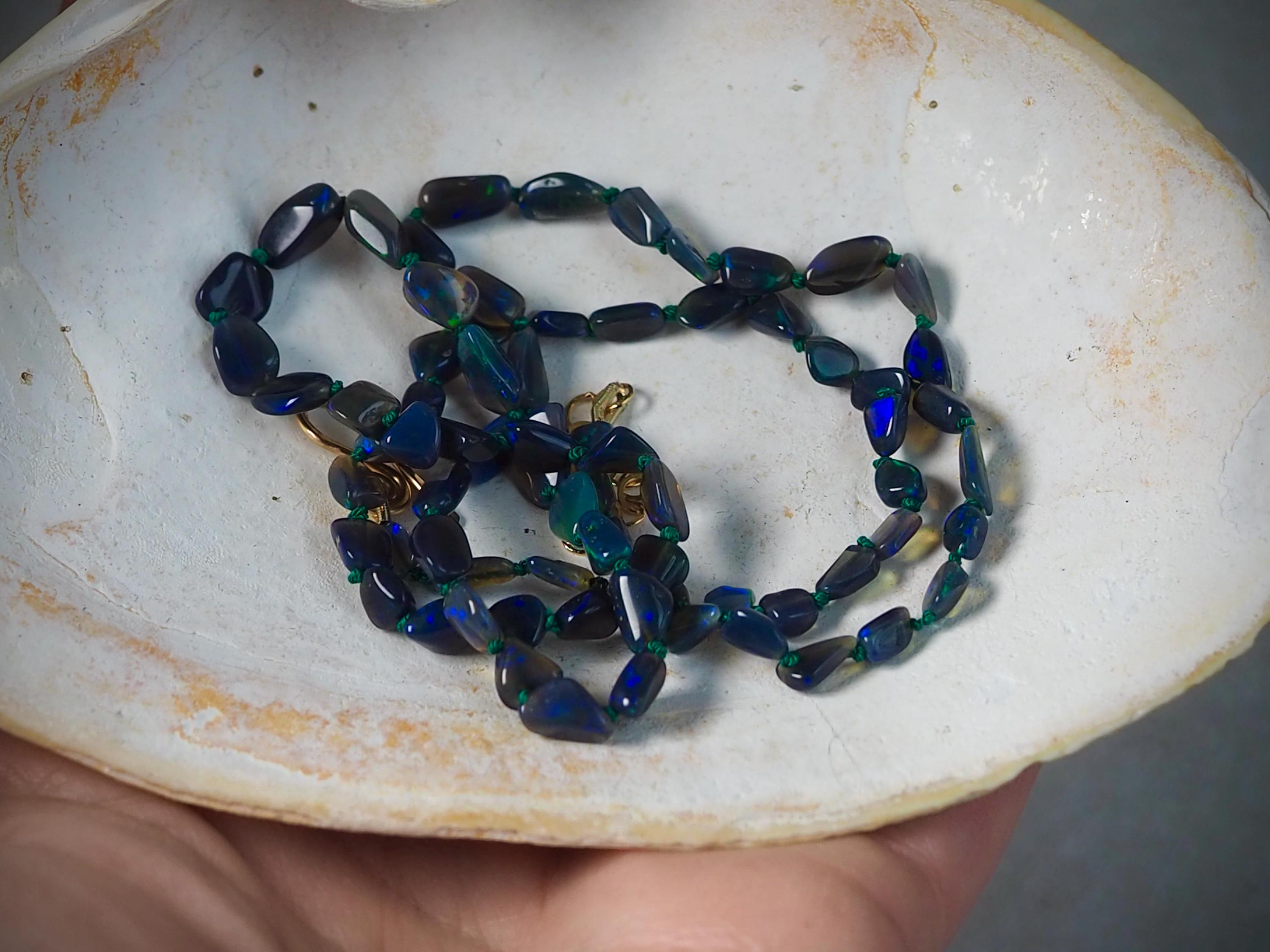 Hand-knotted Ethiopian opal candy style necklace was made with lovely, angular, smooth nugget beads. This premium quality opal has deep blue body; each and every bead having a wonderful play of color with a multitude of gorgeous flashes from green to blue and occasional red. The beads are freeform nuggets. They are graduated and measure approximately 3x4mm to 4x8mm. Hand strung and knotted in the candy style on emerald green silk thread for durability and strength, this is a beautiful piece to wear alone or layered. The necklace is 19.5 inches long, plus a 1.5” gold filled extender chain. It is finished with 14/20 gold filled handmade hook clasp.