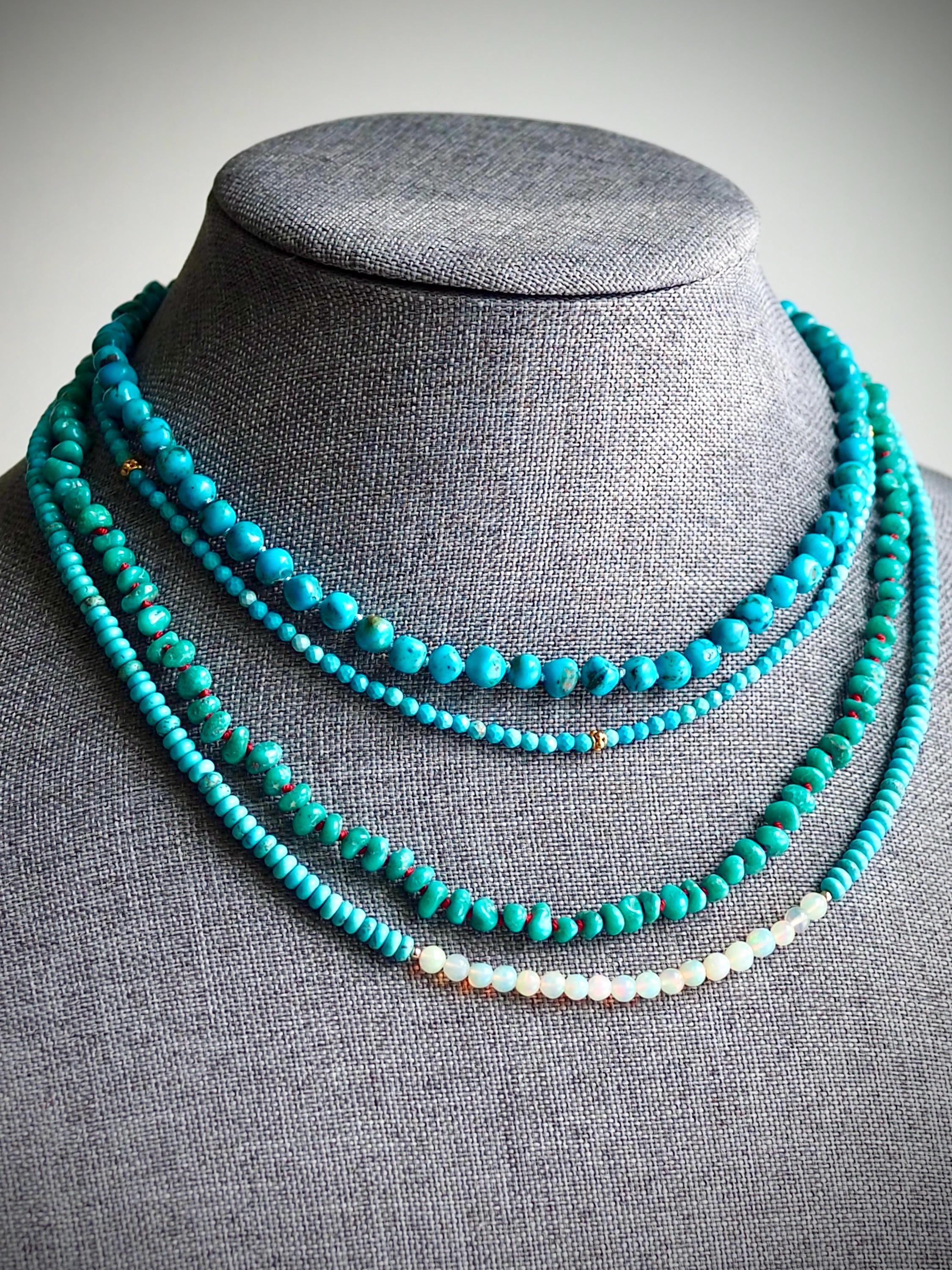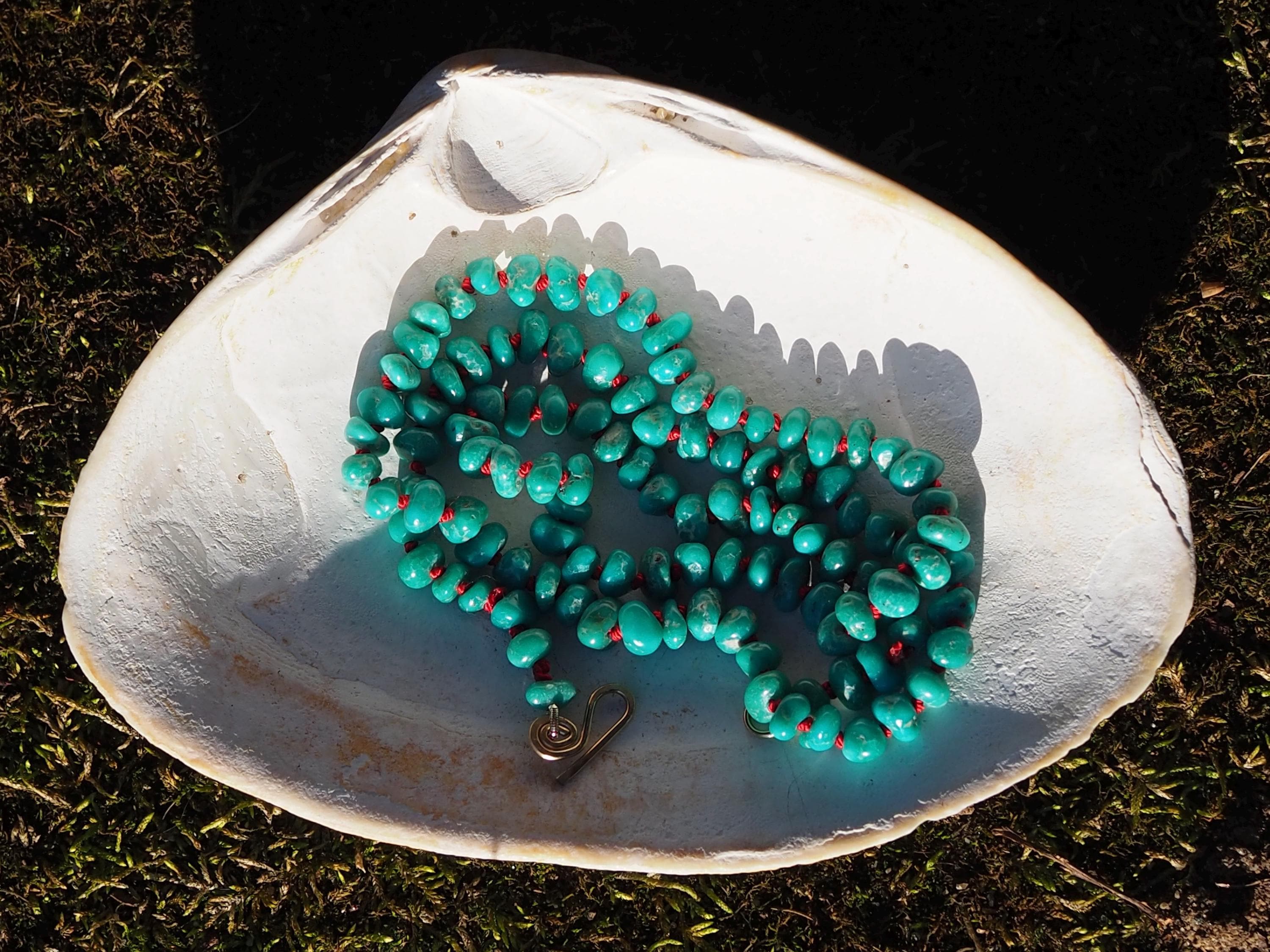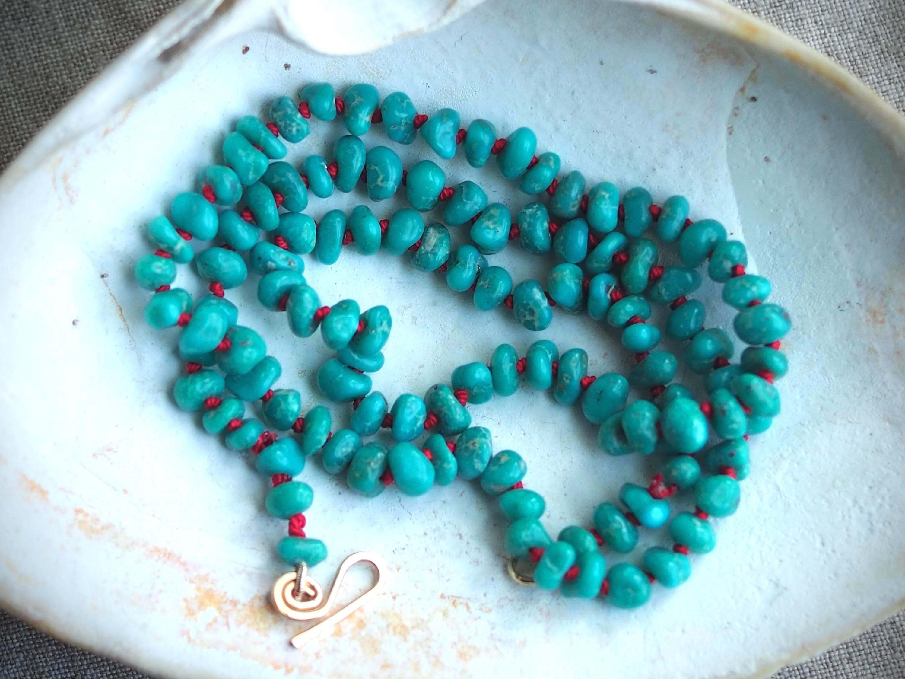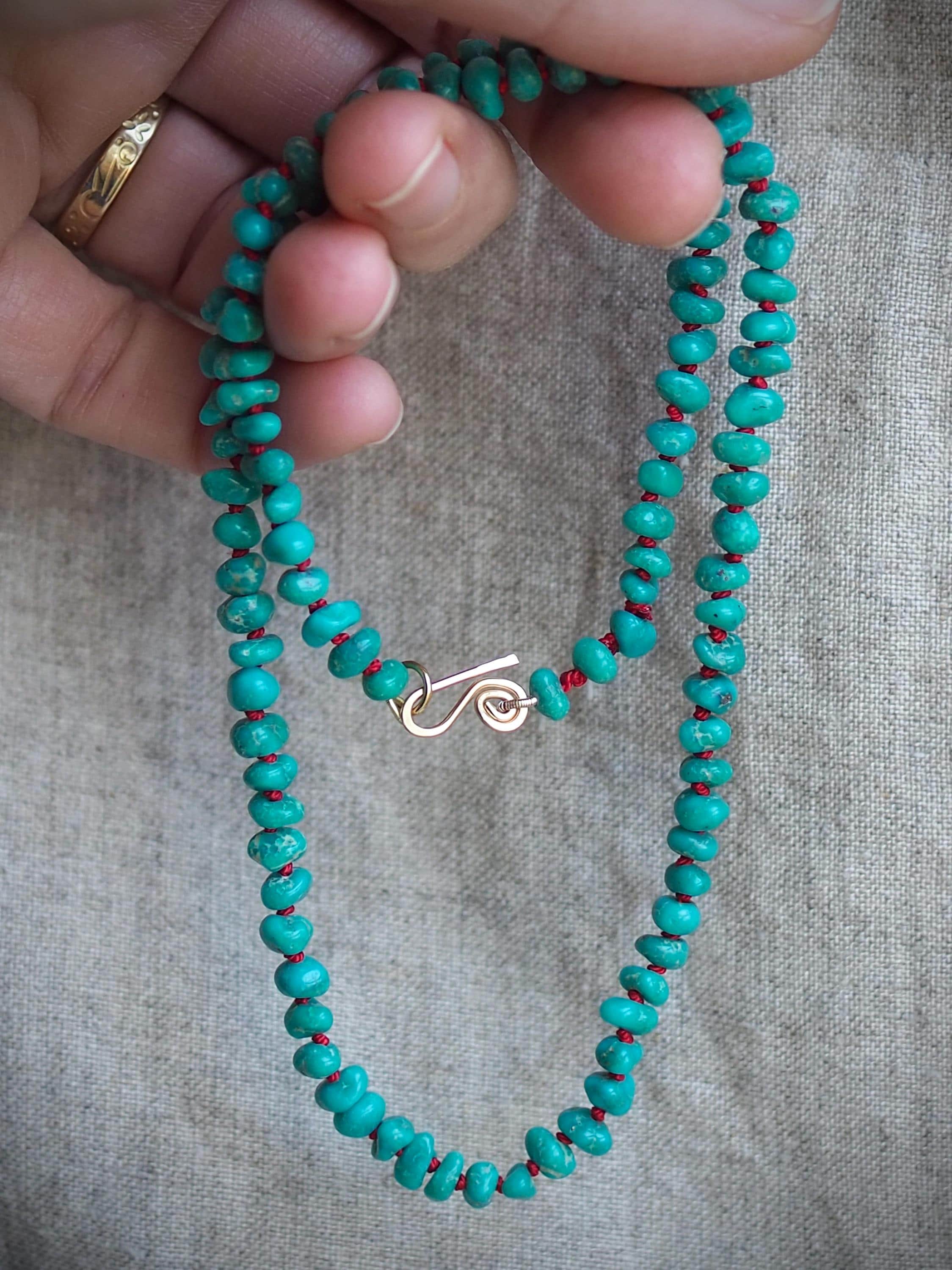 Natural, undyed Whitewater turquoise nuggets are meticulously hand knotted on cheerful bright red silk, and finished with a handmade gold filled hook clasp. The turquoise has a very nice aqua blue color with slight teal undertone, and occasional light colored matrix. It was sourced from the Campitos turquoise mine in the Sonora area of Mexico
