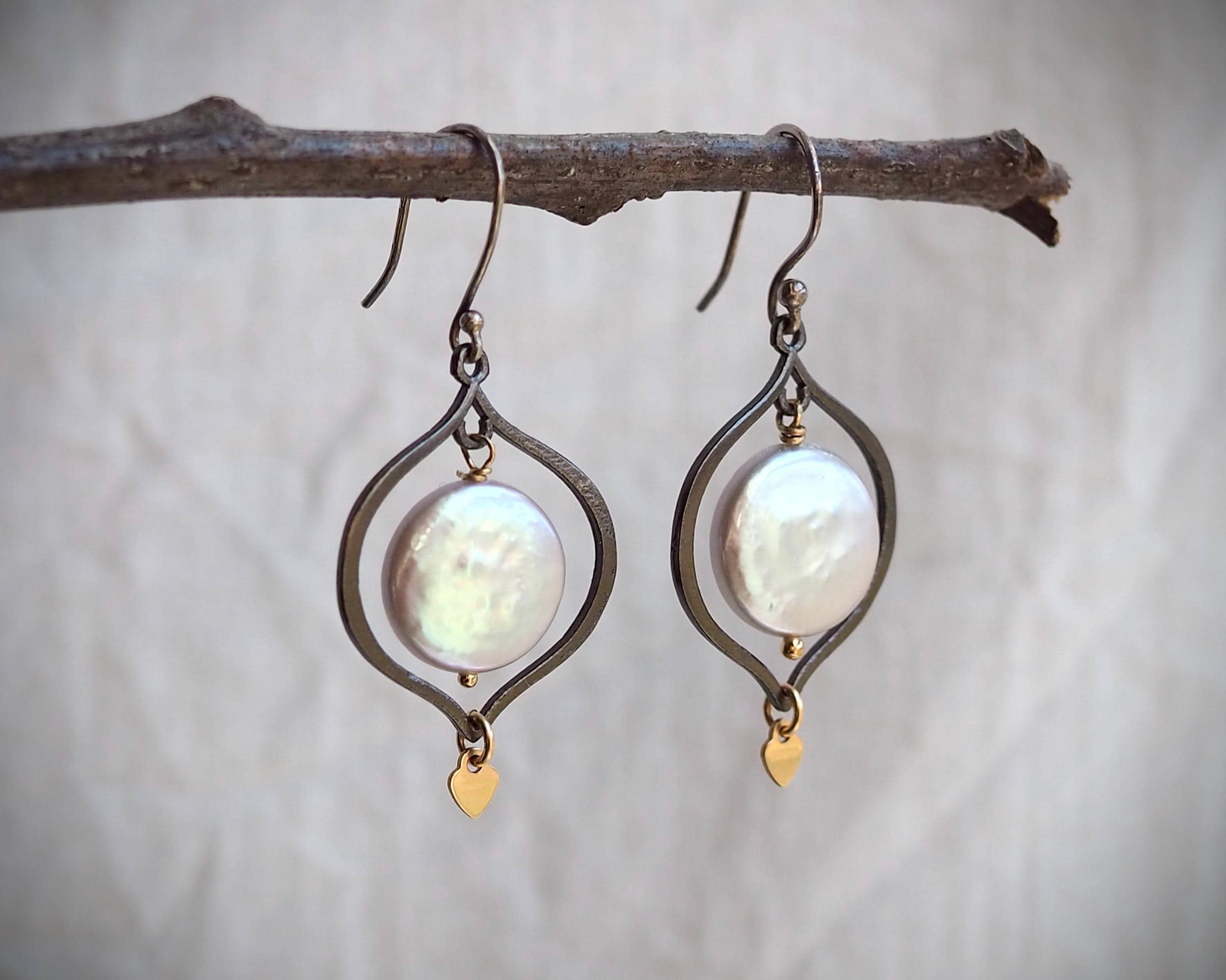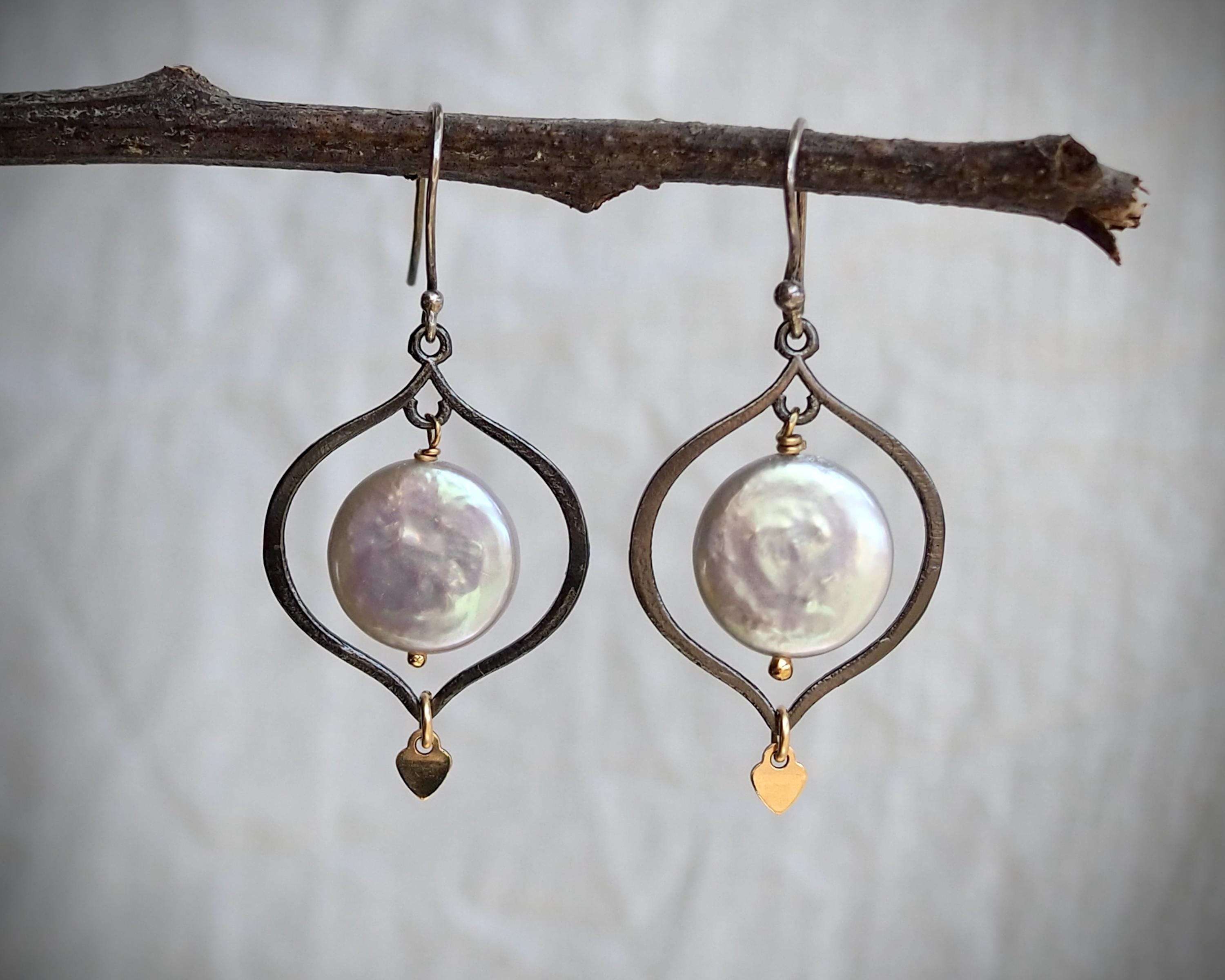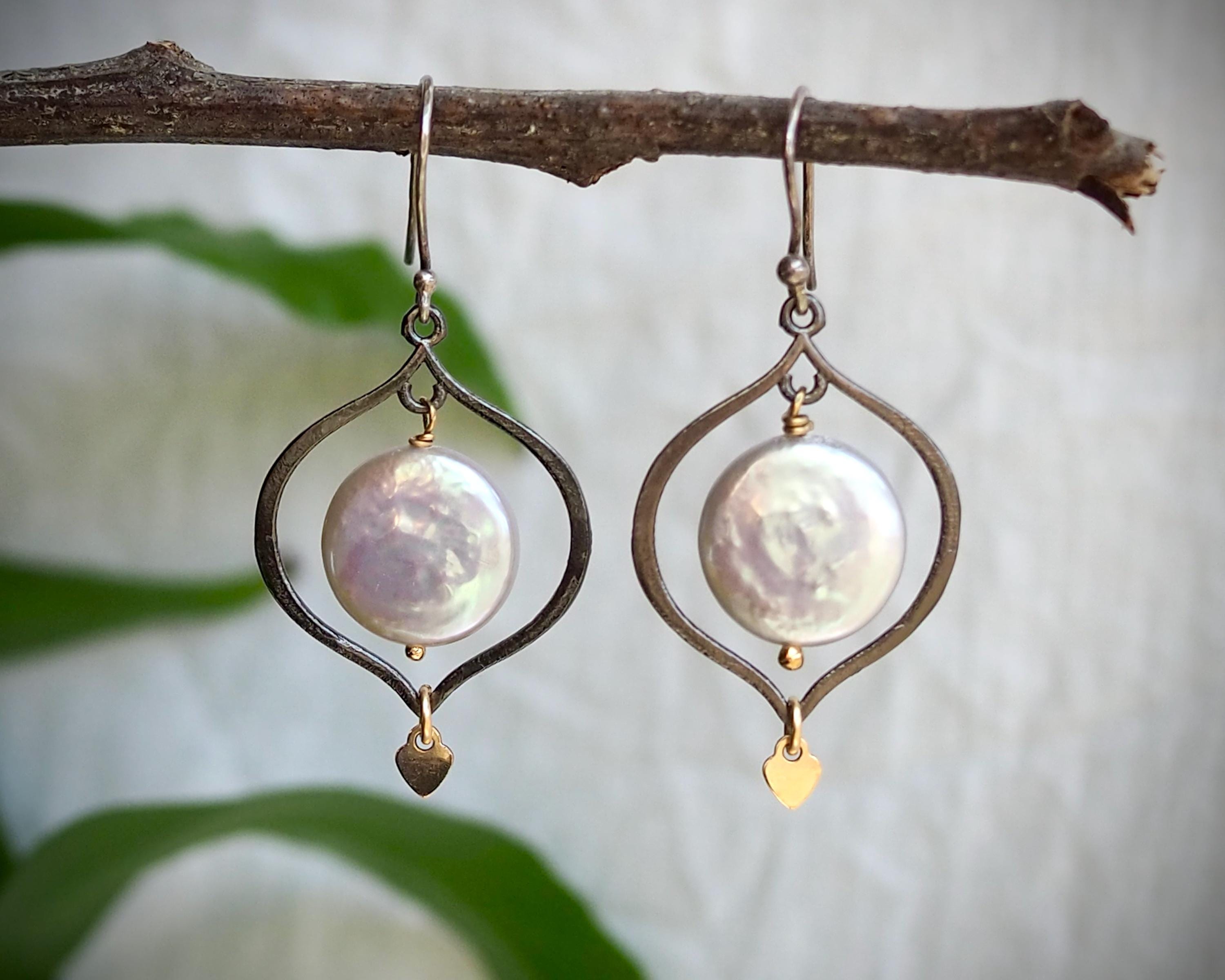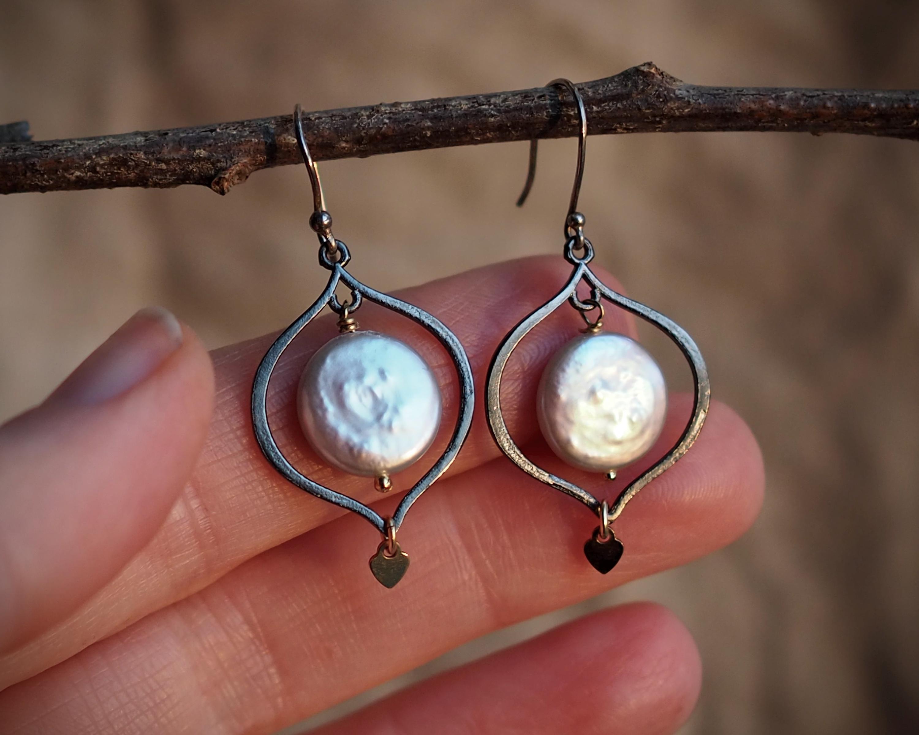 Lovely white coin pearls are paired with darkened sterling silver lotus petals, and tiny gold filled heart dangles. The earrings have classic sterling silver French hooks.