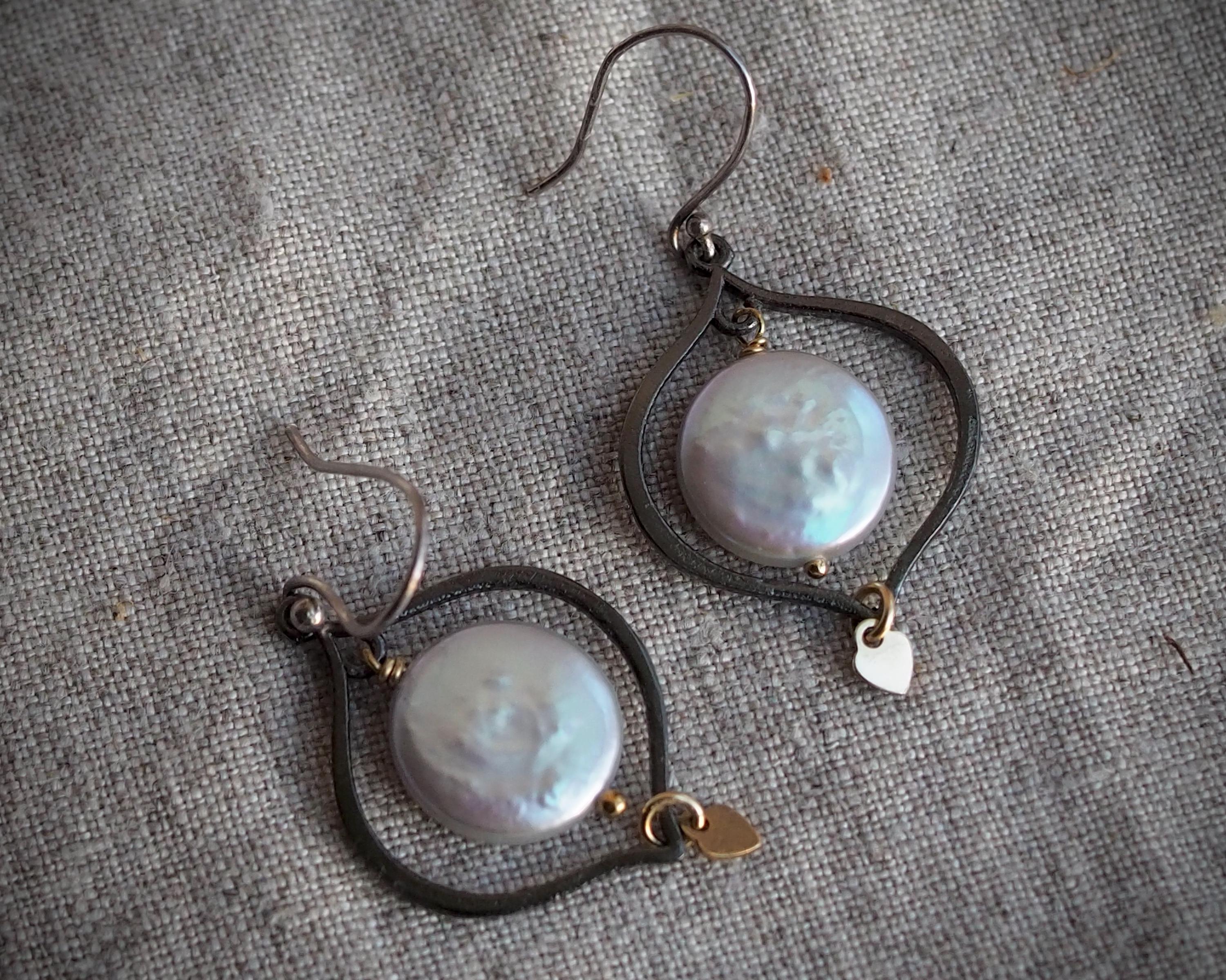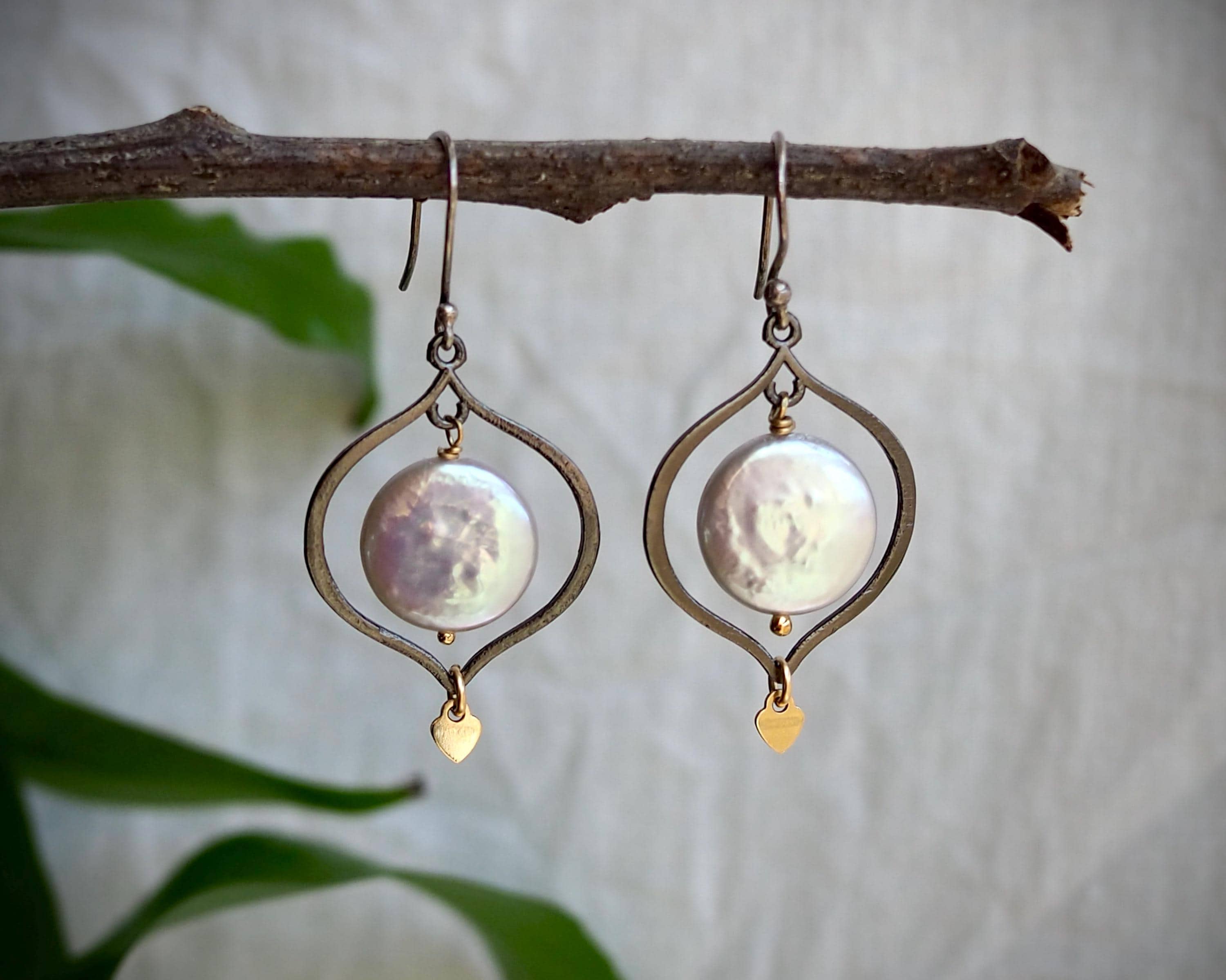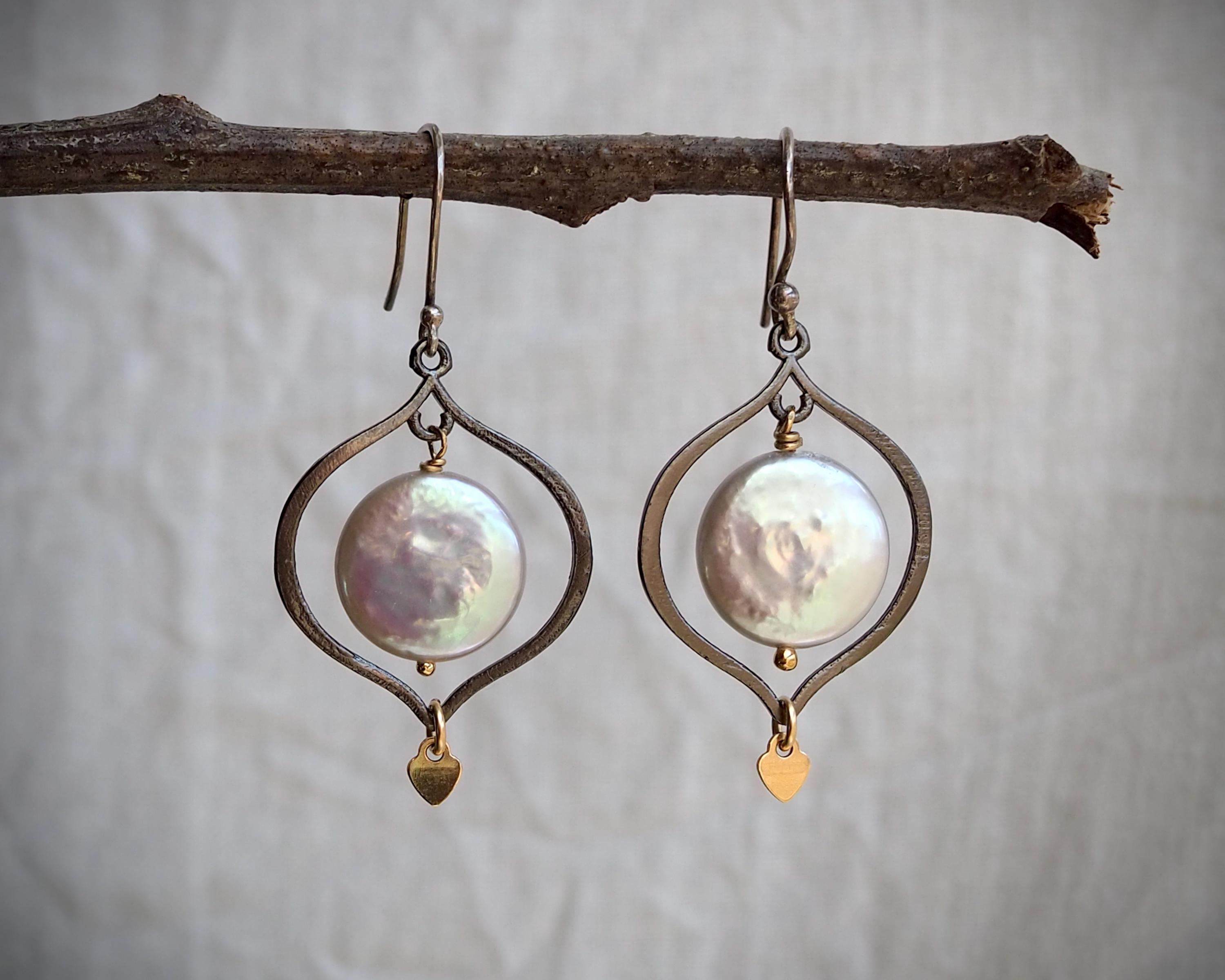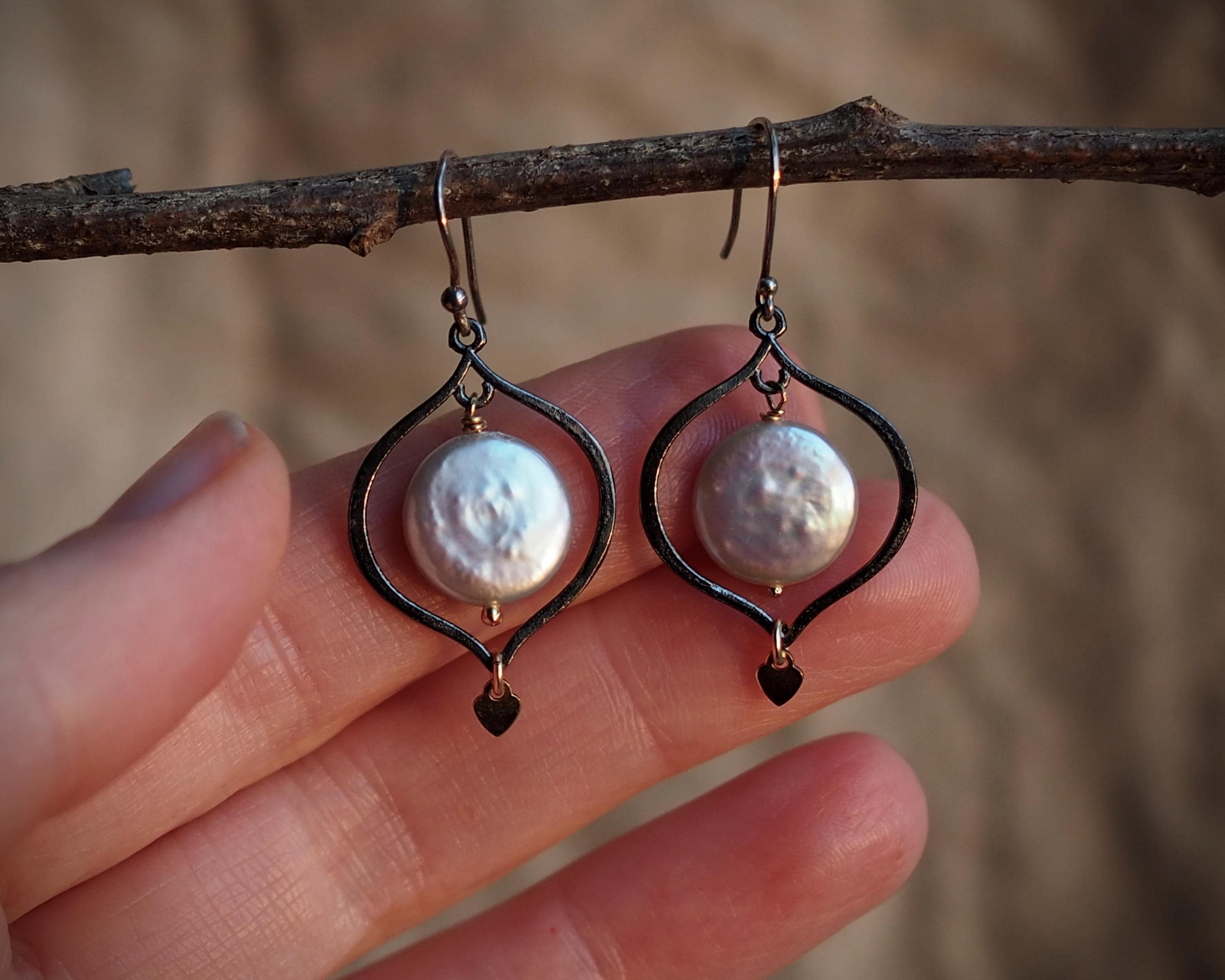 Lovely white coin pearls are paired with darkened sterling silver lotus petals, and tiny gold filled heart dangles. The earrings have classic sterling silver French hooks.