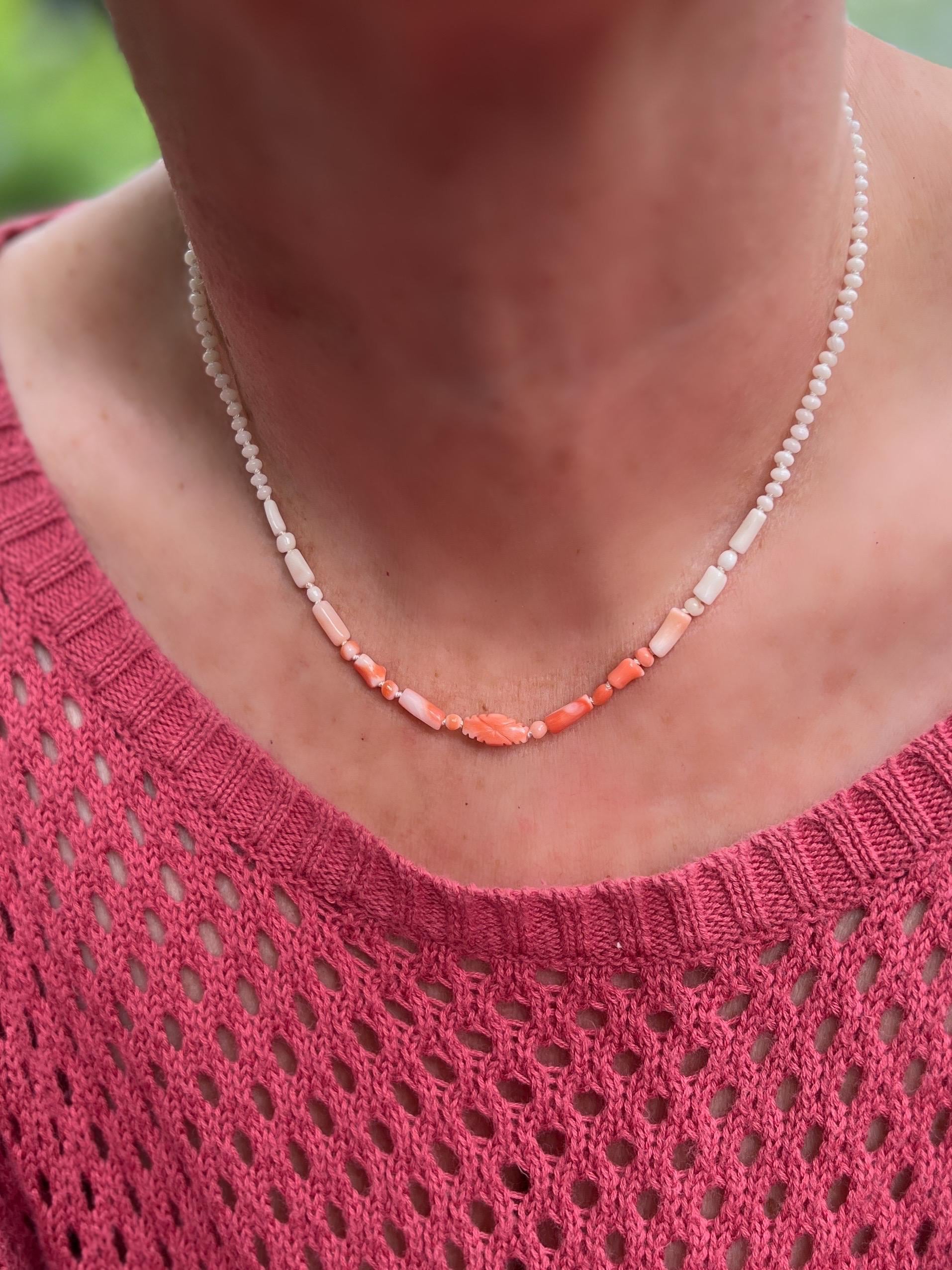 .The beads are hand knotted on white silk and finished with a handmade gold filled hook clasp and 2" chain with tiniest little coral dangle.