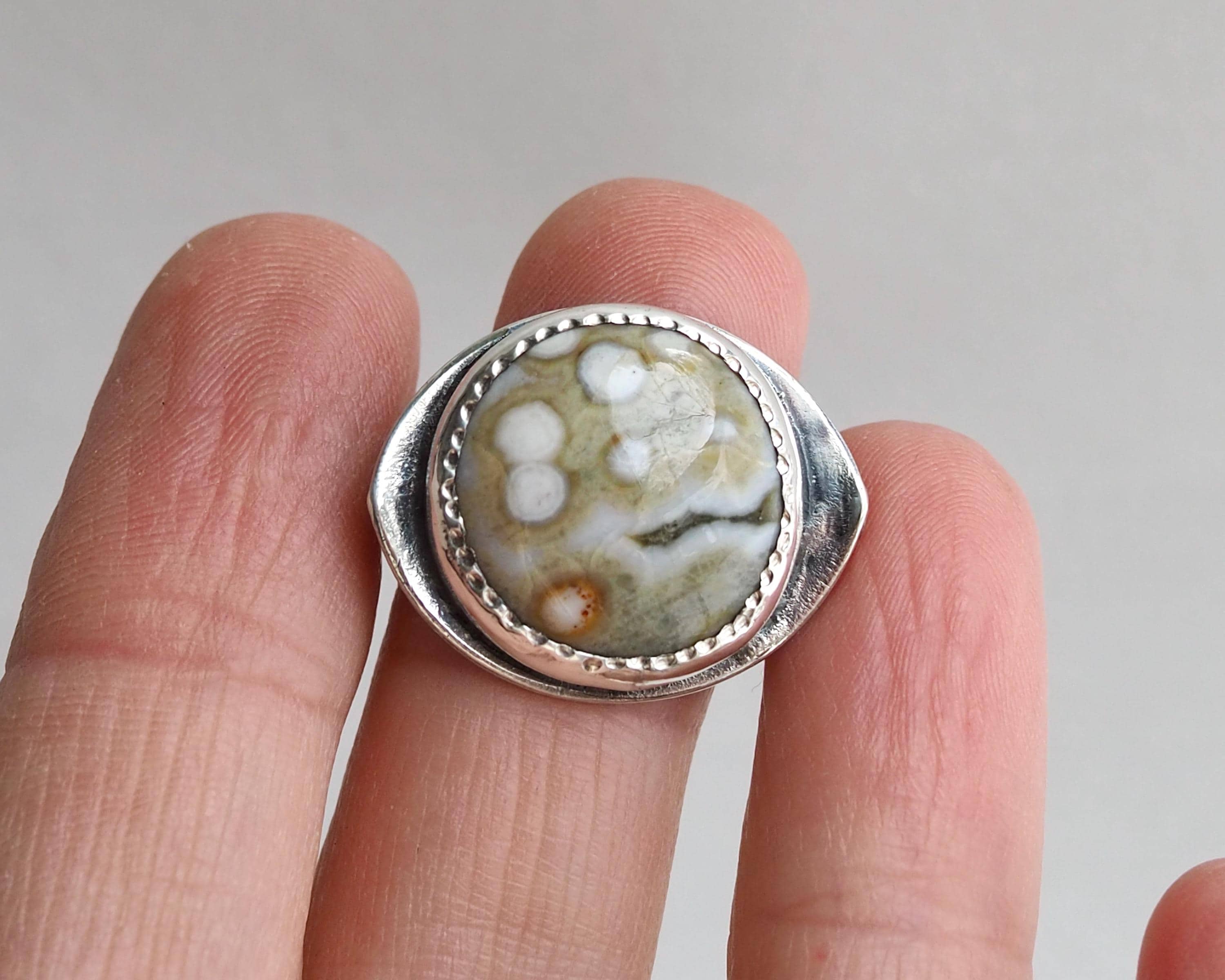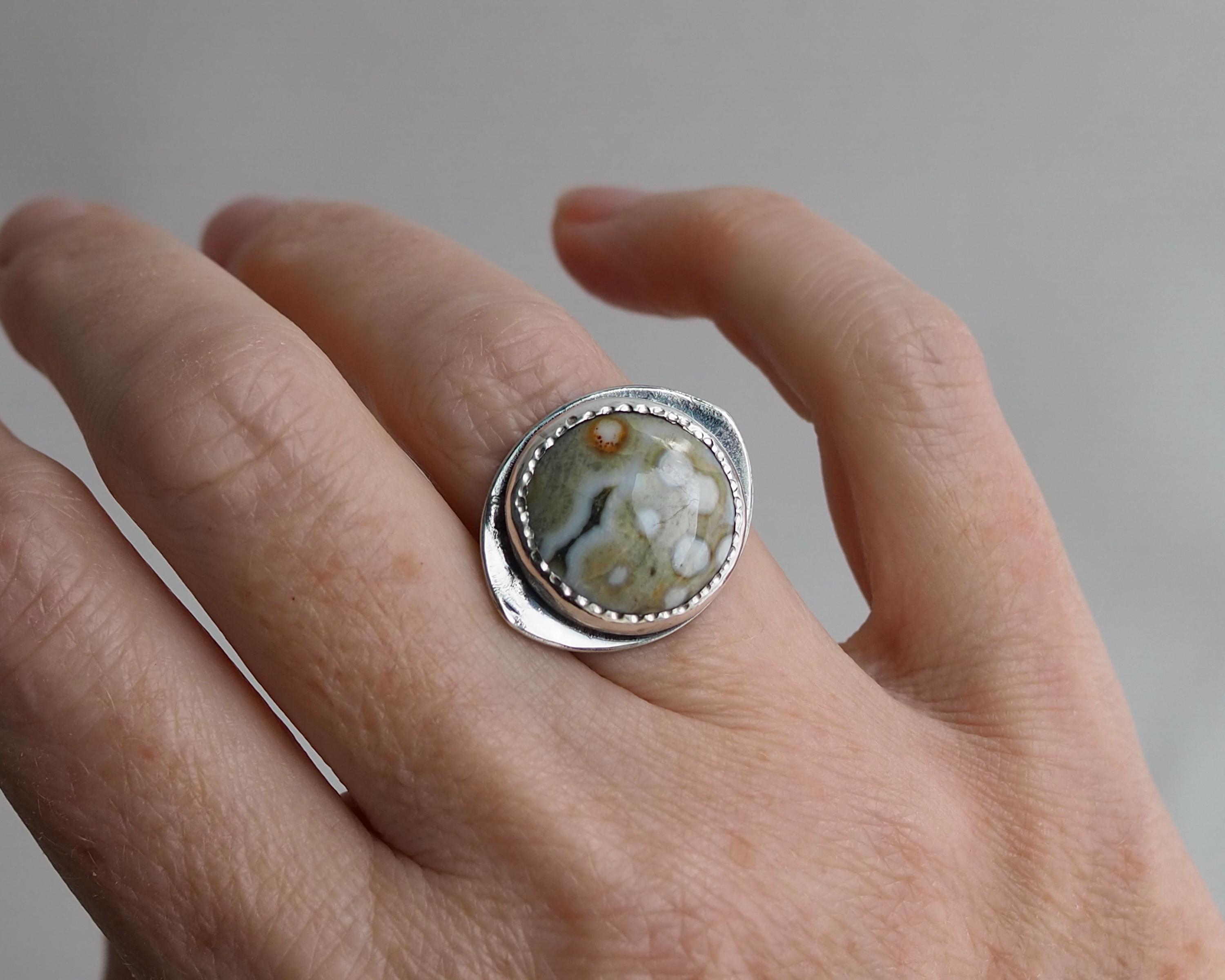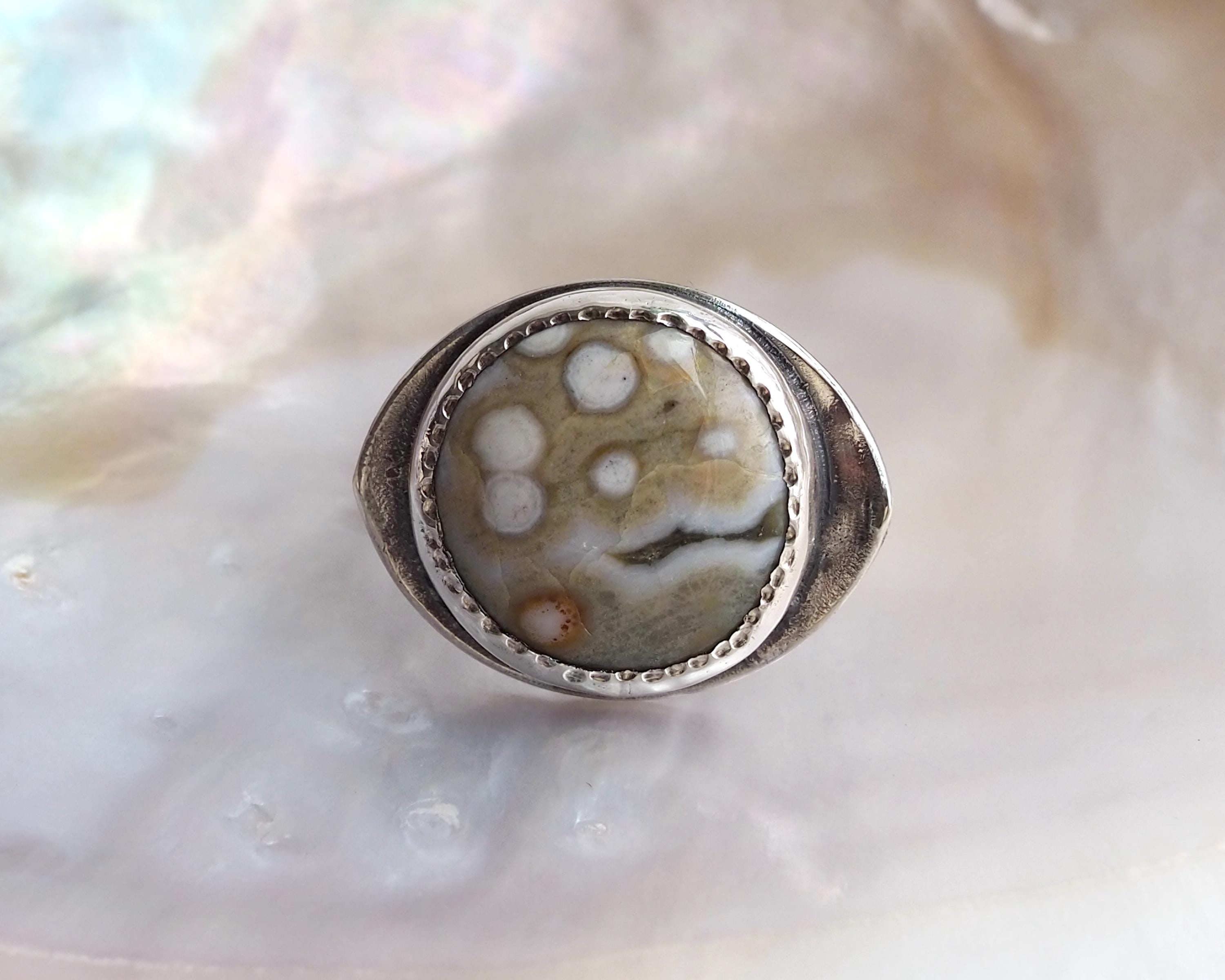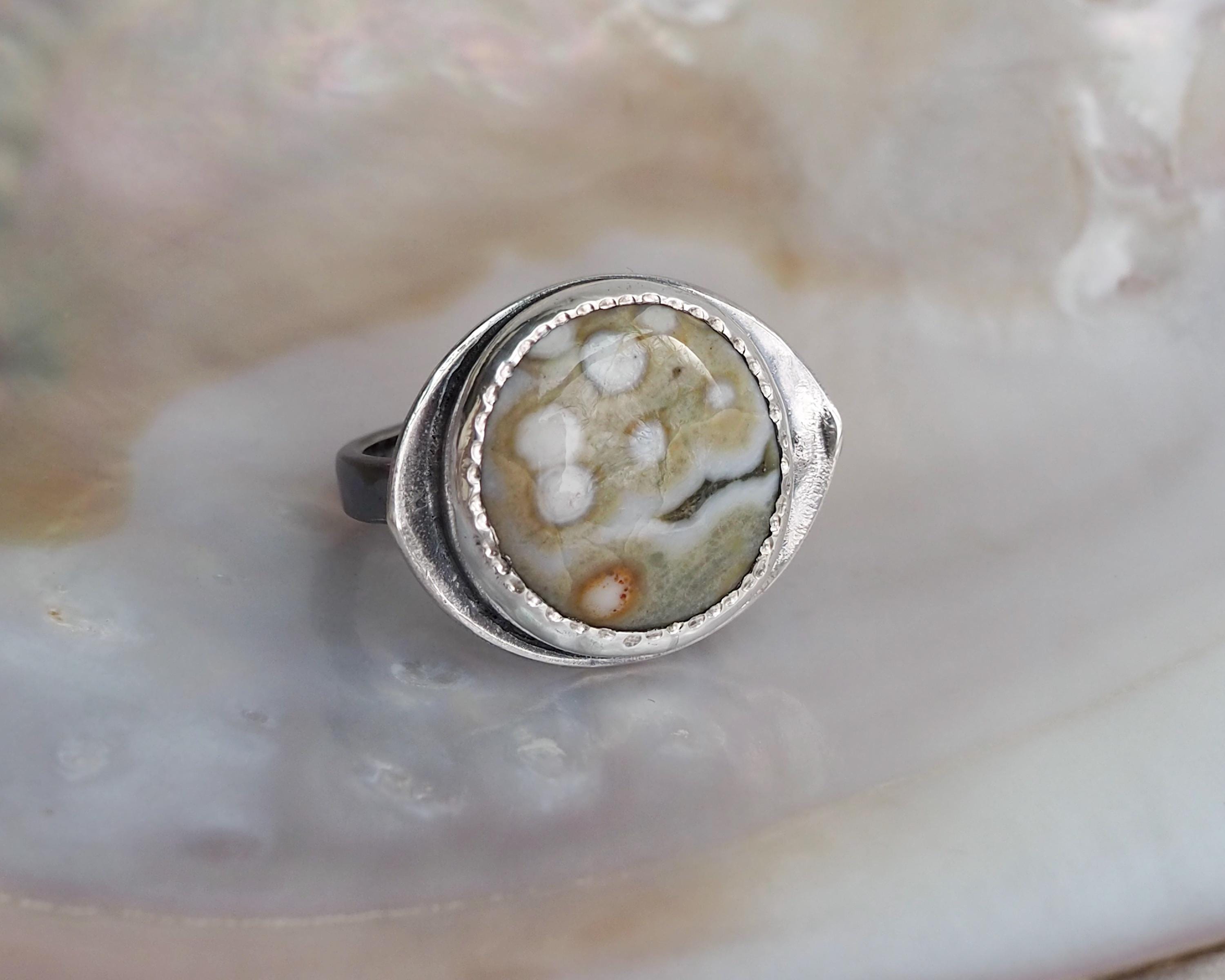 This Orbicular Ocean Jasper Ring has an organic feel with its soft earthy palette of pale greenish beige and dark gray, with creamy white dots and an orange circle, creating an intriguing pattern. The 18mm round stone is set in a fine silver bezel hand-stamped with a delicate dot motif, paired with with an eye shaped, slightly curved sterling silver backplate with an open back. The sterling silver is darkened for a more dramatic look.