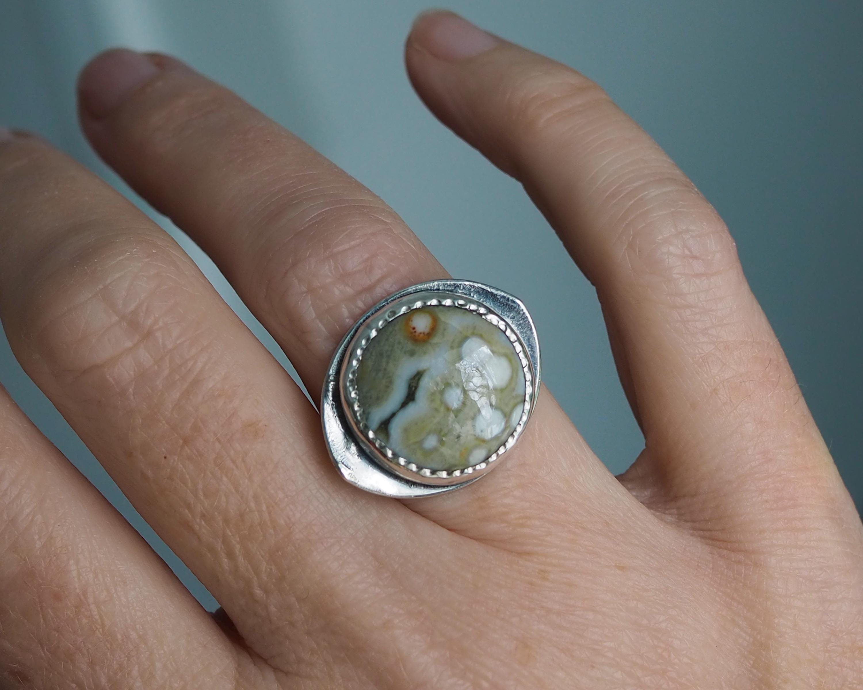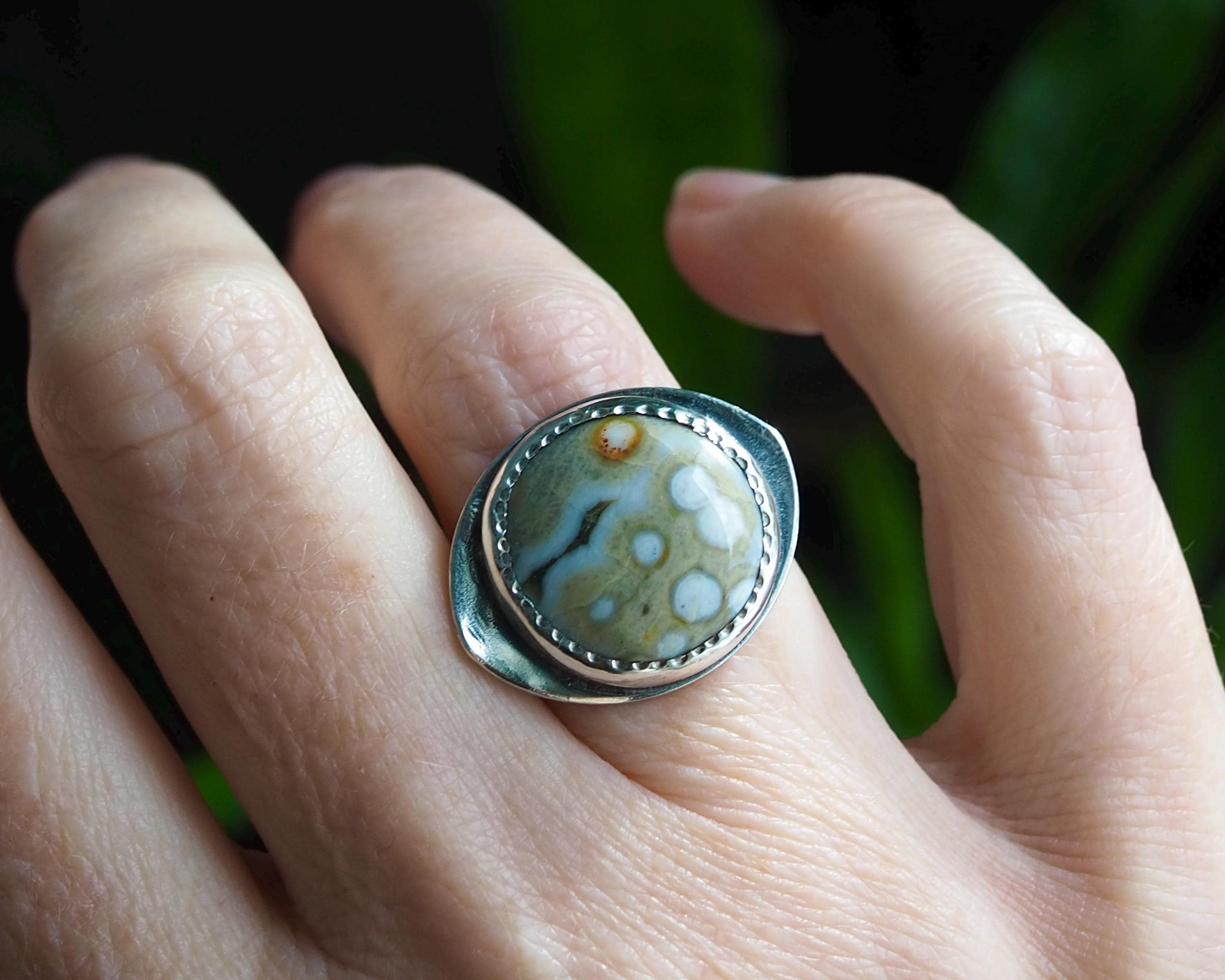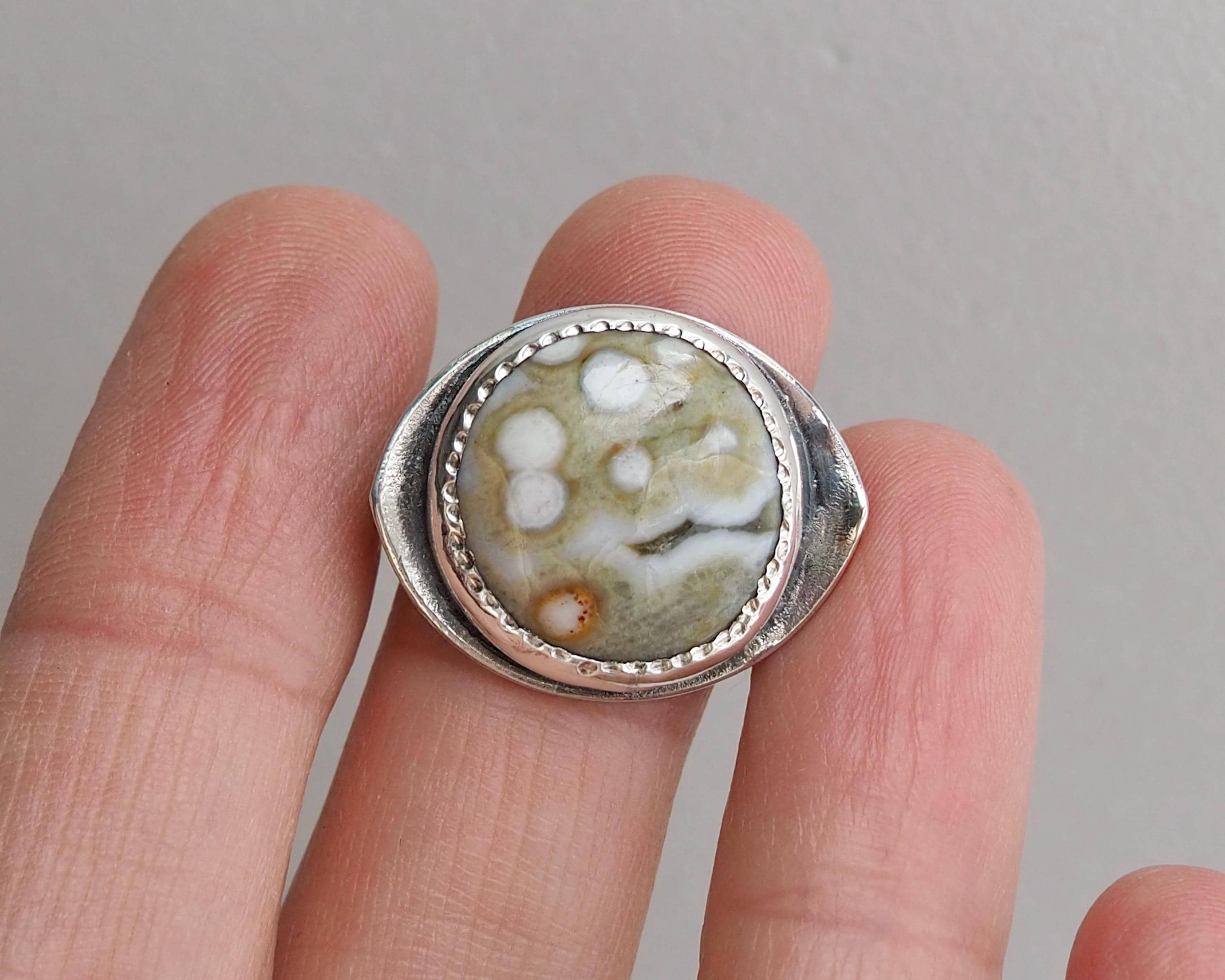 This Orbicular Ocean Jasper Ring has an organic feel with its soft earthy palette of pale greenish beige and dark gray, with creamy white dots and an orange circle, creating an intriguing pattern. The 18mm round stone is set in a fine silver bezel hand-stamped with a delicate dot motif, paired with with an eye shaped, slightly curved sterling silver backplate with an open back. The sterling silver is darkened for a more dramatic look.