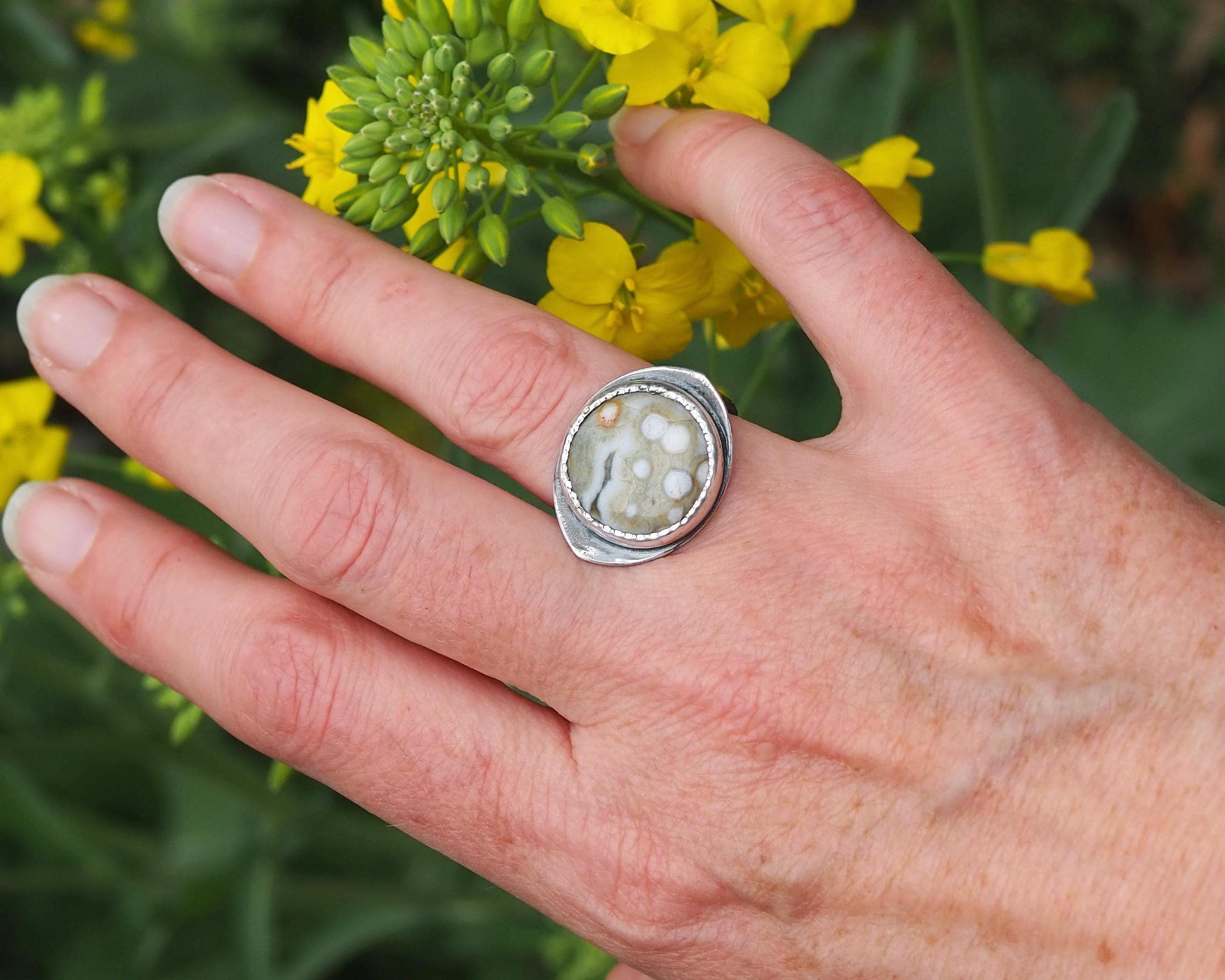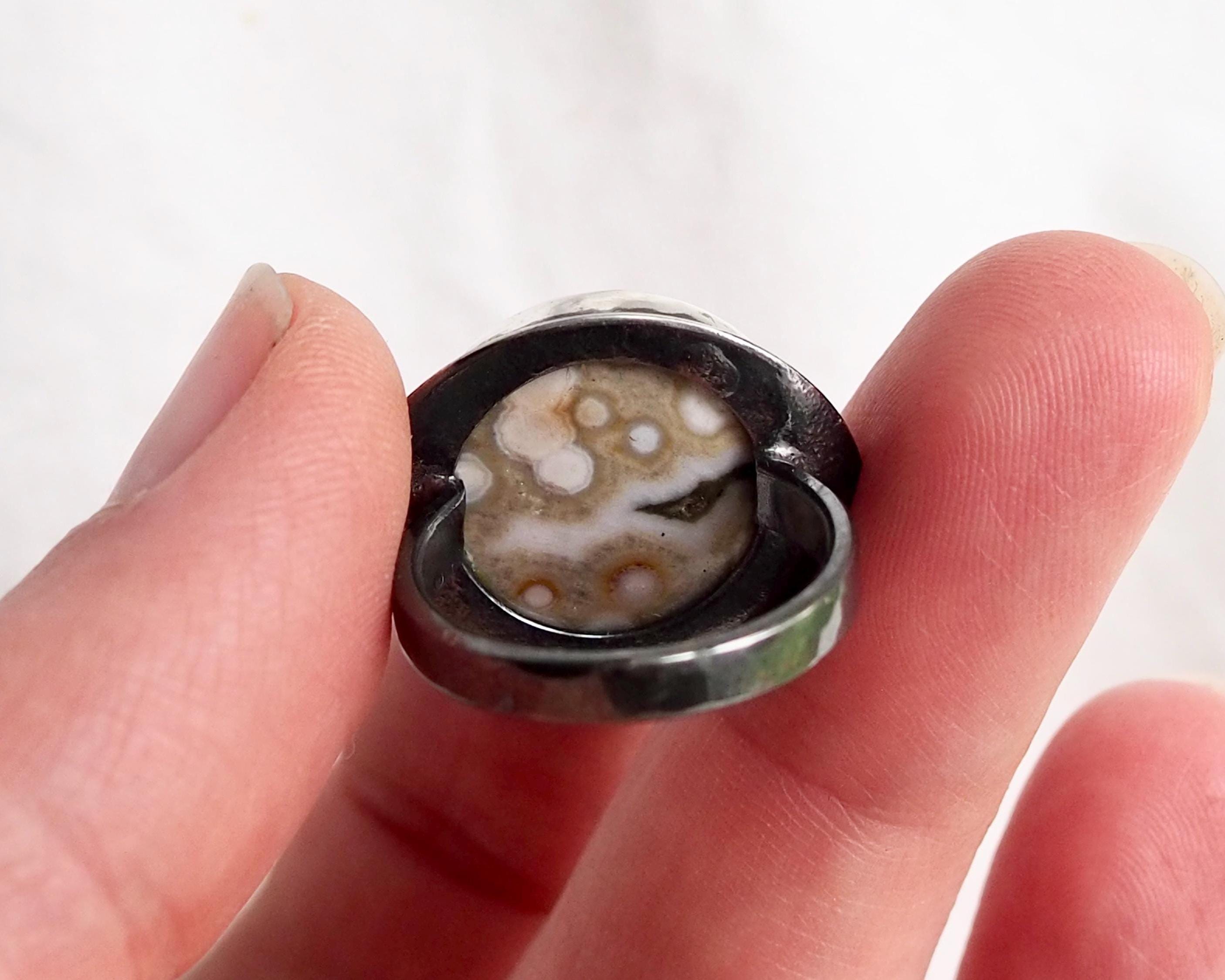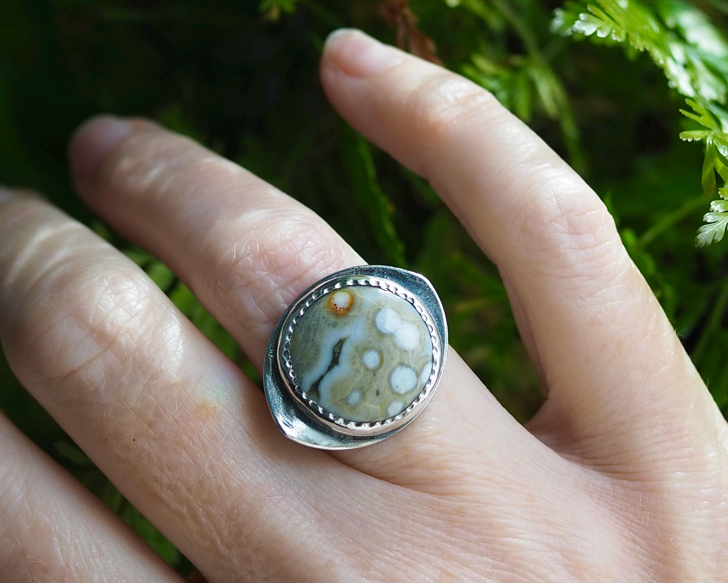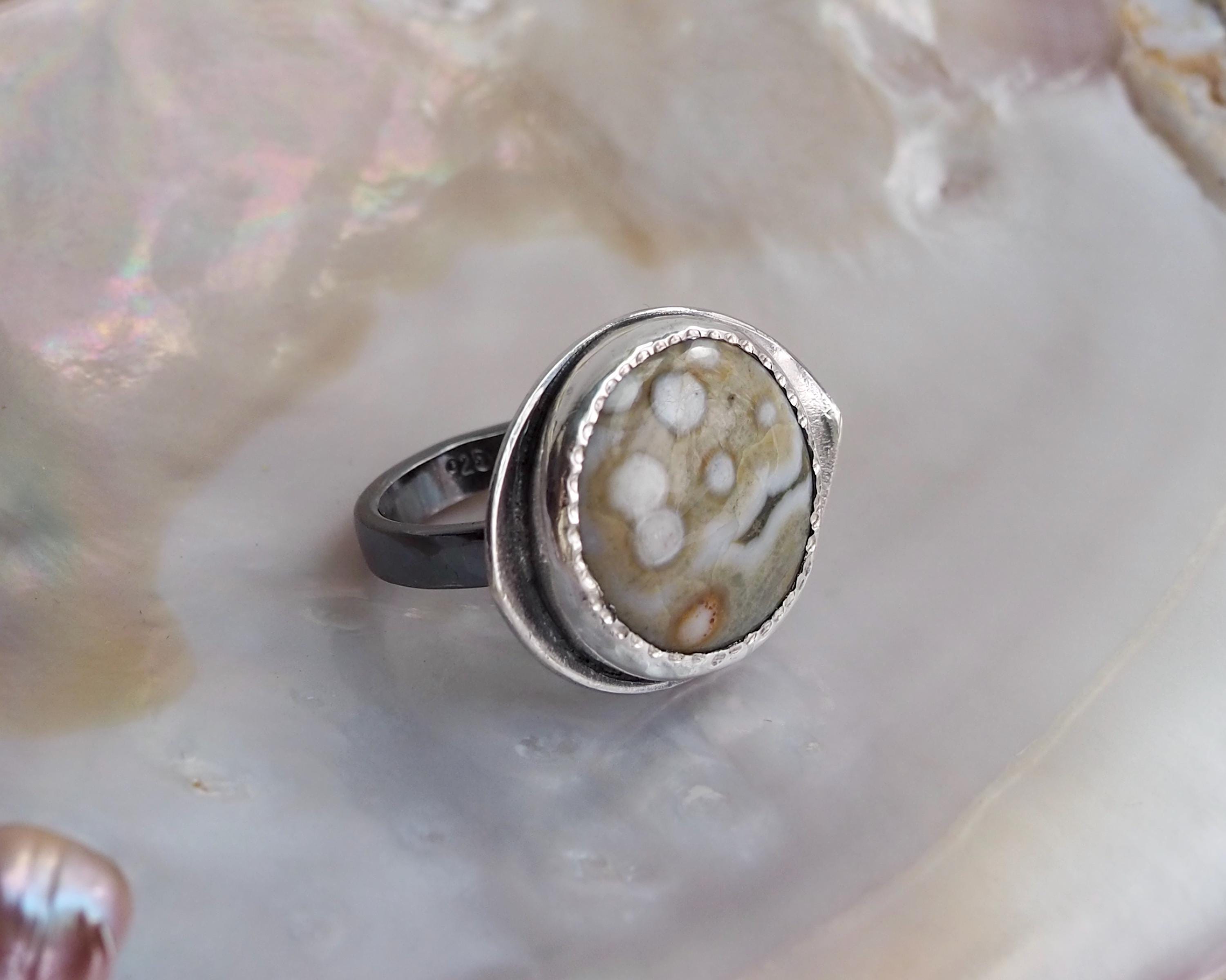 This Orbicular Ocean Jasper Ring has an organic feel with its soft earthy palette of pale greenish beige and dark gray, with creamy white dots and an orange circle, creating an intriguing pattern. The 18mm round stone is set in a fine silver bezel hand-stamped with a delicate dot motif, paired with with an eye shaped, slightly curved sterling silver backplate with an open back. The sterling silver is darkened for a more dramatic look.