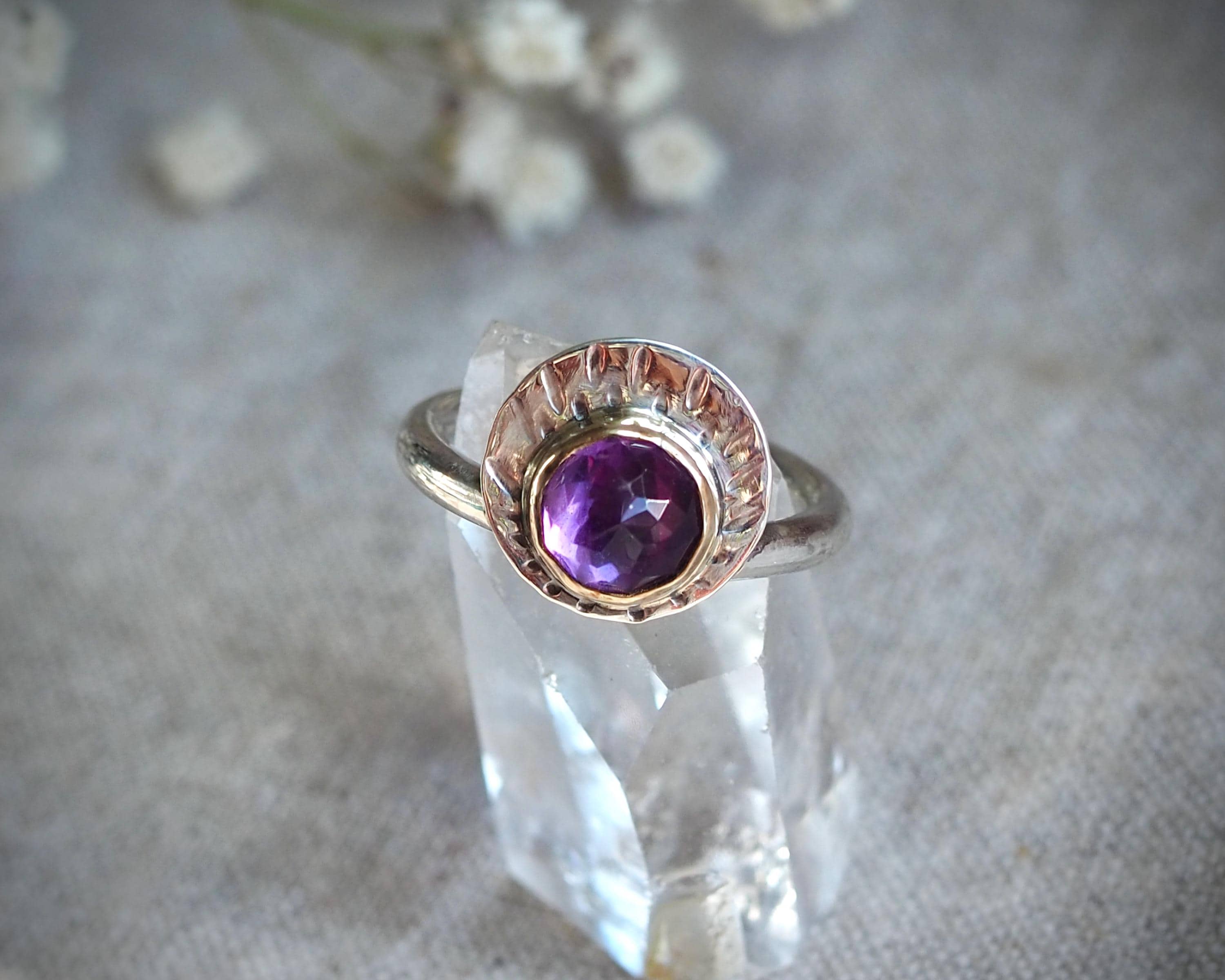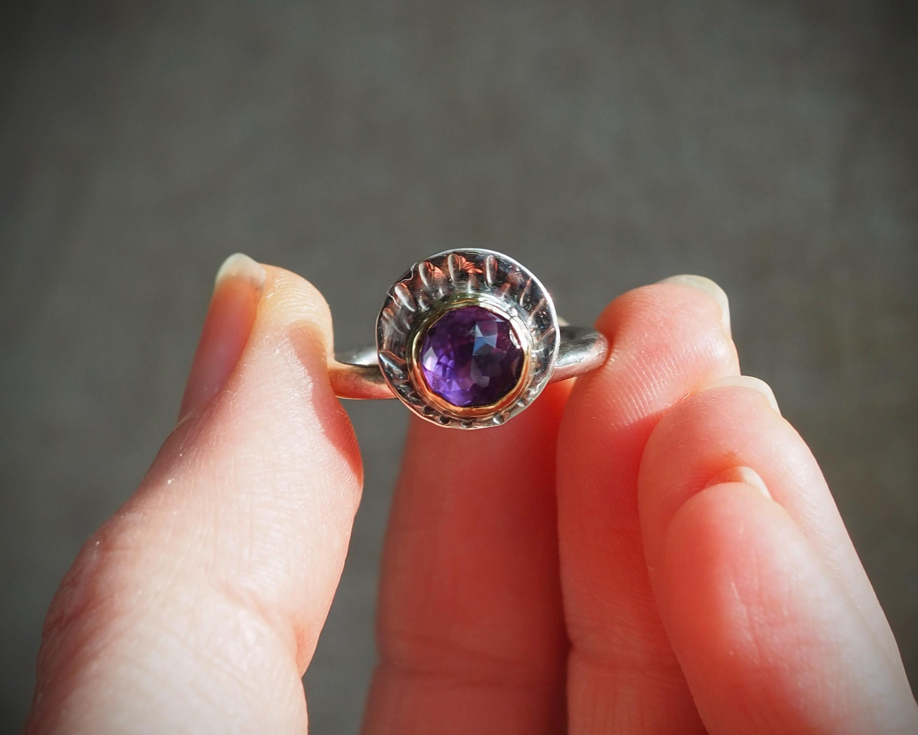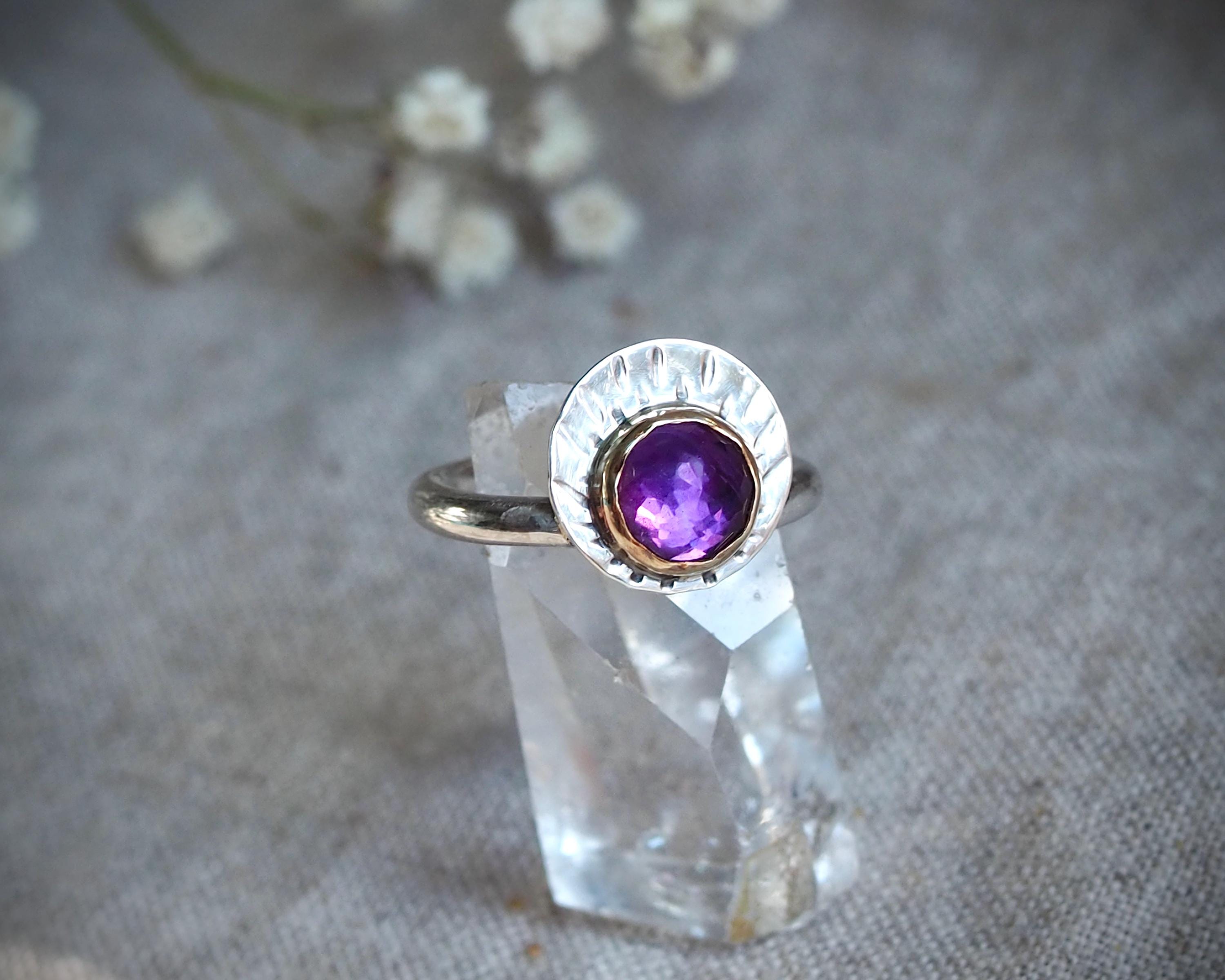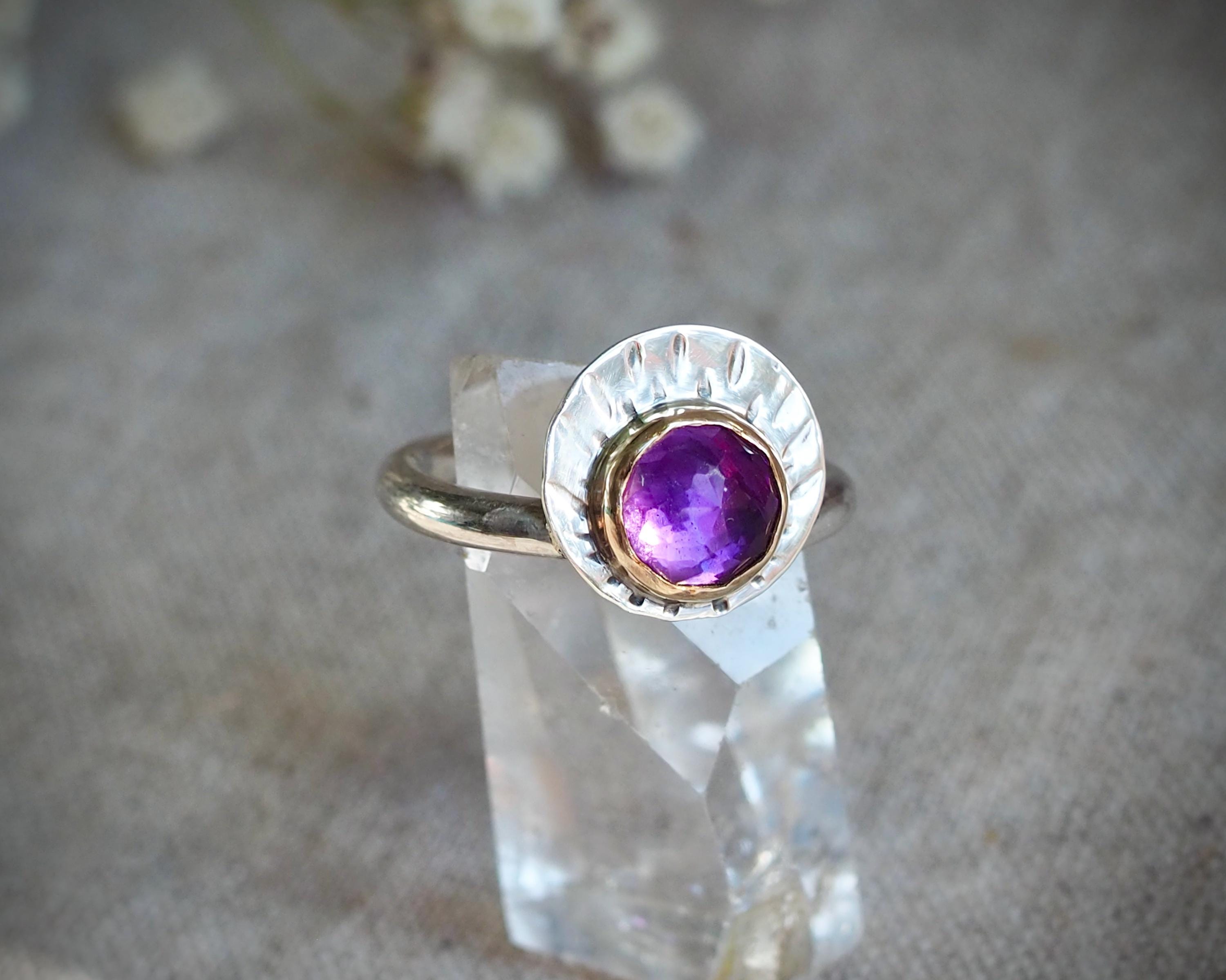 Stunning rose cut amethyst is set in a 14k gold bezel and paired with a sterling silver disc. The disc is hand stamped with emanating rays. The stone has beautiful kite-shaped facets that really catch the light, it measures 8mm. This unique ring is size 7.