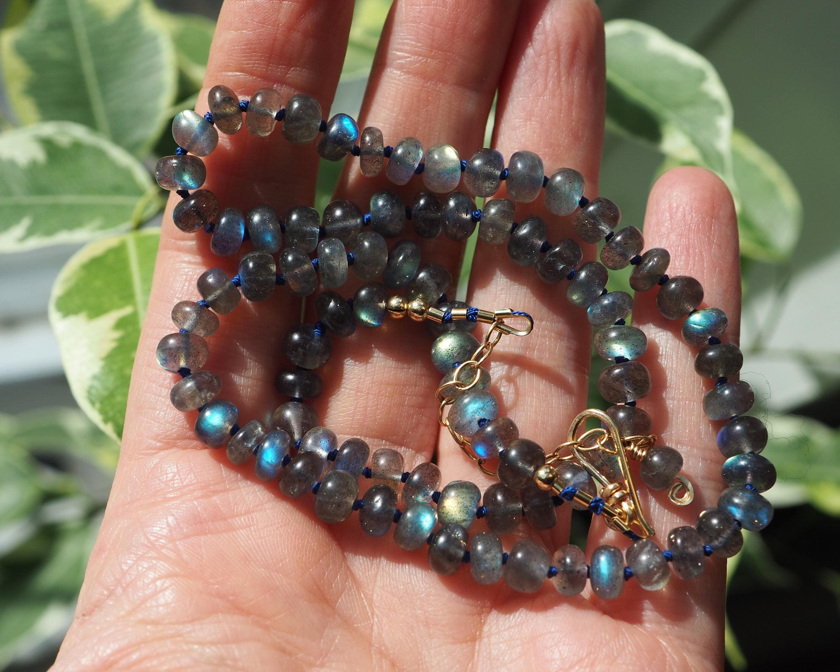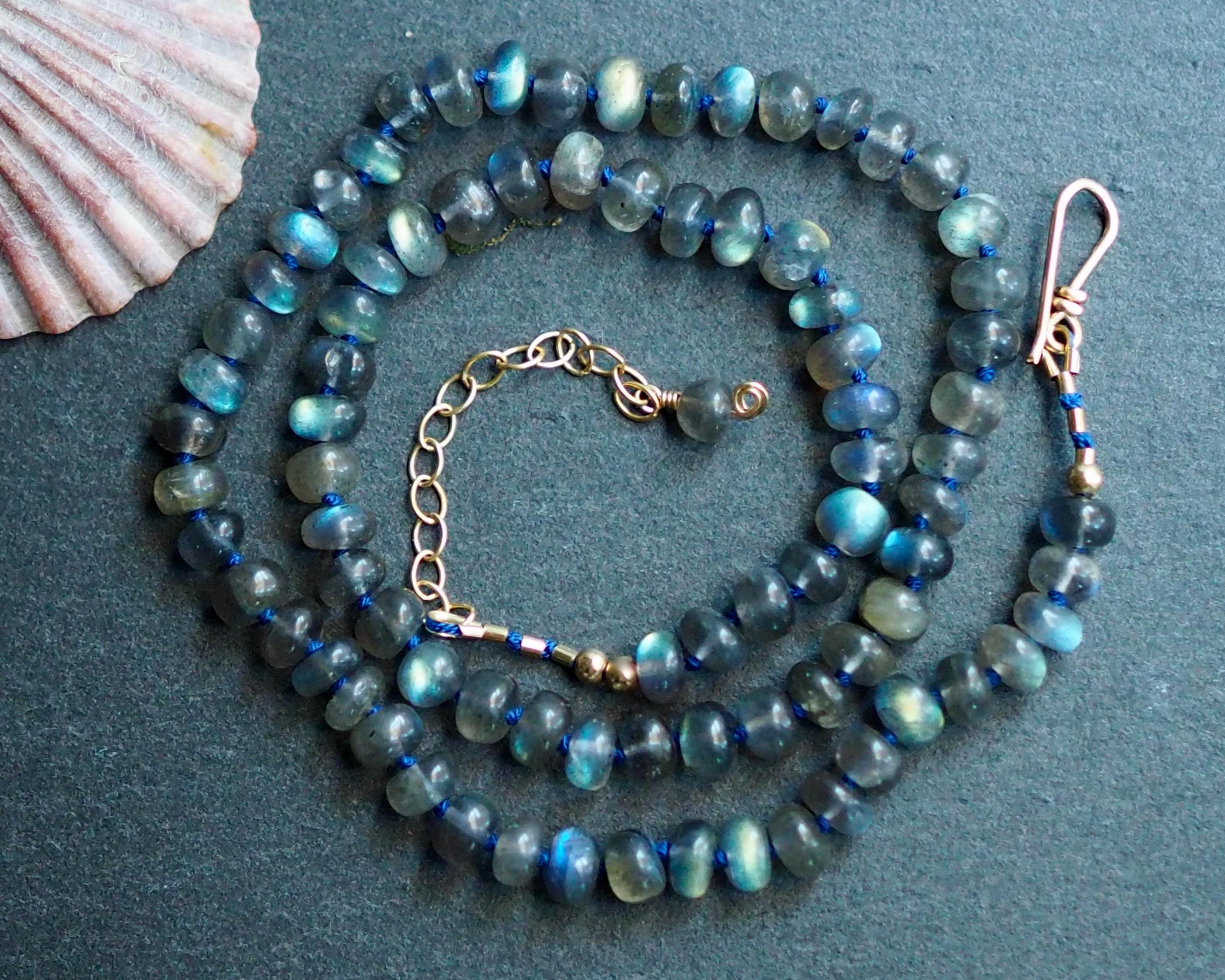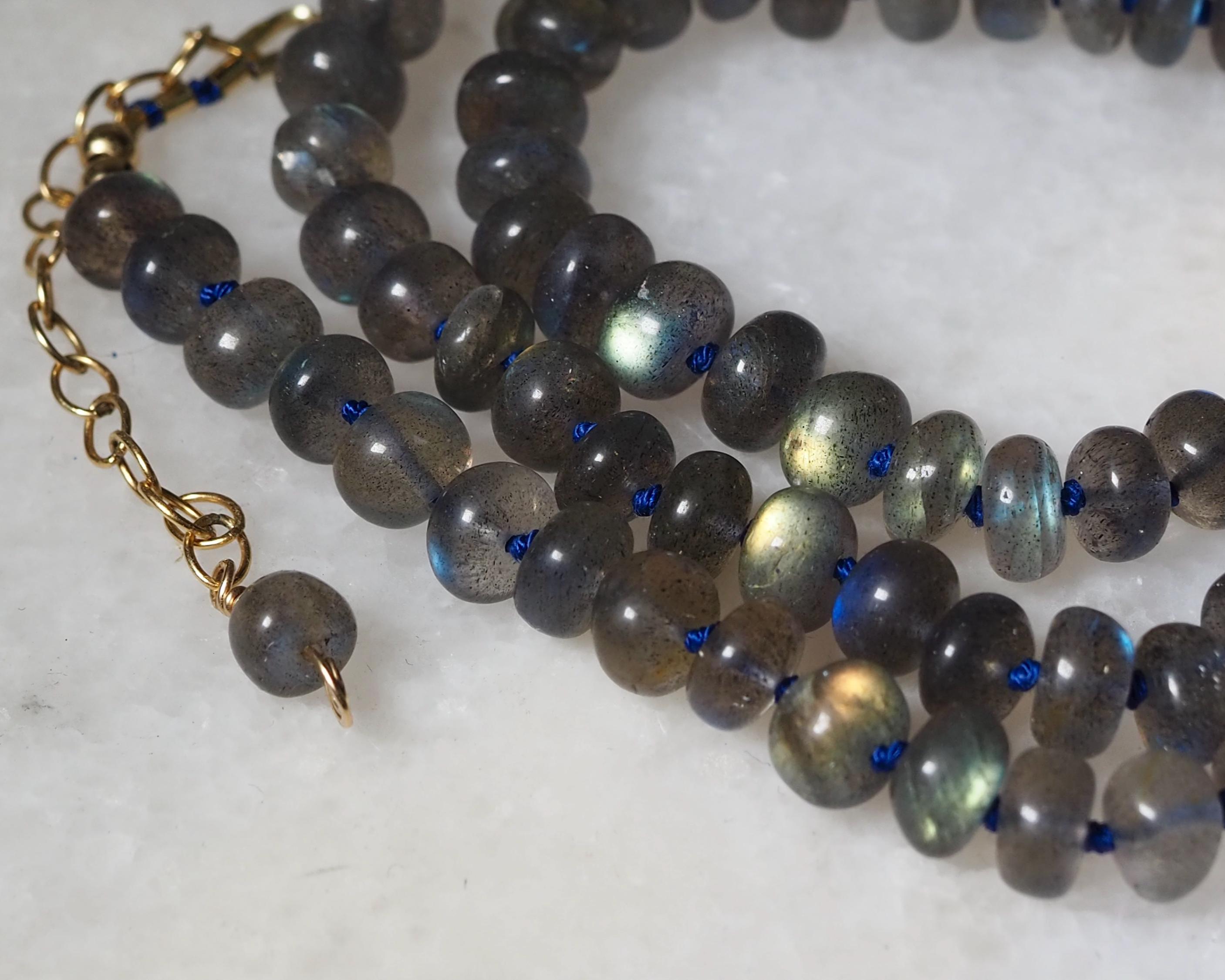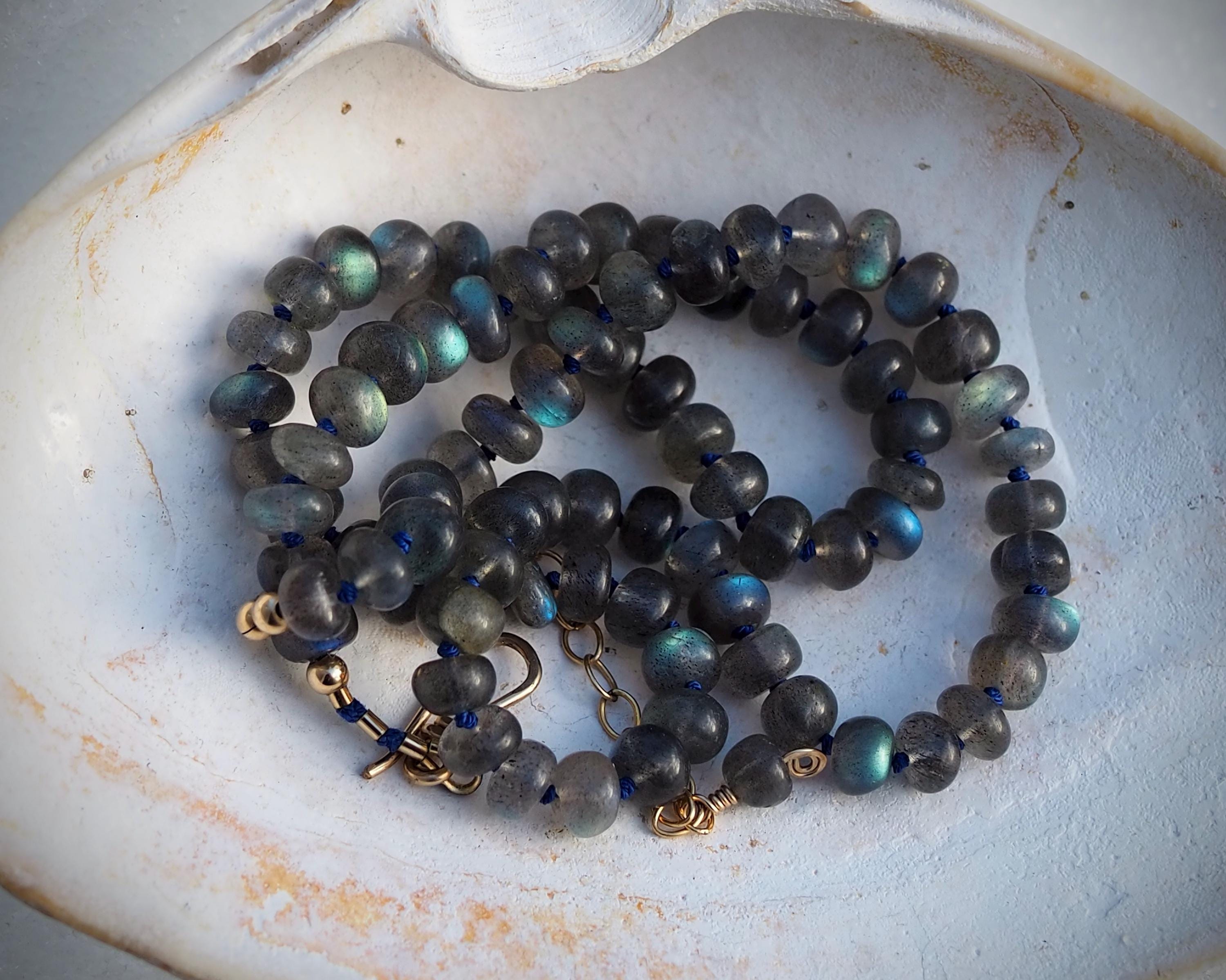 This beautiful necklace shimmers with the slightest move. The labradorite beads flash with tones ranging from bright aqua to medium royal blue, to gold. The beads are hand cut rondelles of varying widths, measuring 6-6.5mm in diameter, which gives them a nice organic feel. They are hand knotted candy style on navy blue silk cord, the length is 17.75", plus a 2” extender chain with a small labradorite bead dangle and a handmade gold filled hook clasp.