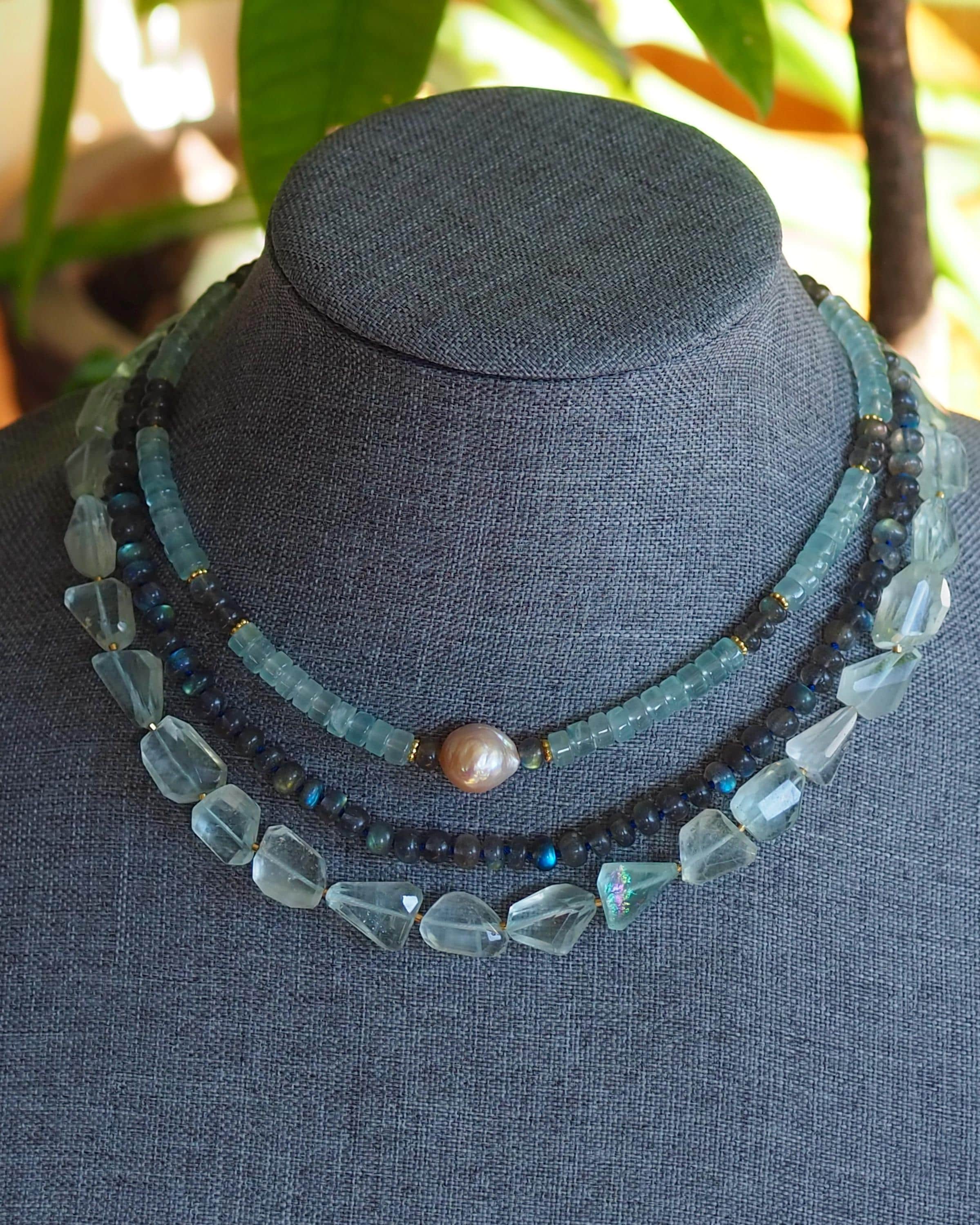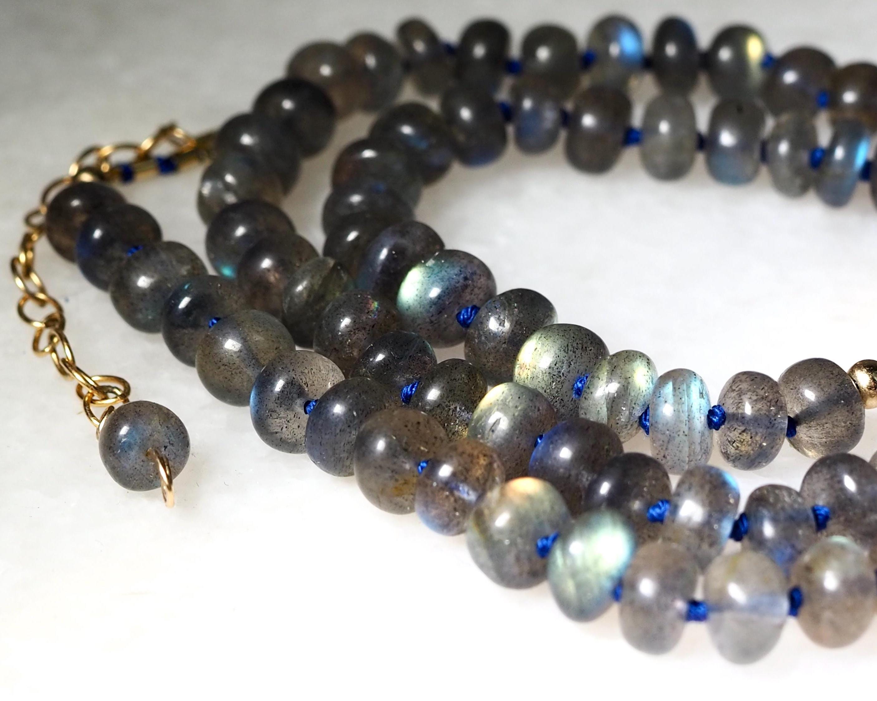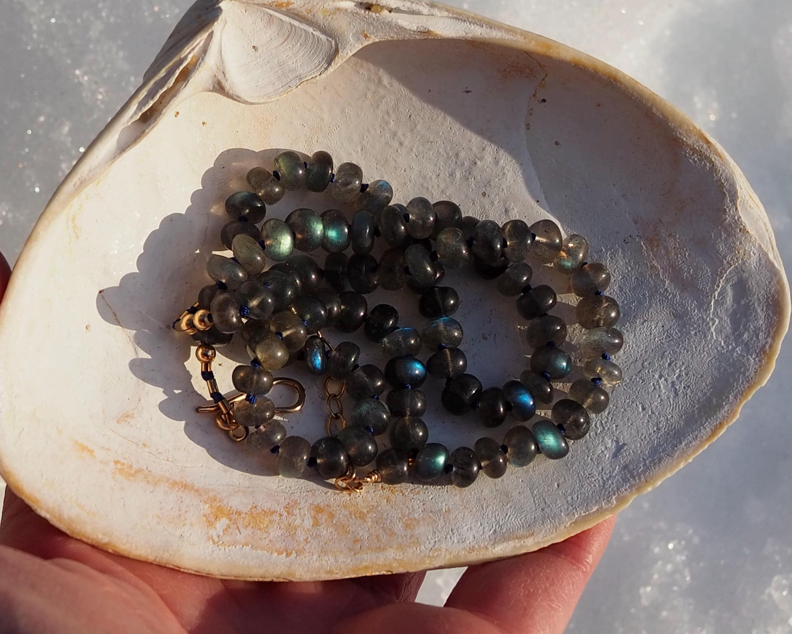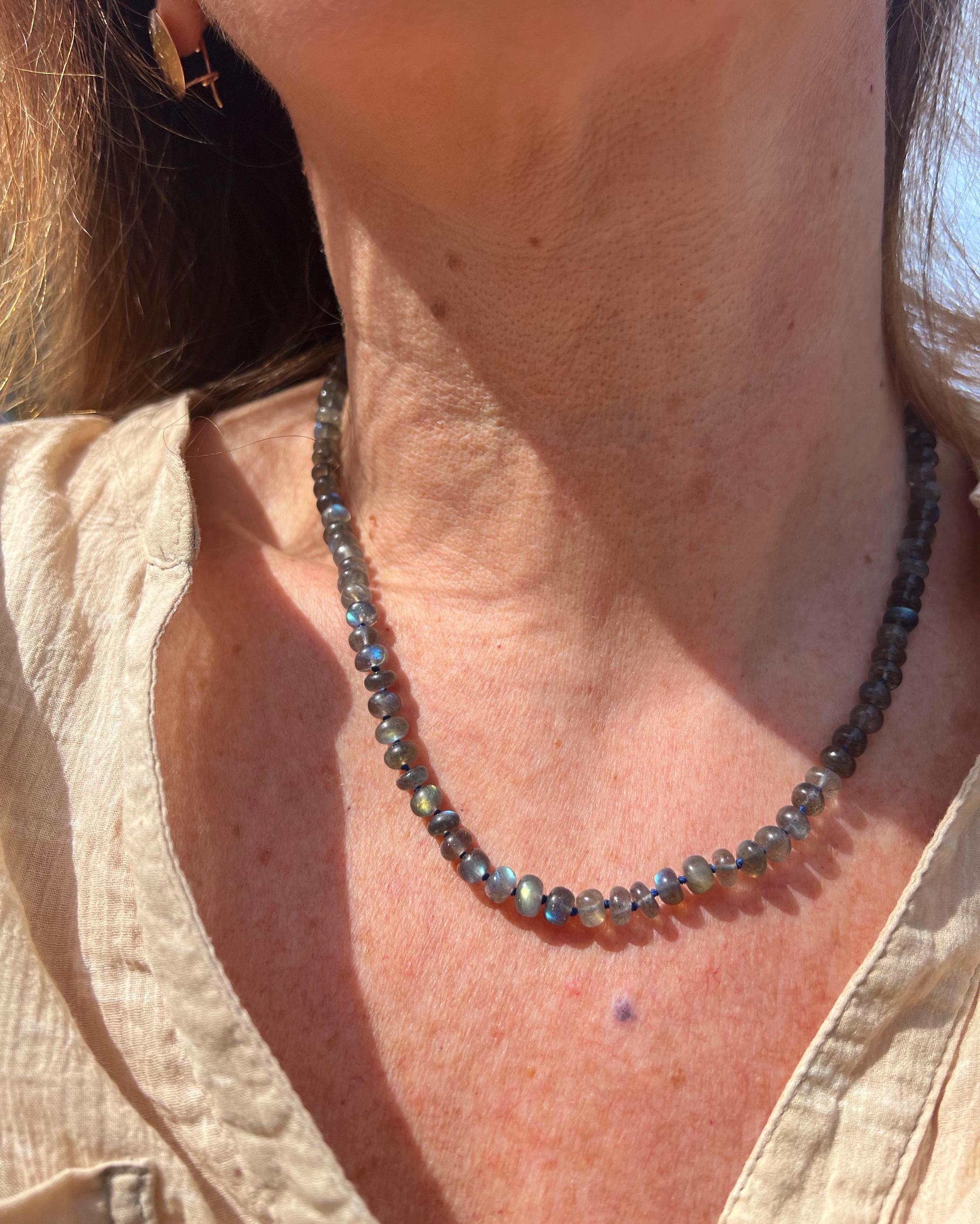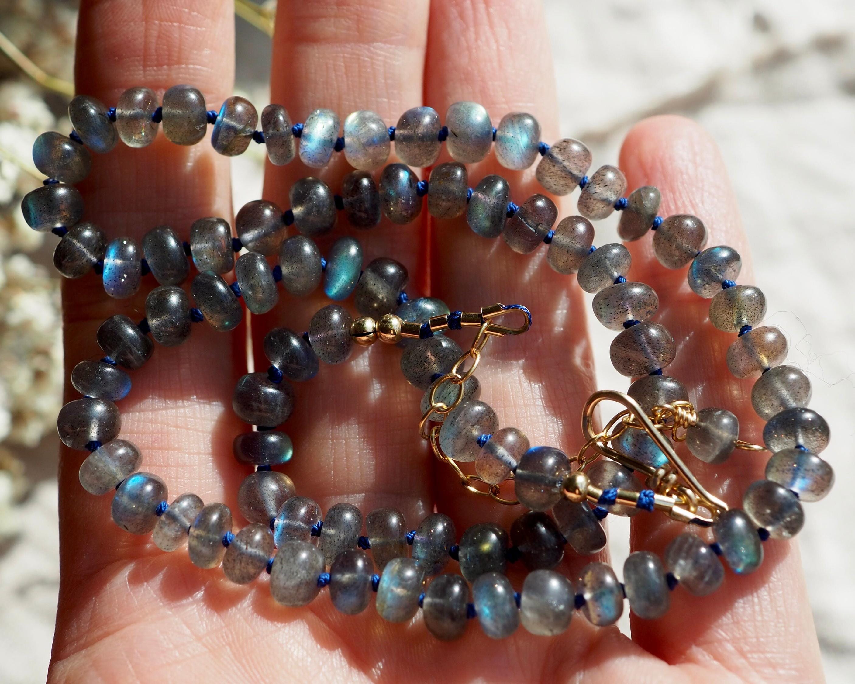 This beautiful necklace shimmers with the slightest move. The labradorite beads flash with tones ranging from bright aqua to medium royal blue, to gold. The beads are hand cut rondelles of varying widths, measuring 6-6.5mm in diameter, which gives them a nice organic feel. They are hand knotted candy style on navy blue silk cord, the length is 17.75", plus a 2” extender chain with a small labradorite bead dangle and a handmade gold filled hook clasp.