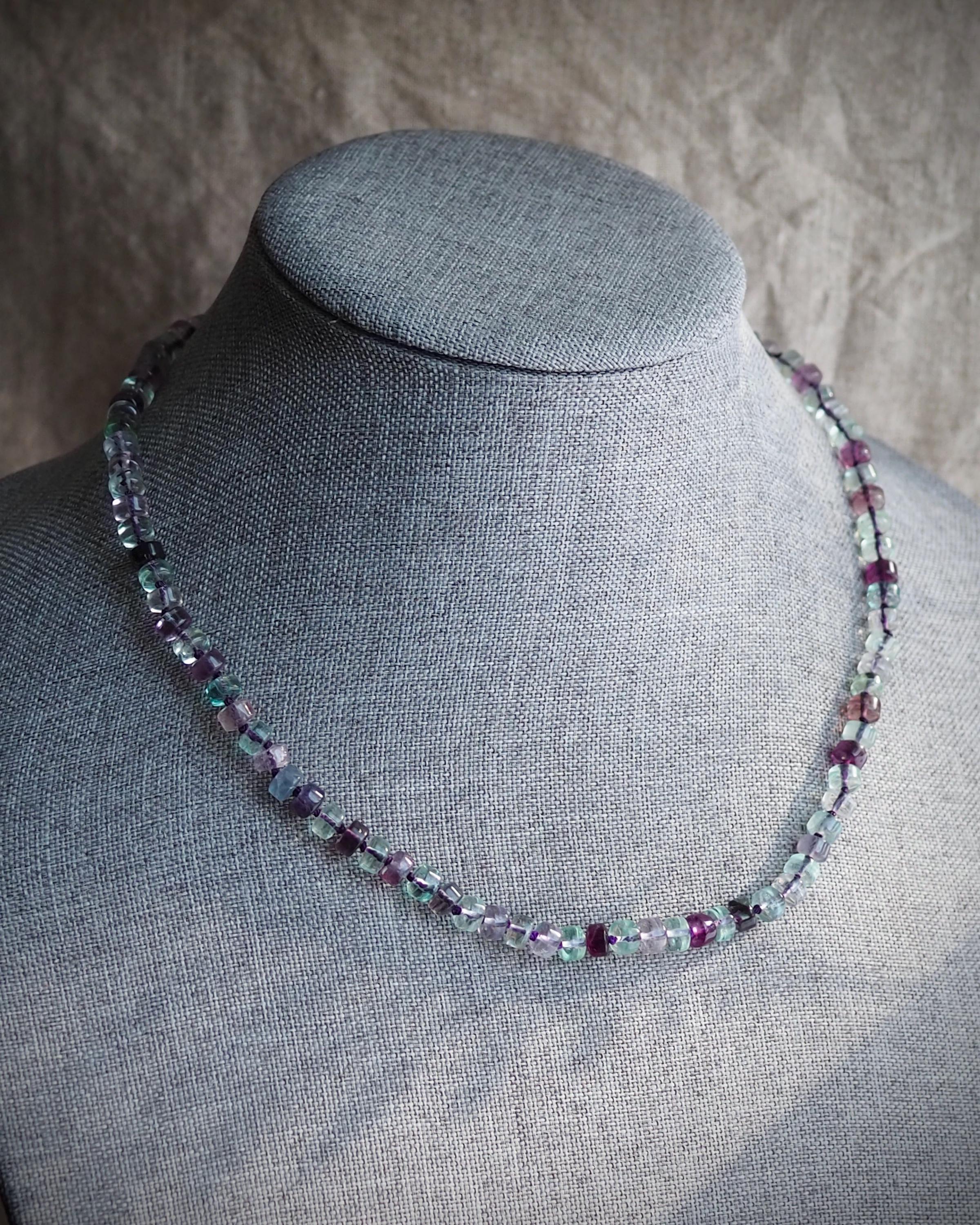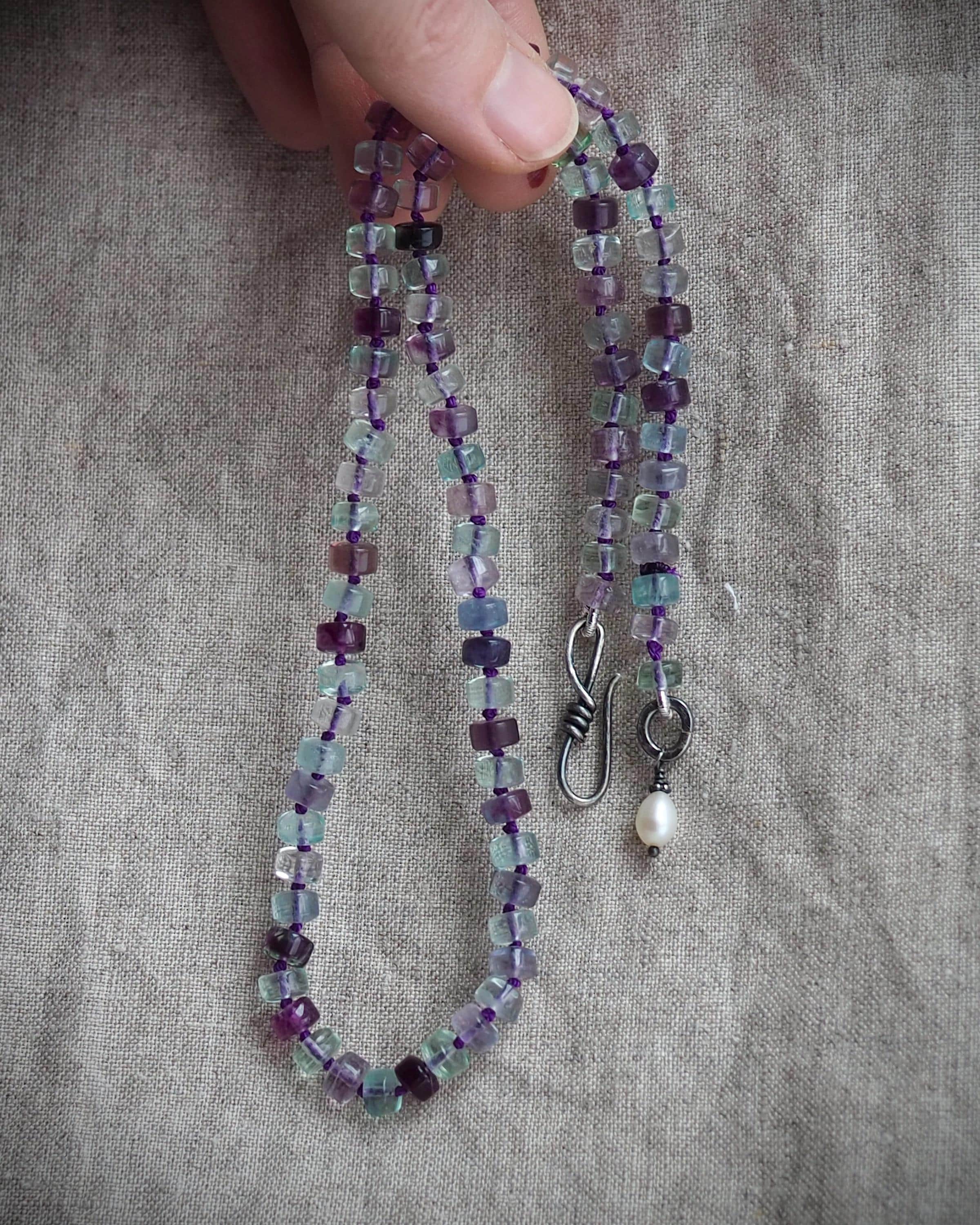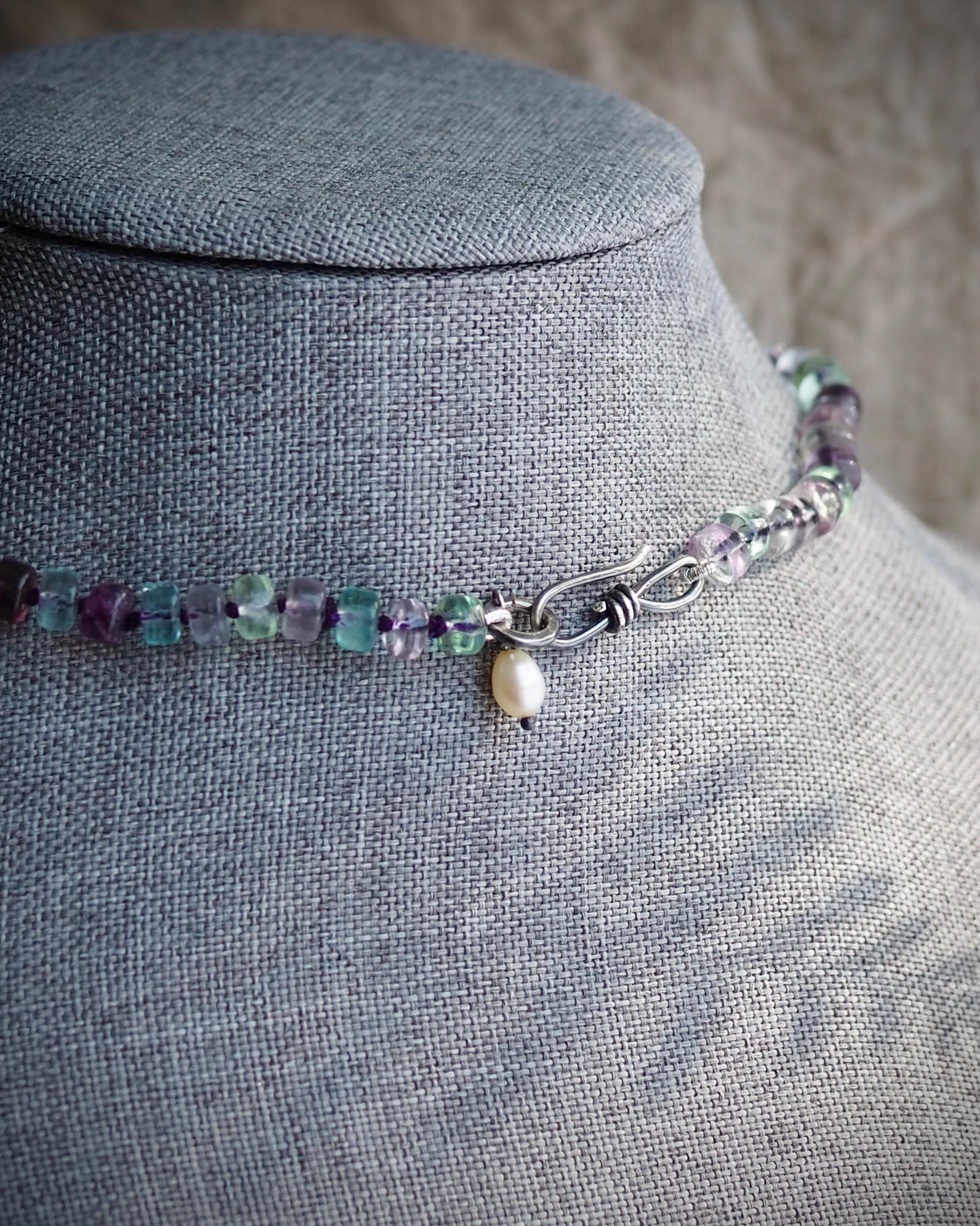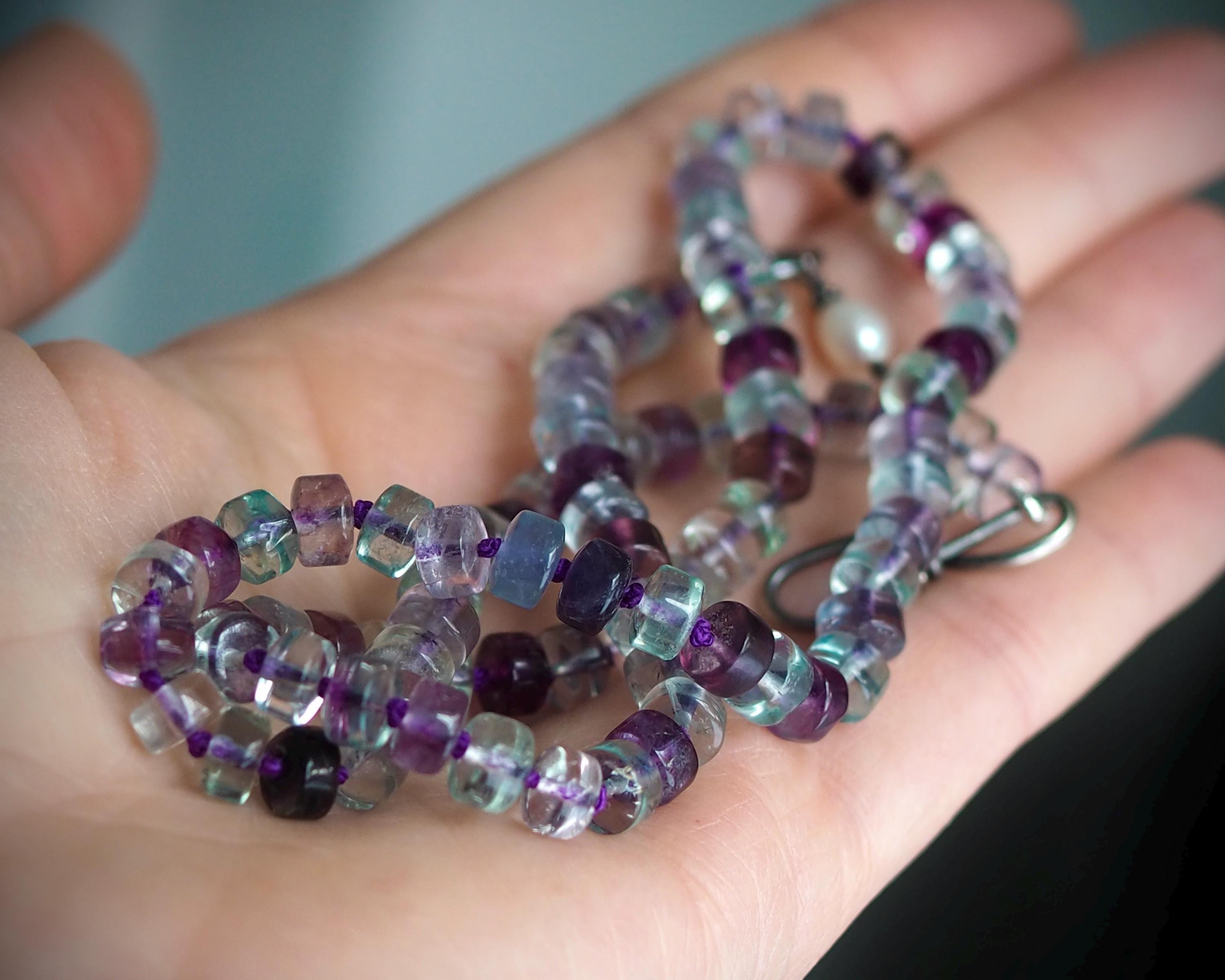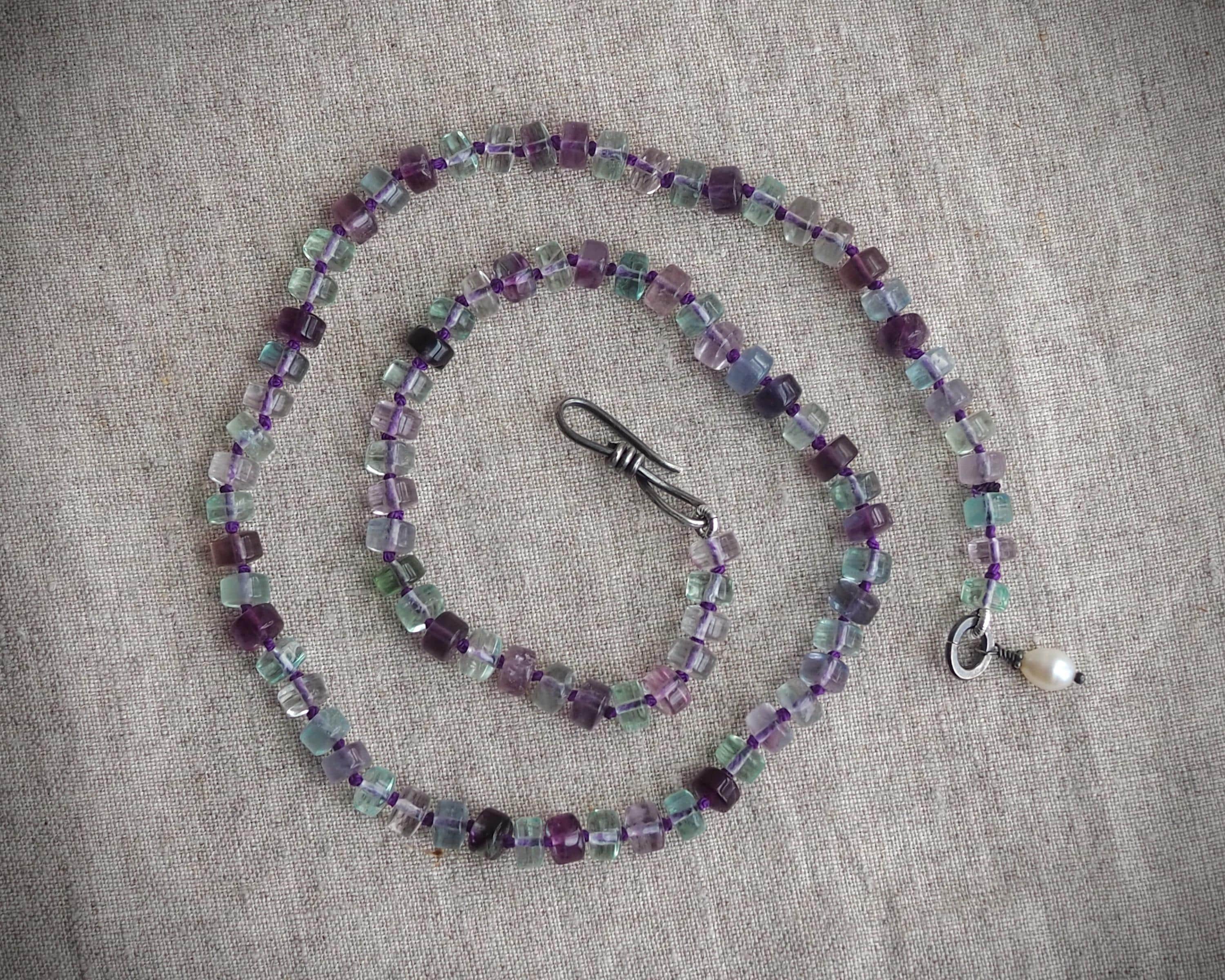 Beautiful, well cut multi-color fluorite beads are hand knotted on deep purple silk and finished with a handmade sterling silver hook clasp adorned with a white freshwater pearl. This necklace has a lovely glow. The length of the necklace is 20 inches.