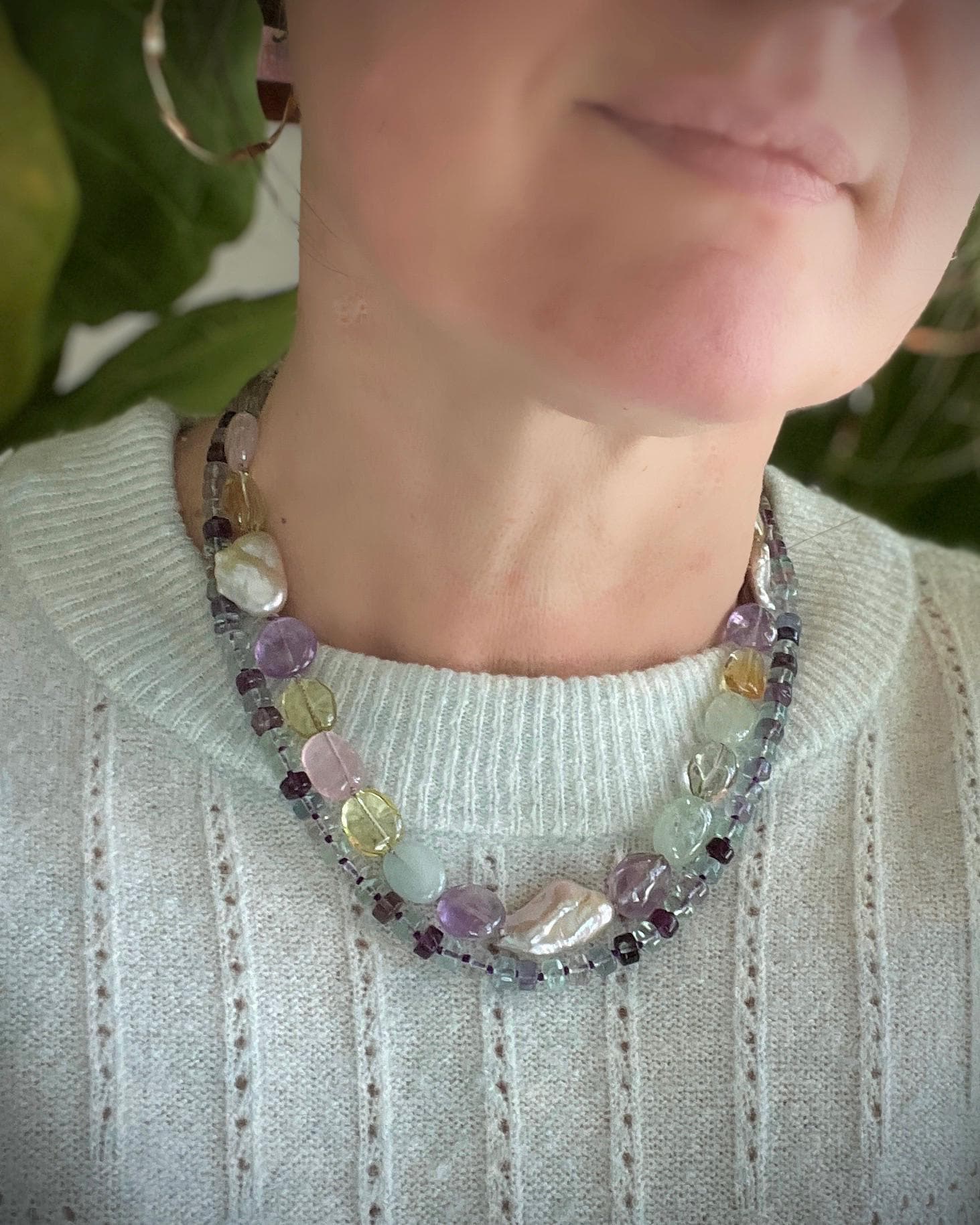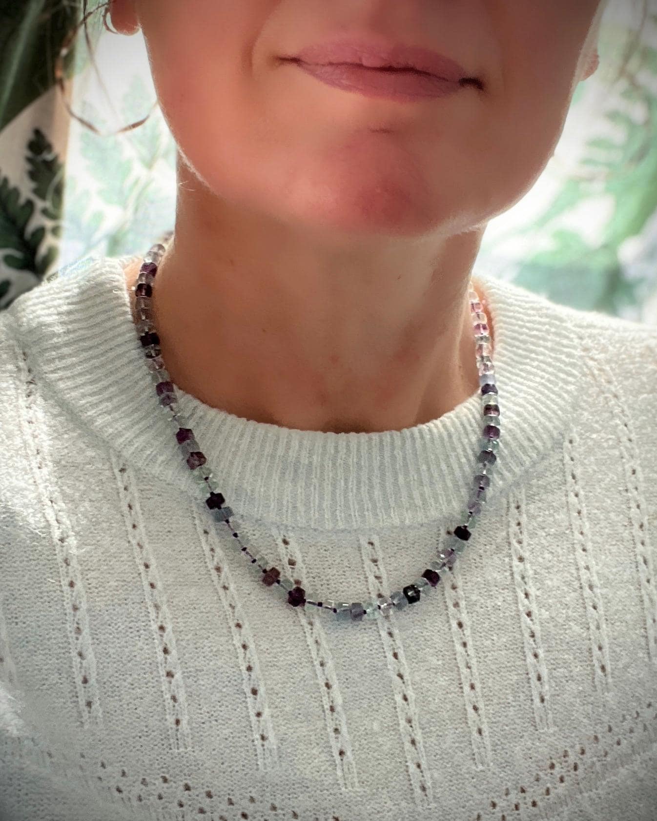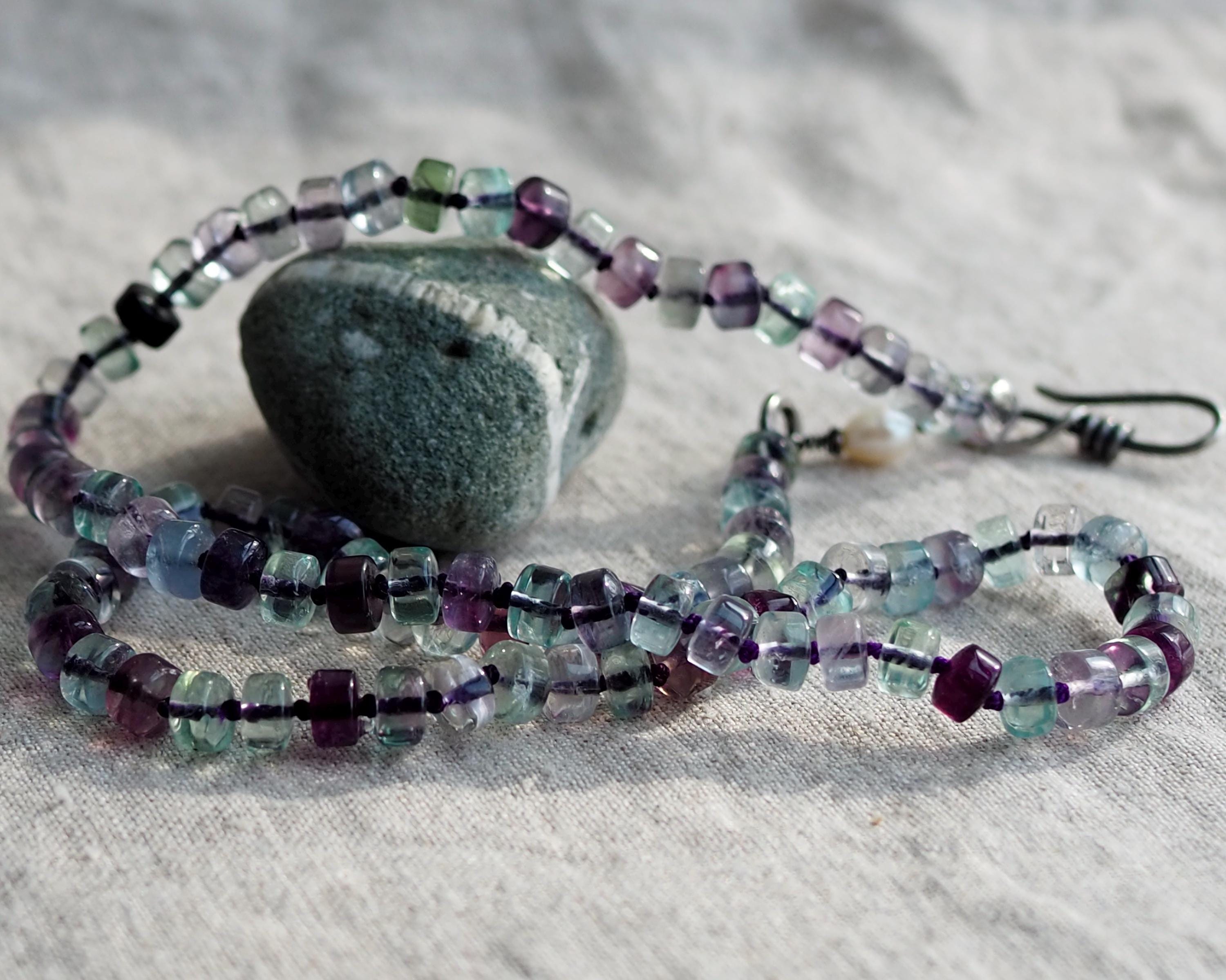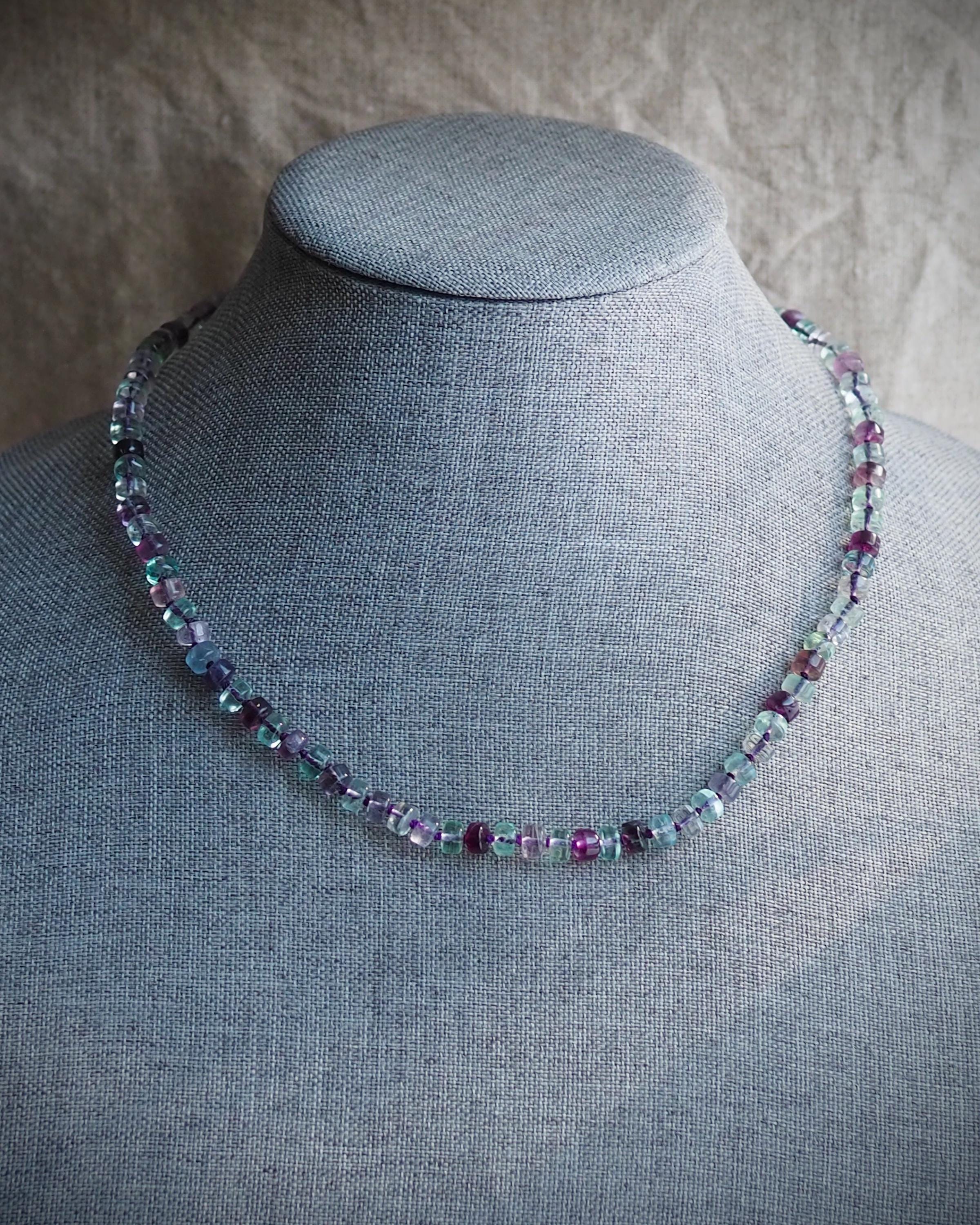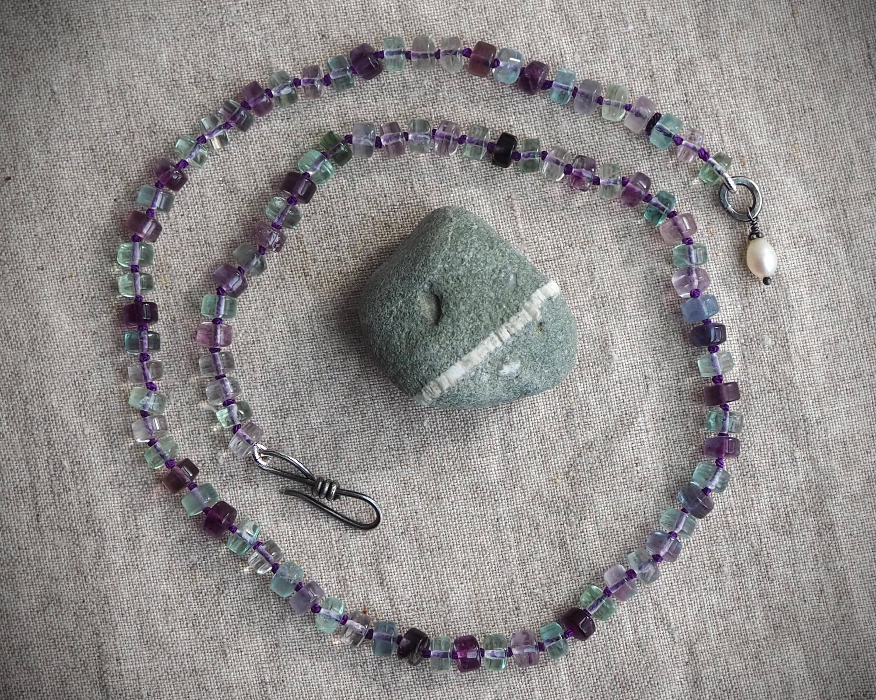 Beautiful, well cut multi-color fluorite beads are hand knotted on deep purple silk and finished with a handmade sterling silver hook clasp adorned with a white freshwater pearl. This necklace has a lovely glow. The length of the necklace is 20 inches.