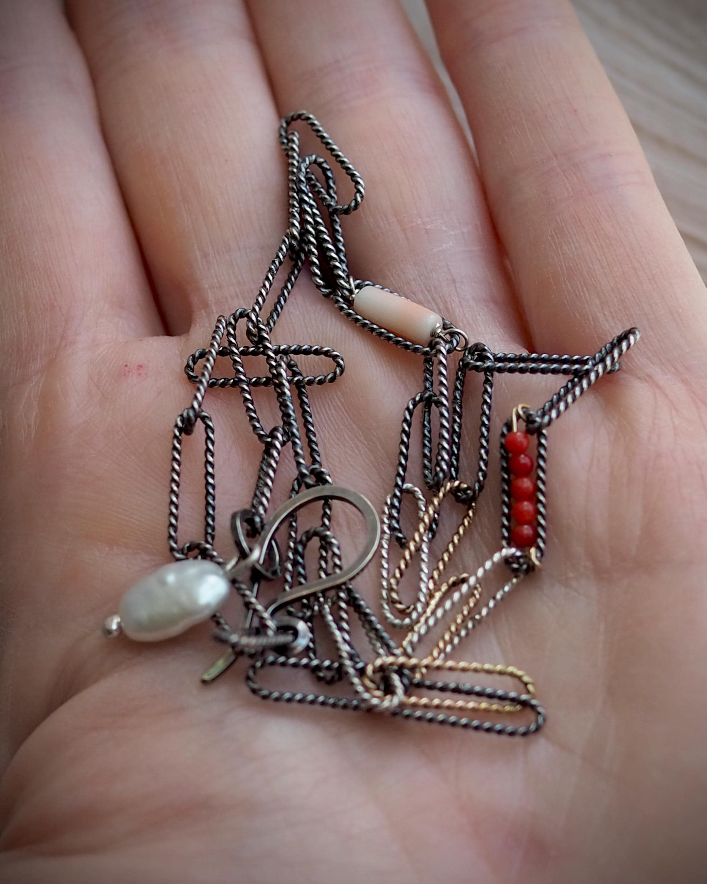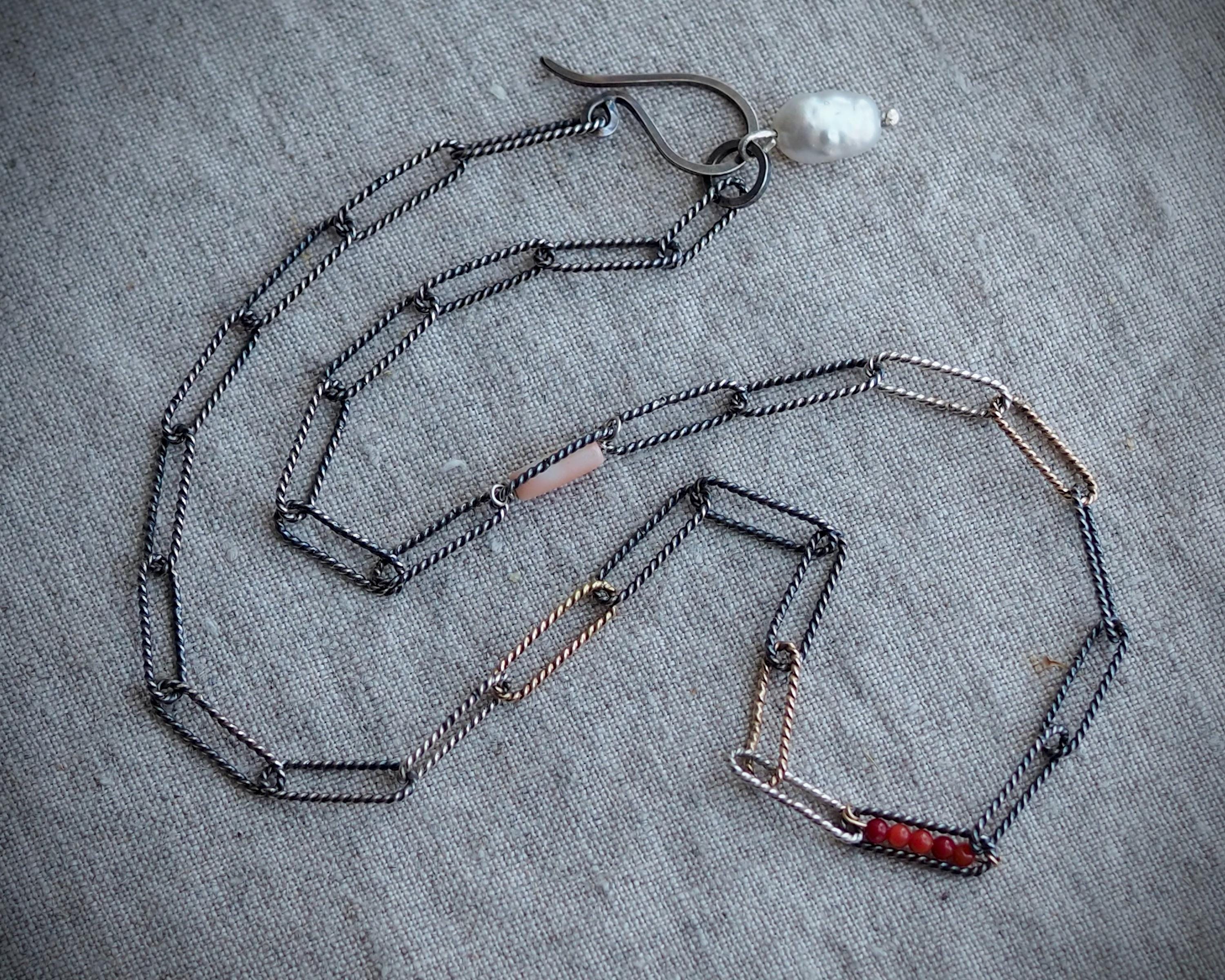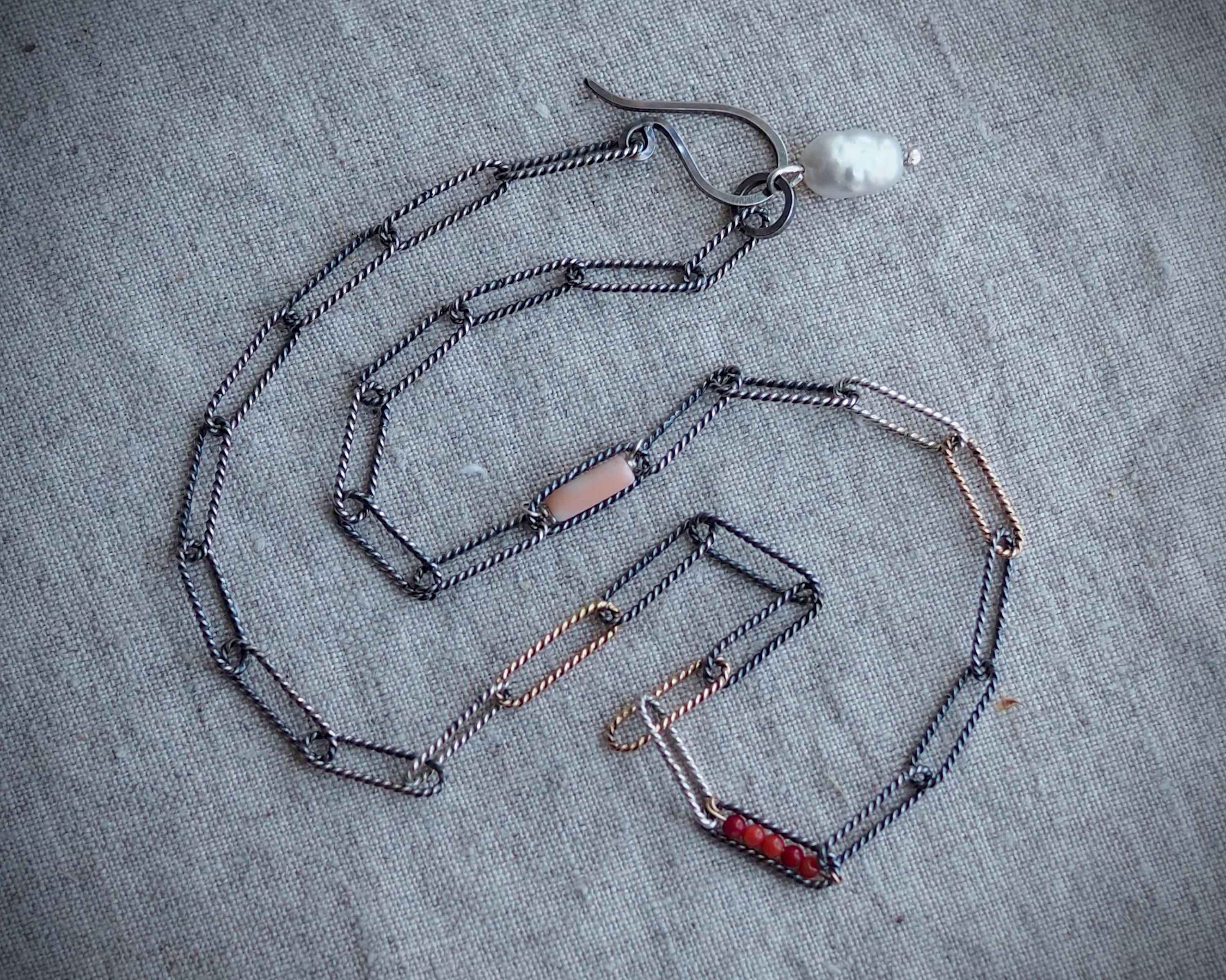 Handmade mixed metal tri-color oval link rope chain has darkened sterling silver, bright sterling silver, and solid 14k gold links. It is adorned with a row of tiny, tomato red naturalItalian coral beads within one link, a porcelain pink Japanese Momo coral tube in another link, and a natural white keshi pearl dangle on the end.