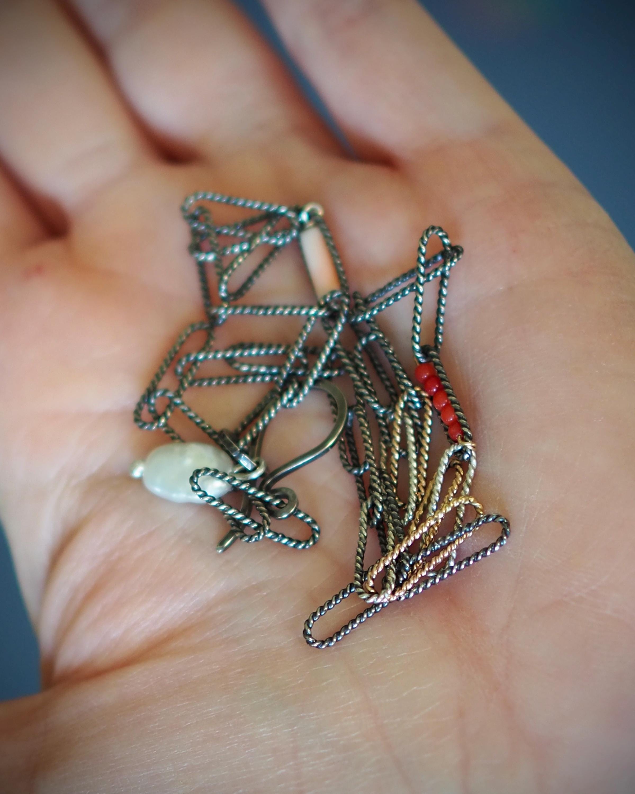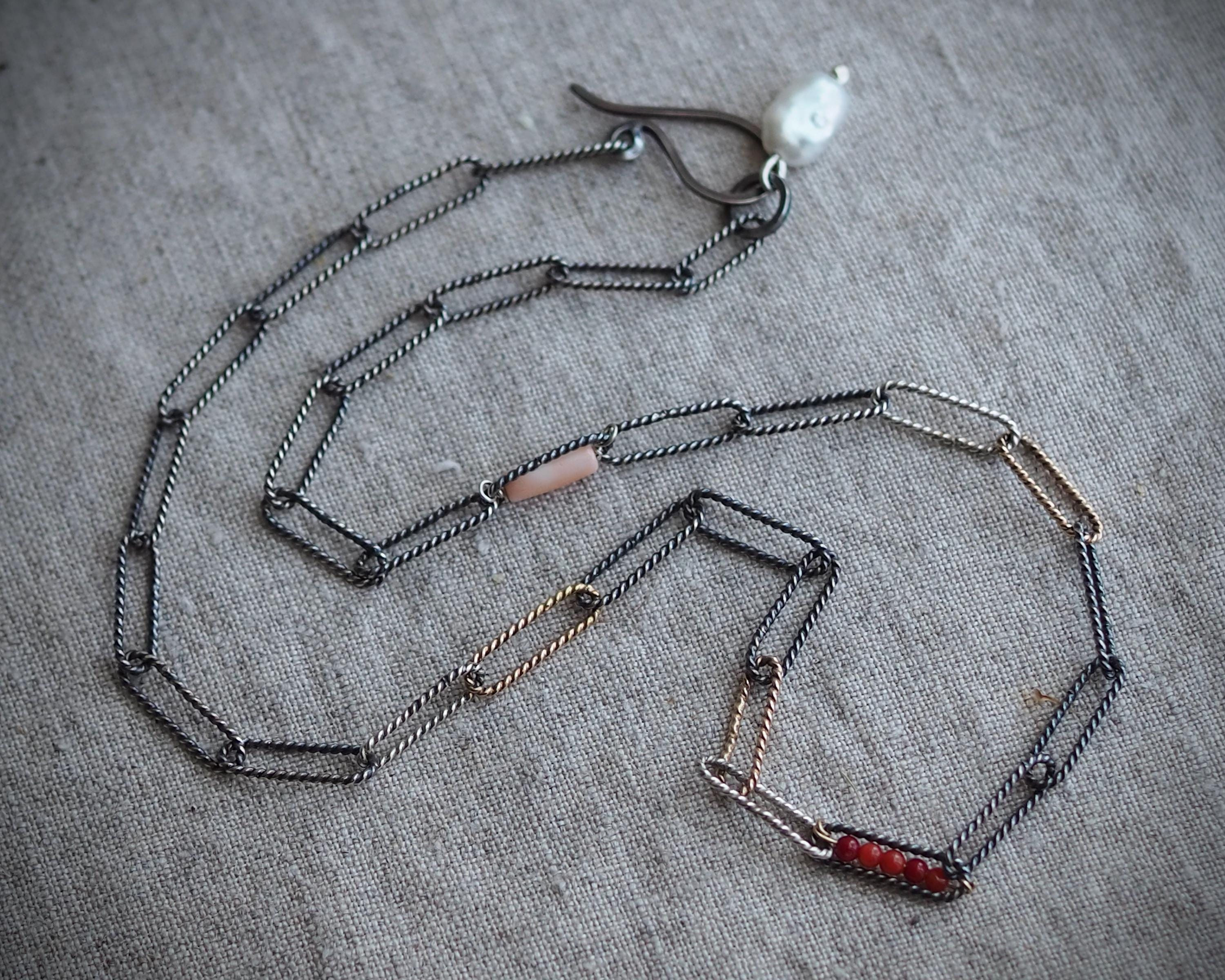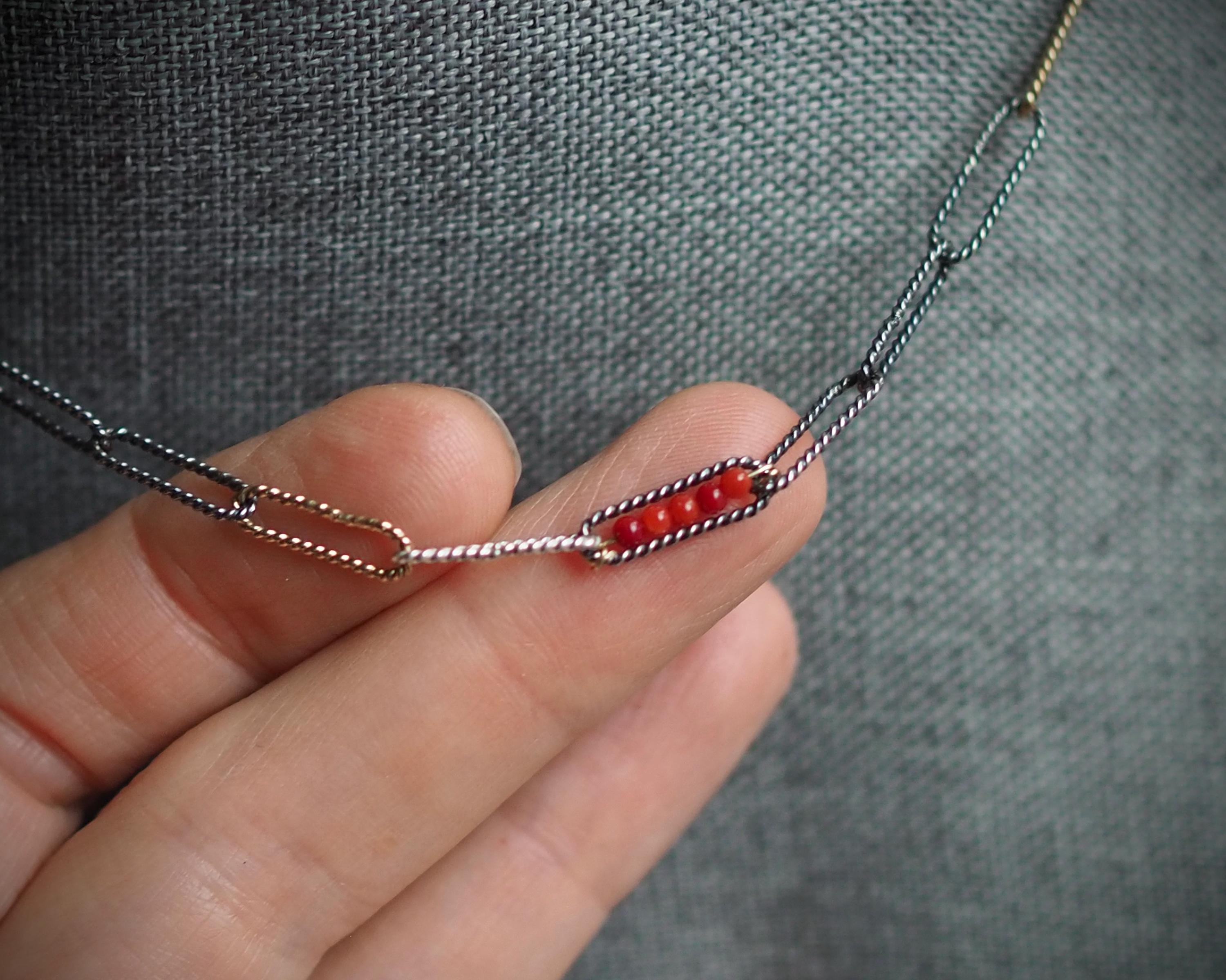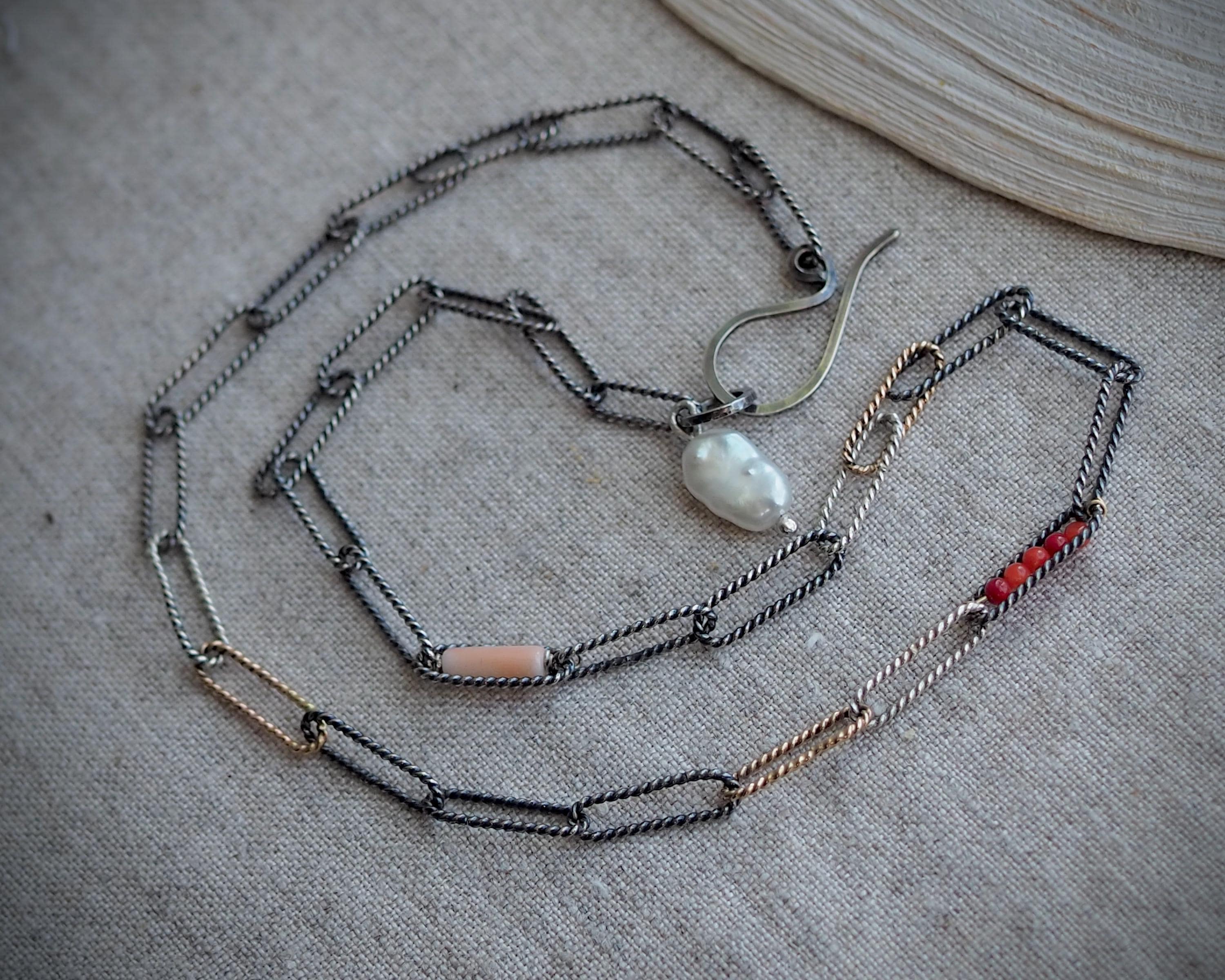 Handmade mixed metal tri-color oval link rope chain has darkened sterling silver, bright sterling silver, and solid 14k gold links. It is adorned with a row of tiny, tomato red naturalItalian coral beads within one link, a porcelain pink Japanese Momo coral tube in another link, and a natural white keshi pearl dangle on the end.
