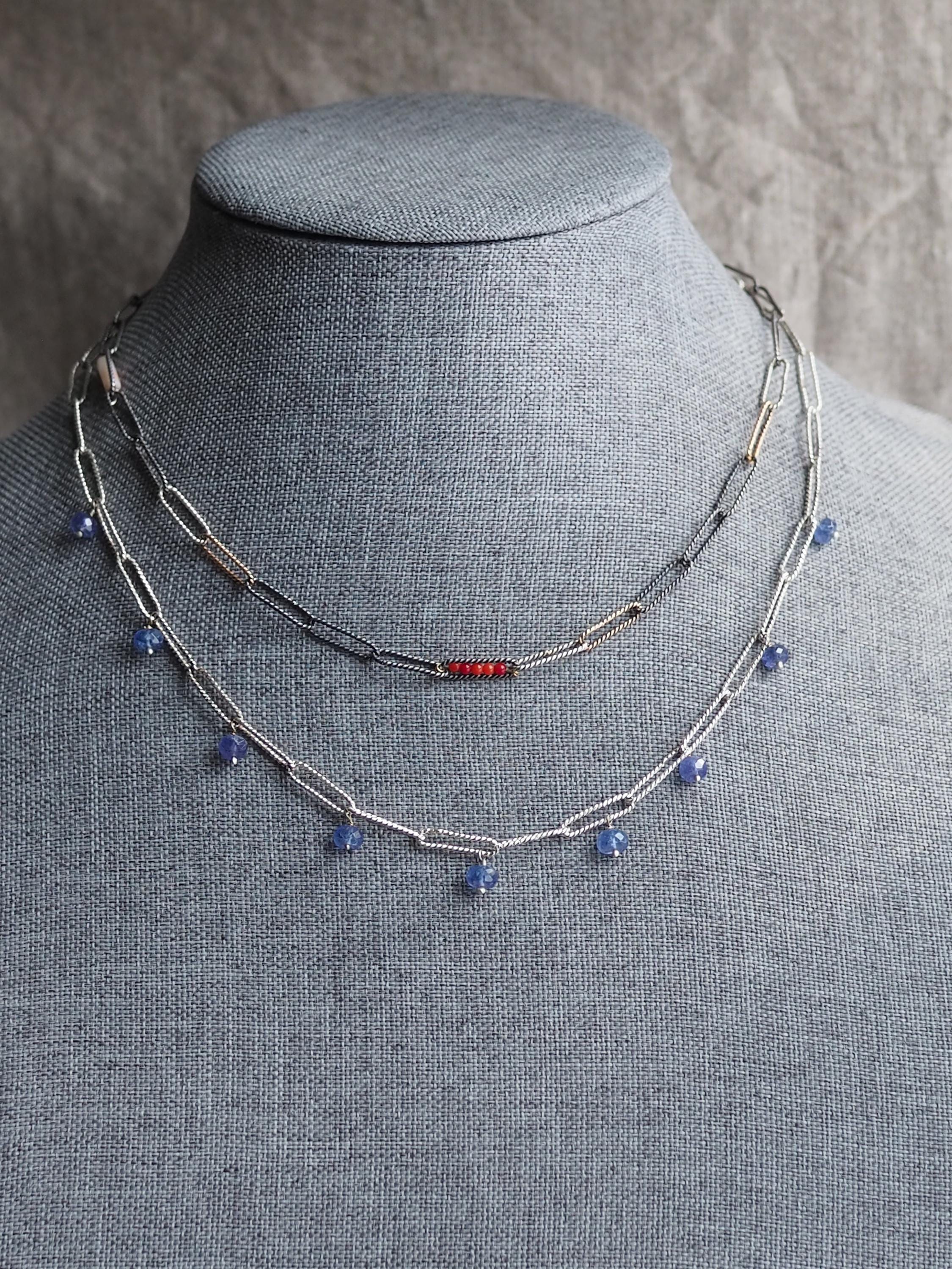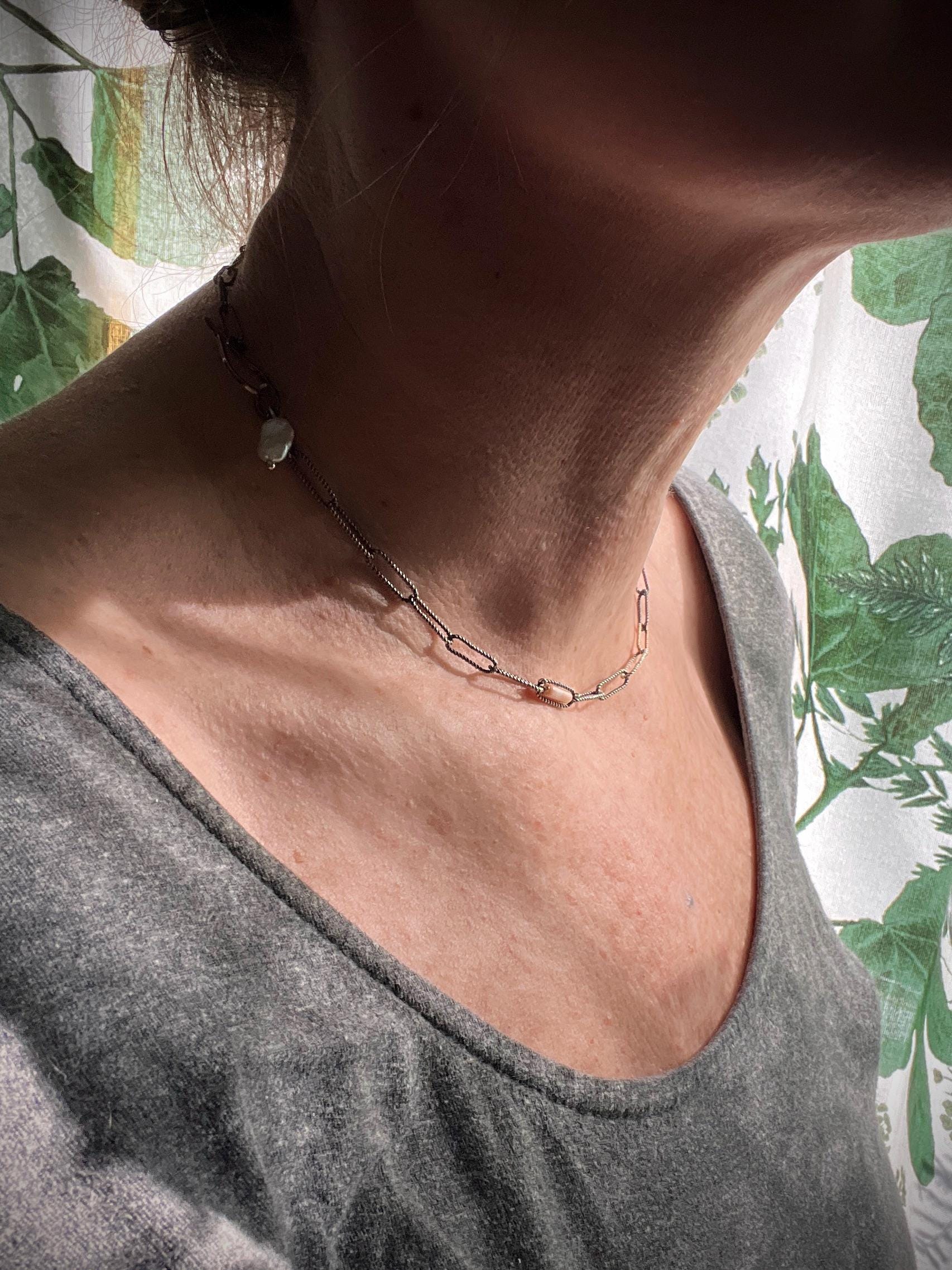 This lovely, unique necklace measures approximately 17 inches in length, including the handmade hook clasp, which can be clasped to any link for a shorter look.