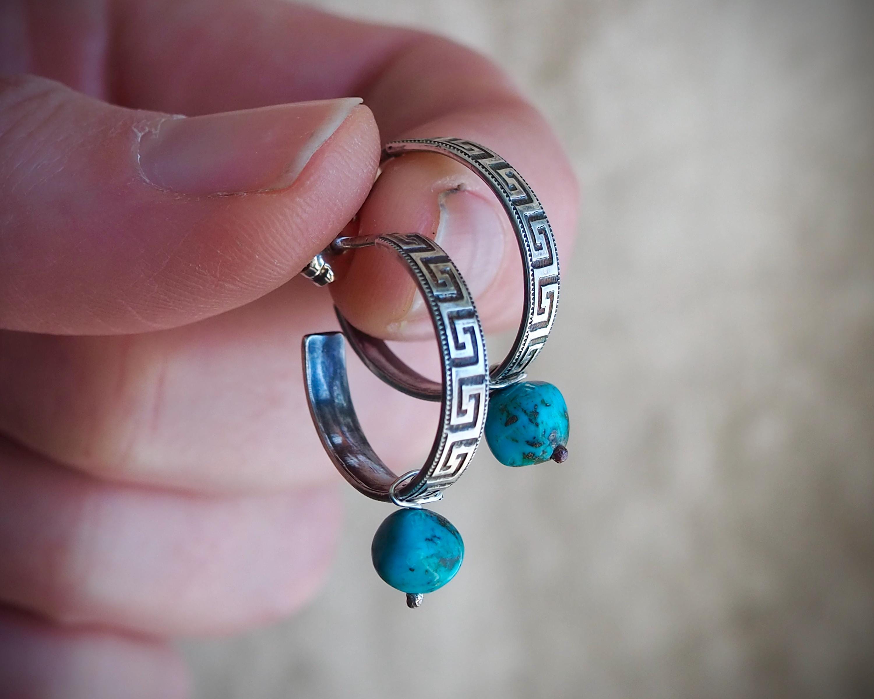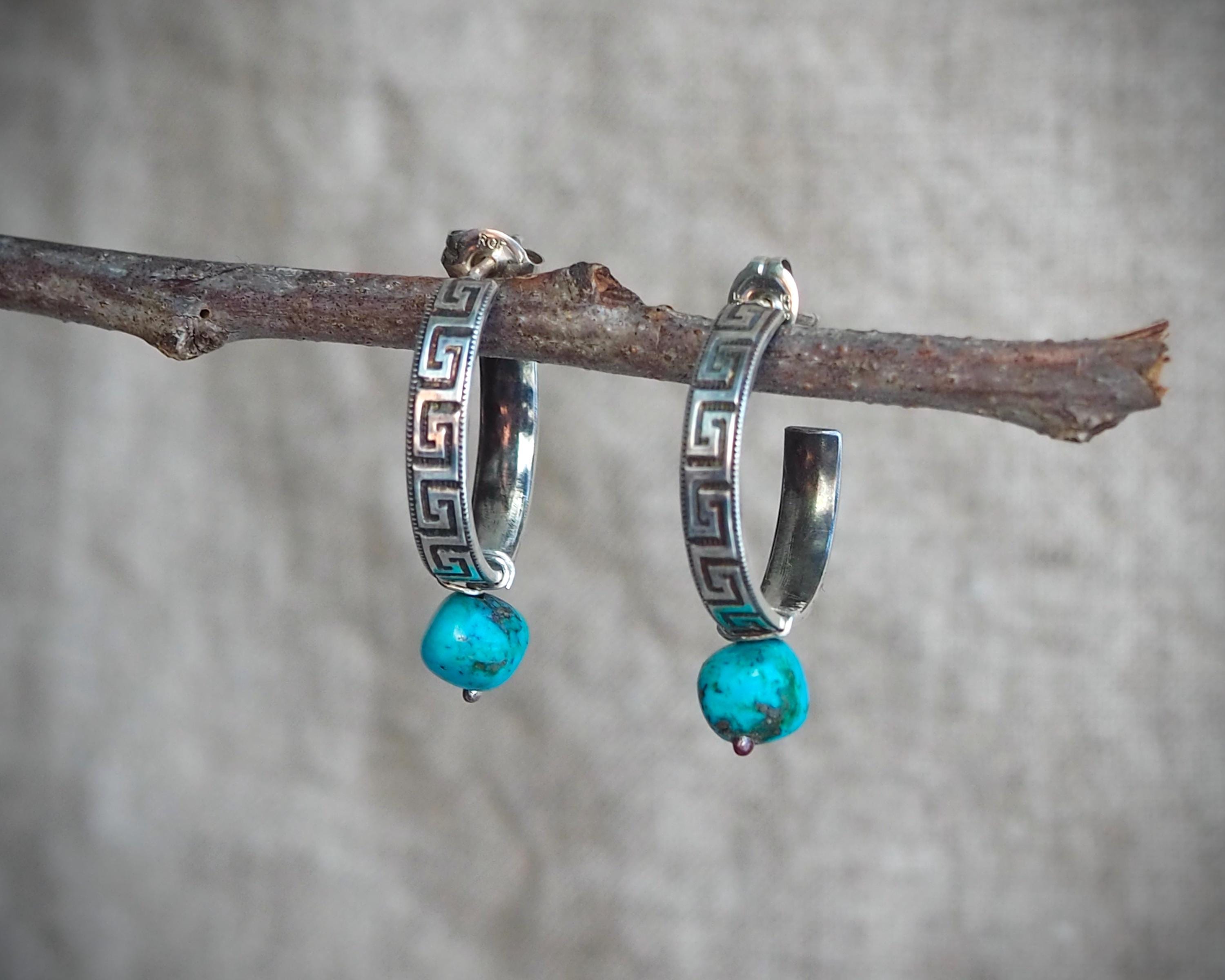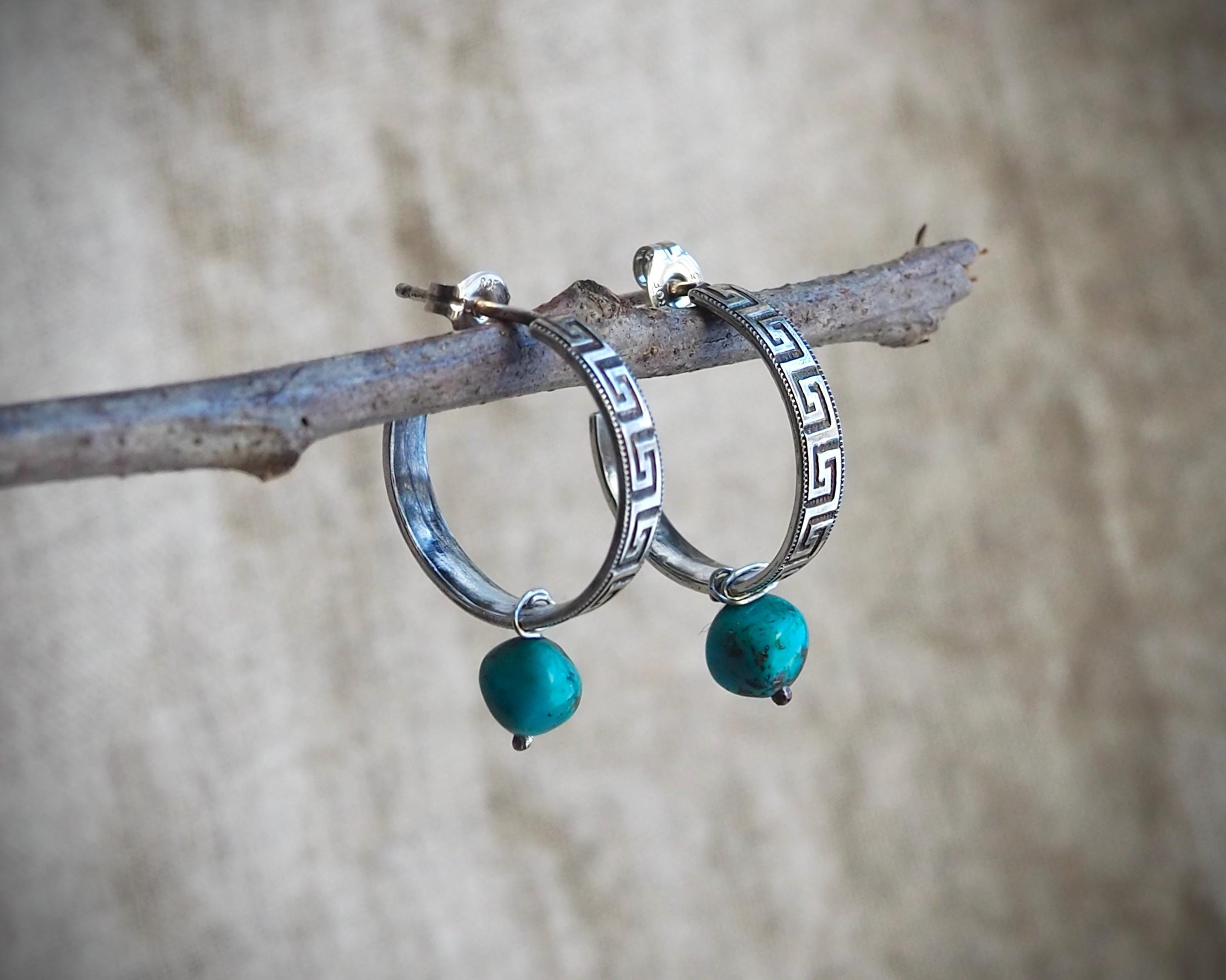 These 3/4 sterling silver hoops have the classic and ancient motif of the meander and are adorned with natural Kingman turquoise beads (approximately 6mm across). I created these small sterling silver hoops by hand one at a time, oxidized and polished them to accentuate the intricate design. They are 4mm wide, measure approximately 0.75" in diameter, and come with sterling silver ear nuts.