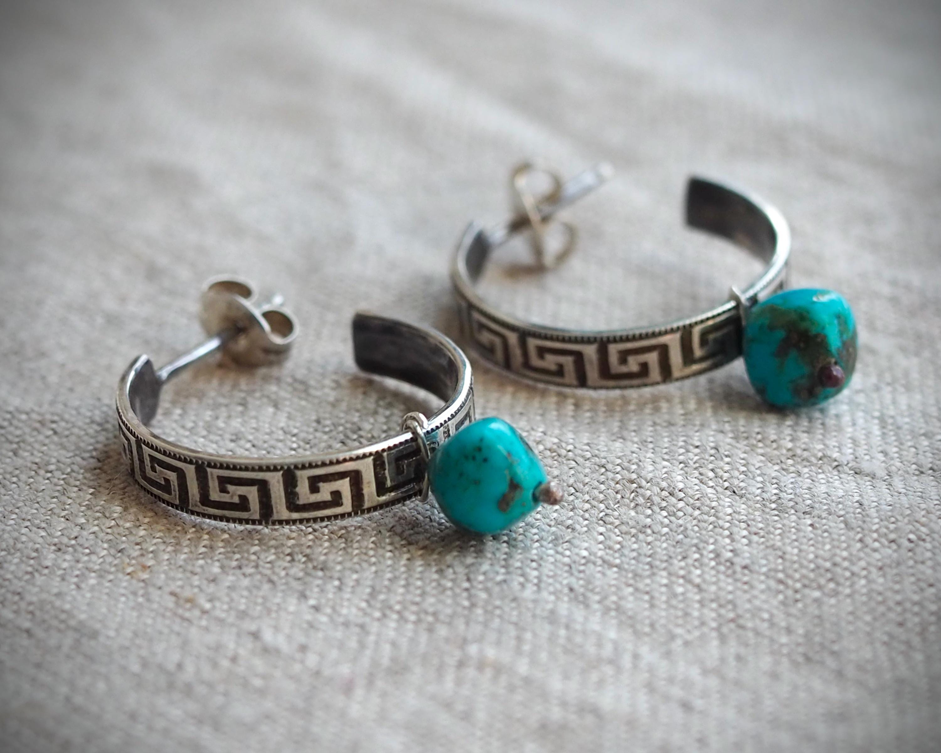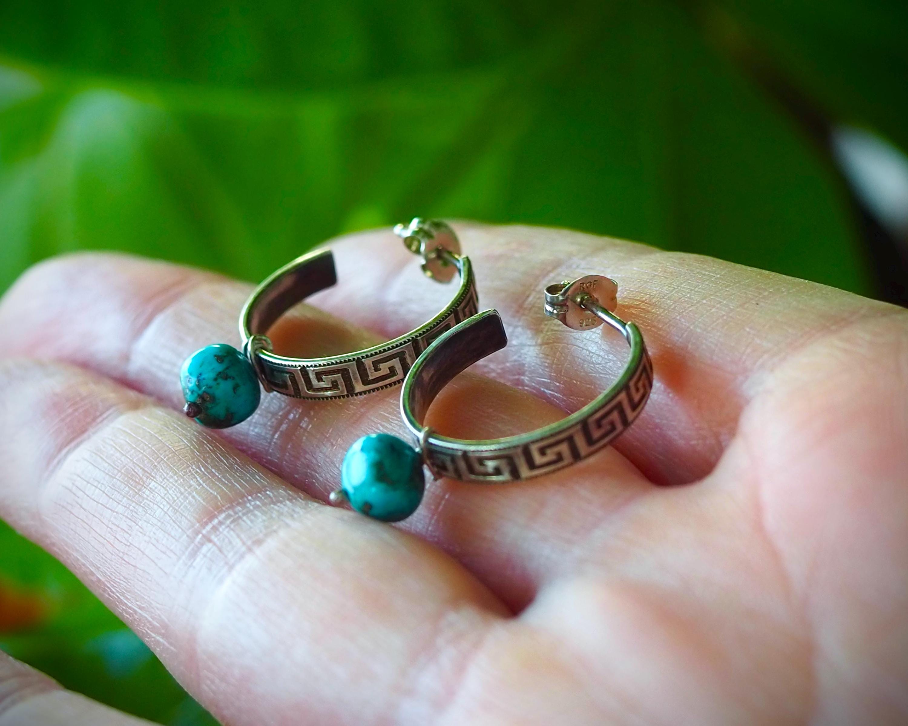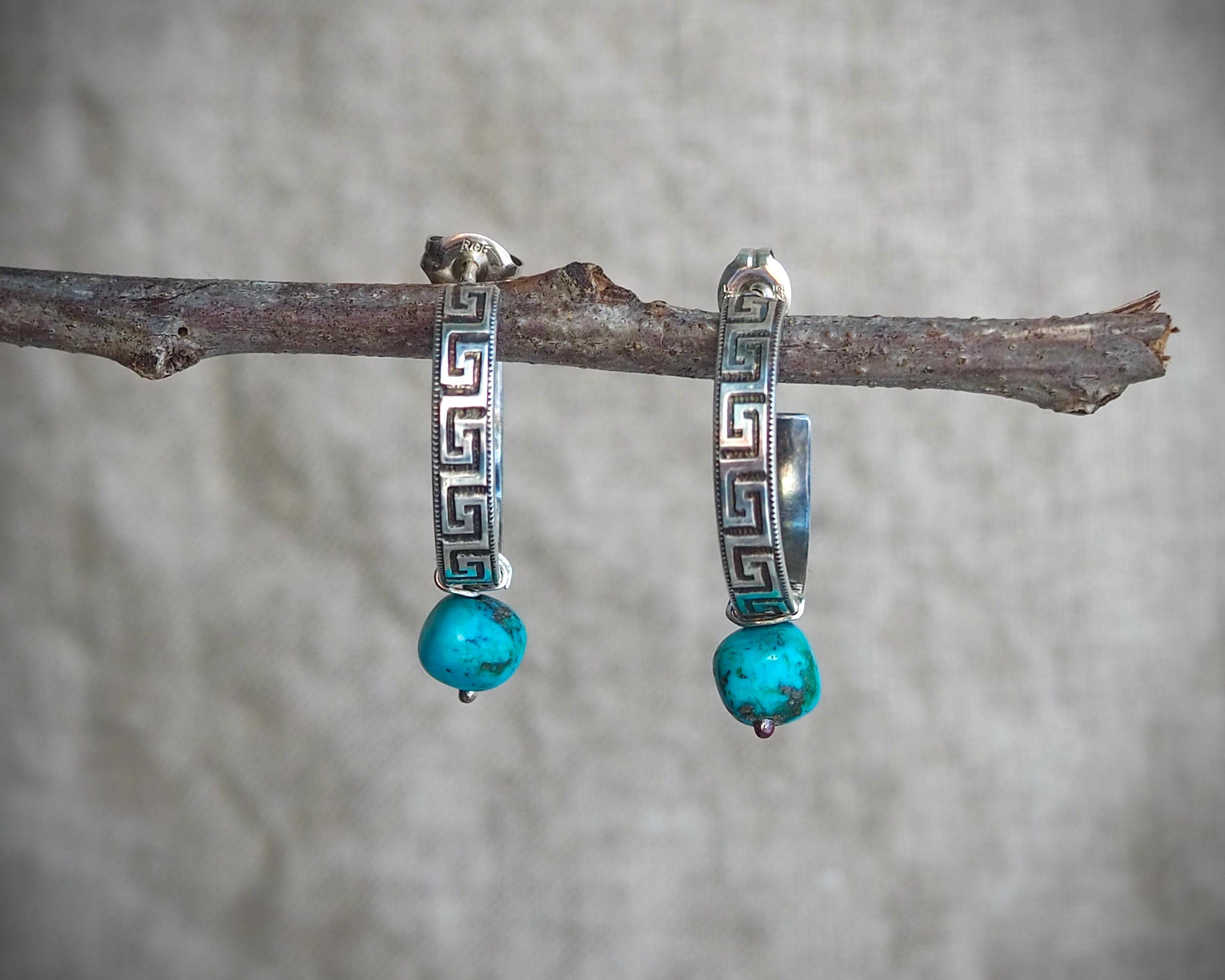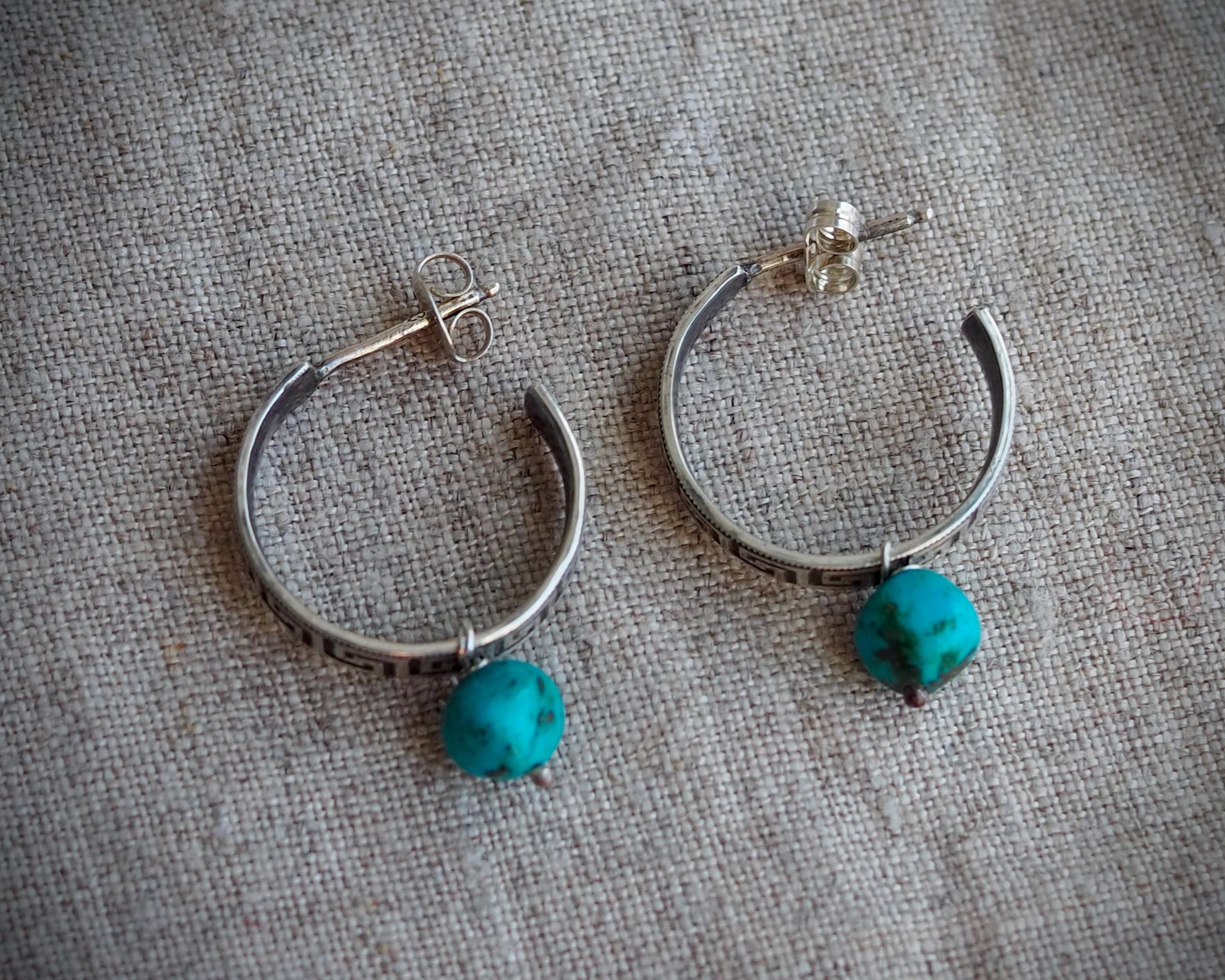 These 3/4 sterling silver hoops have the classic and ancient motif of the meander and are adorned with natural Kingman turquoise beads (approximately 6mm across). I created these small sterling silver hoops by hand one at a time, oxidized and polished them to accentuate the intricate design. They are 4mm wide, measure approximately 0.75" in diameter, and come with sterling silver ear nuts.