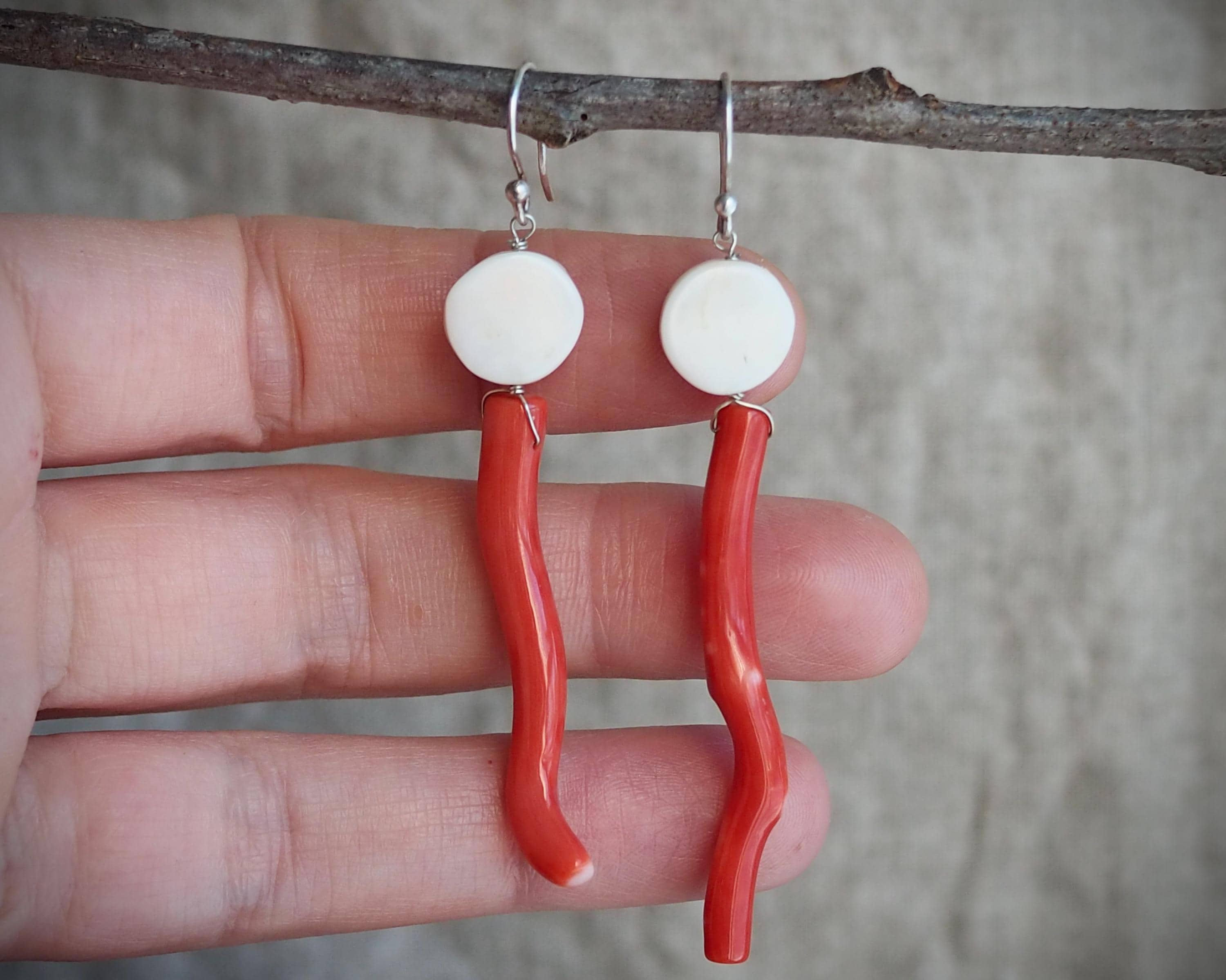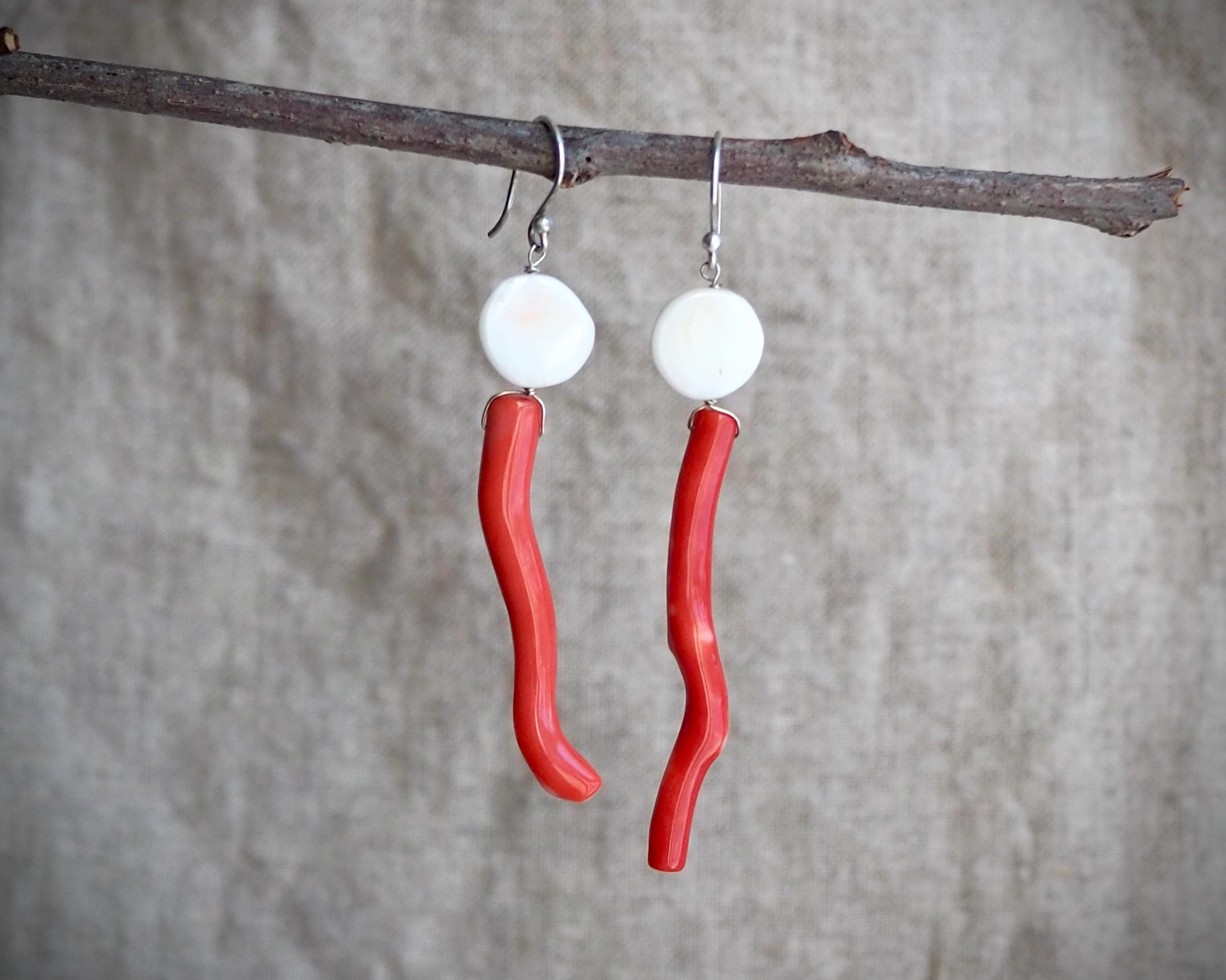 Beautiful, salmon colored Japanese deep sea coral branches are paired with off-white Momo coral discs, wire wrapped with sterling silver wire. The earrings hang on classic sterling silver ear wires.