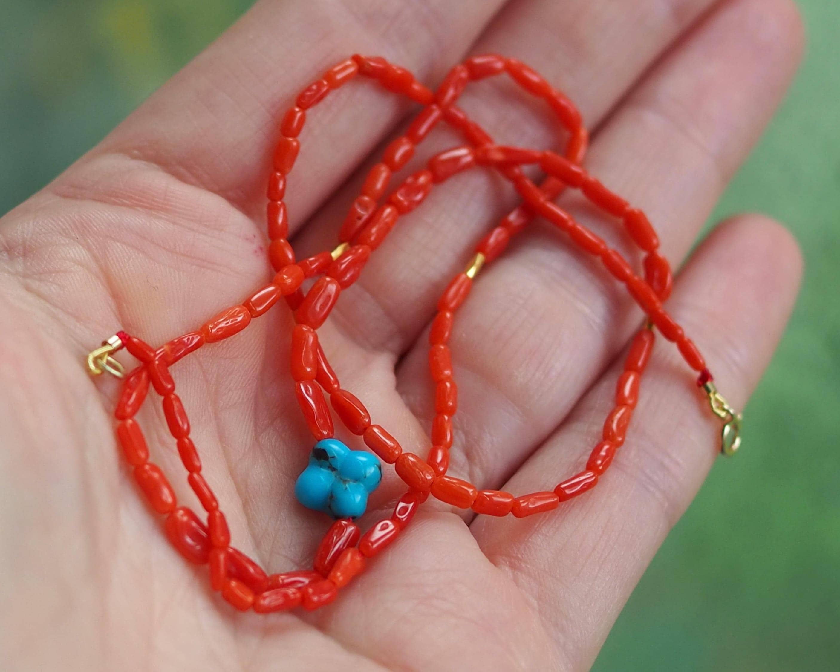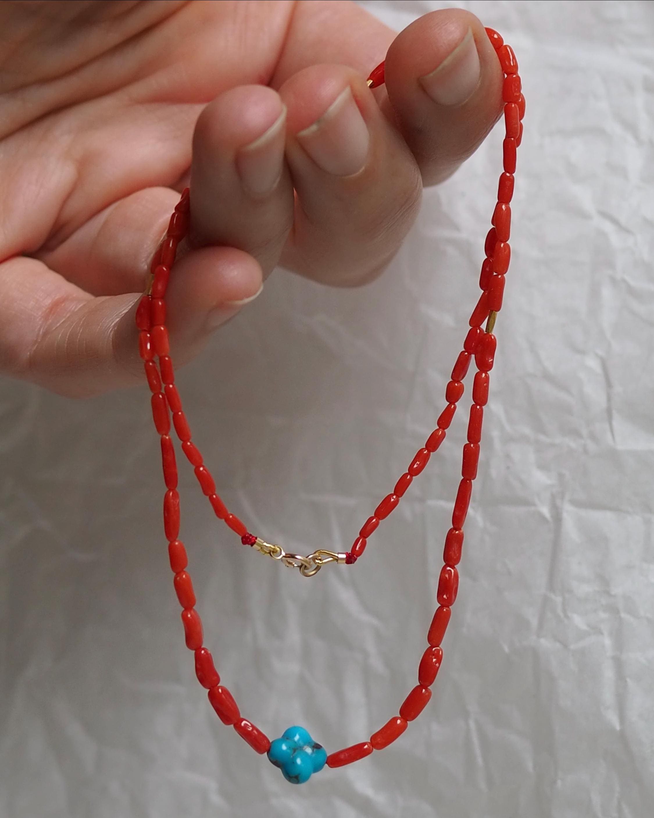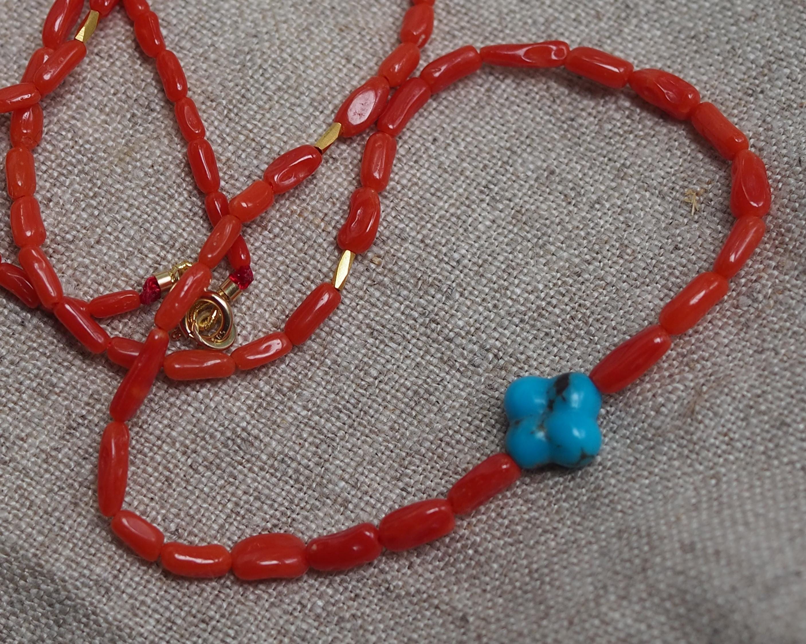 These high grade all natural Sardinian coral beads have a gorgeous, rich tomato red color (these beads have not been dyed!) They are an amazing work of nature from the Mediterranean Sea, blemish-free surface and lovely mix of round and tube shapes, 100% natural beauty. The beads are organic 2x4mm tubes hand strung on red silk, paired with a sparkly 18k gold faceted tube beads and intense blue carved turquoise clover. The stone is 8mm Kingman turquoise from Arizona.