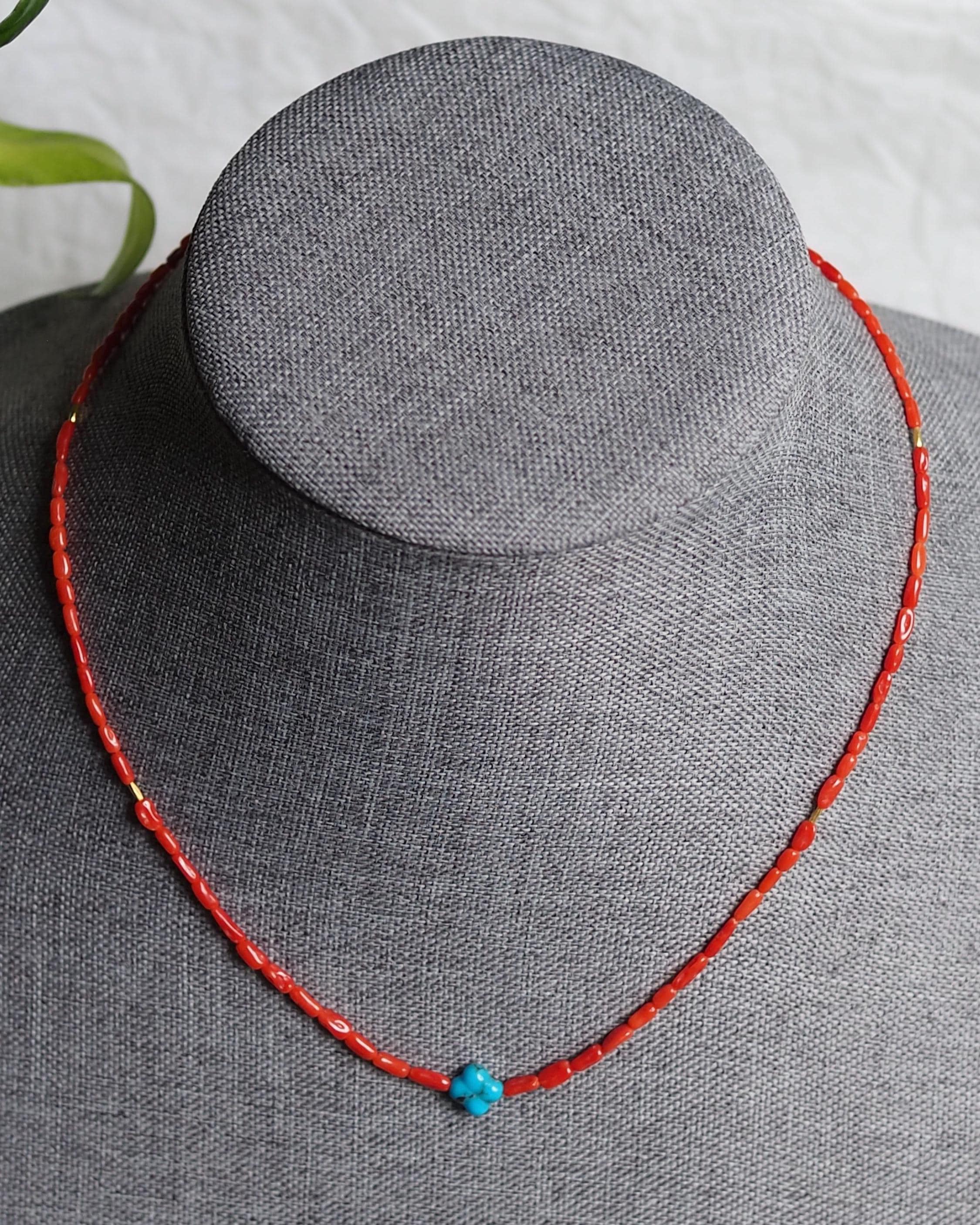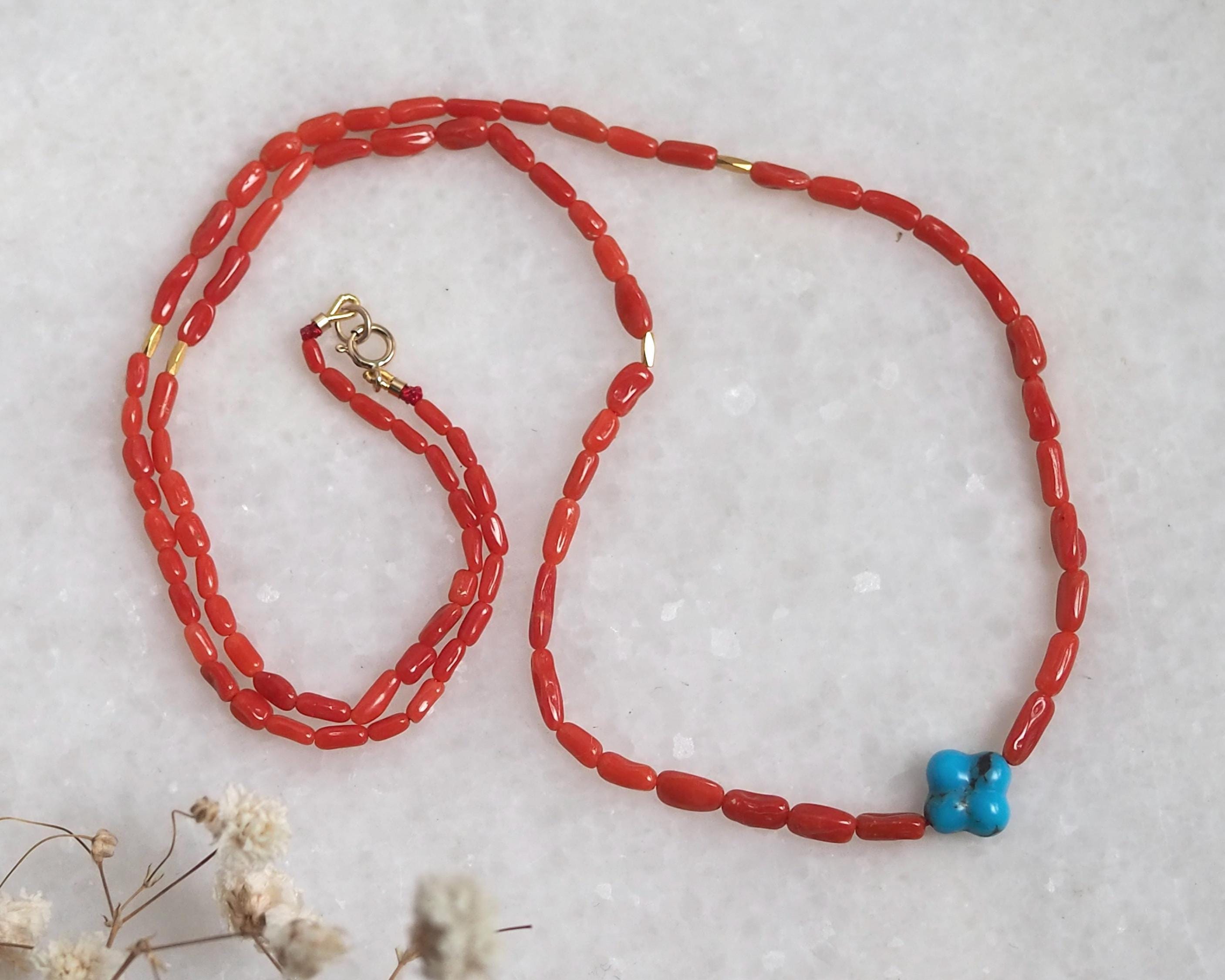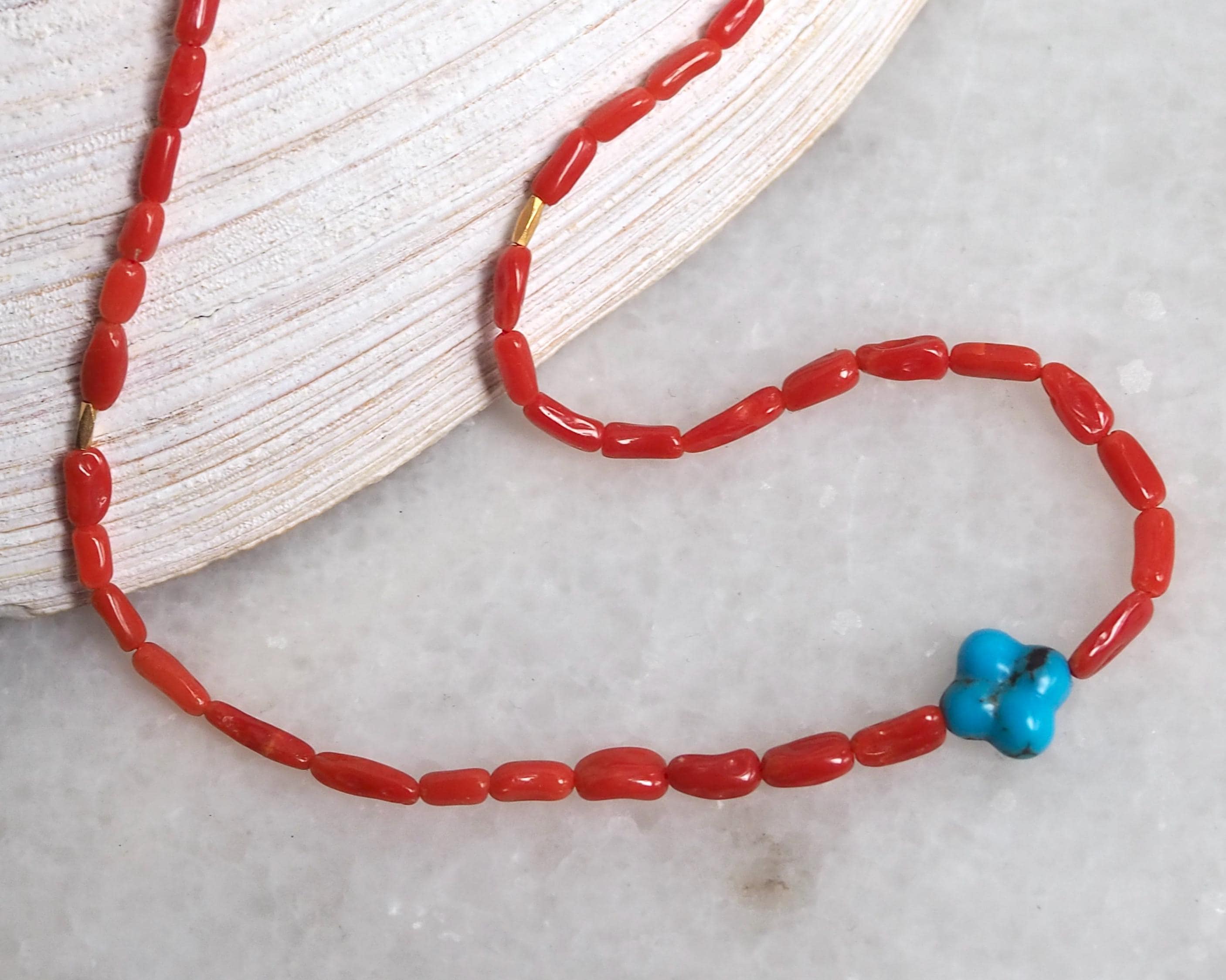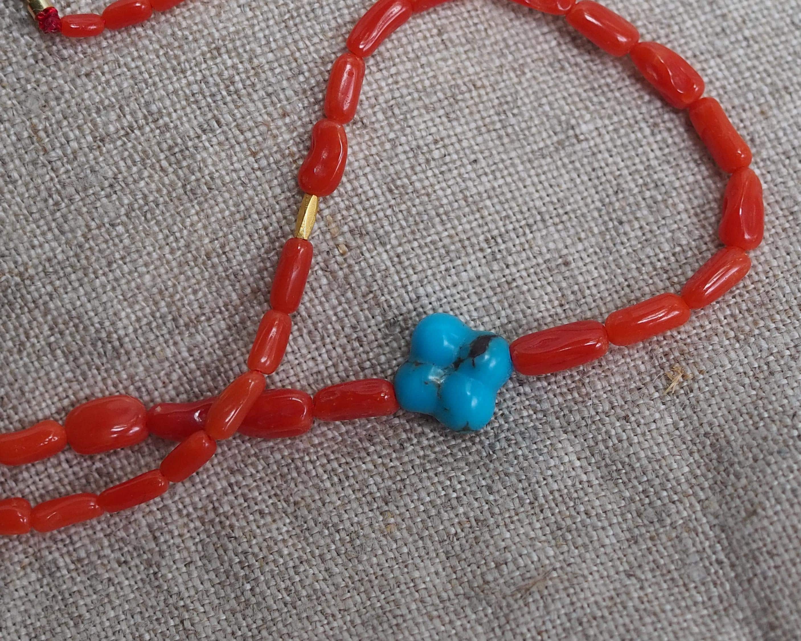 These high grade all natural Sardinian coral beads have a gorgeous, rich tomato red color (these beads have not been dyed!) They are an amazing work of nature from the Mediterranean Sea, blemish-free surface and lovely mix of round and tube shapes, 100% natural beauty. The beads are organic 2x4mm tubes hand strung on red silk, paired with a sparkly 18k gold faceted tube beads and intense blue carved turquoise clover. The stone is 8mm Kingman turquoise from Arizona.