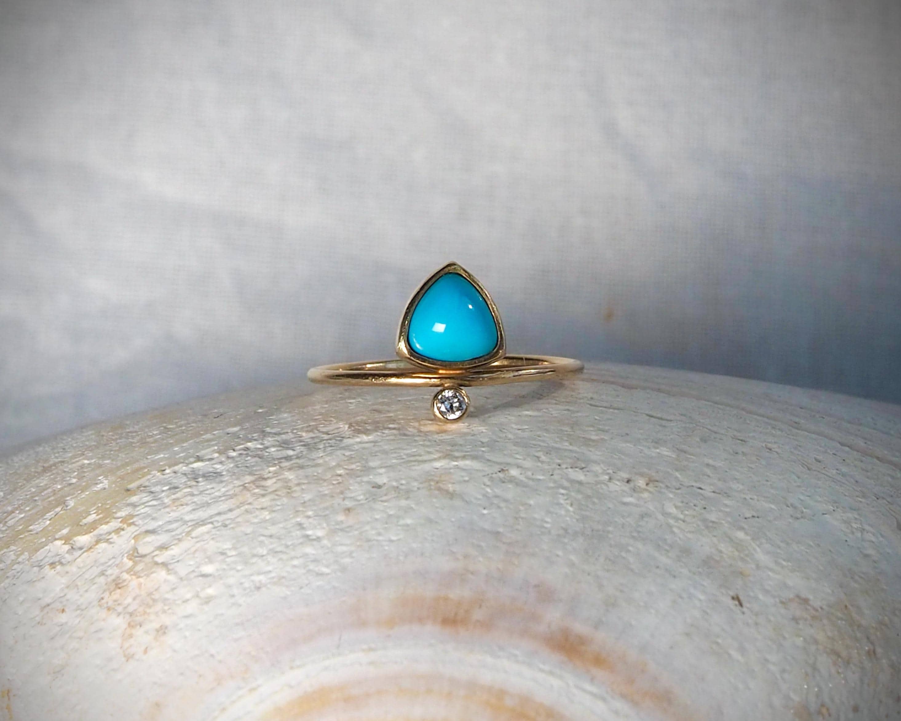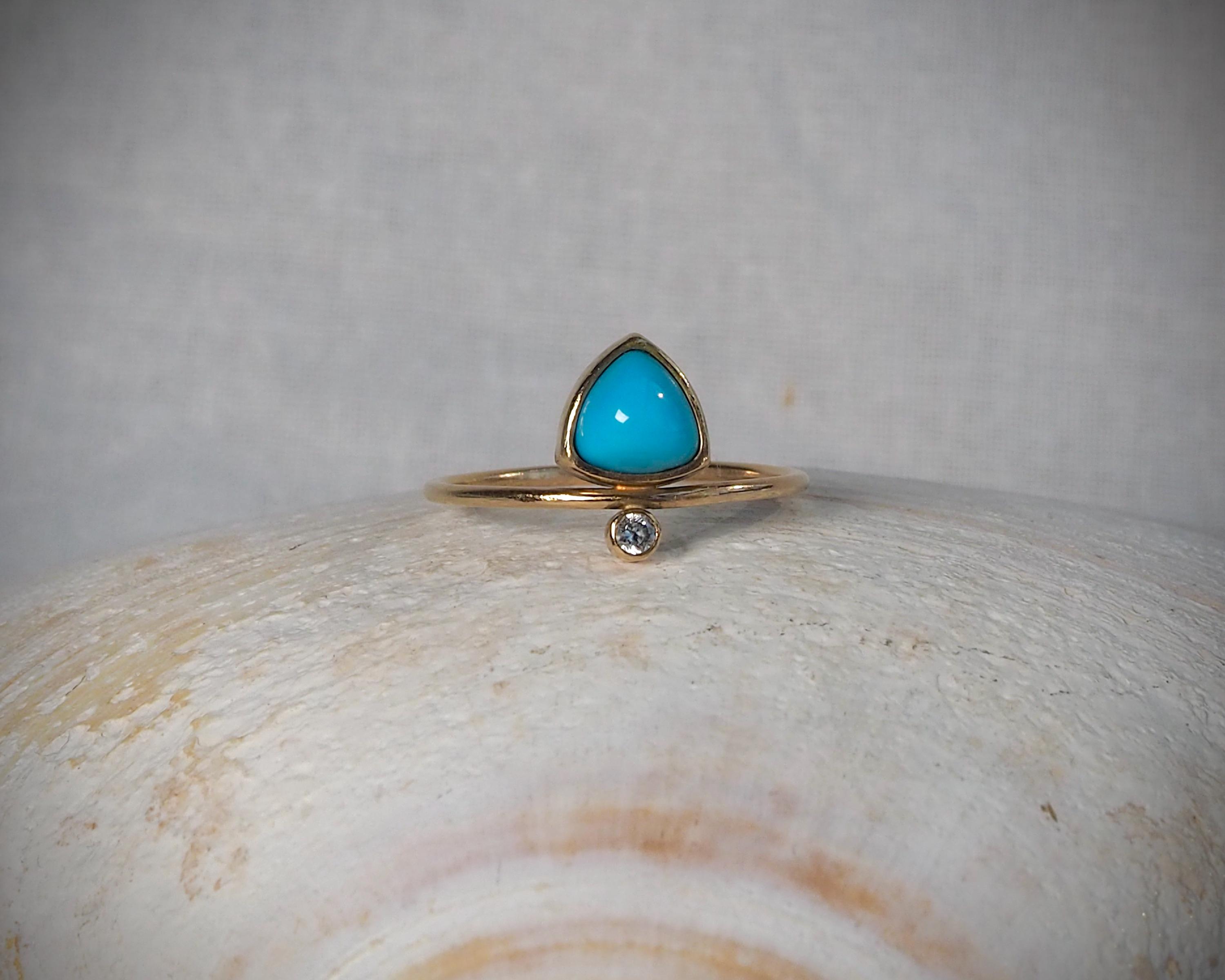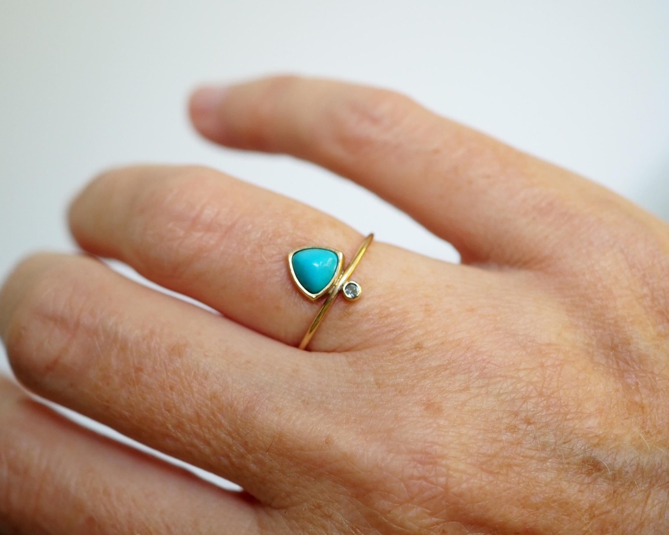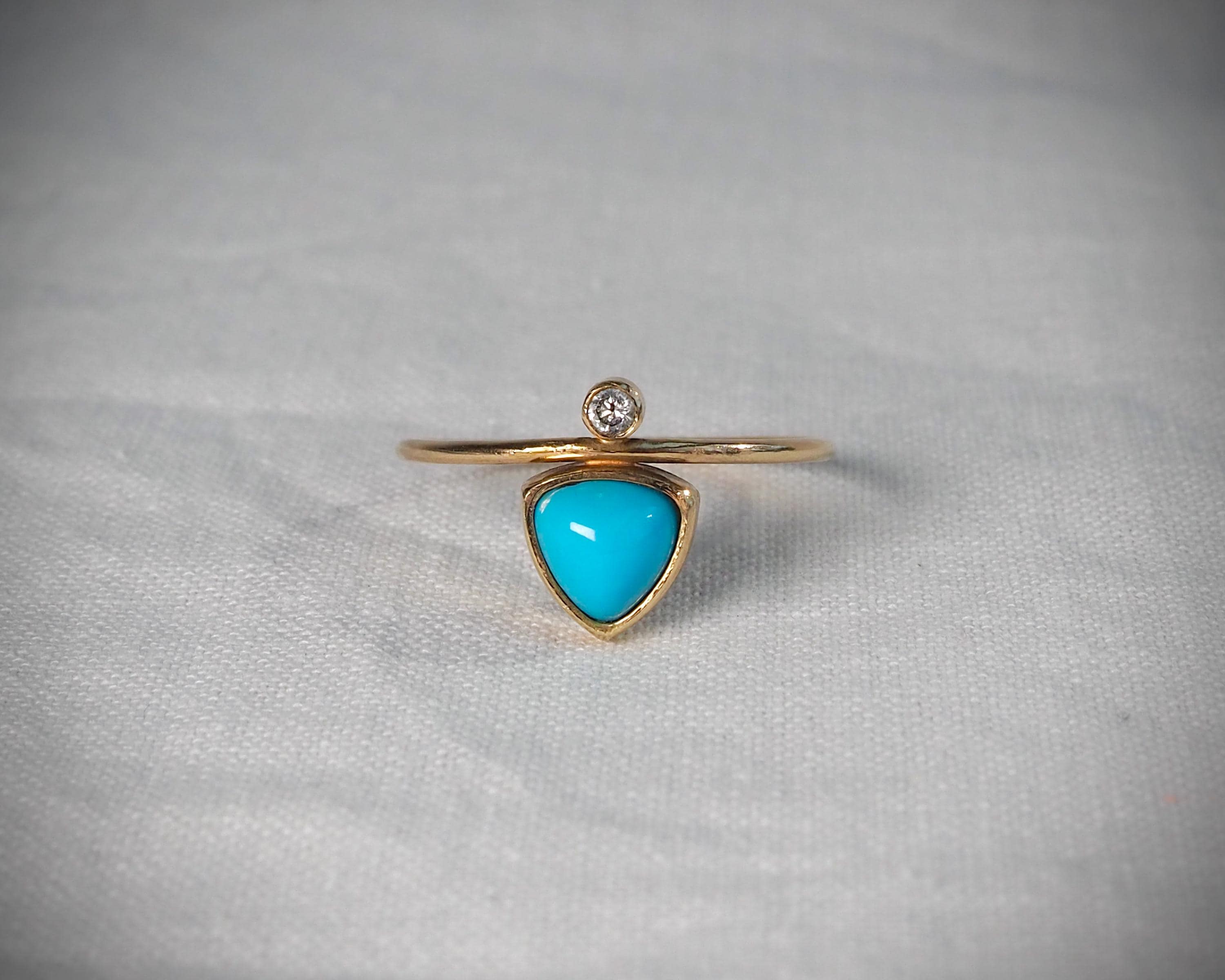 Beautiful sky blue trillion cut Sleeping Beauty turquoise set the in a 14k gold open back bezel and adorned with a sparkly 2mm white diamond. The band is 1mm recycled 14k gold.