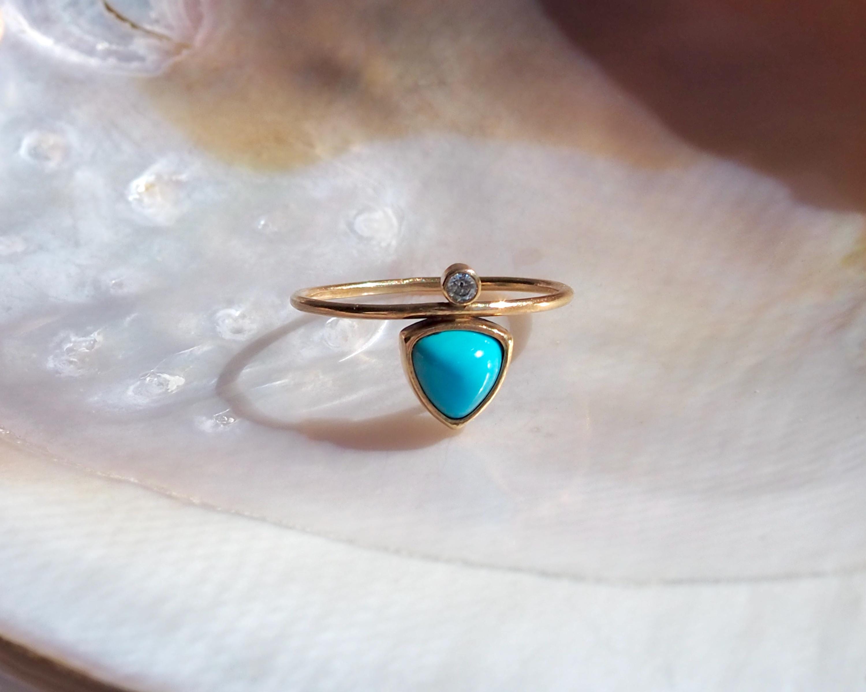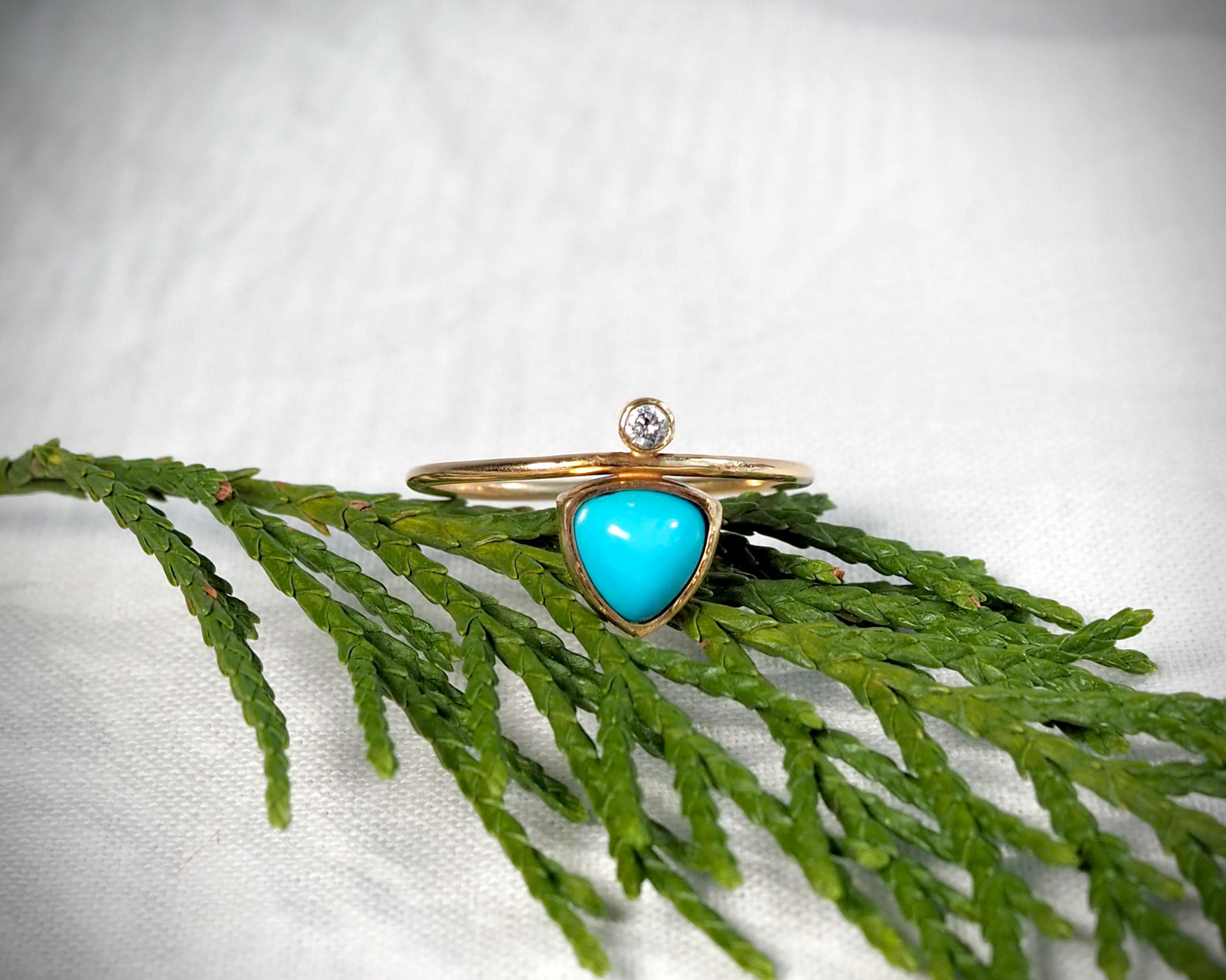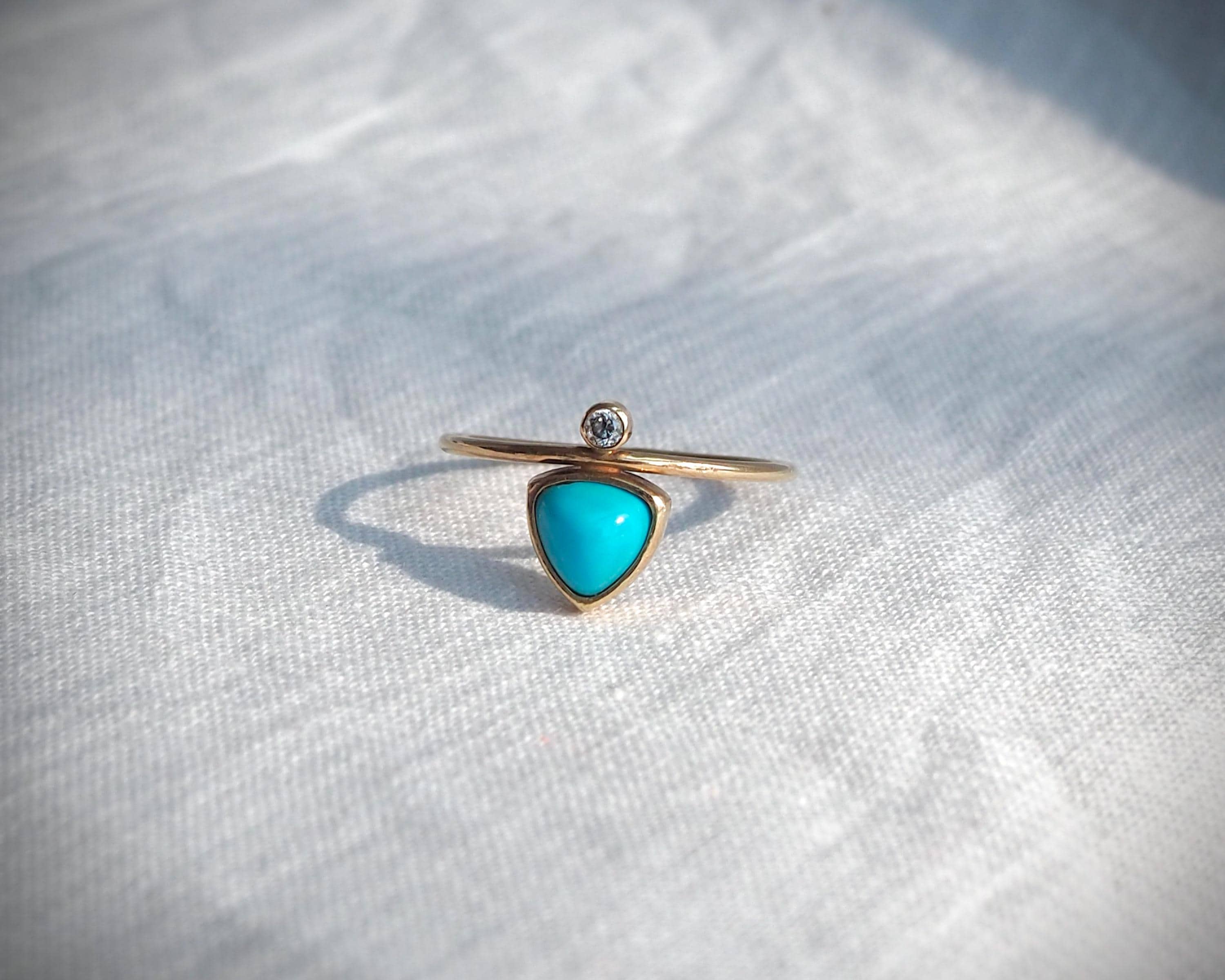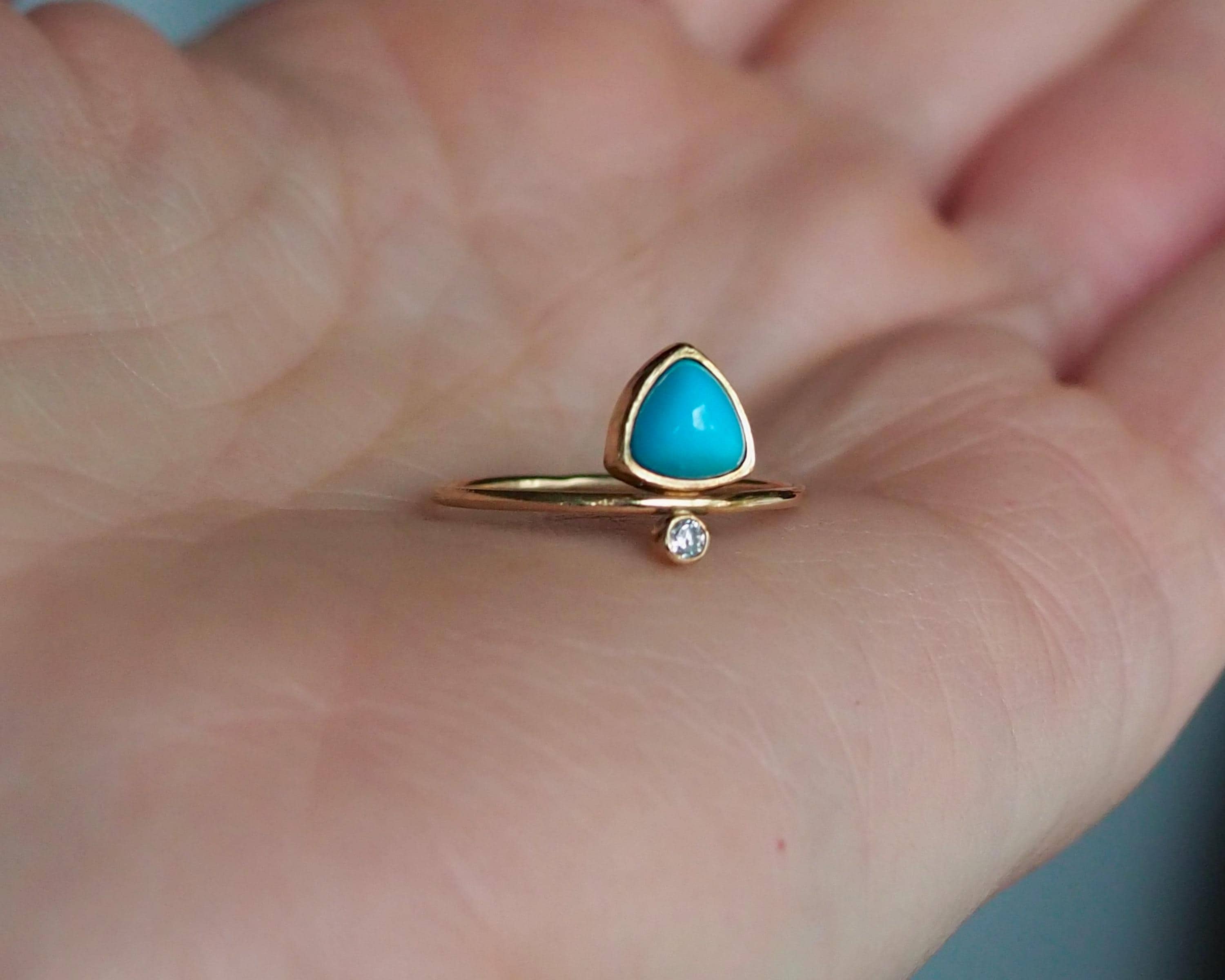 Beautiful sky blue trillion cut Sleeping Beauty turquoise set the in a 14k gold open back bezel and adorned with a sparkly 2mm white diamond. The band is 1mm recycled 14k gold.