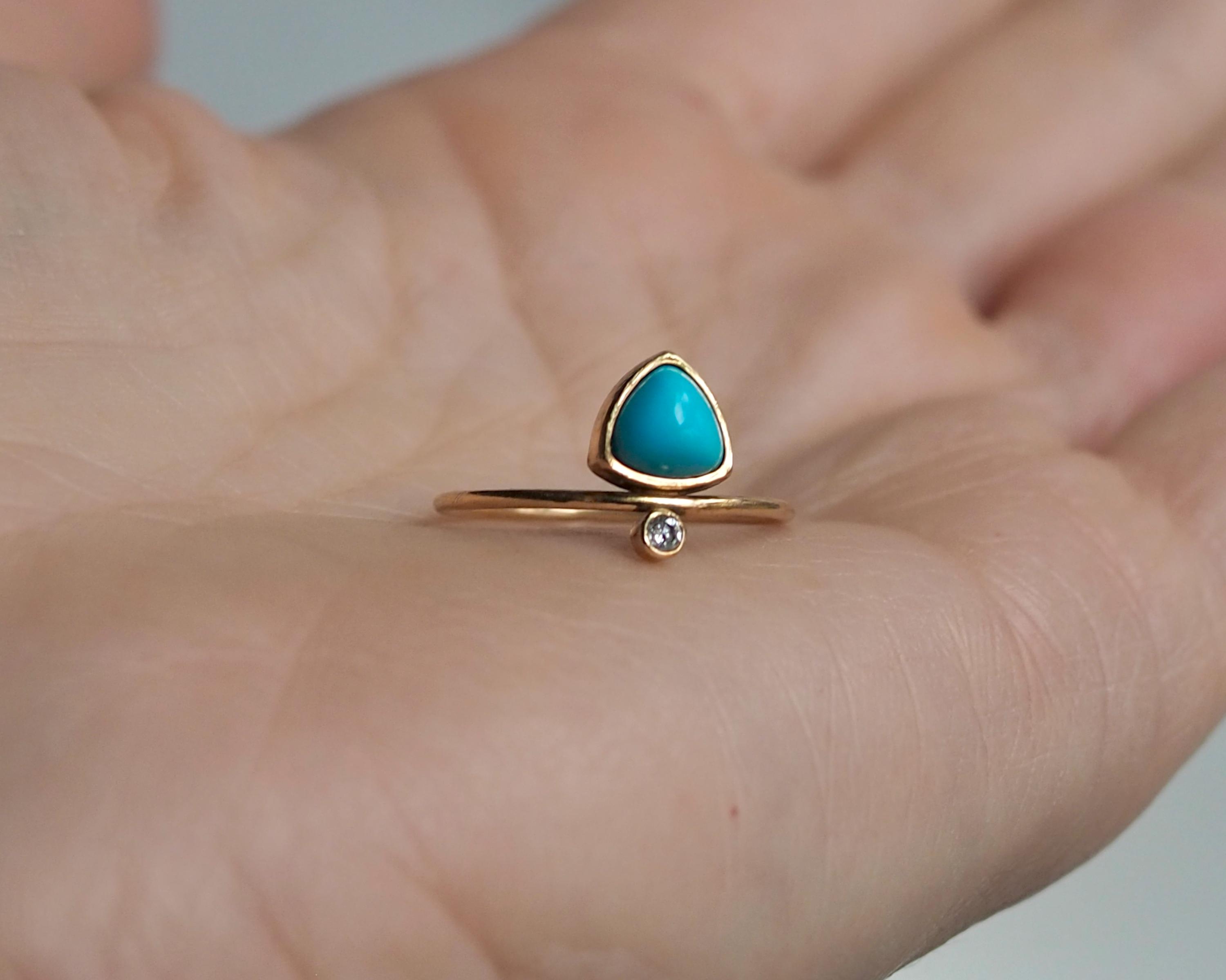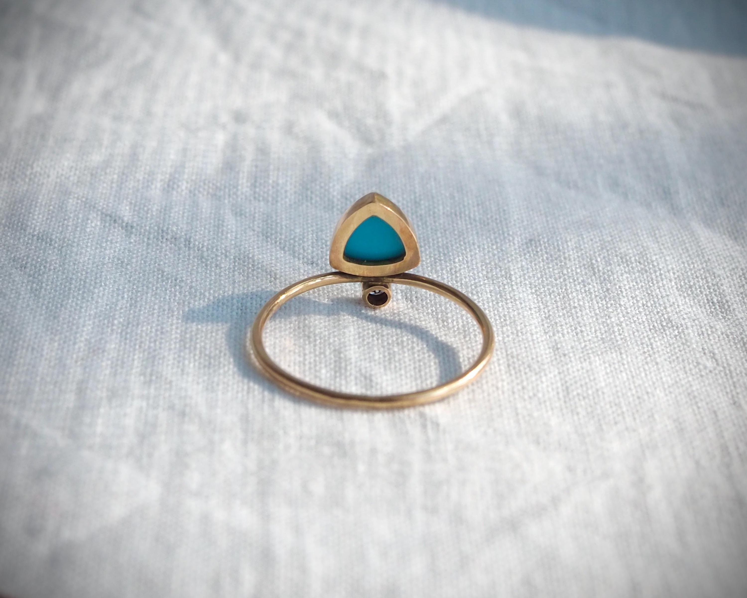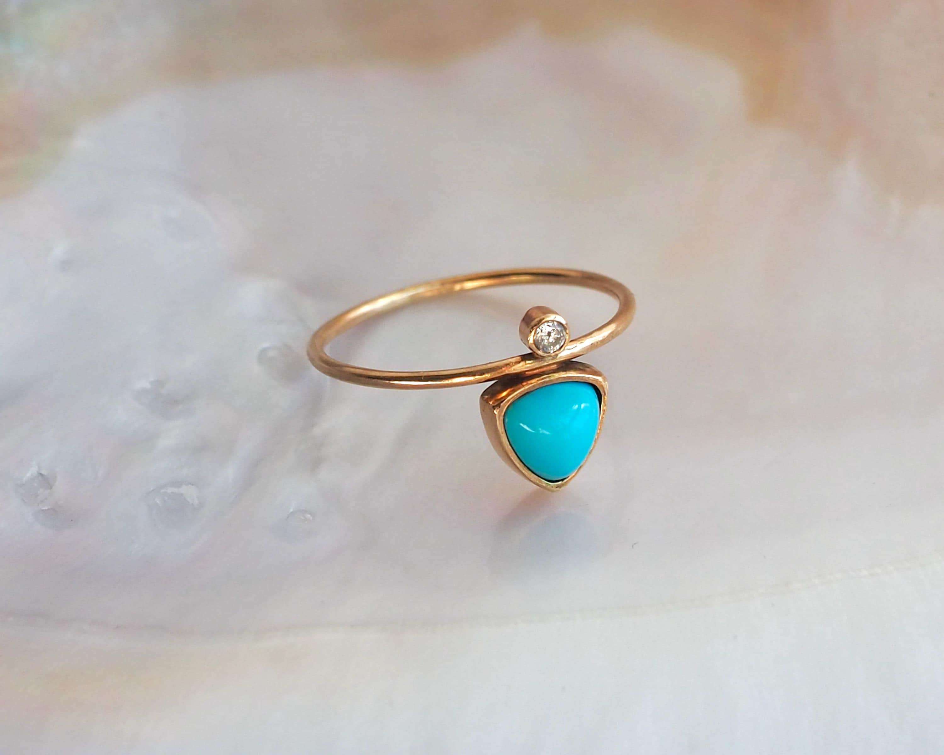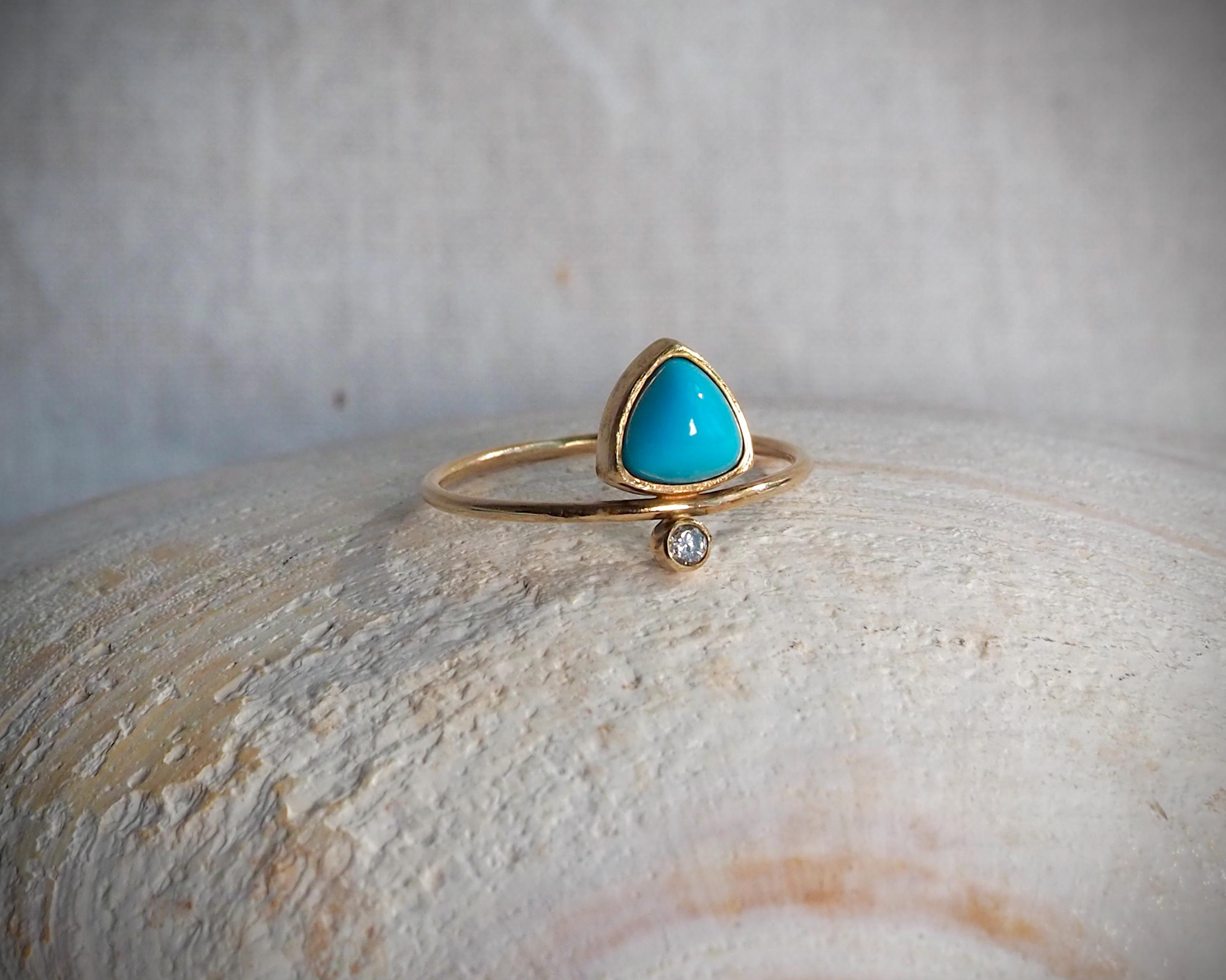 Beautiful sky blue trillion cut Sleeping Beauty turquoise set the in a 14k gold open back bezel and adorned with a sparkly 2mm white diamond. The band is 1mm recycled 14k gold.