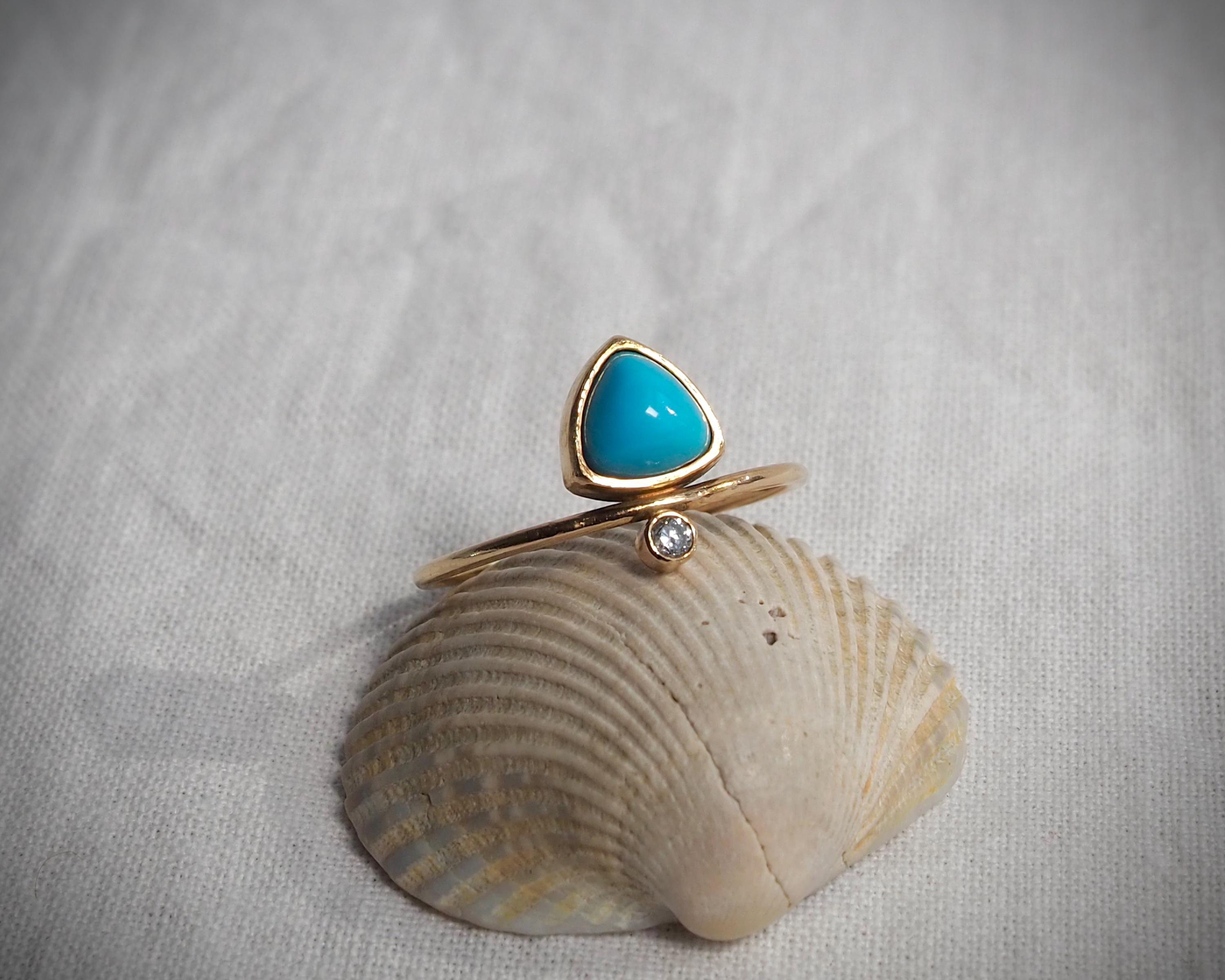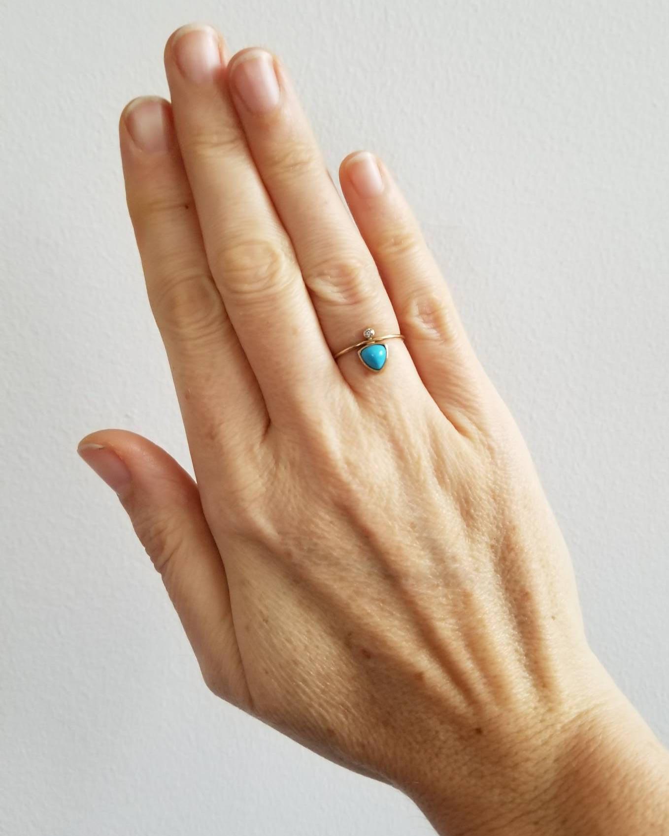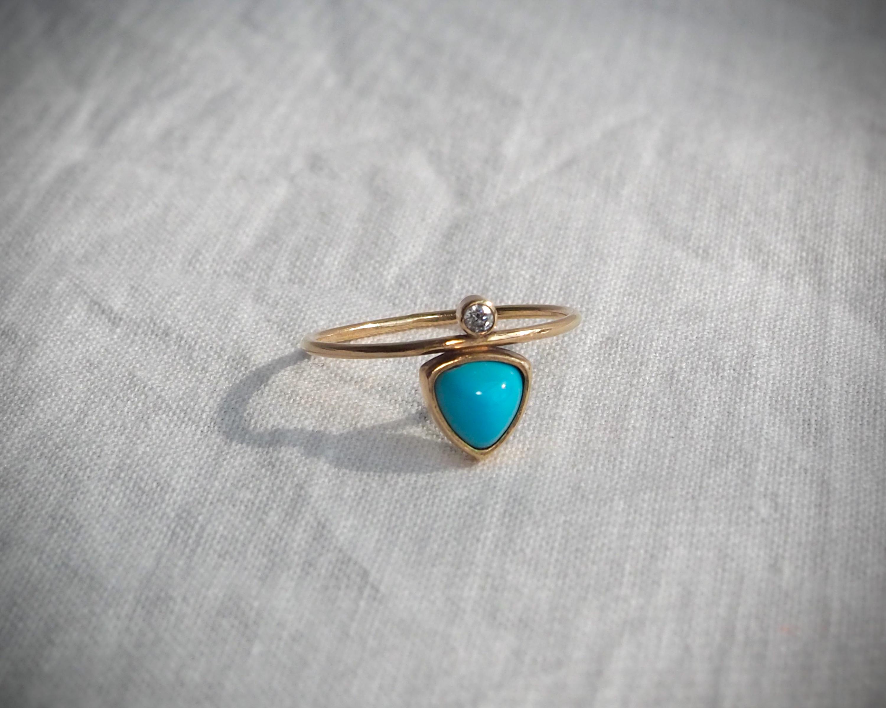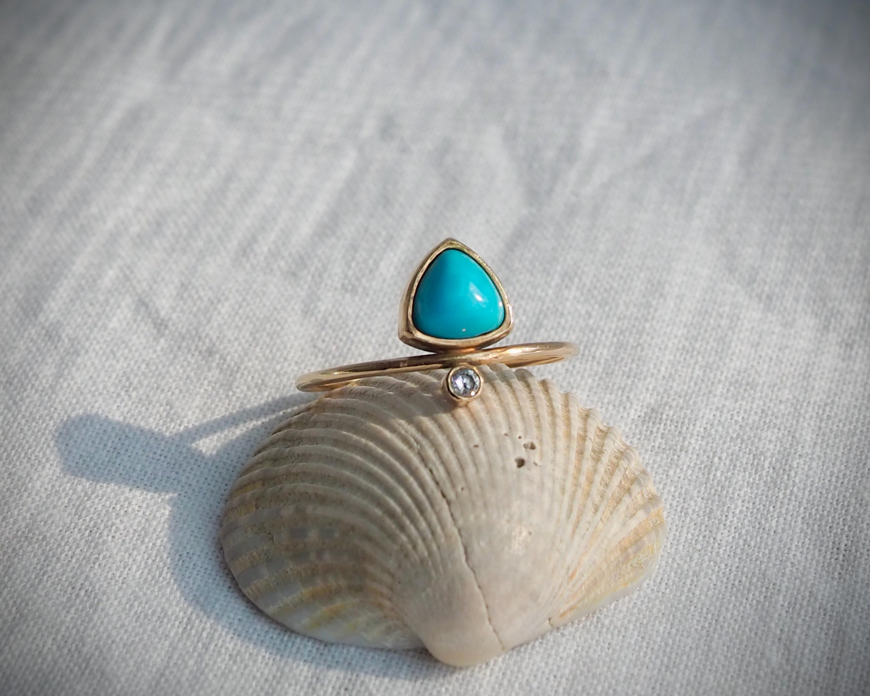 Beautiful sky blue trillion cut Sleeping Beauty turquoise set the in a 14k gold open back bezel and adorned with a sparkly 2mm white diamond. The band is 1mm recycled 14k gold.