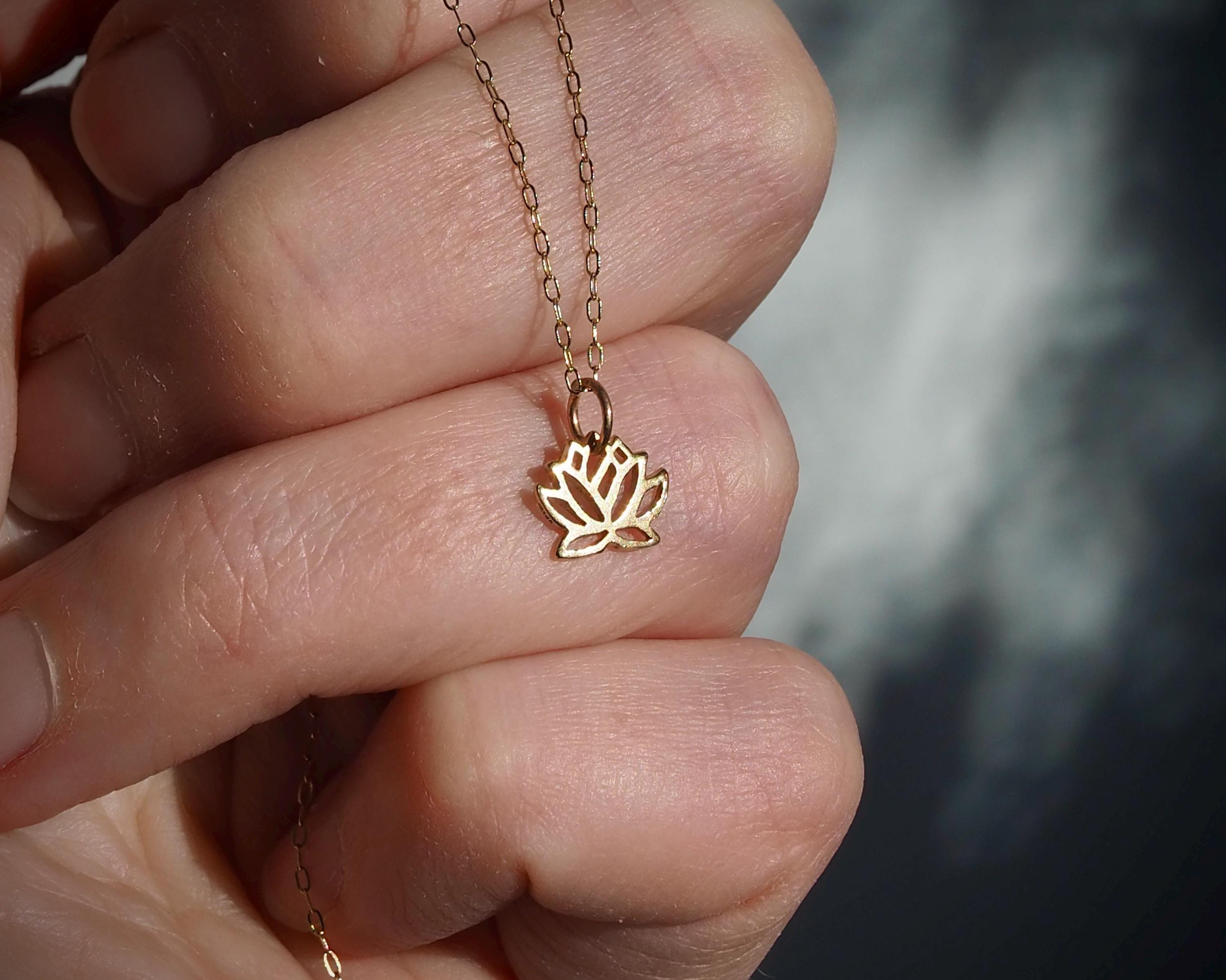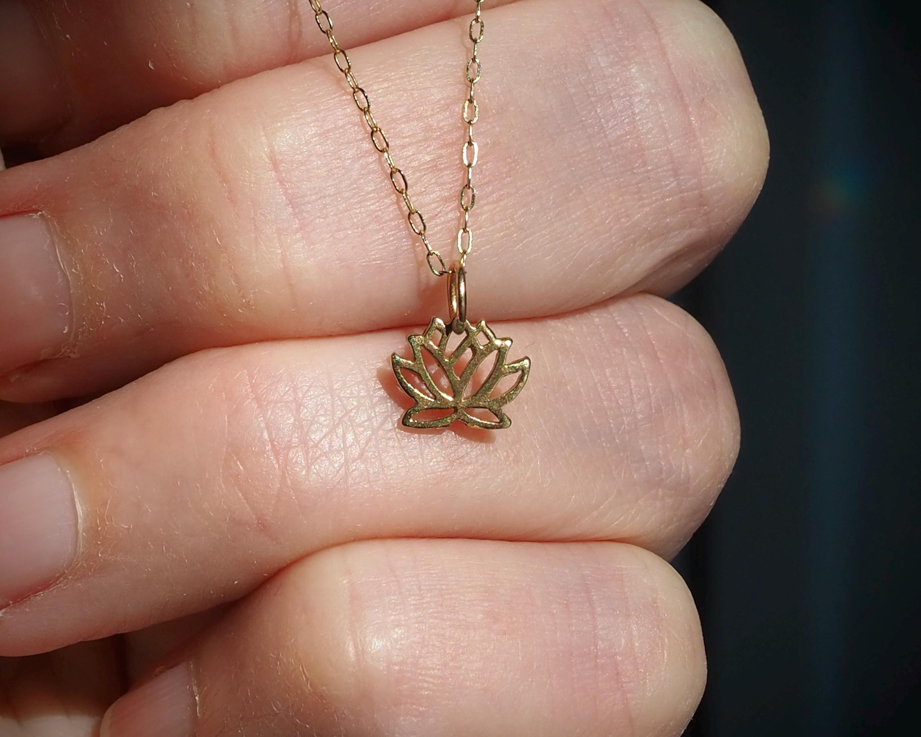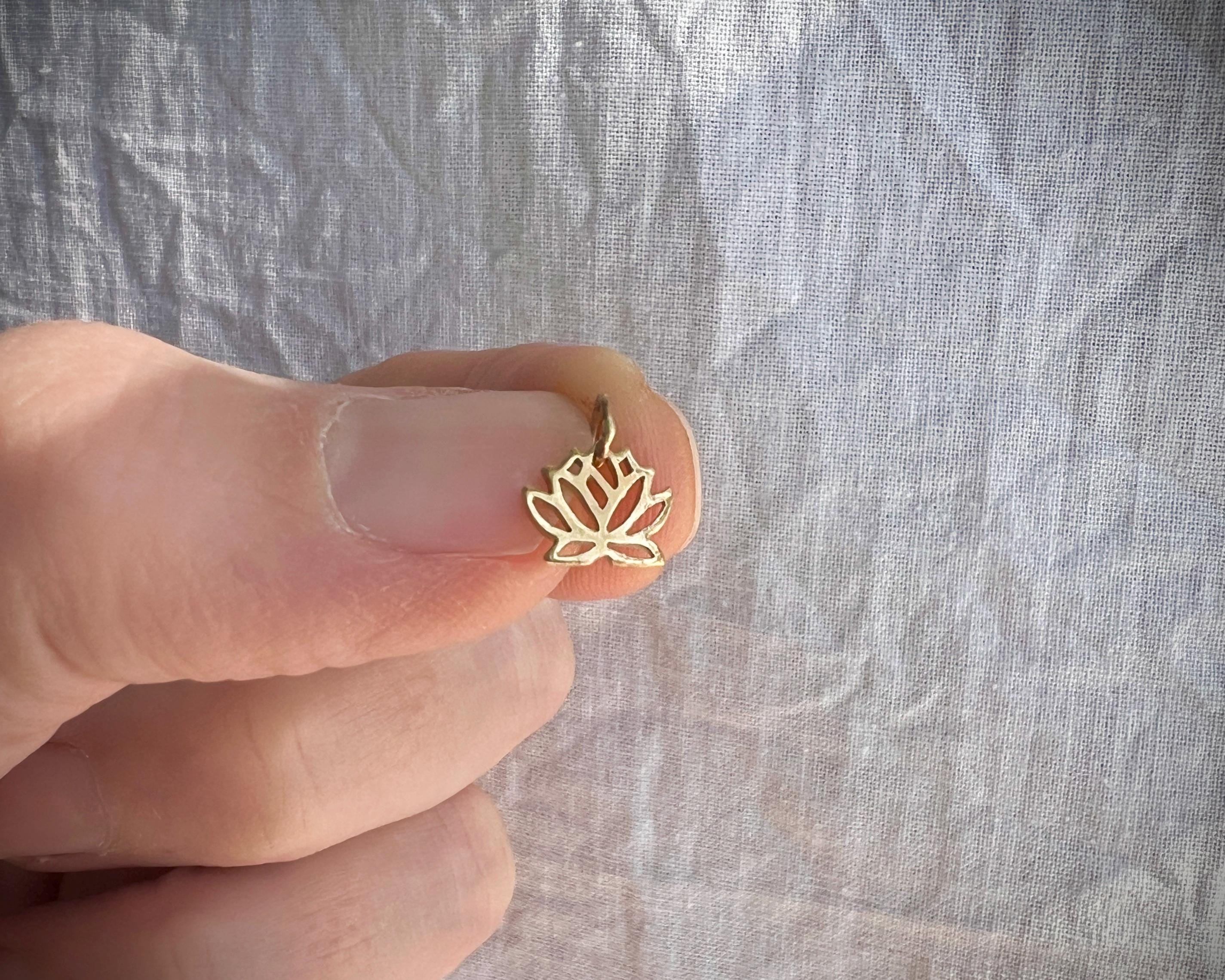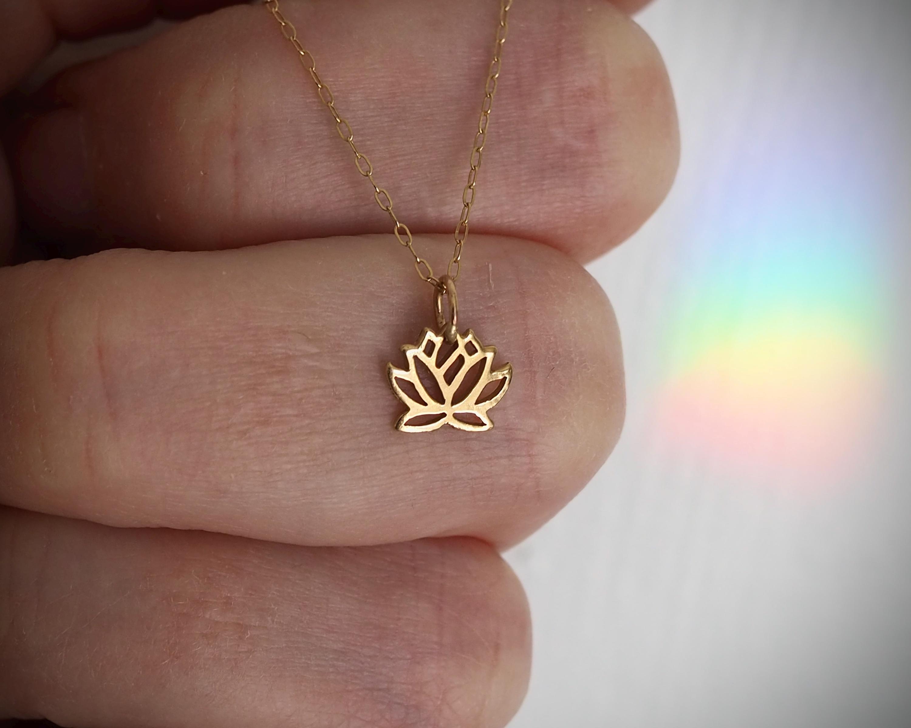 This small, stylized solid 14k gold lotus pendant is subtle and elegant. The pendant measures 9mm by 12mm including the bail.
