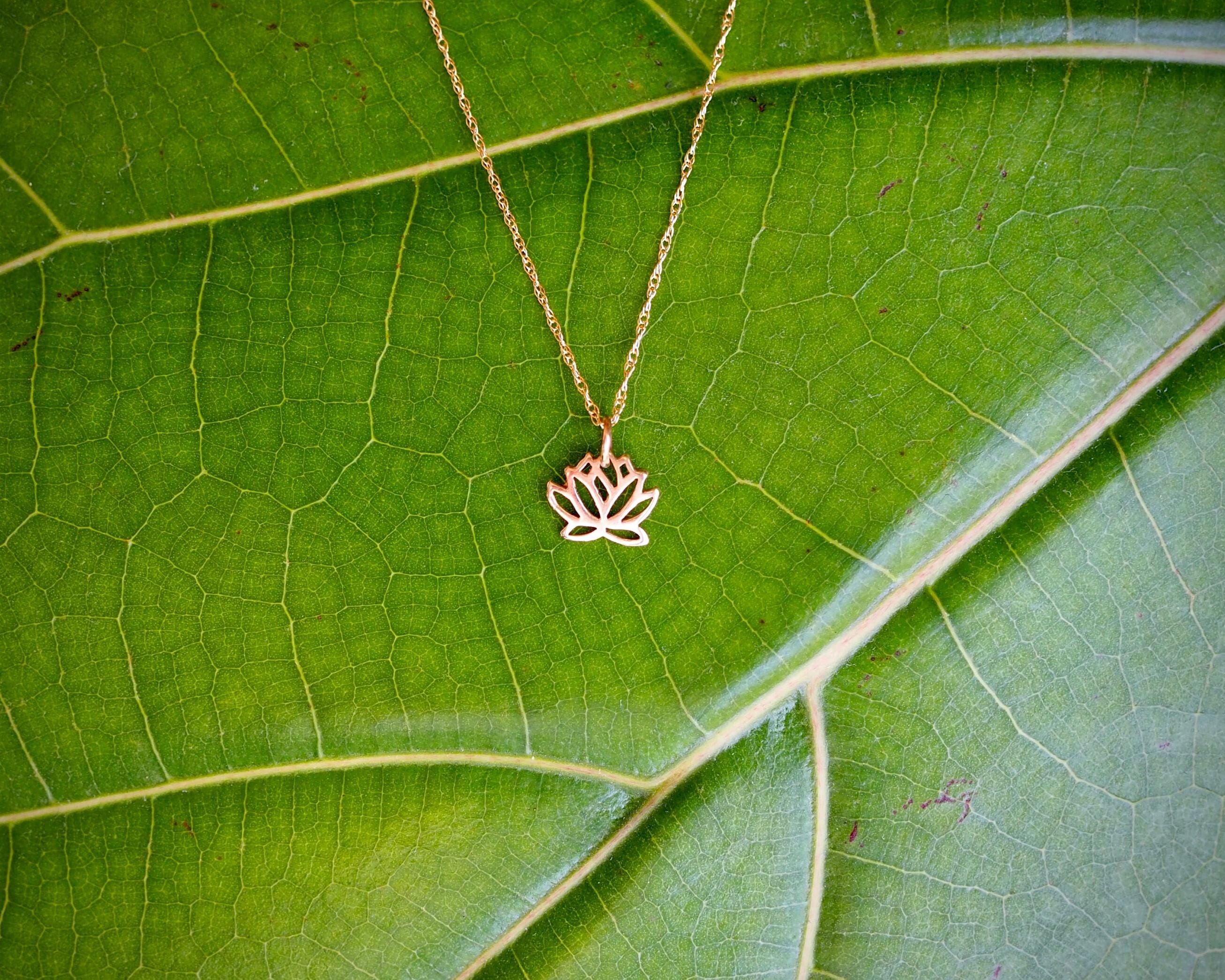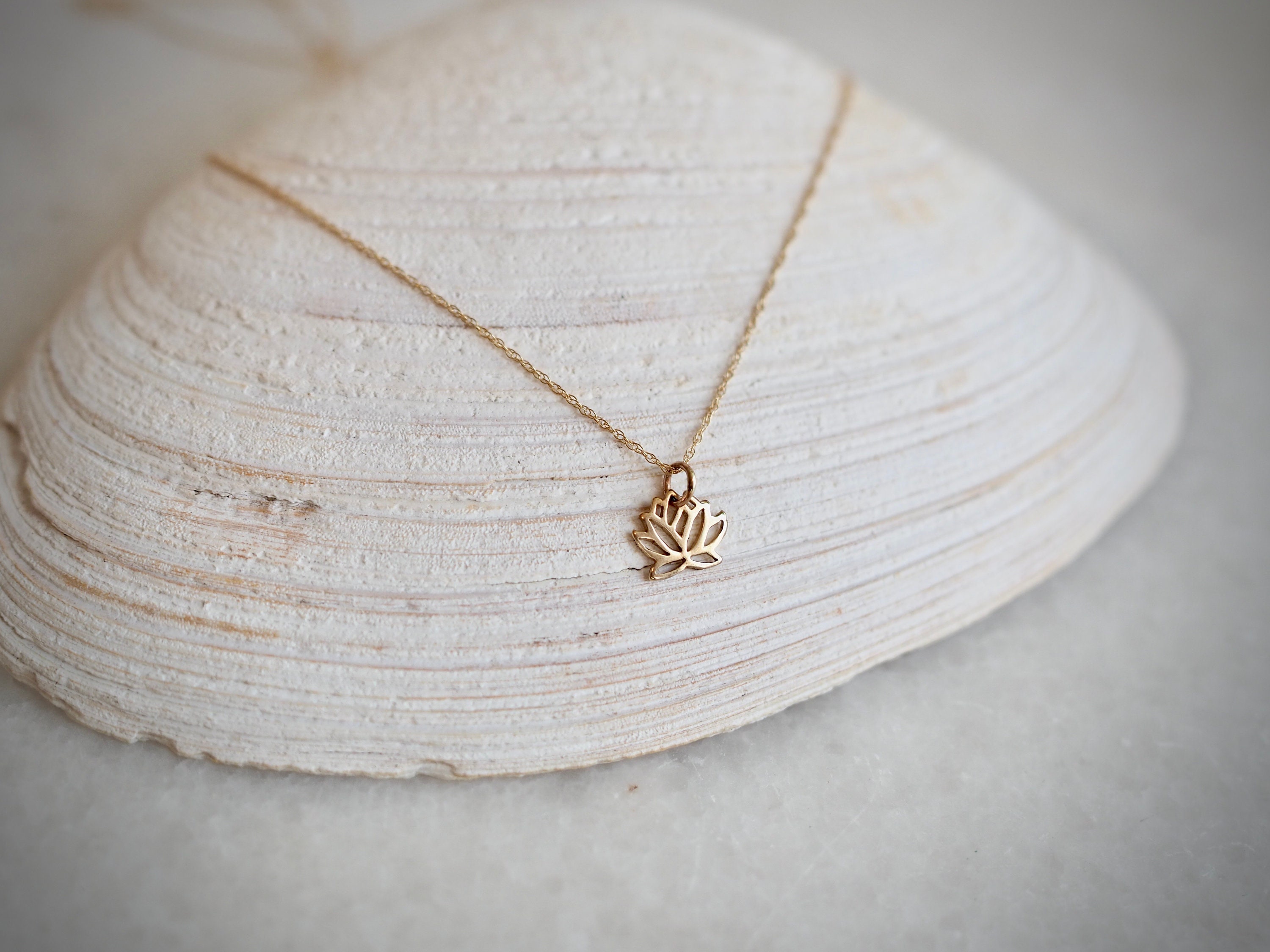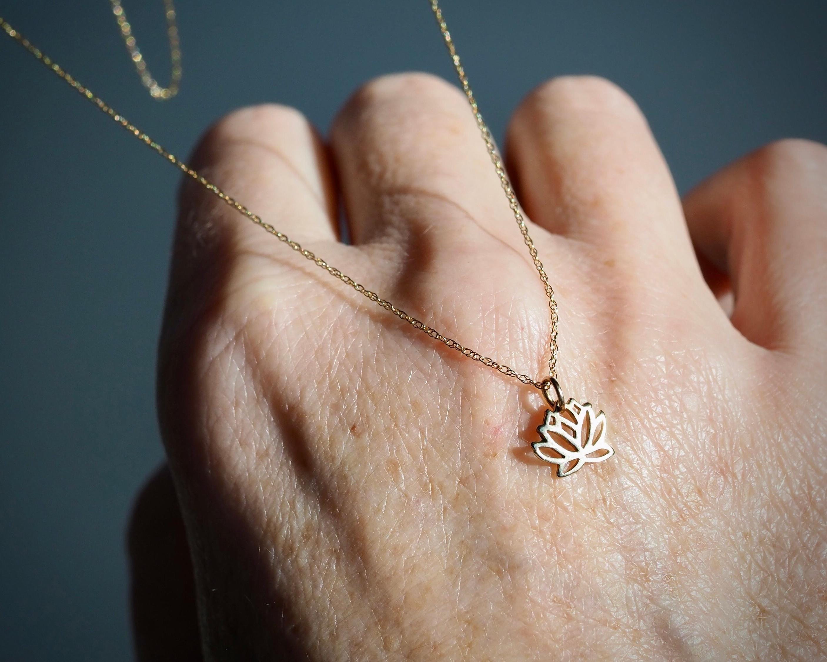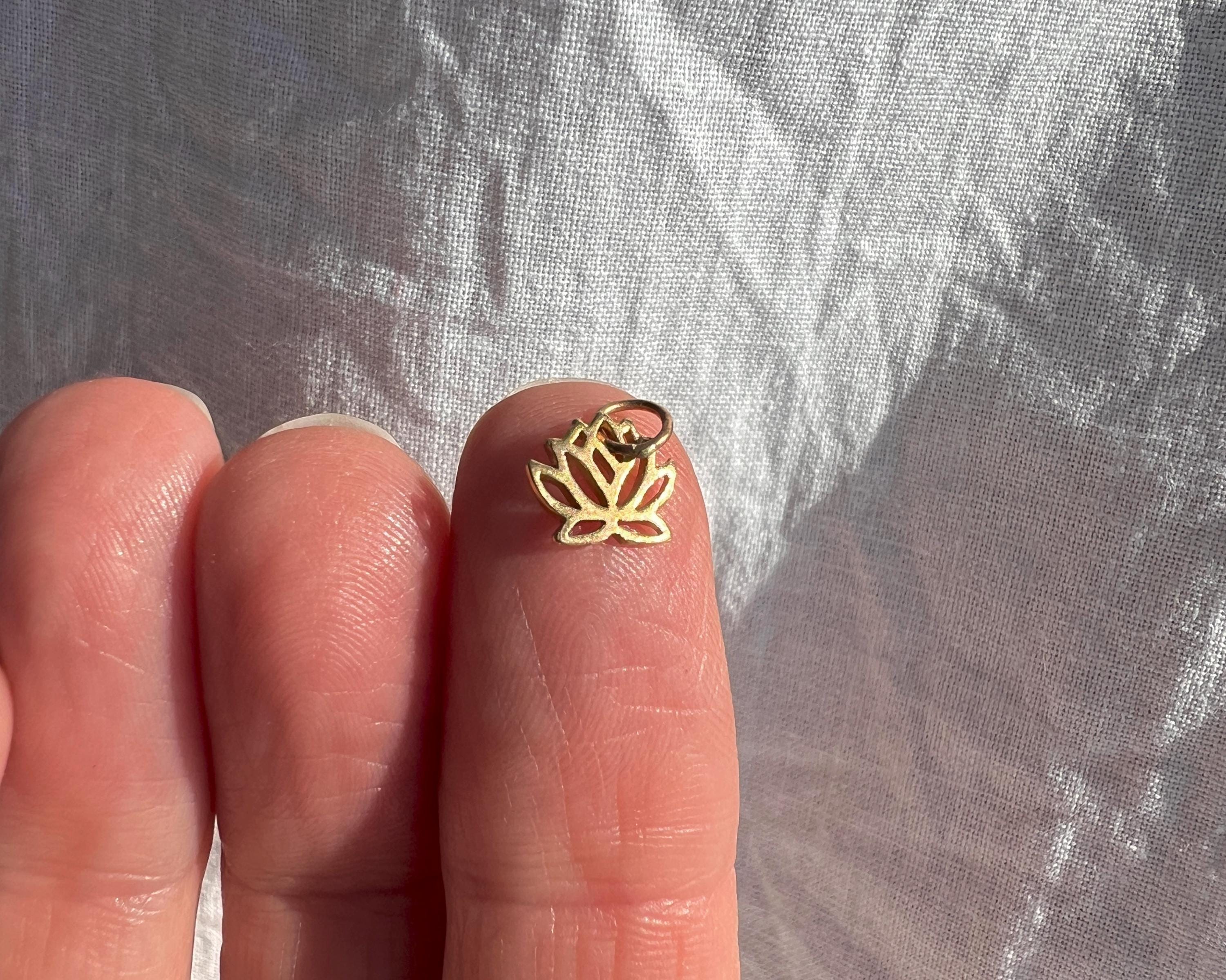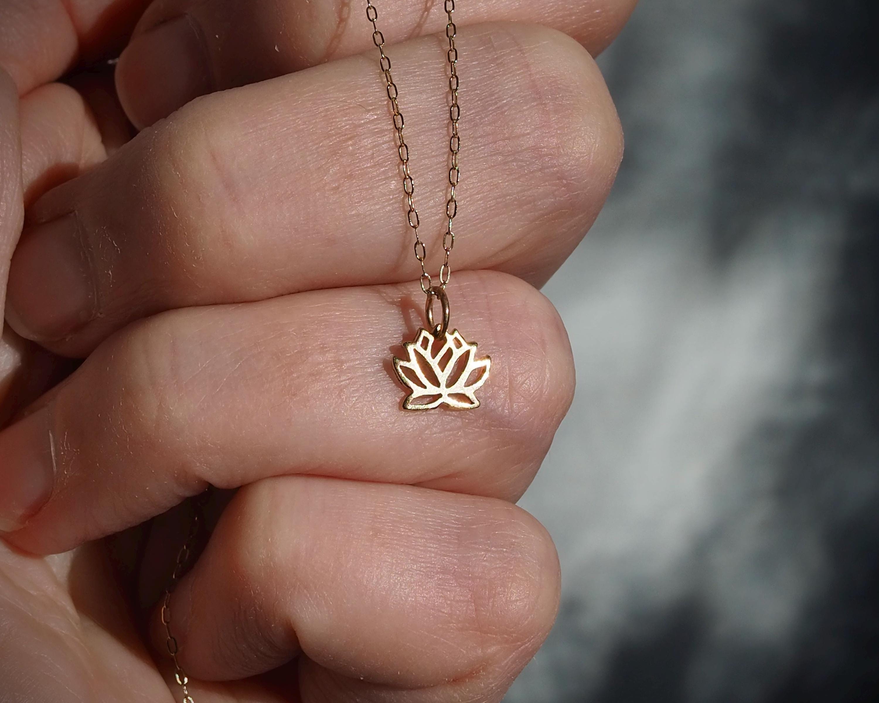 This small, stylized solid 14k gold lotus pendant is subtle and elegant. The pendant measures 9mm by 12mm including the bail.