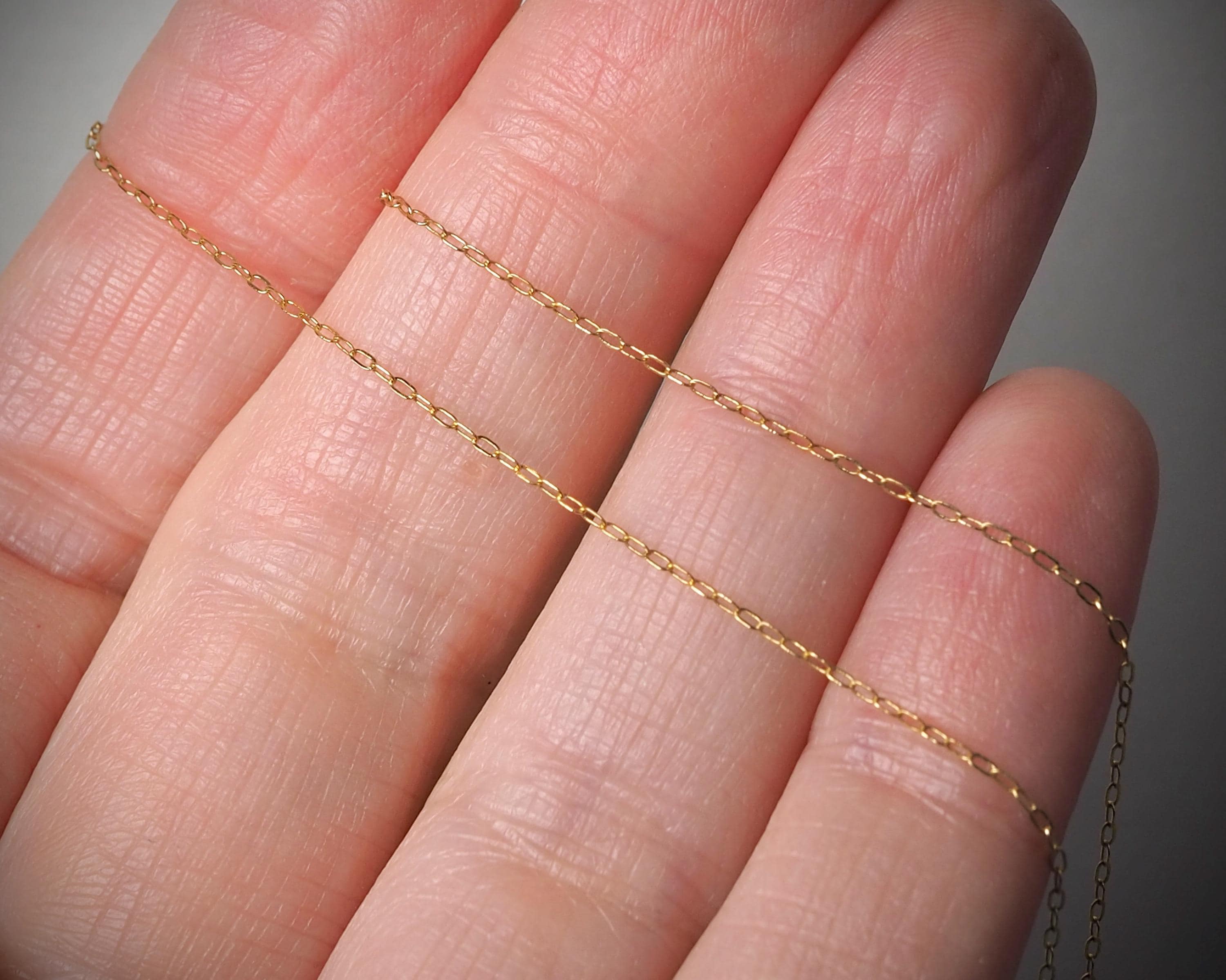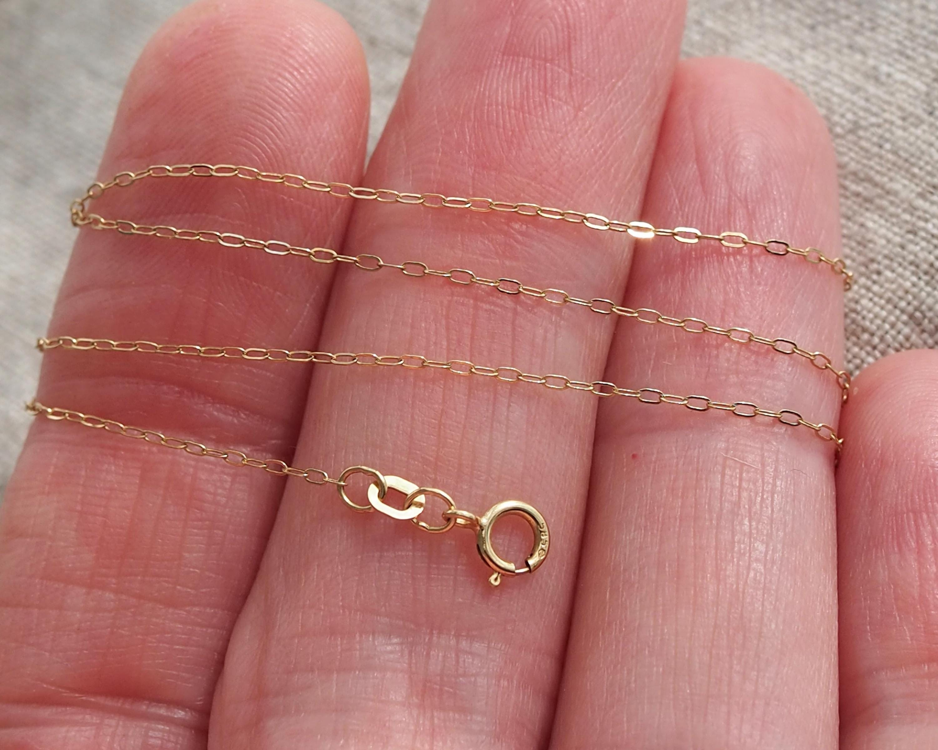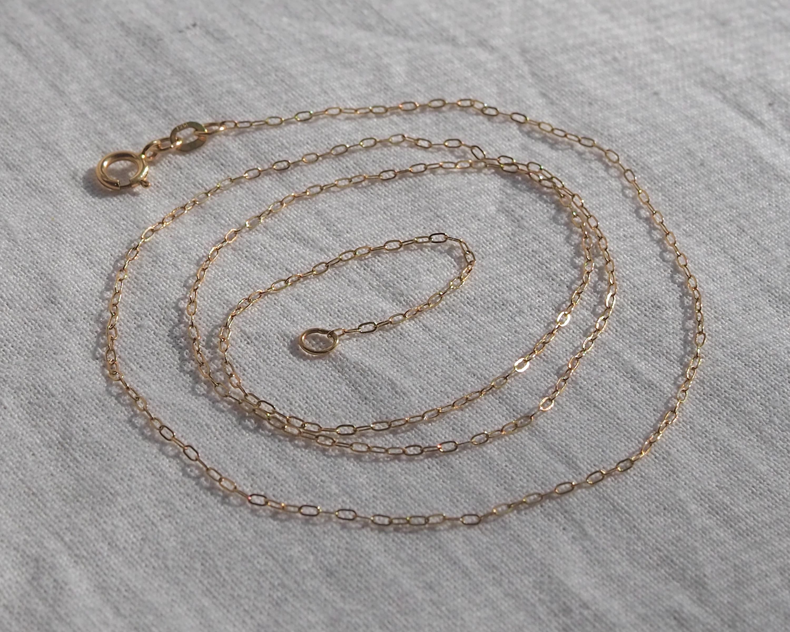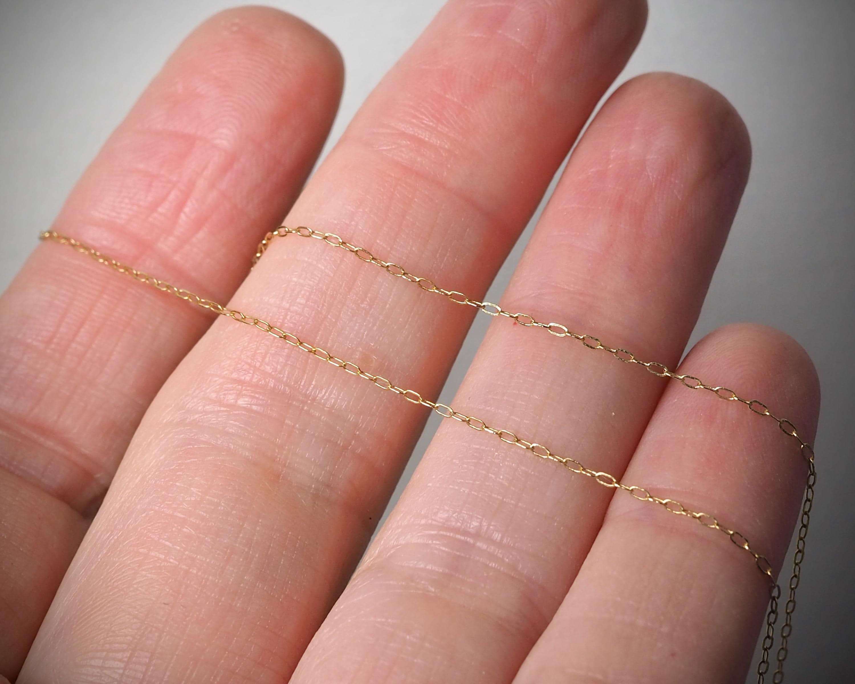 Solid 14k yellow gold 1.1mm wide cable chain with flat oval links, 16 inches long, with spring ring clasp. A staple in jewelry, this oval cable chain gives has a classic look well-suited for small pendants and charms.