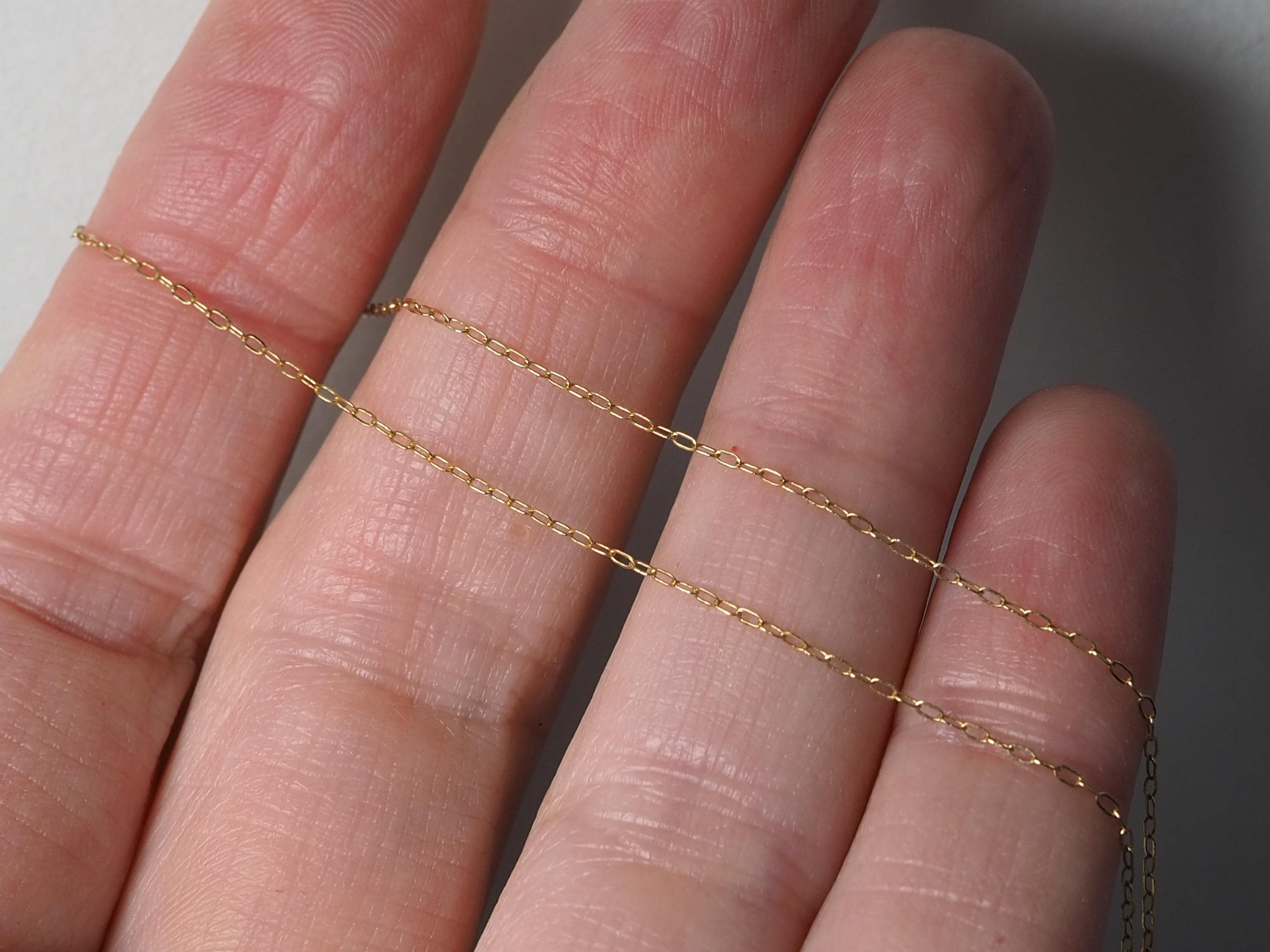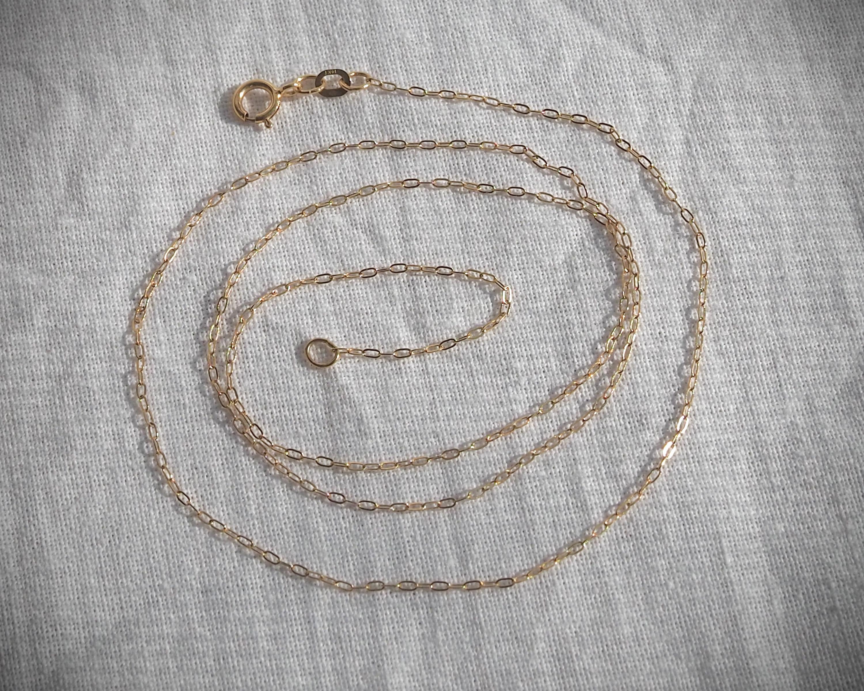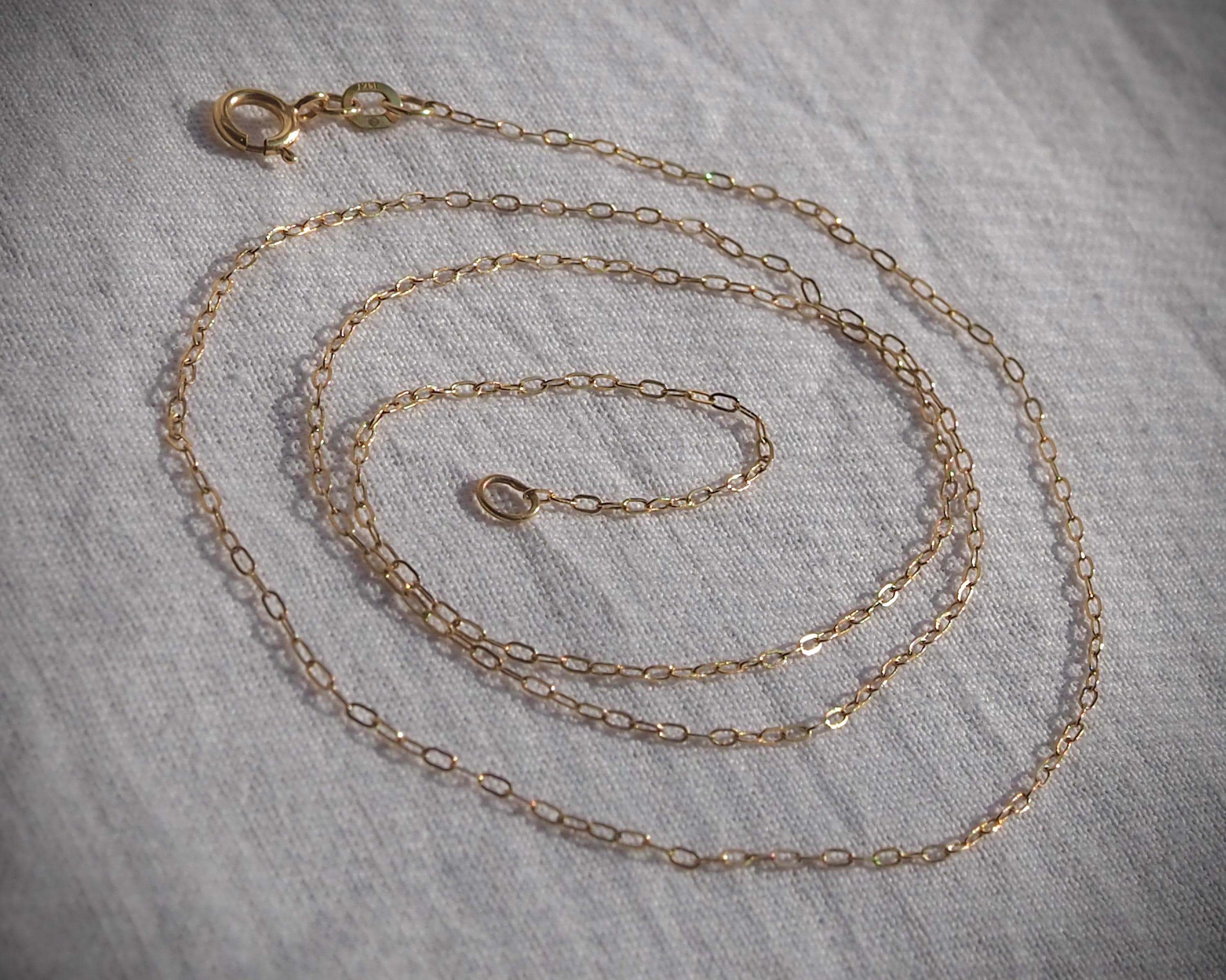 Solid 14k yellow gold 1.1mm wide cable chain with flat oval links, 16 inches long, with spring ring clasp. A staple in jewelry, this oval cable chain gives has a classic look well-suited for small pendants and charms.