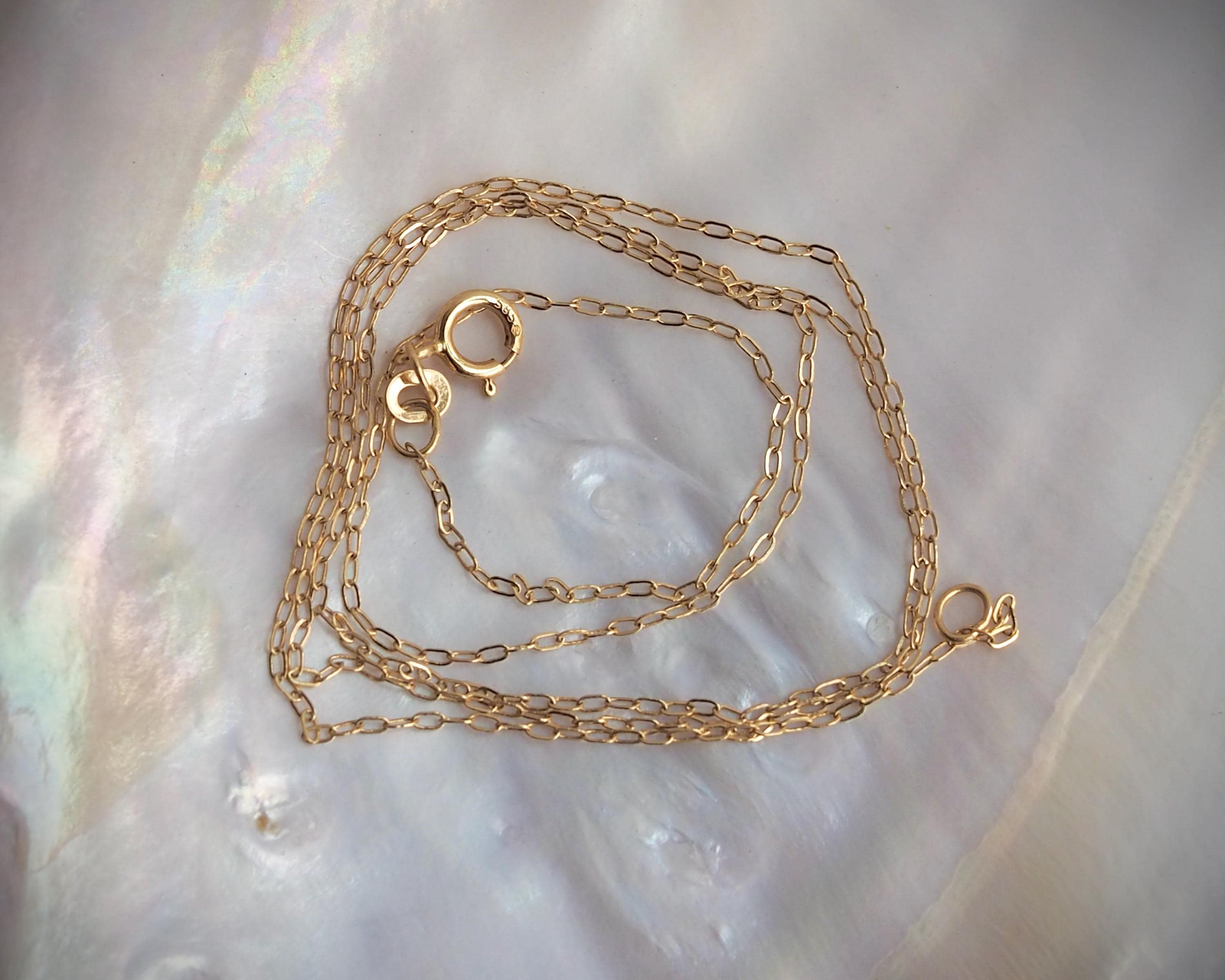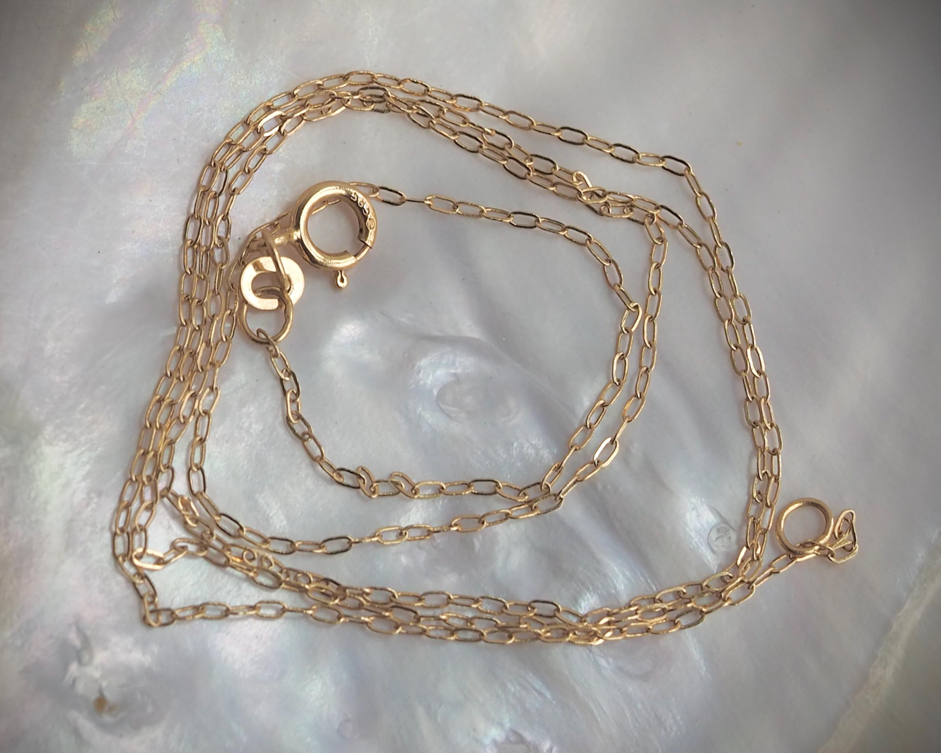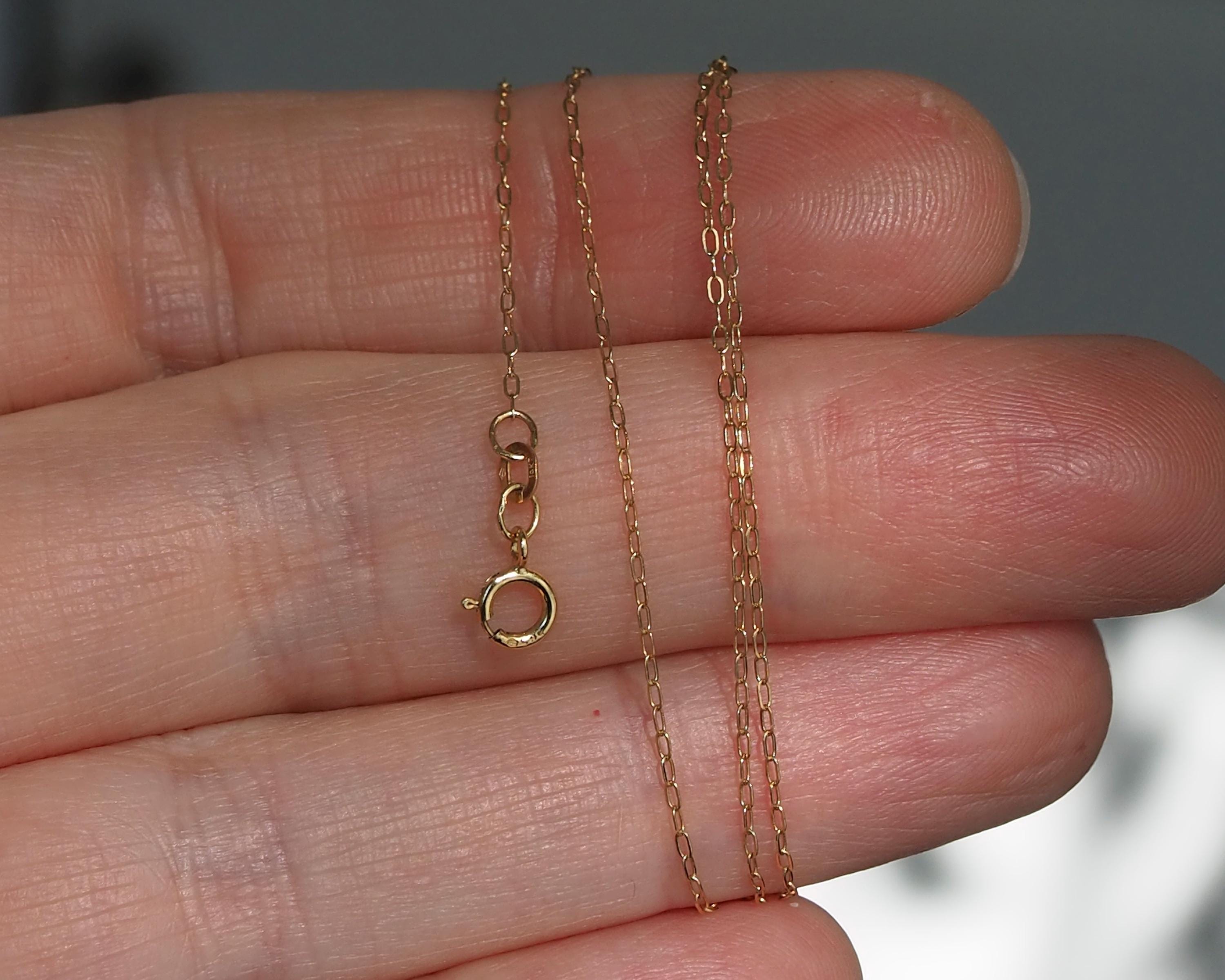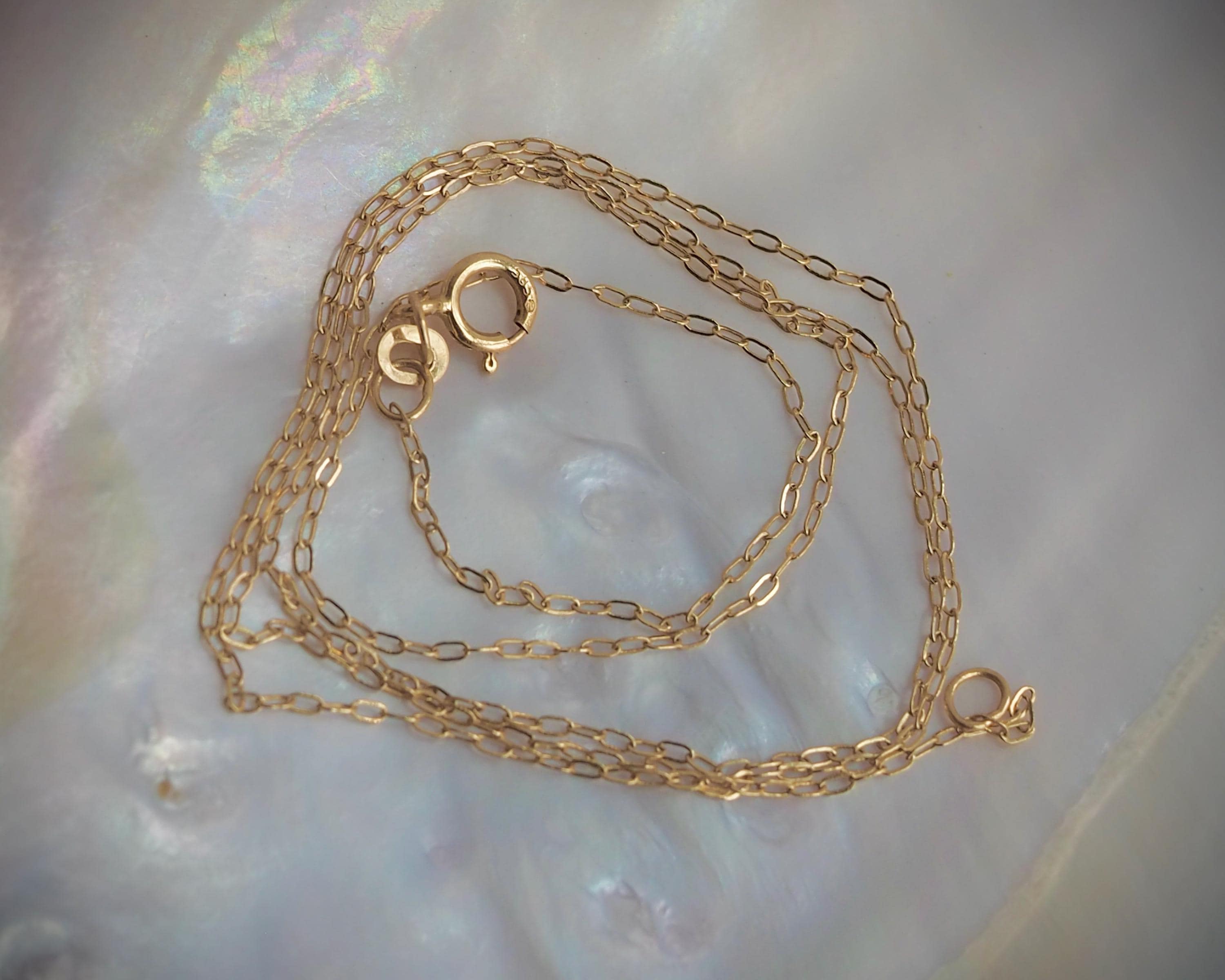 Solid 14k yellow gold 1.1mm wide cable chain with flat oval links, 16 inches long, with spring ring clasp. A staple in jewelry, this oval cable chain gives has a classic look well-suited for small pendants and charms.