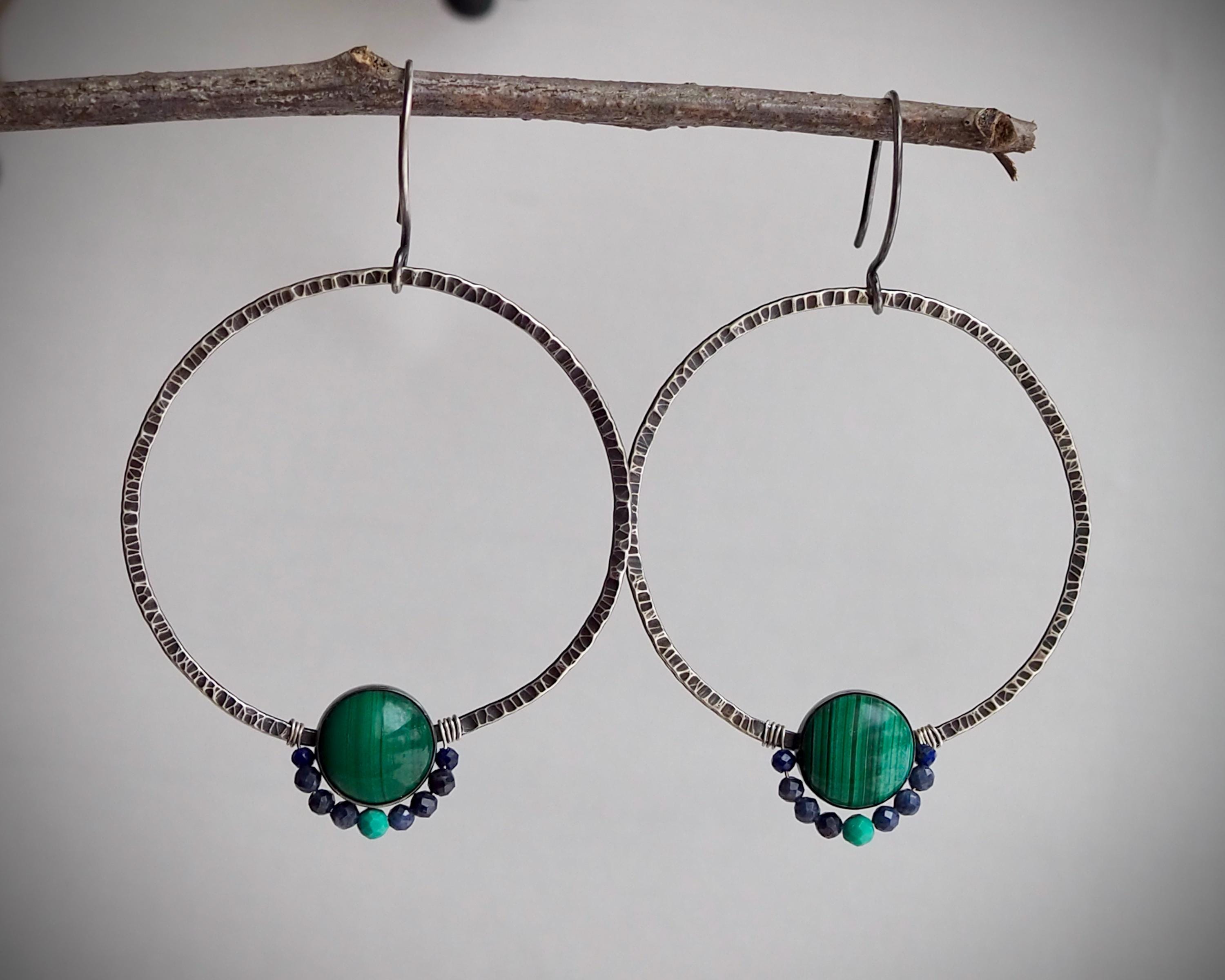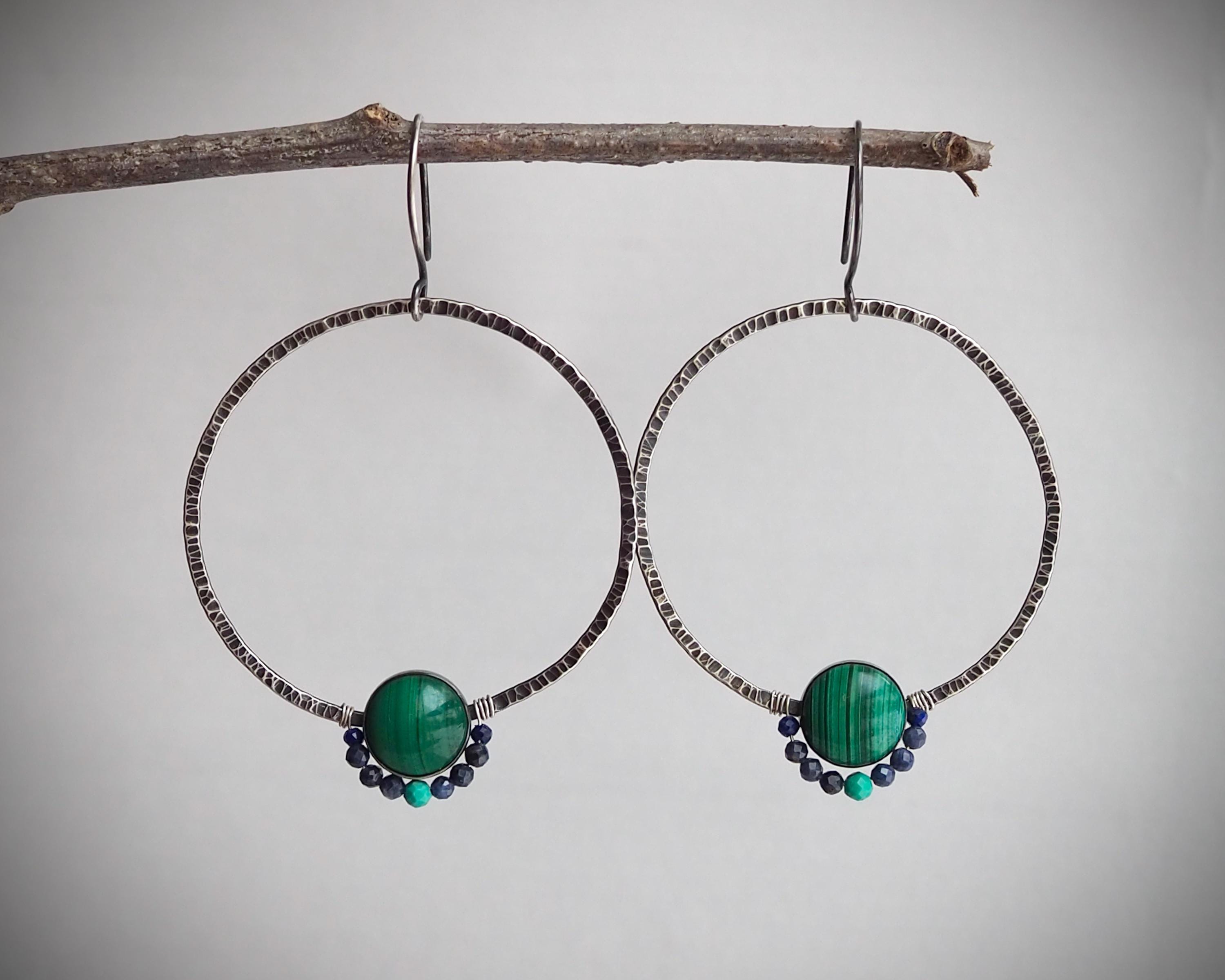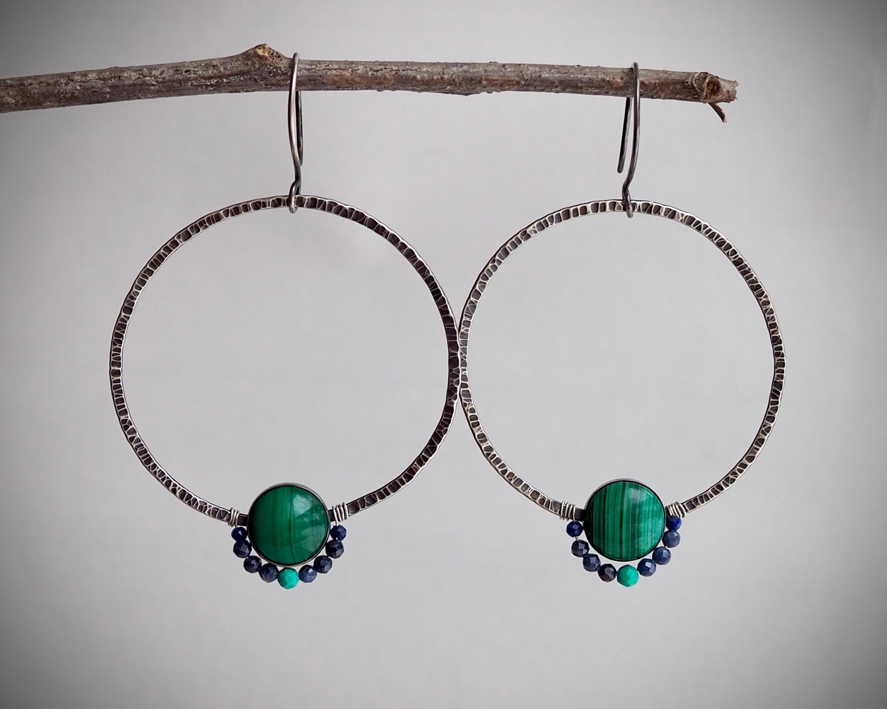 Dark and moody sterling silver hoops have pronounced hammered texture that beautifully catches light. They are adorned with saturated green 10mm malachite stones set in fine silver bezels, and faceted tiny sapphire, lapis lazuli and turquoise beads. These lightweight and comfortable earrings are 2mm wide and measure approximately 1.75 inches in diameter, they hang on handmade sterling silver ear wires.