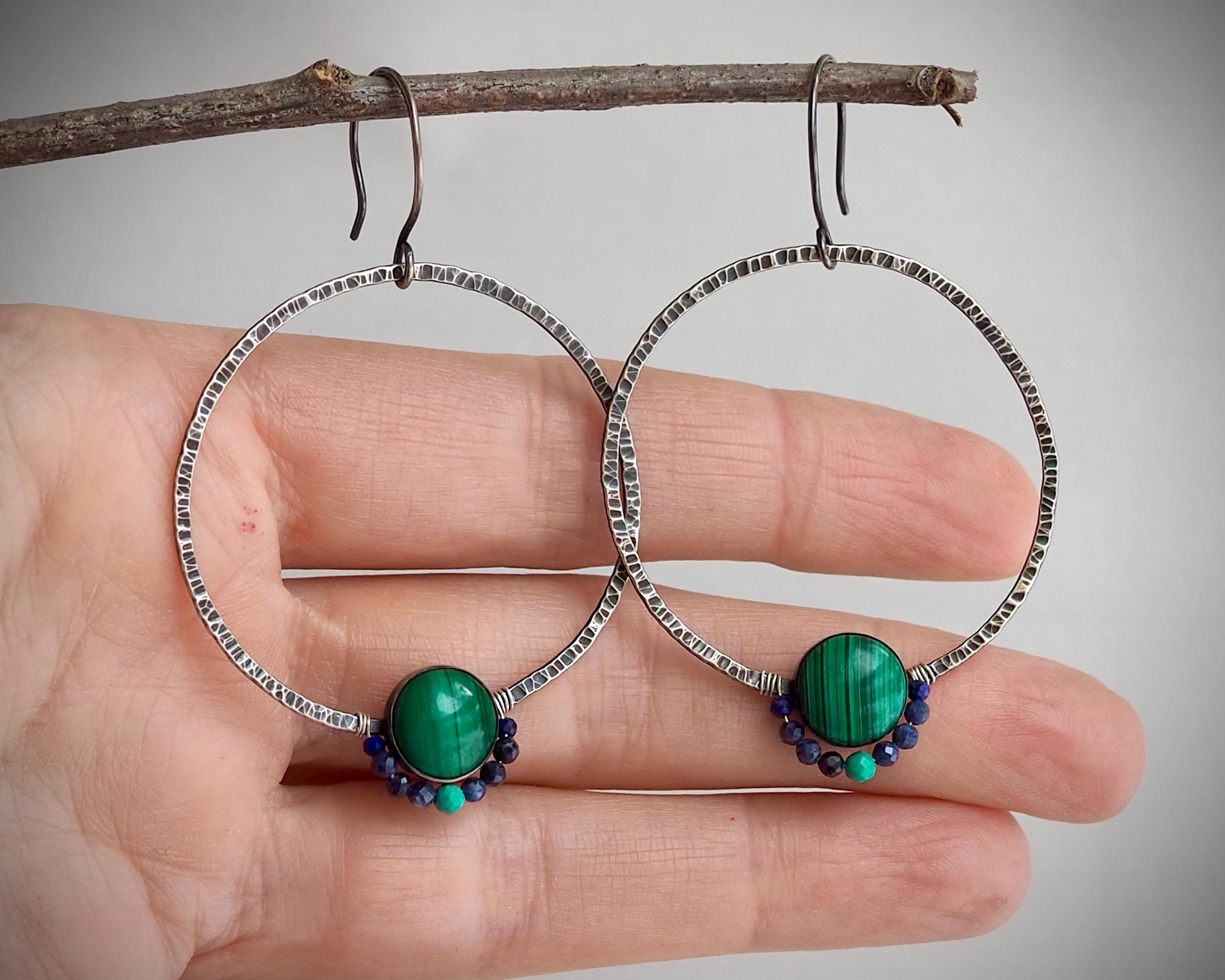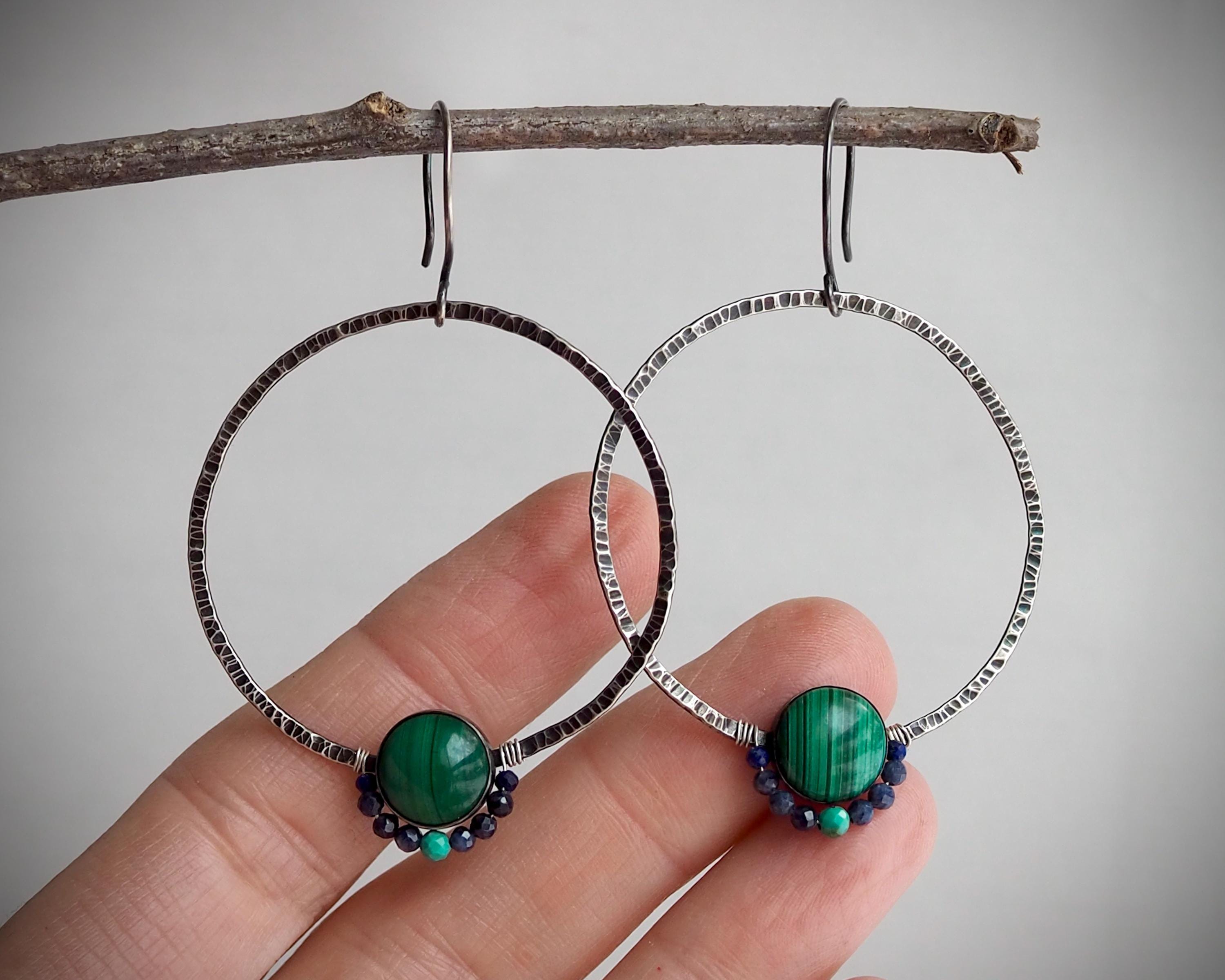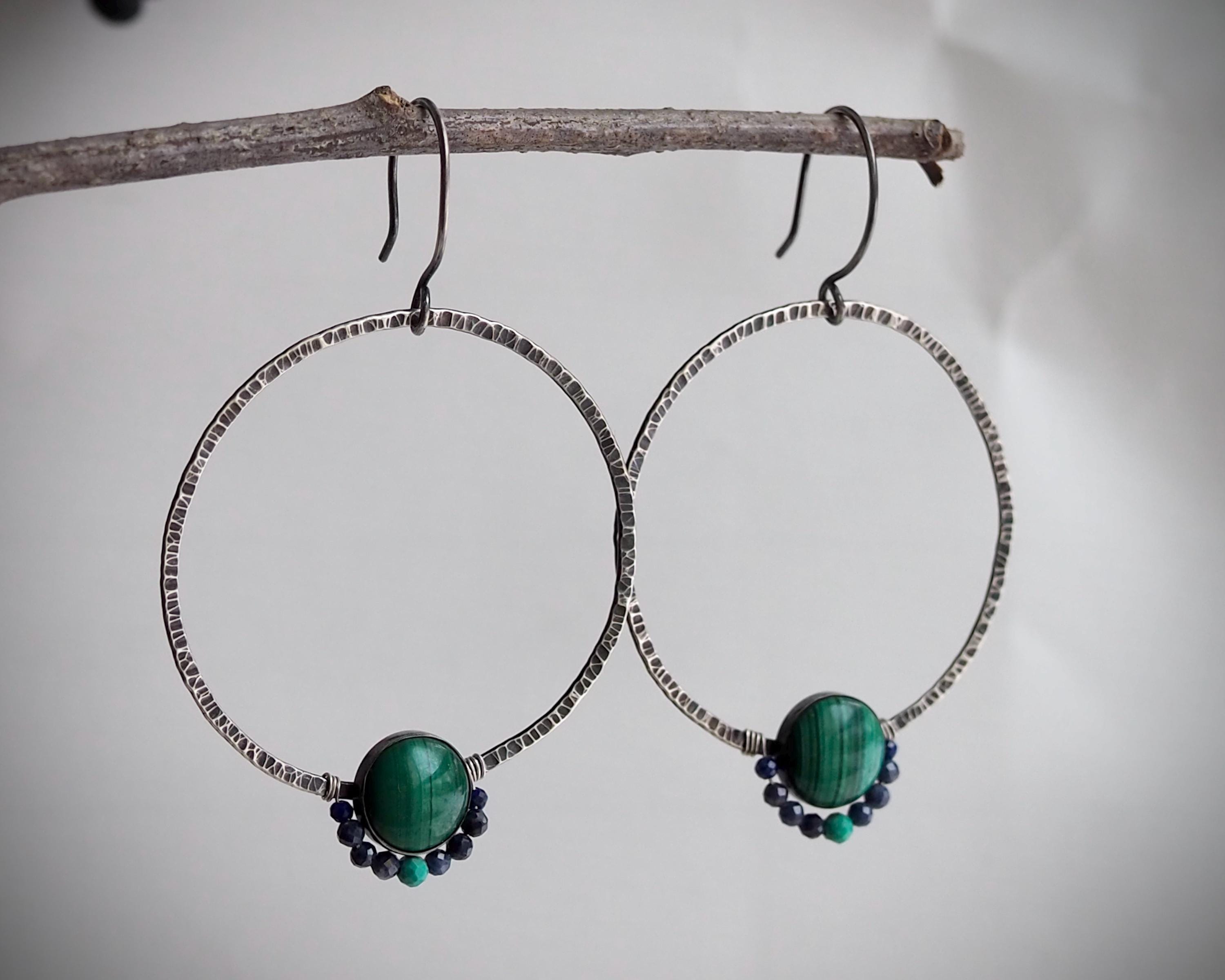 Dark and moody sterling silver hoops have pronounced hammered texture that beautifully catches light. They are adorned with saturated green 10mm malachite stones set in fine silver bezels, and faceted tiny sapphire, lapis lazuli and turquoise beads. These lightweight and comfortable earrings are 2mm wide and measure approximately 1.75 inches in diameter, they hang on handmade sterling silver ear wires.