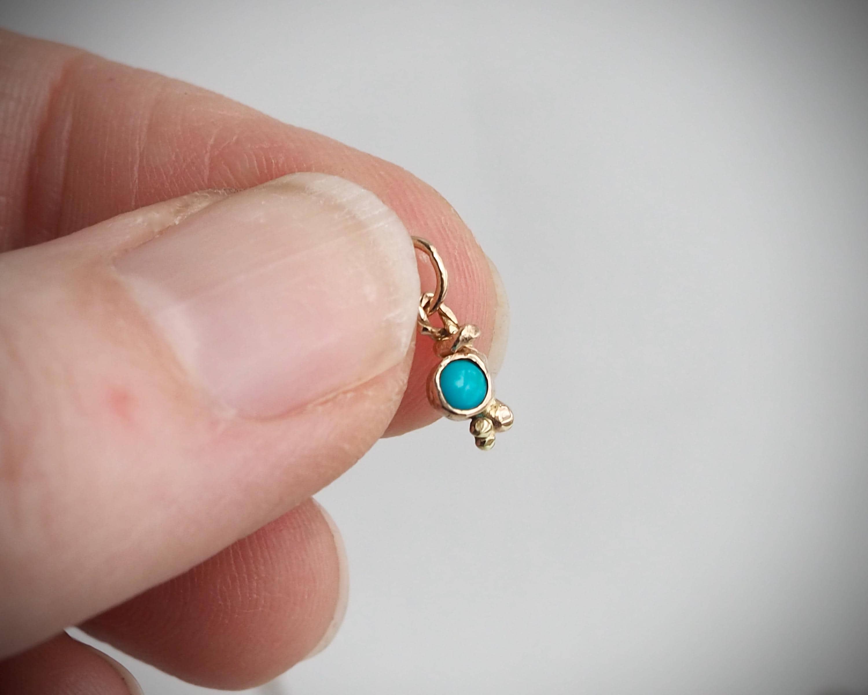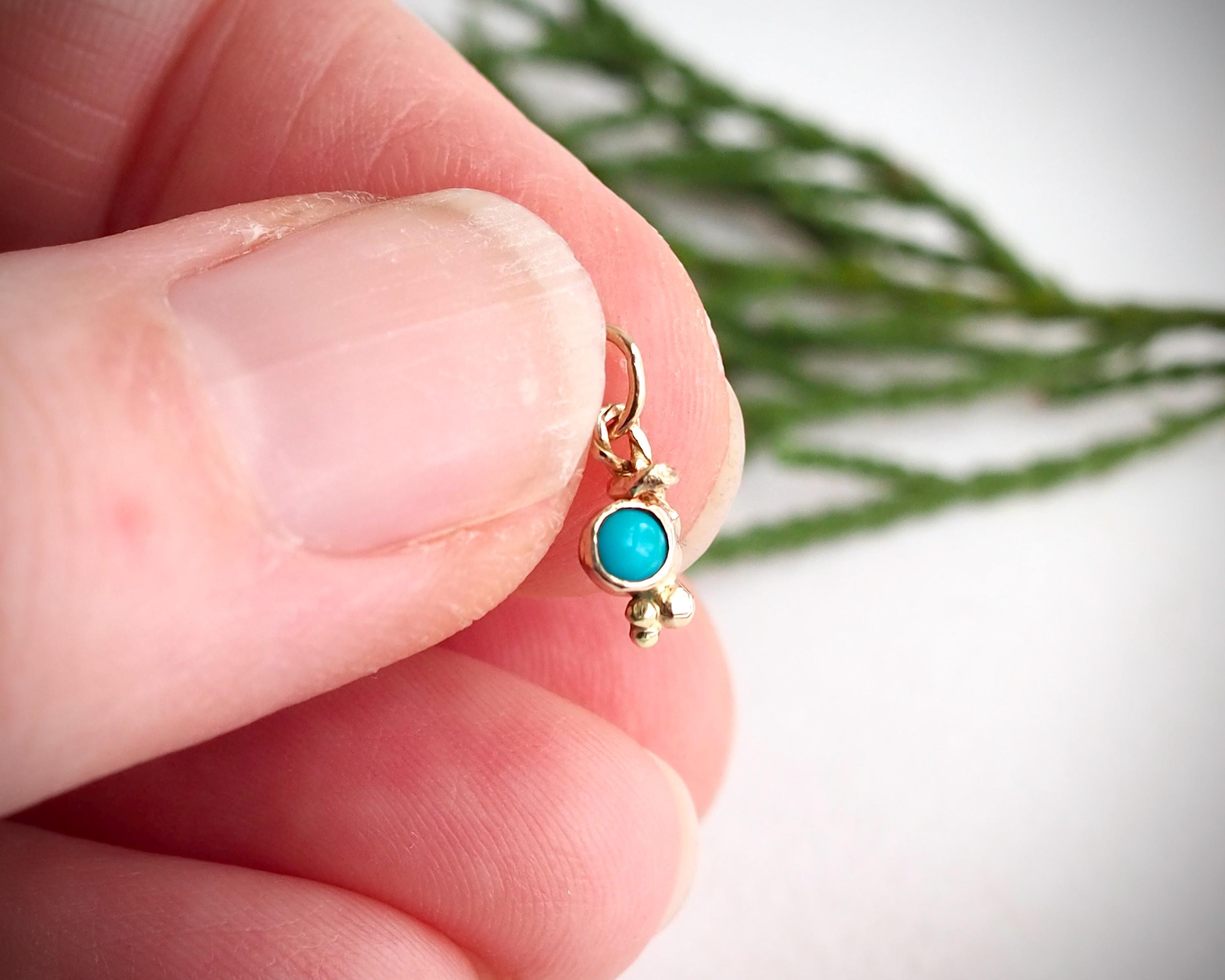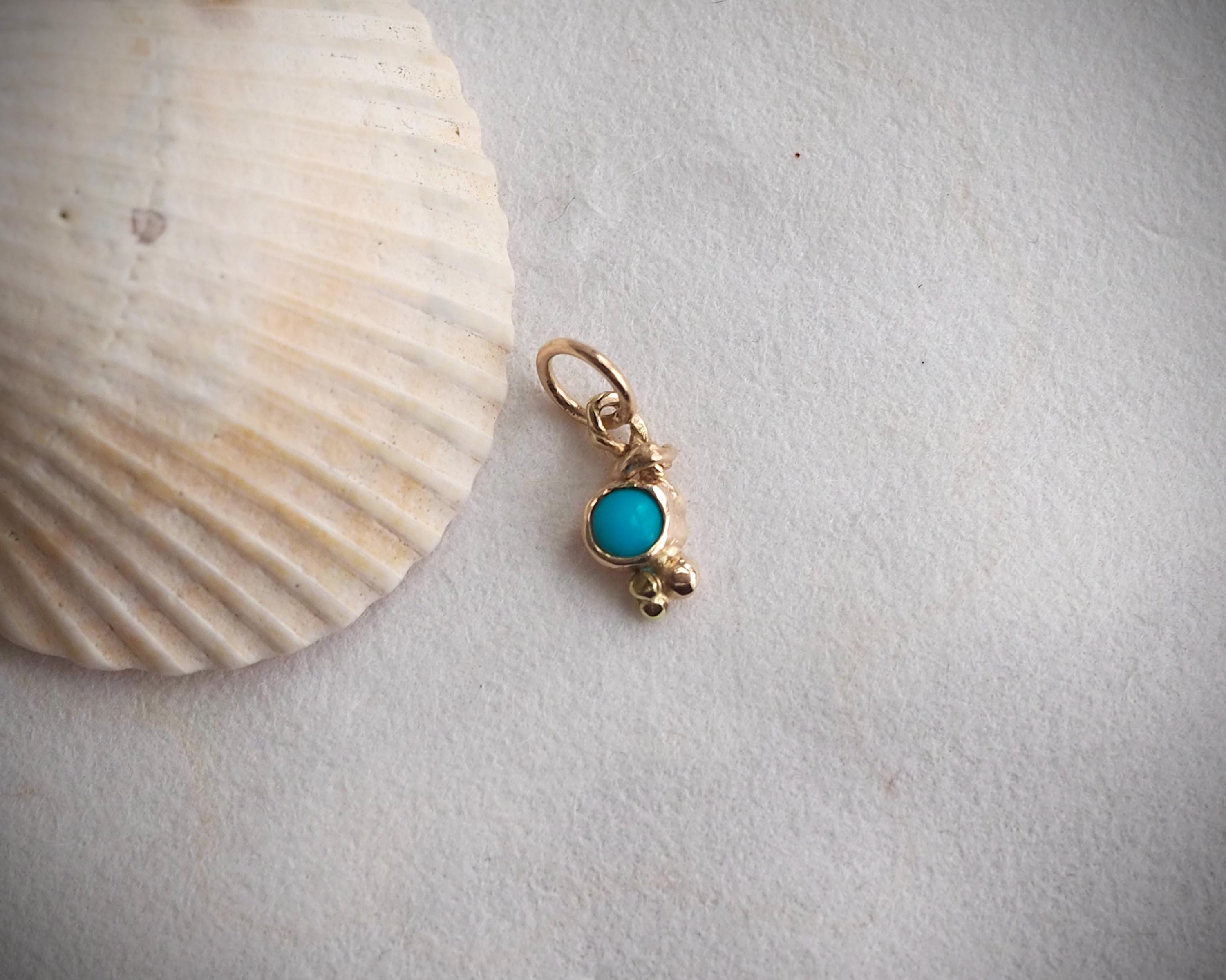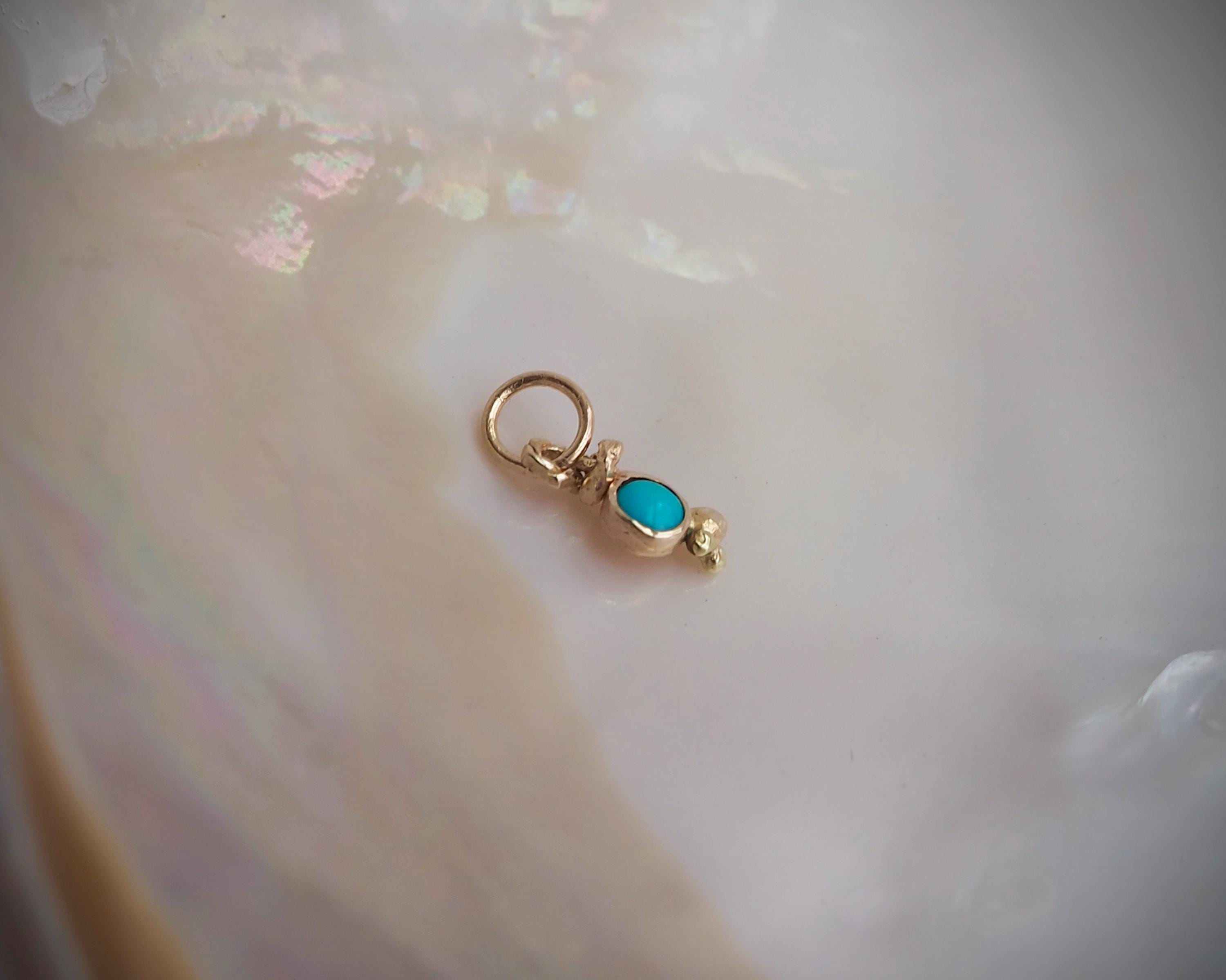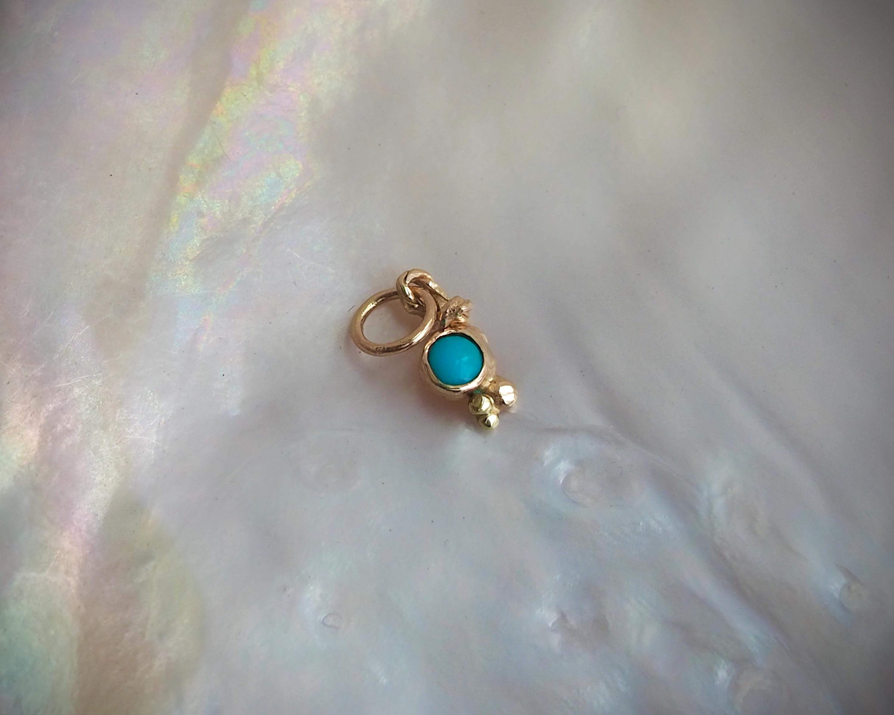Darling, bright blue turquoise is nestled in a unique handmade 14k gold organic charm. The Sleeping Beauty turquoise measures 3mm. The charm measures approximately 4.2mm by 12mm, including the jump ring with a 3.3mm inside diameter.