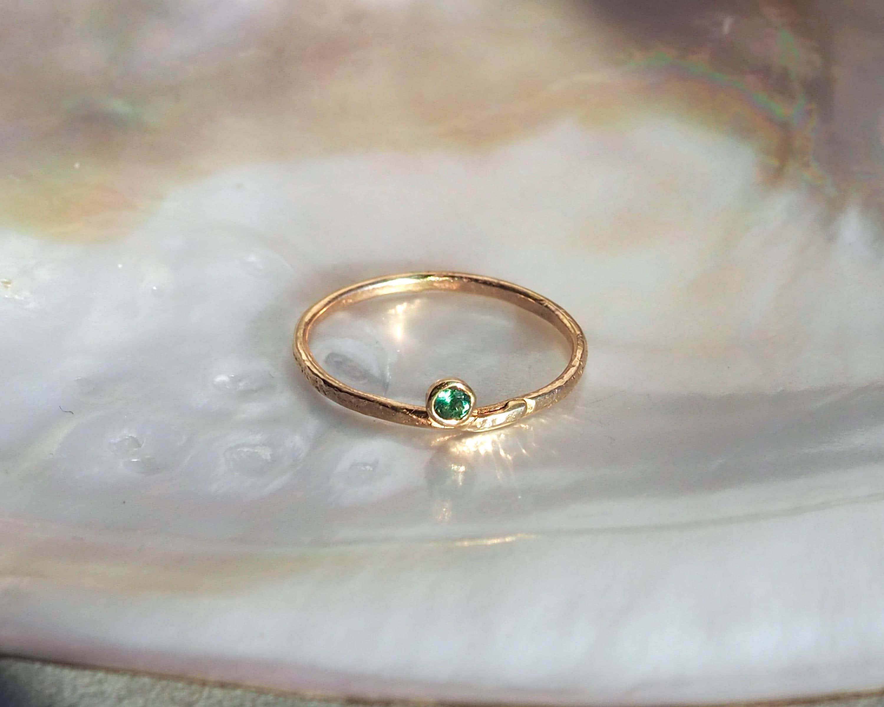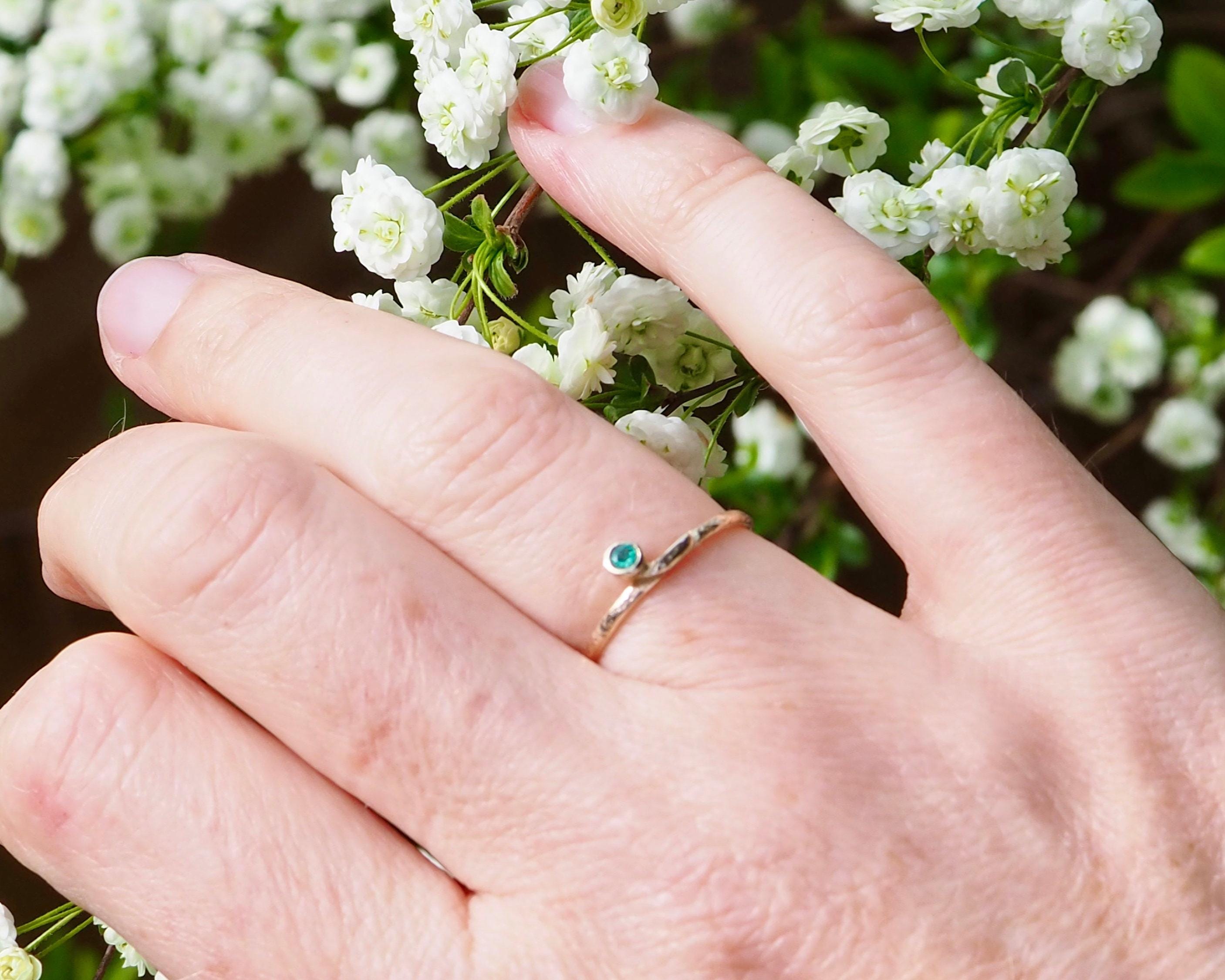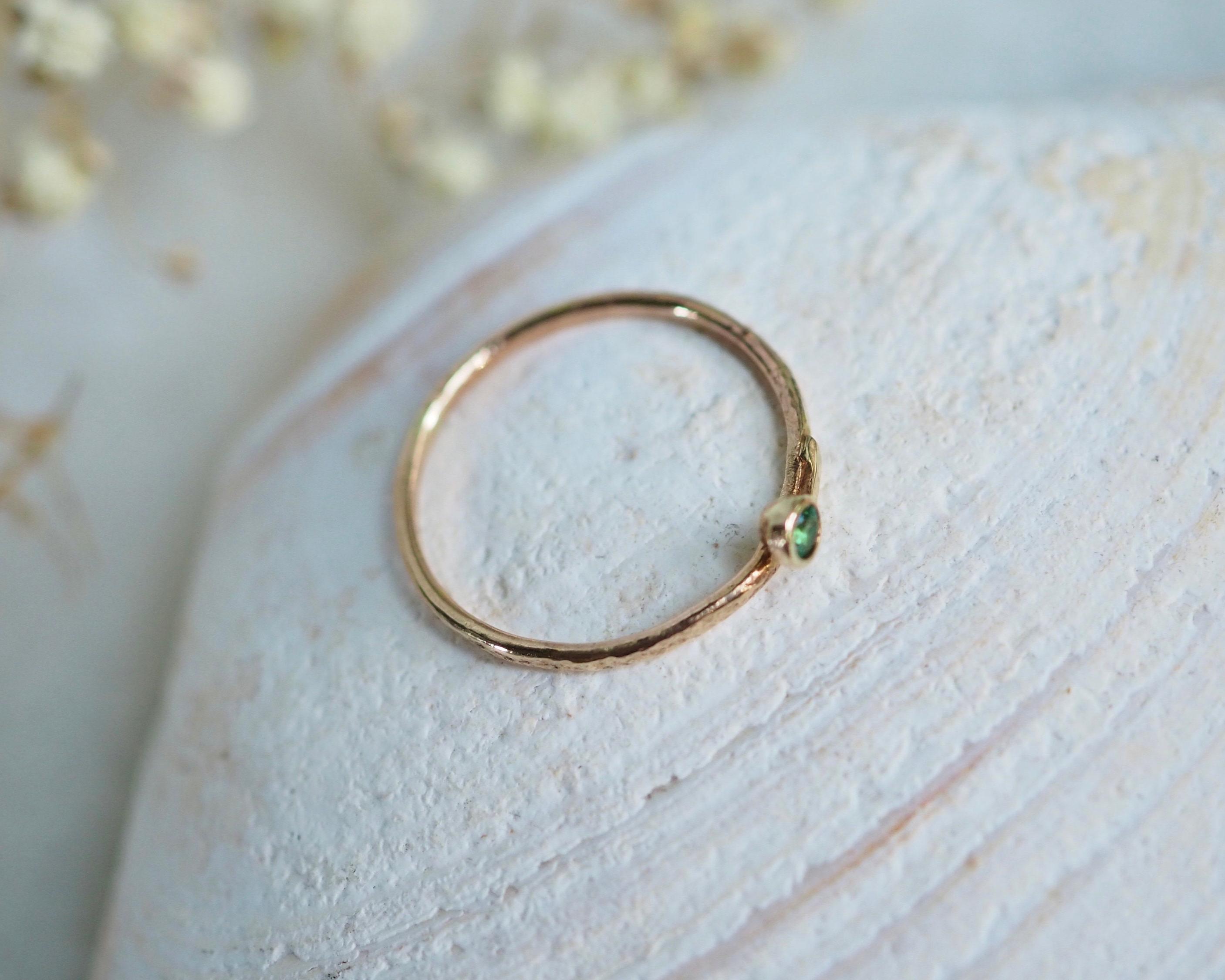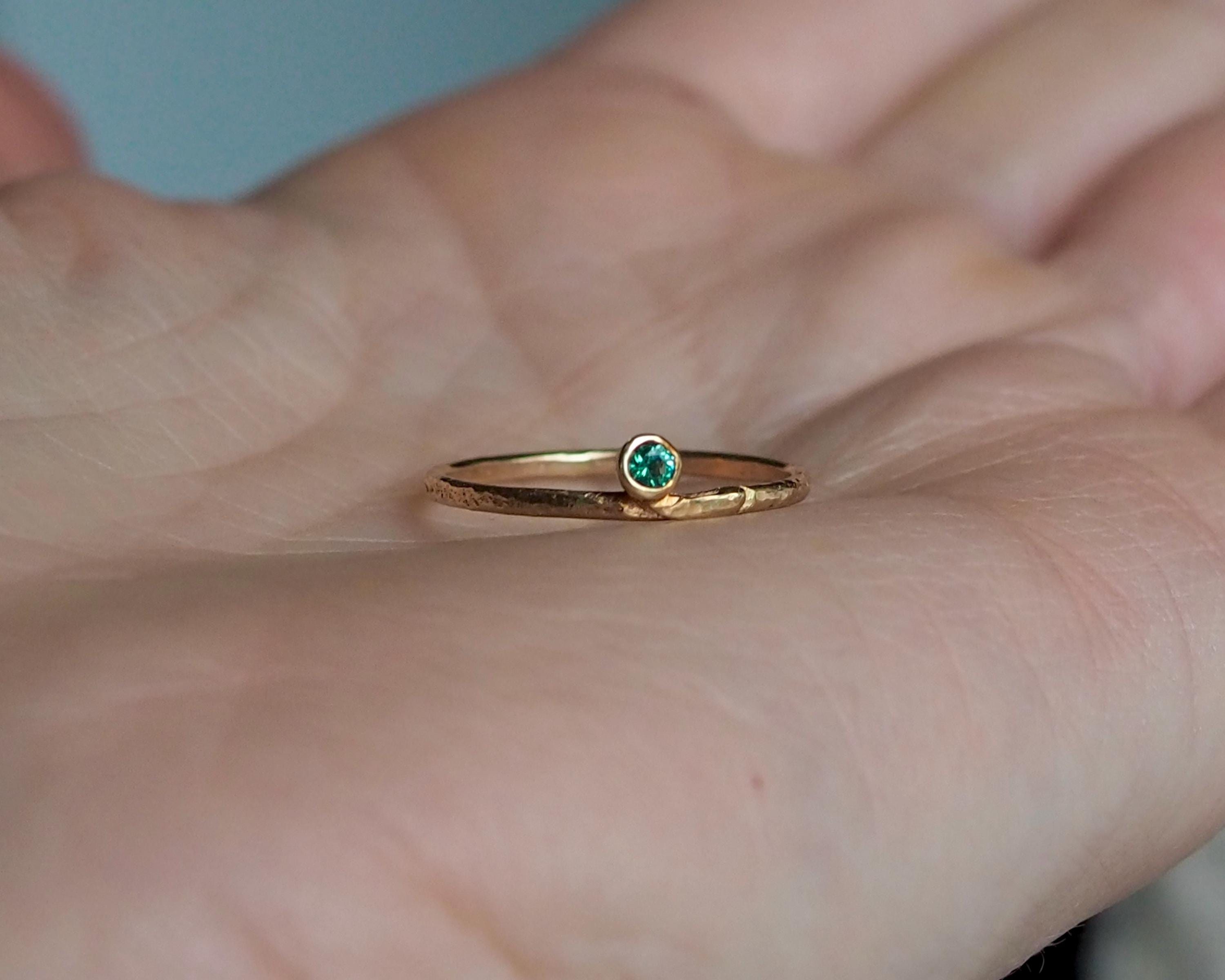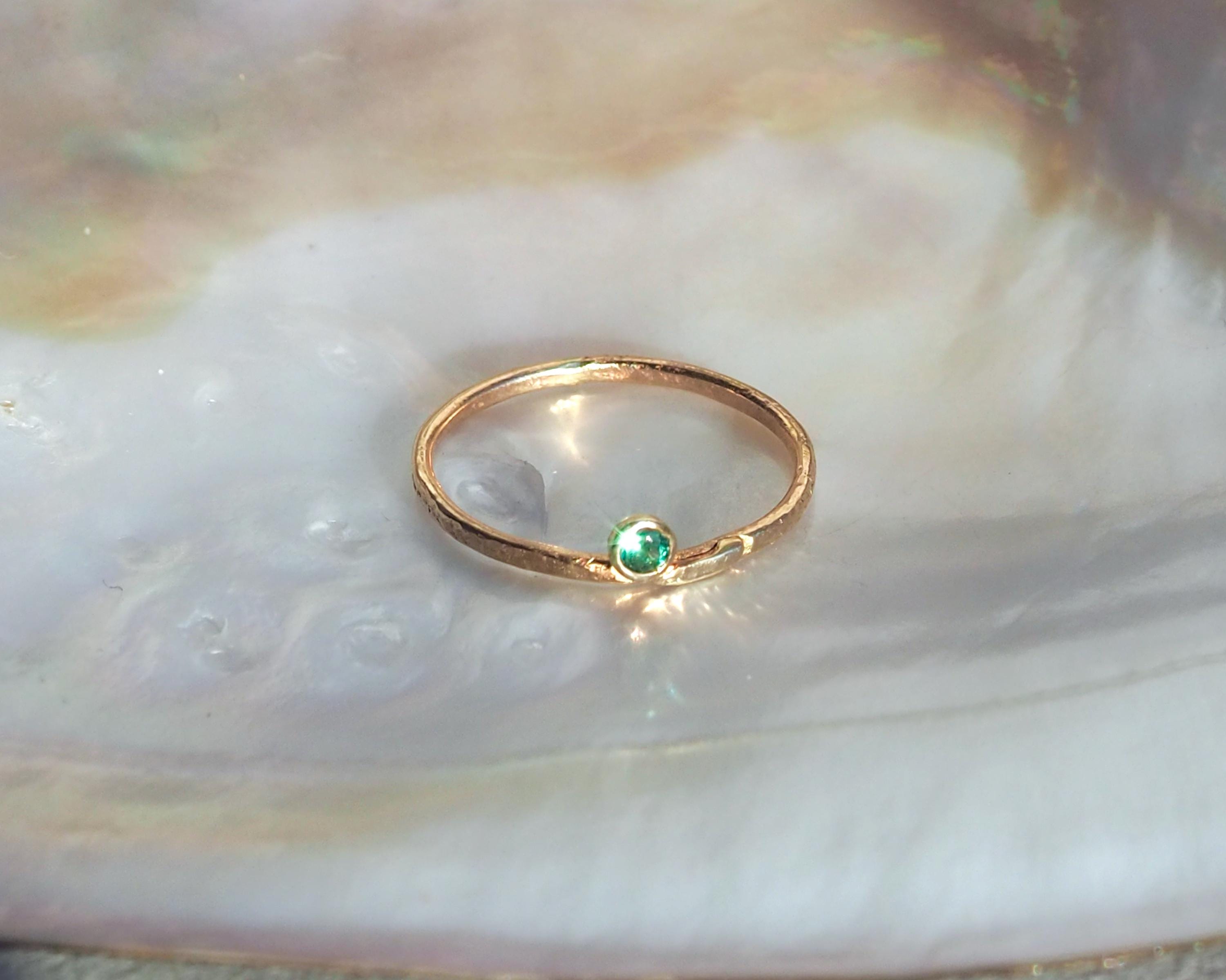 Bright green, sparkly emerald is set in an open back bezel at the tip of a little sprout, and paired with a 1.3mm band. The 2.5mm natural emerald is a cheerful shade of green. The band is textured by hand to resemble the stem of a plant. Lovely worn alone or in your favorite stack. Please see photos of this ring styled in a stack with other gold rings available in my shop :)