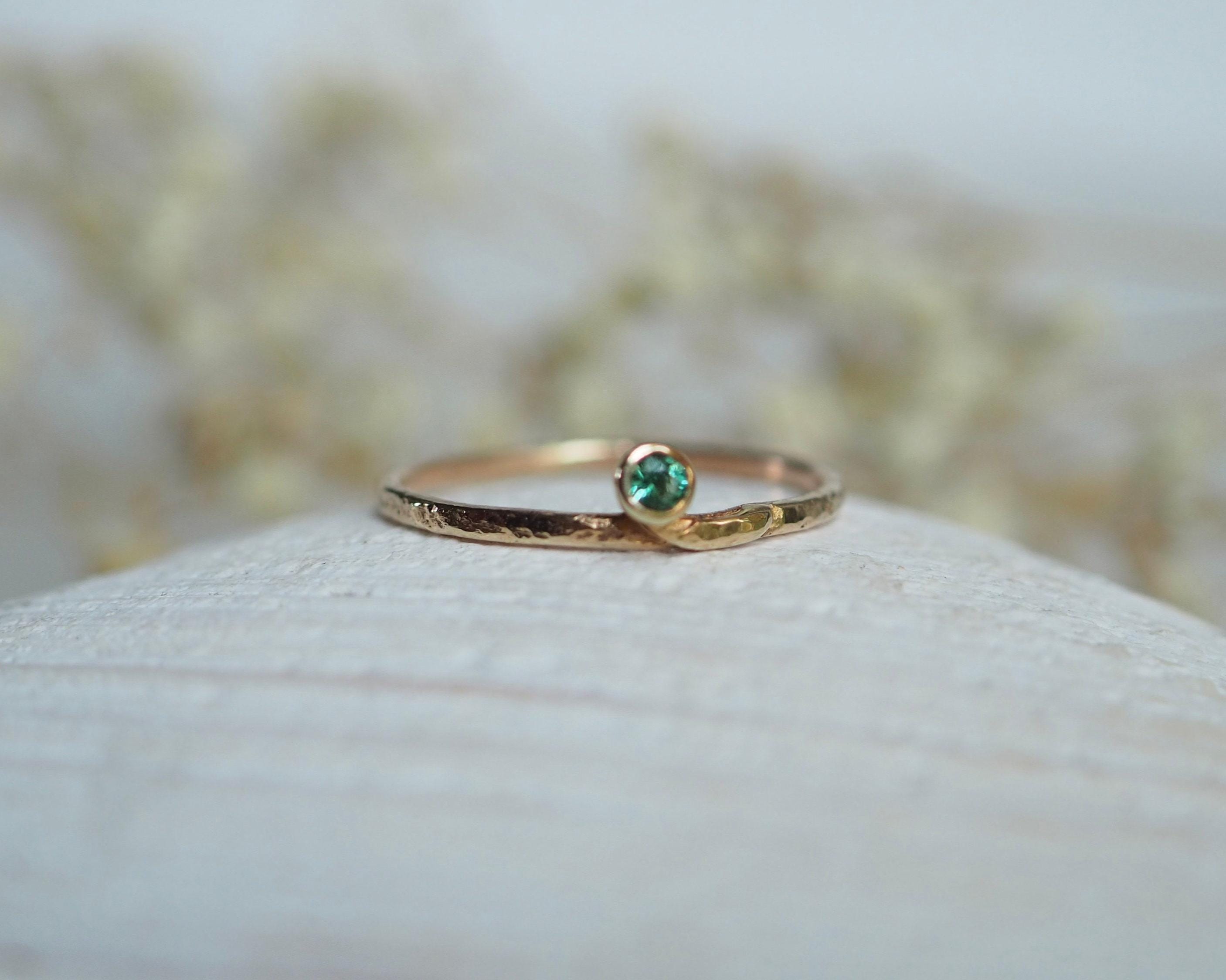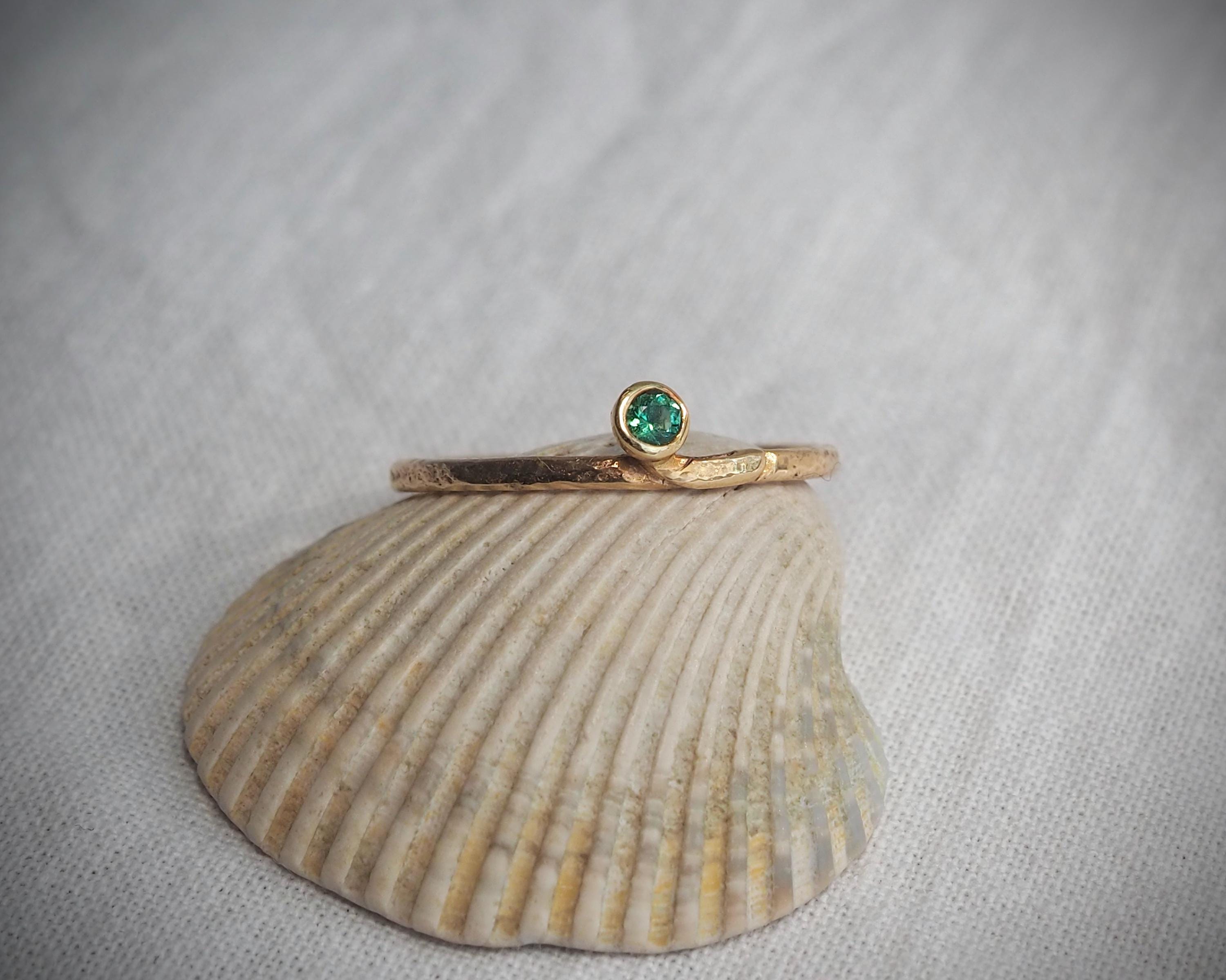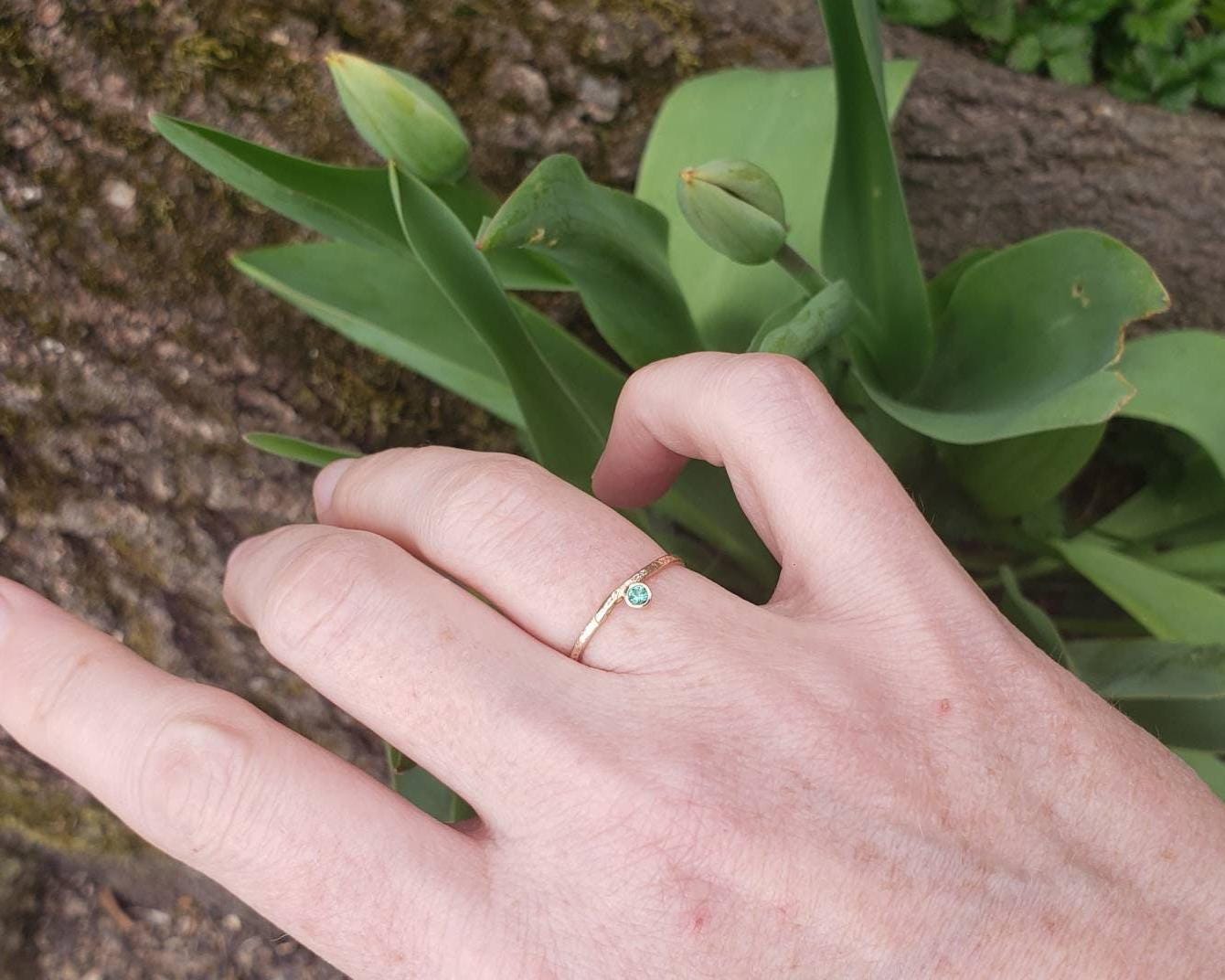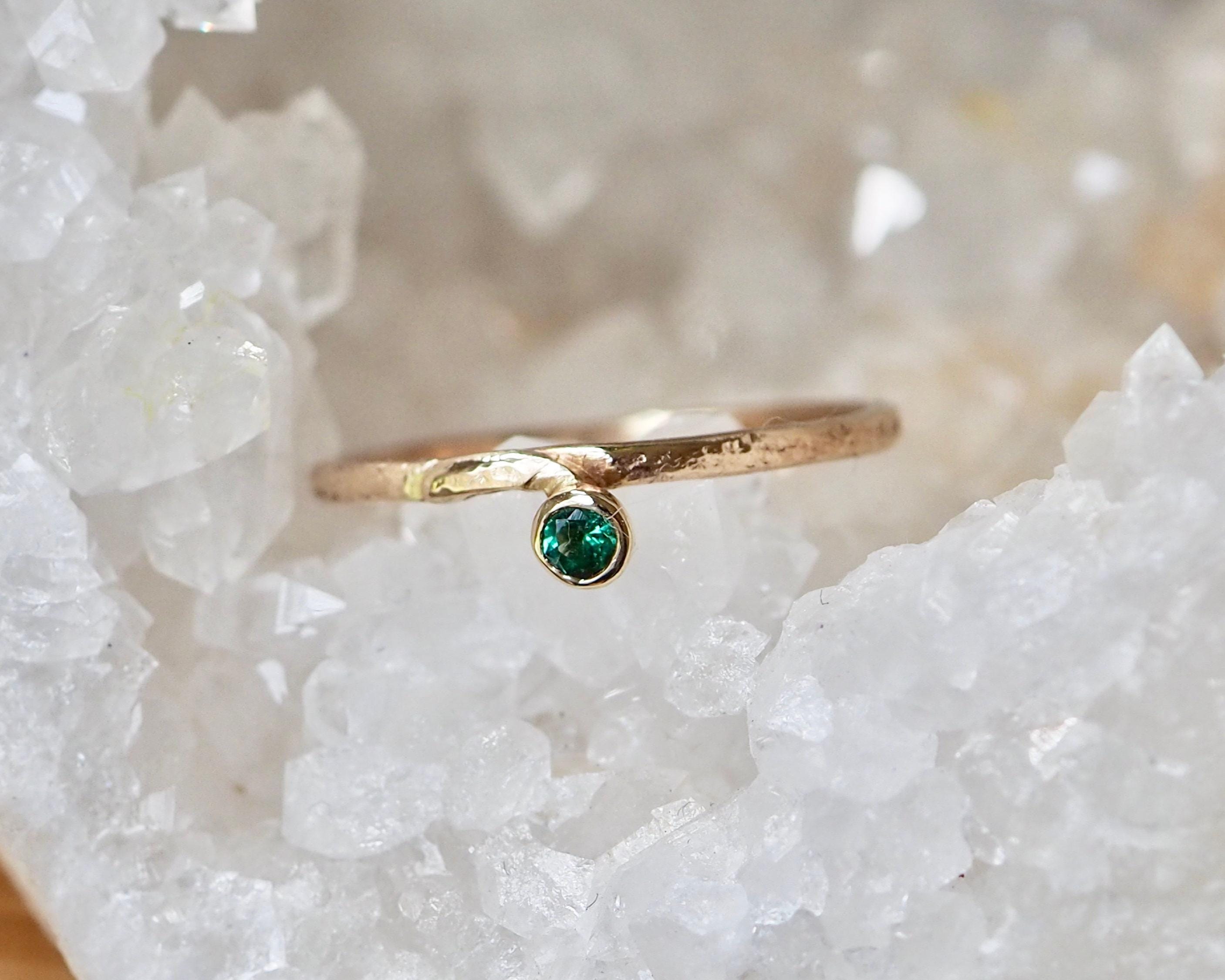 Bright green, sparkly emerald is set in an open back bezel at the tip of a little sprout, and paired with a 1.3mm band. The 2.5mm natural emerald is a cheerful shade of green. The band is textured by hand to resemble the stem of a plant. Lovely worn alone or in your favorite stack. Please see photos of this ring styled in a stack with other gold rings available in my shop :)