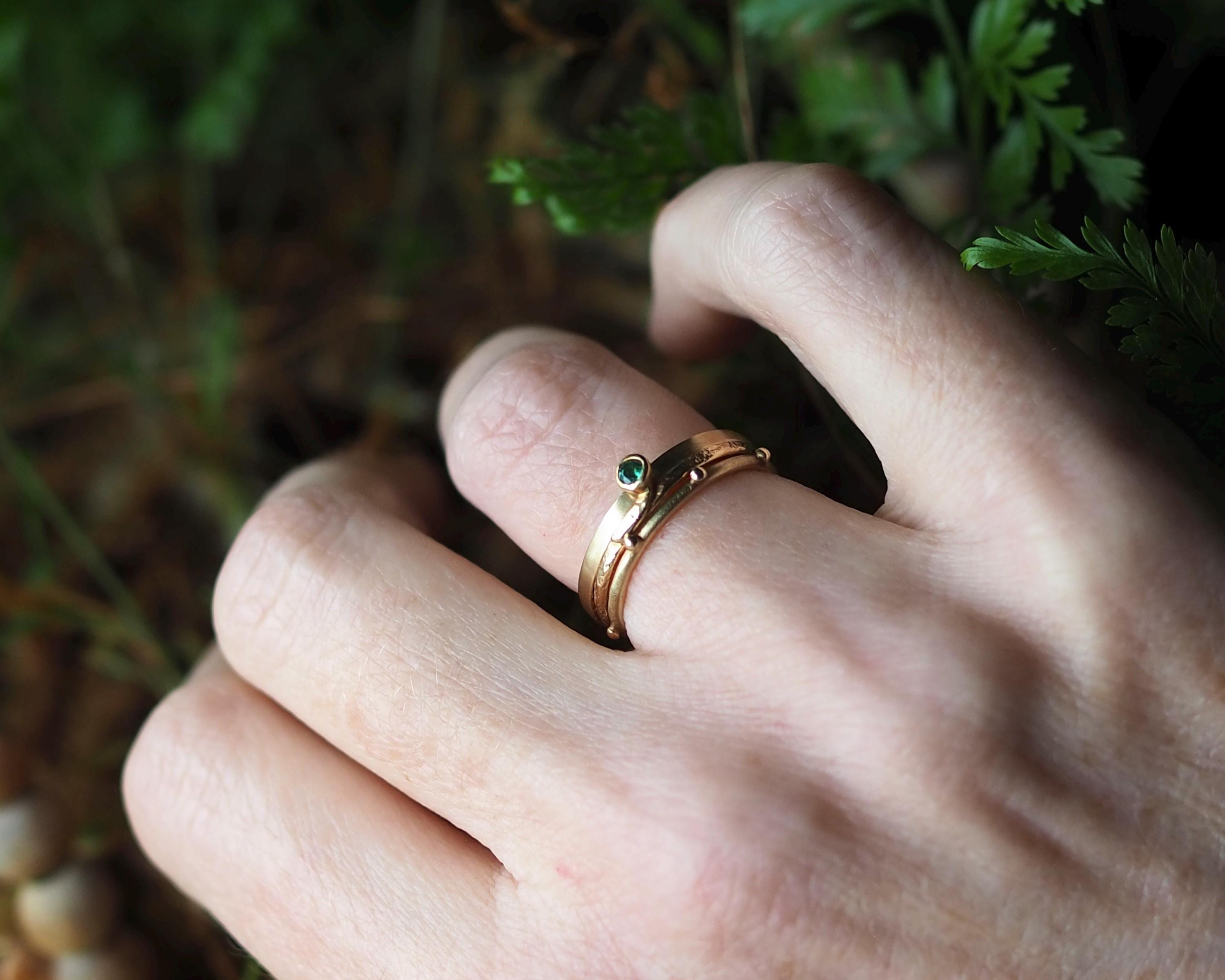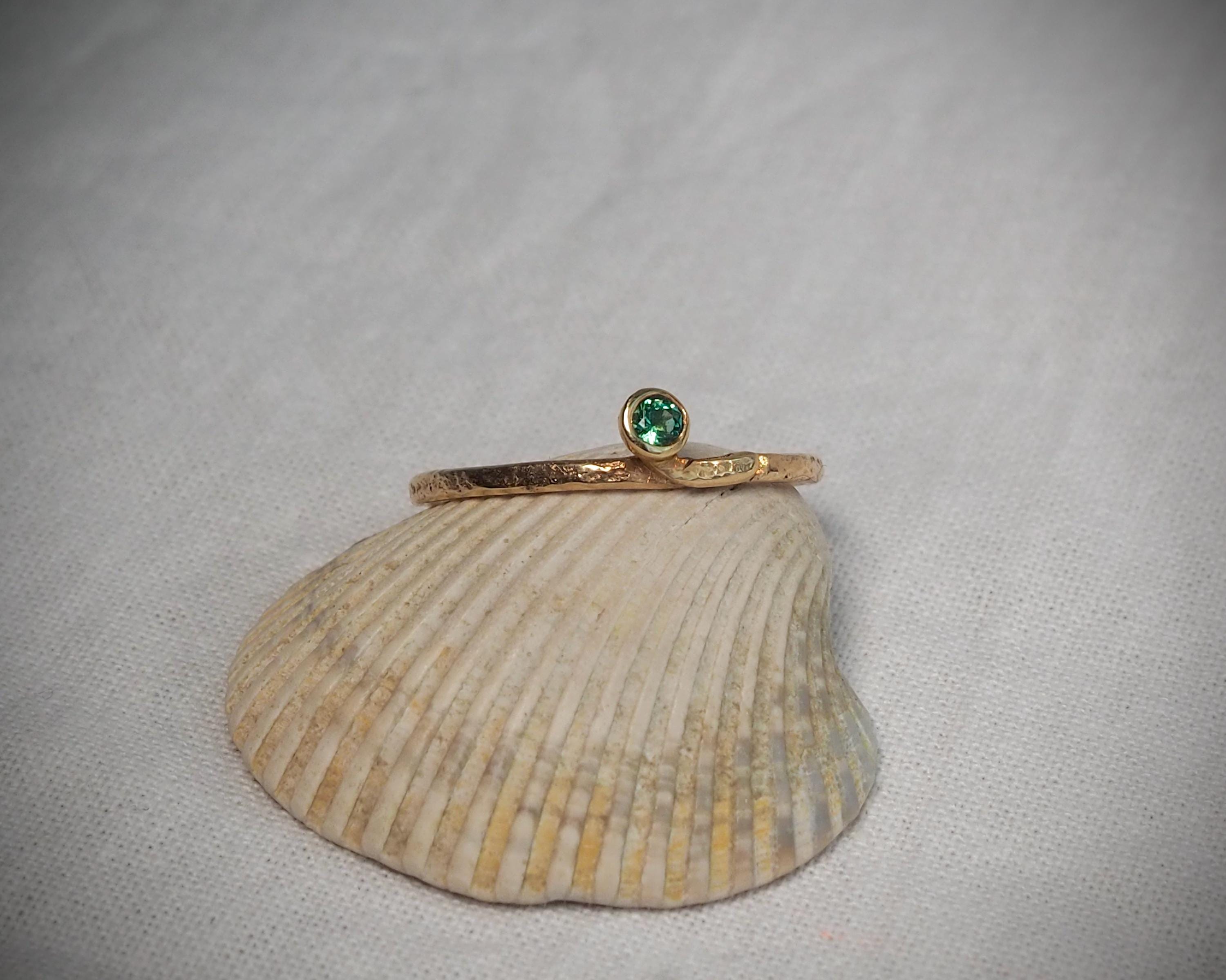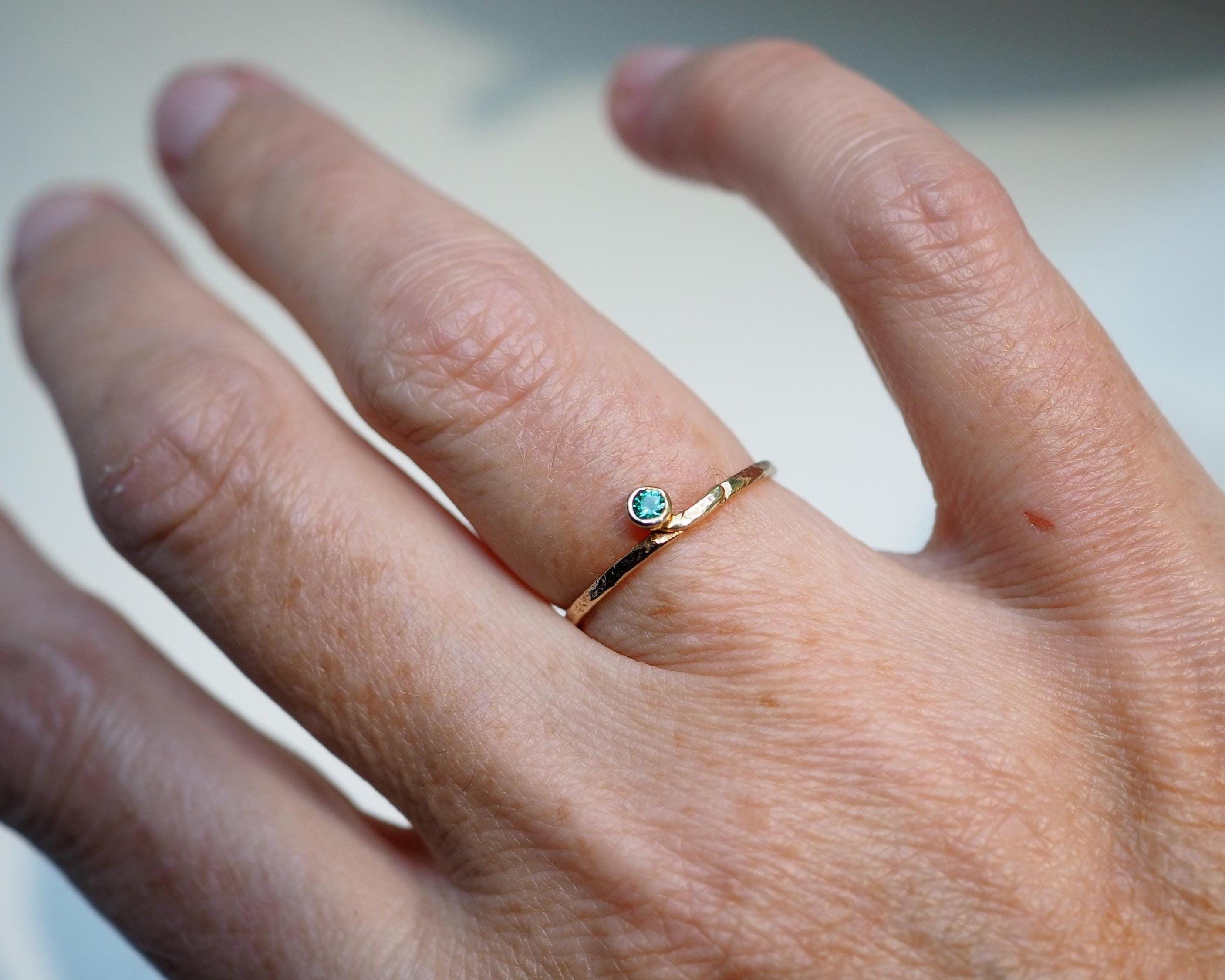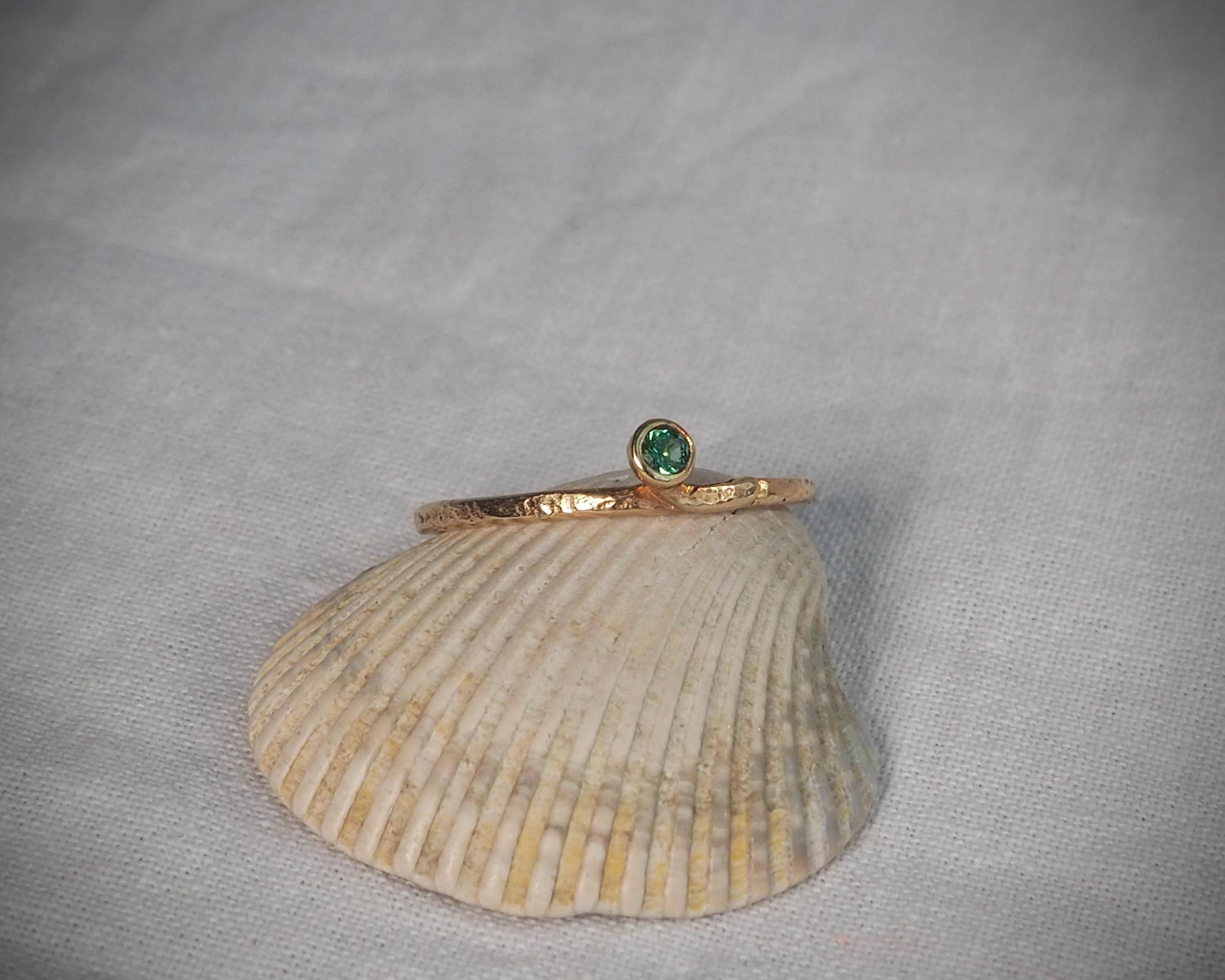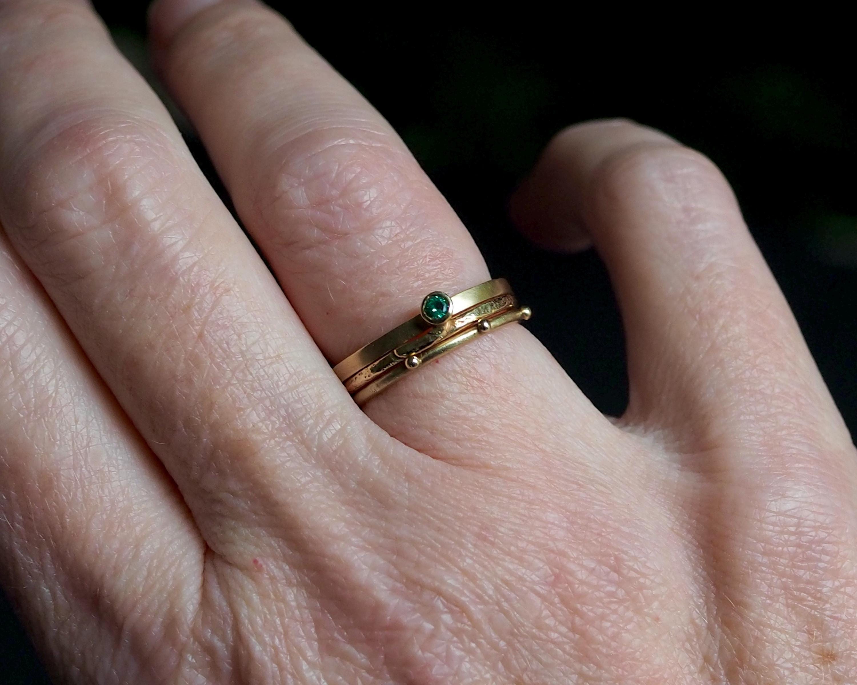 Bright green, sparkly emerald is set in an open back bezel at the tip of a little sprout, and paired with a 1.3mm band. The 2.5mm natural emerald is a cheerful shade of green. The band is textured by hand to resemble the stem of a plant. Lovely worn alone or in your favorite stack. Please see photos of this ring styled in a stack with other gold rings available in my shop :)