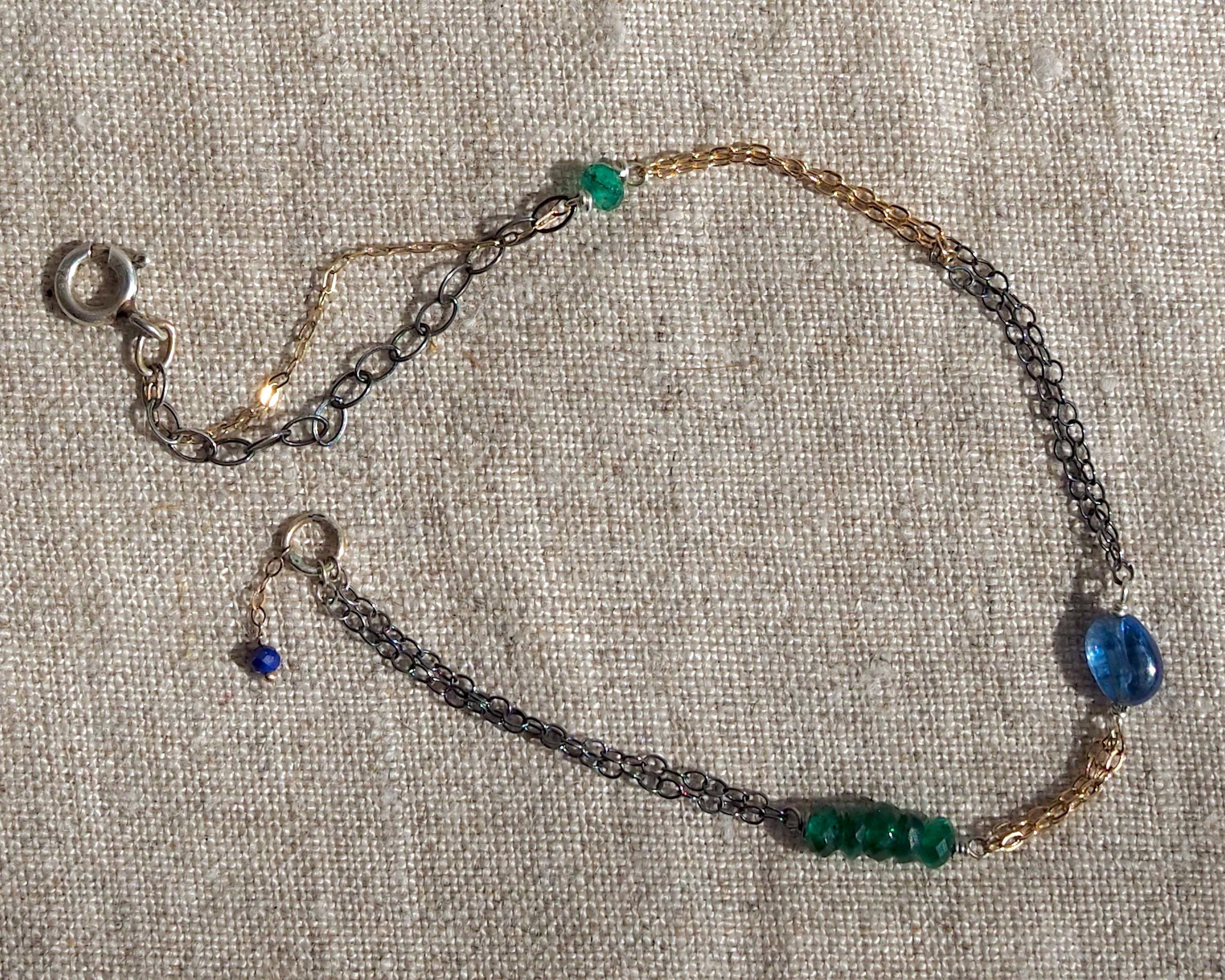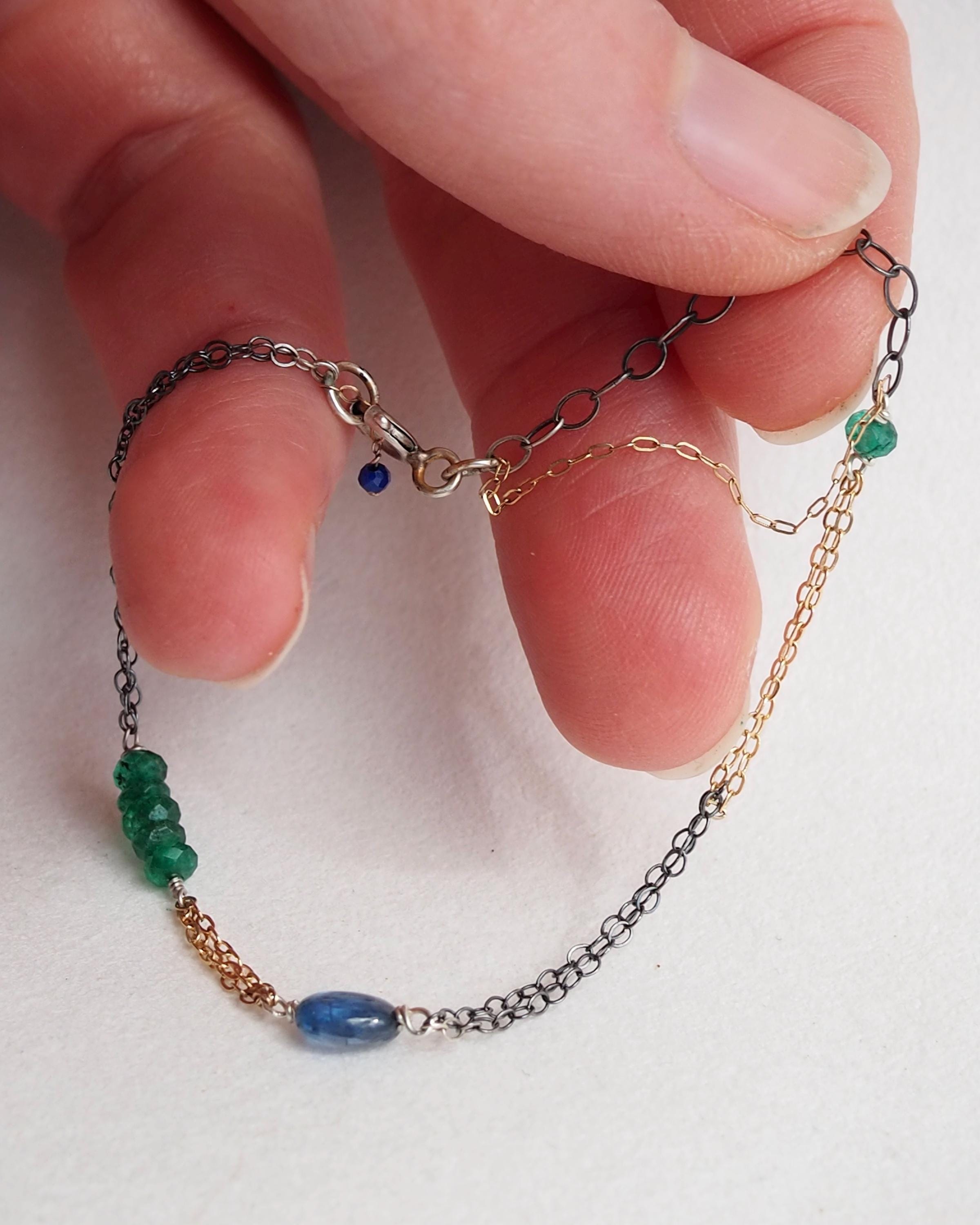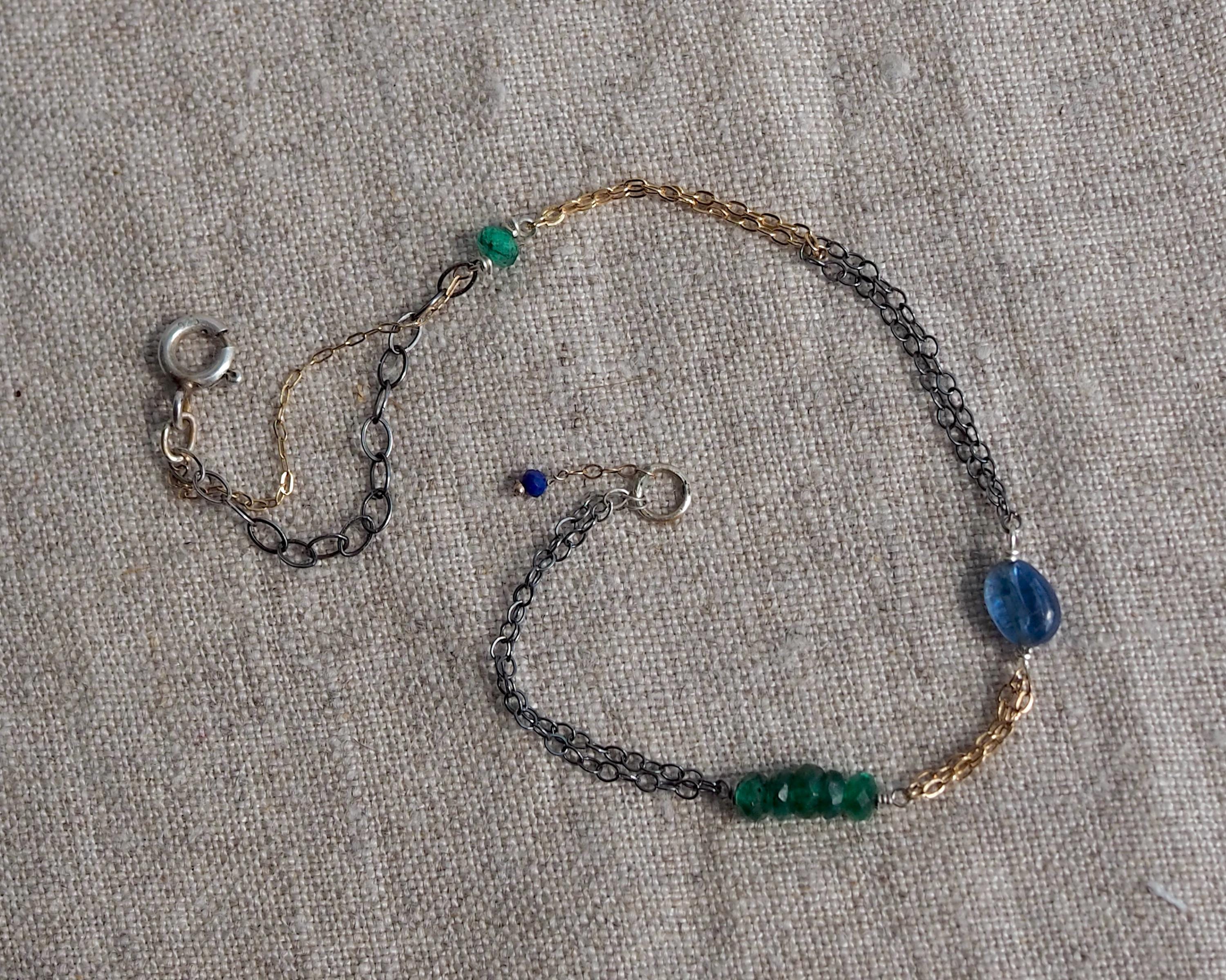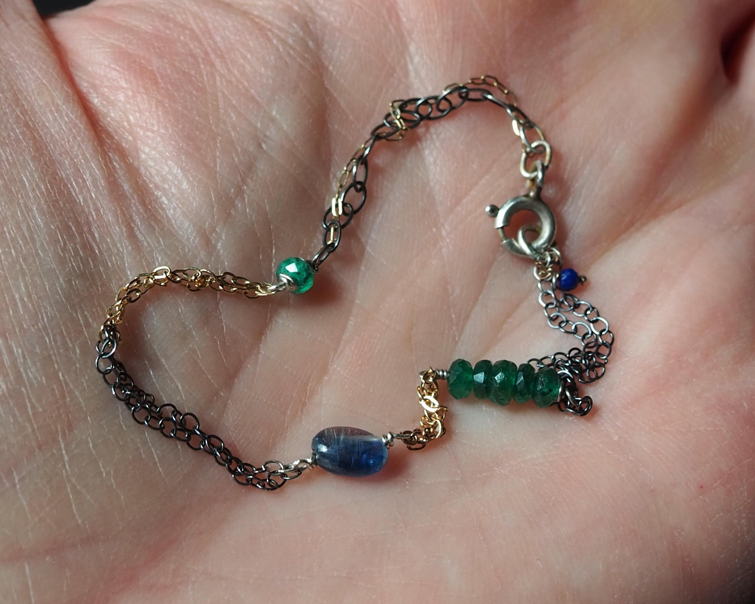 Multiple 14k gold and darkened sterling silver chains are intertwined together with beautiful little gems; vivid green faceted emerald rondelles, a smooth oval blue kyanite, and tiniest little faceted lapis lazuli dangle attached to the end jump ring. The emeralds are approximately 3x2mm, the kyanite is 6x4mm, and the lapis lazuli bead measures 2mm.
