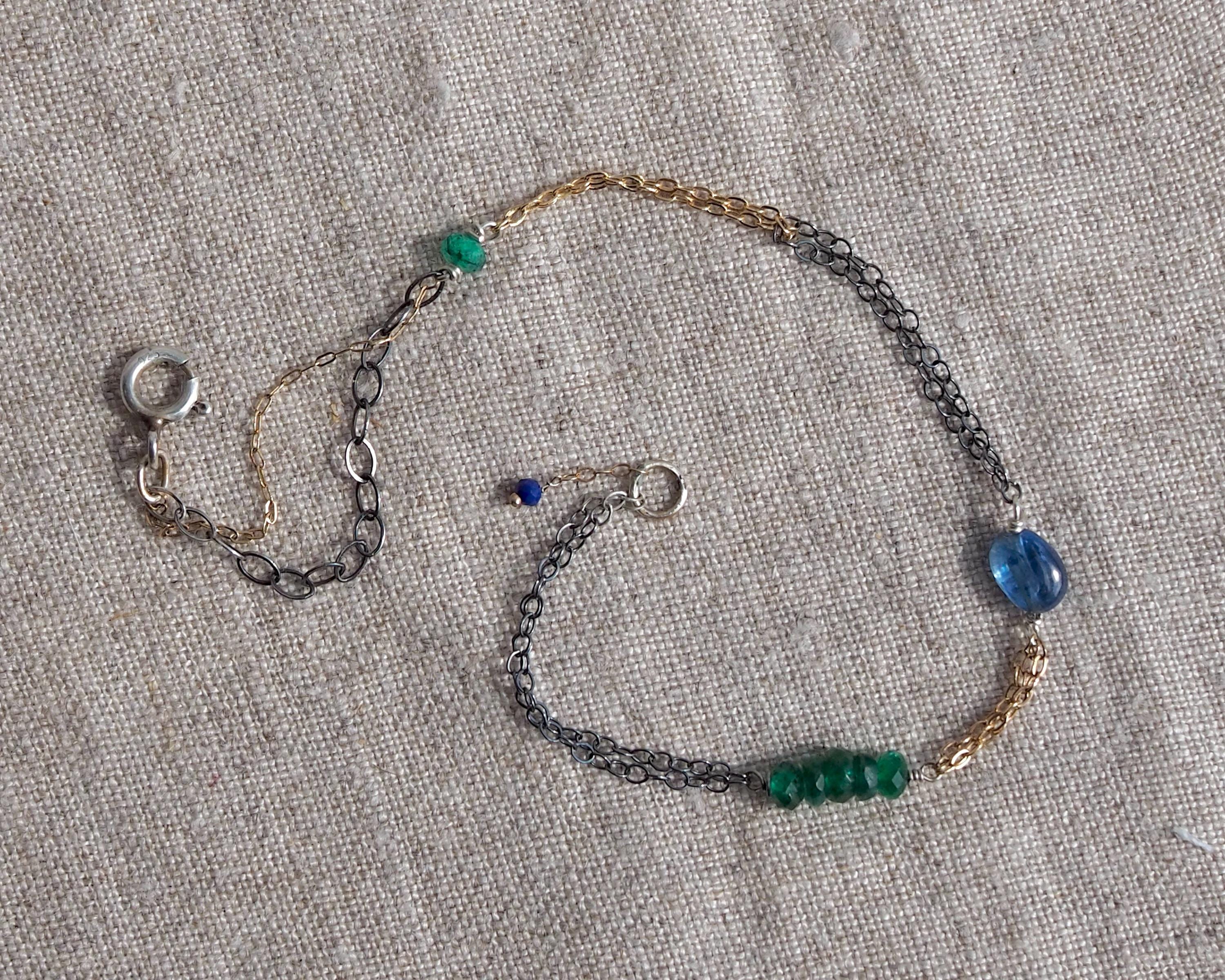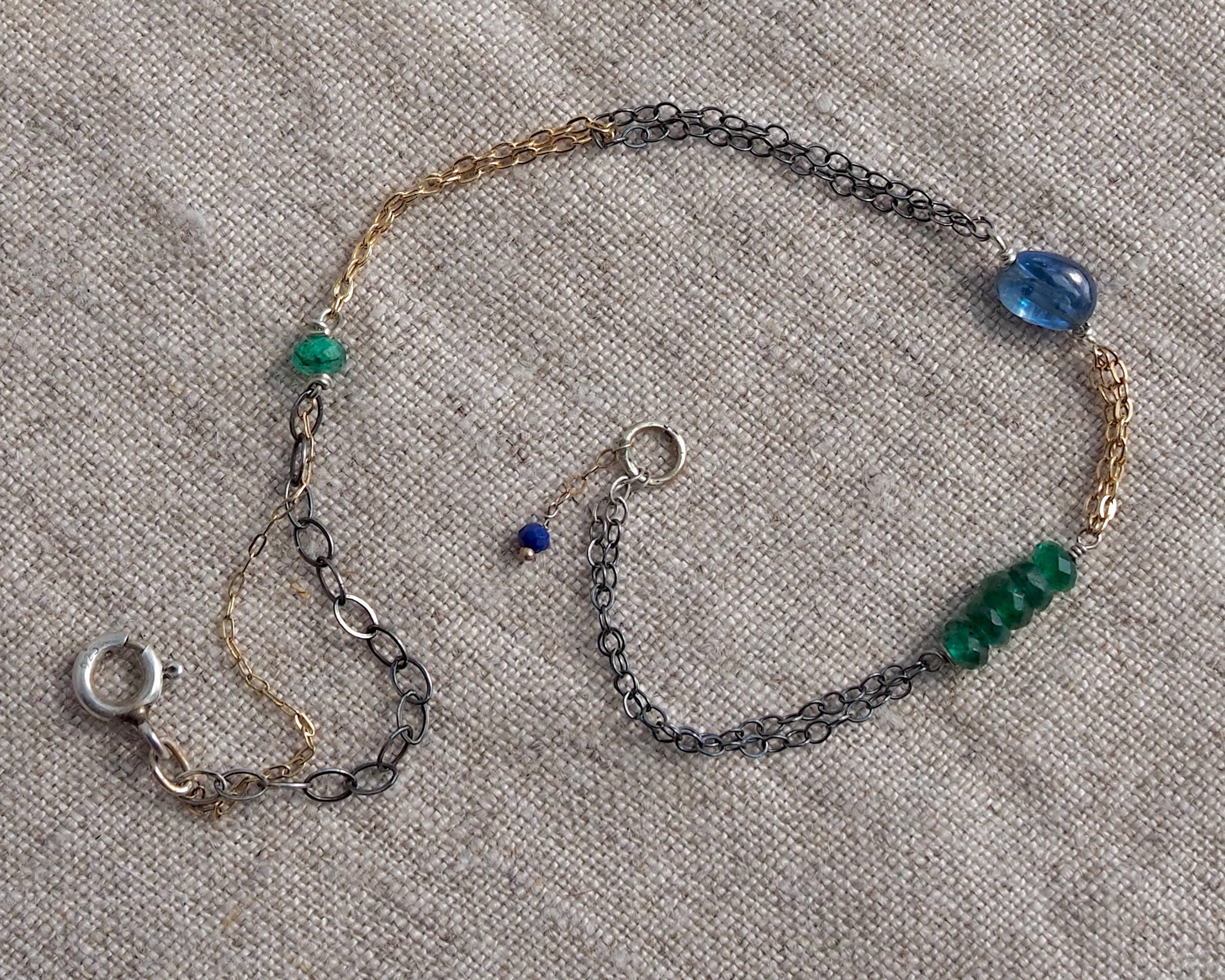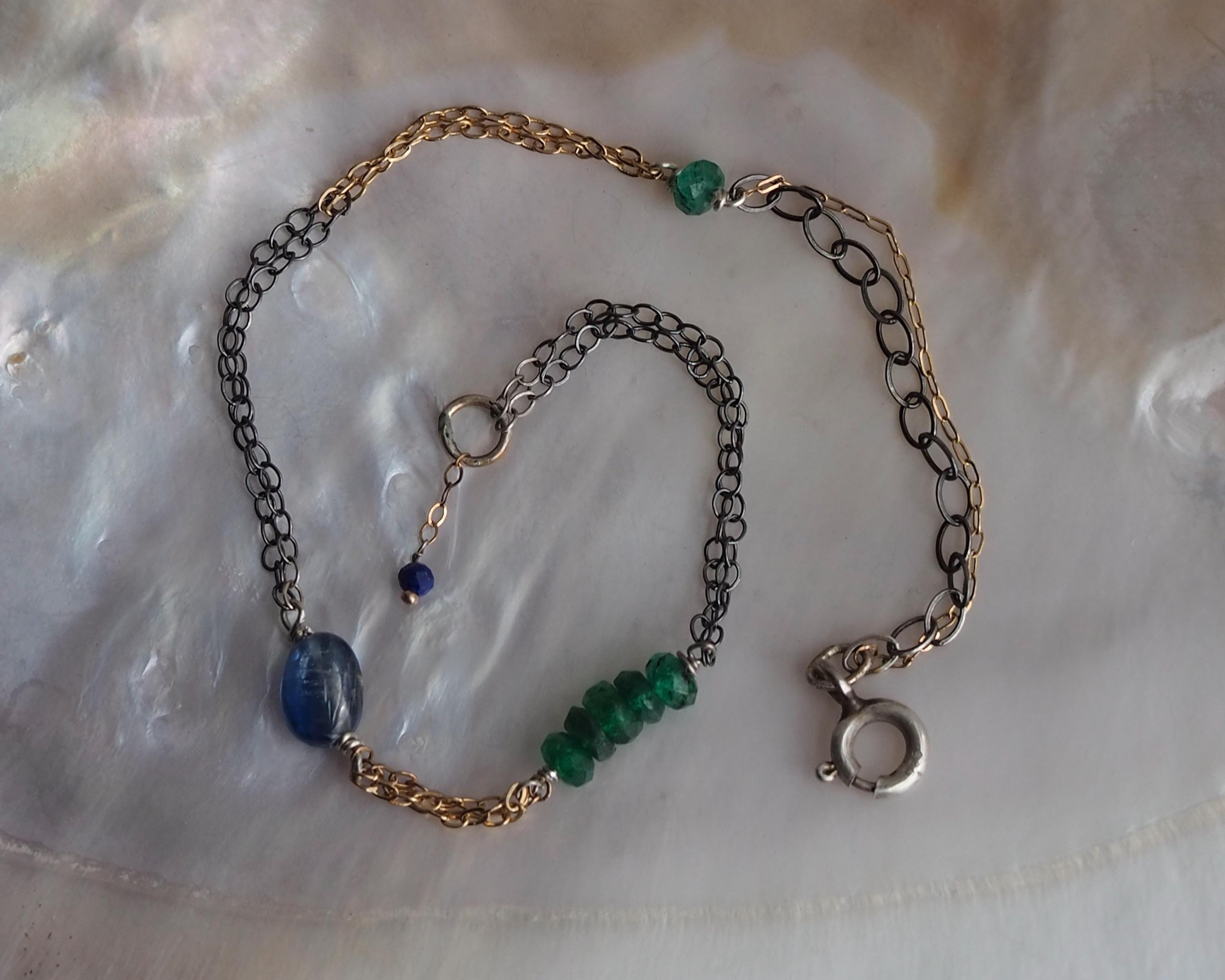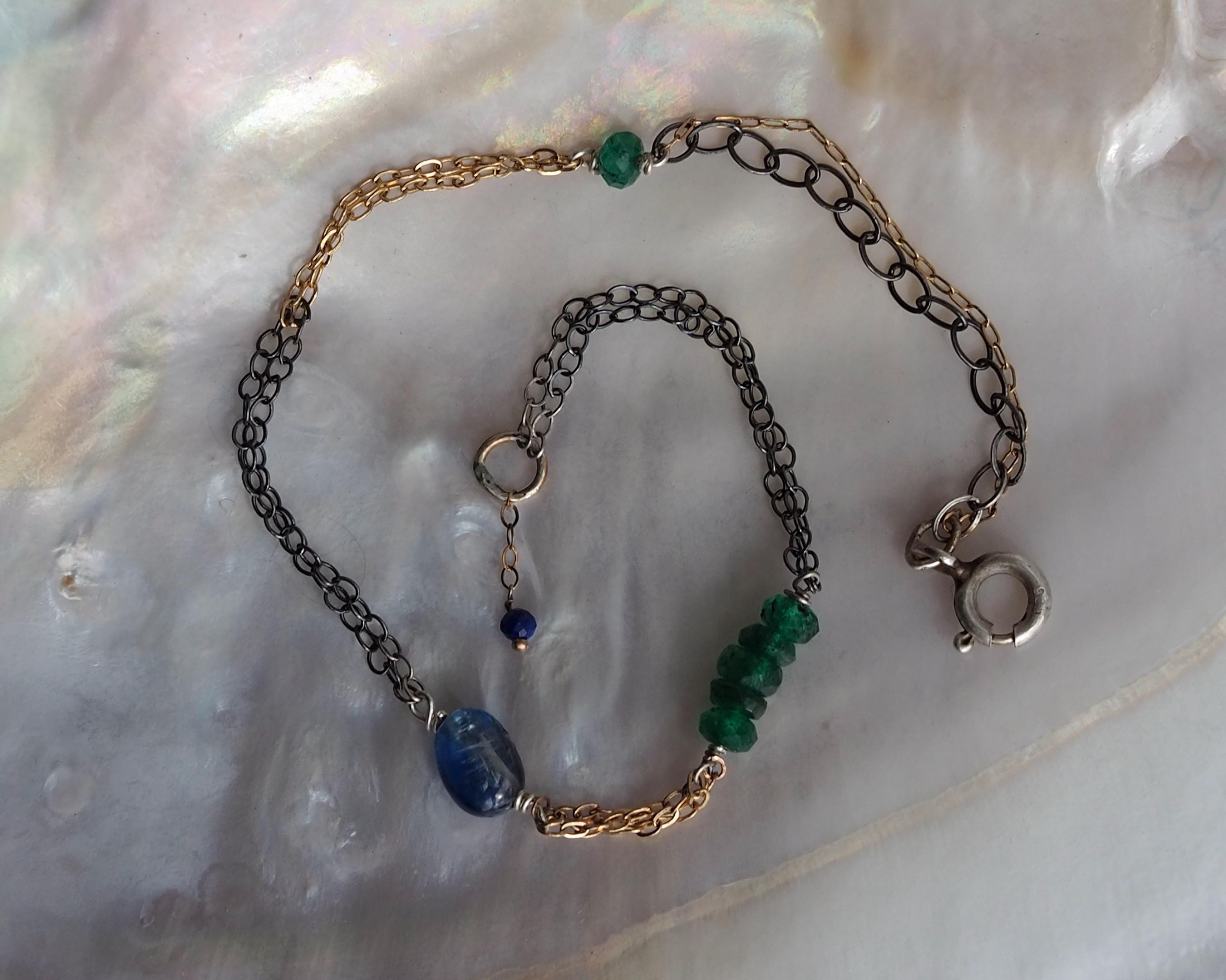 Multiple 14k gold and darkened sterling silver chains are intertwined together with beautiful little gems; vivid green faceted emerald rondelles, a smooth oval blue kyanite, and tiniest little faceted lapis lazuli dangle attached to the end jump ring. The emeralds are approximately 3x2mm, the kyanite is 6x4mm, and the lapis lazuli bead measures 2mm.
