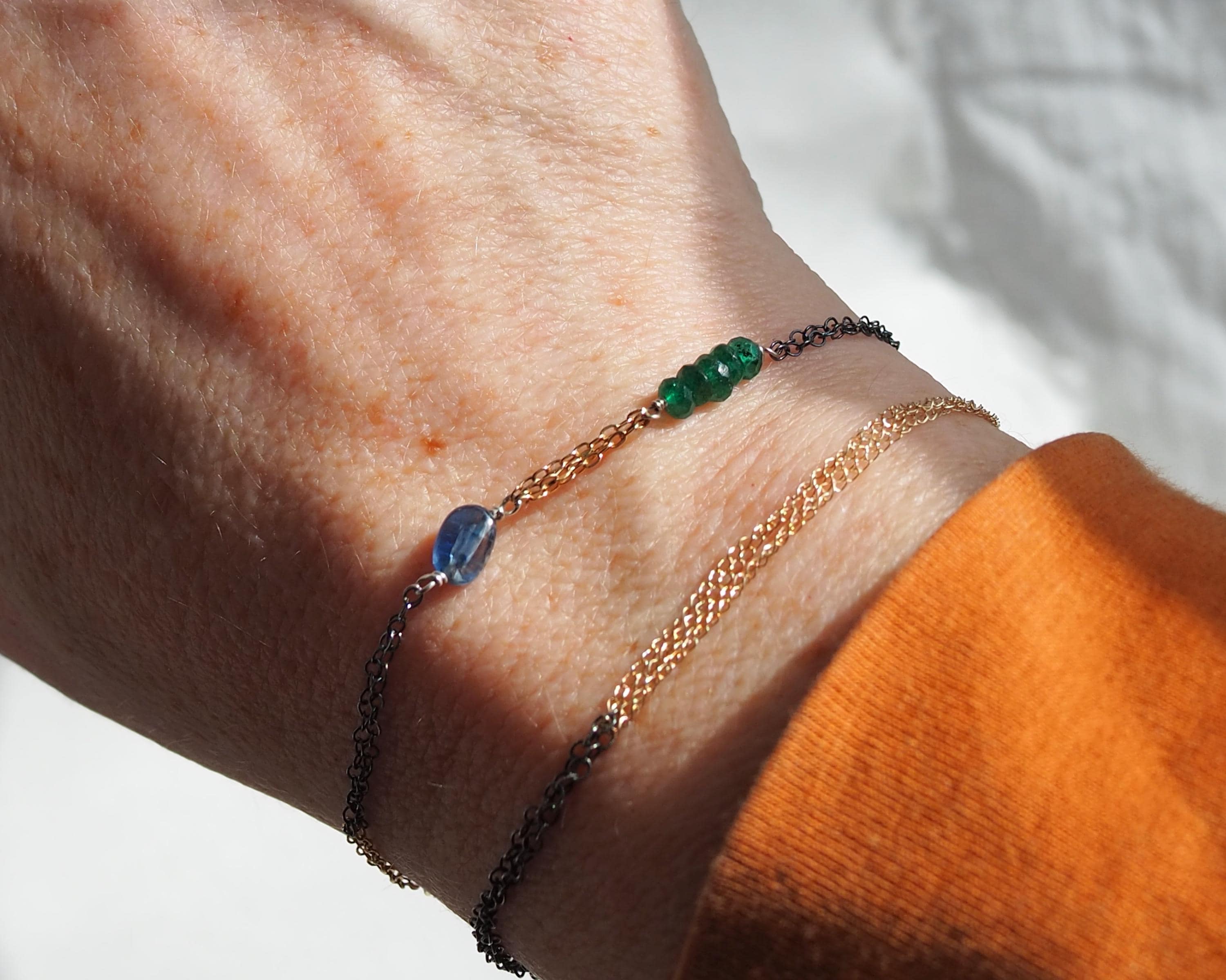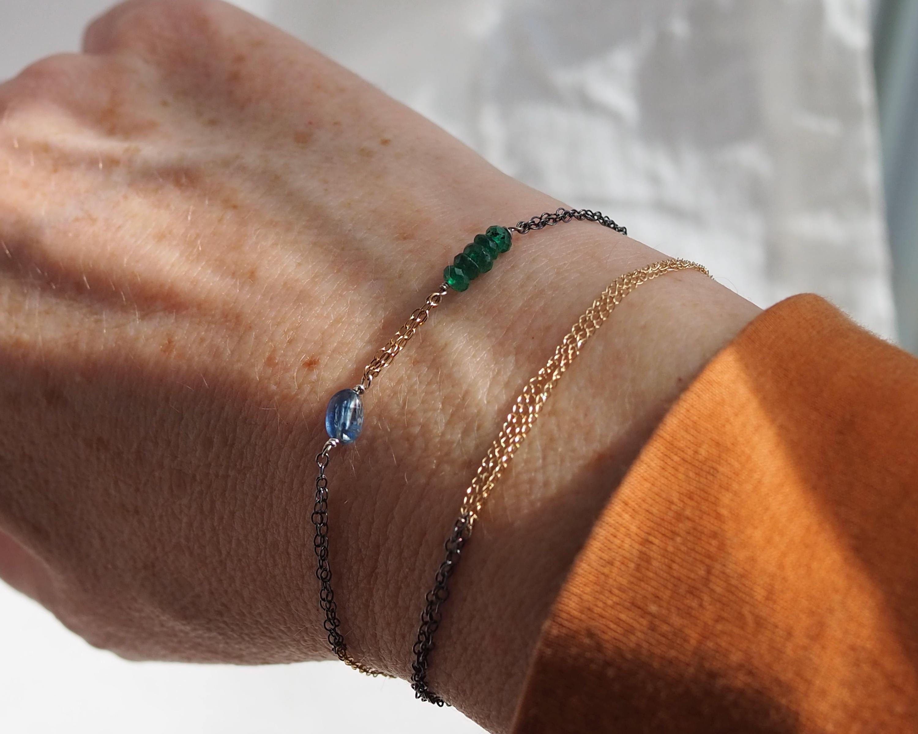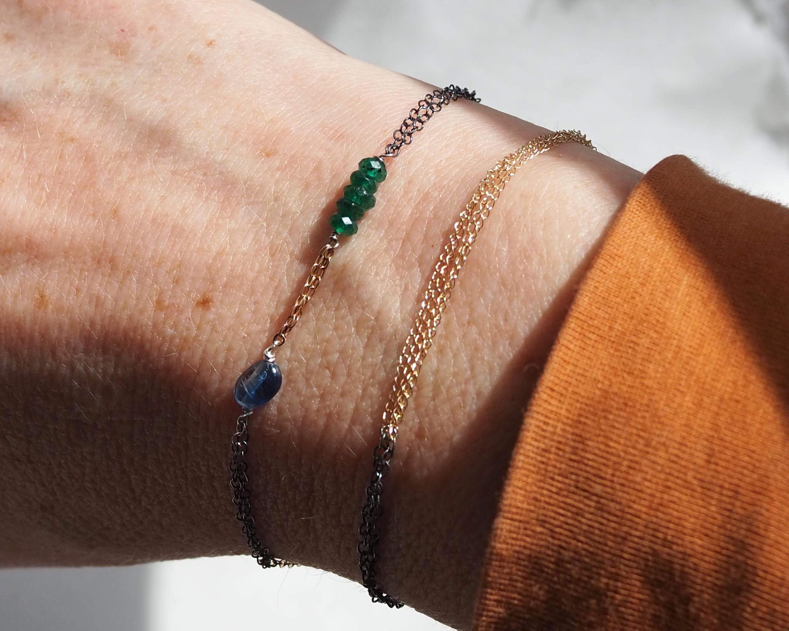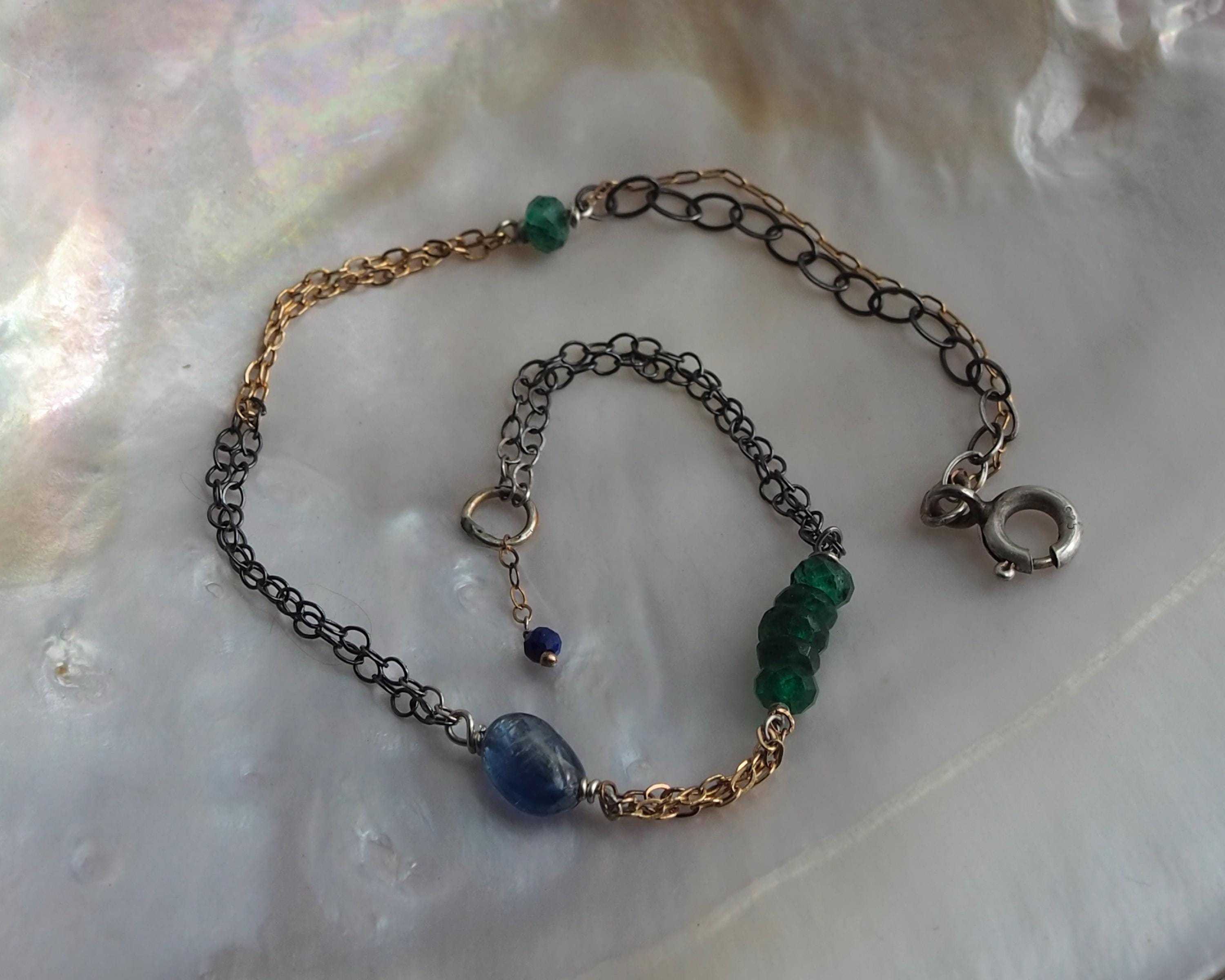 Multiple 14k gold and darkened sterling silver chains are intertwined together with beautiful little gems; vivid green faceted emerald rondelles, a smooth oval blue kyanite, and tiniest little faceted lapis lazuli dangle attached to the end jump ring. The emeralds are approximately 3x2mm, the kyanite is 6x4mm, and the lapis lazuli bead measures 2mm.