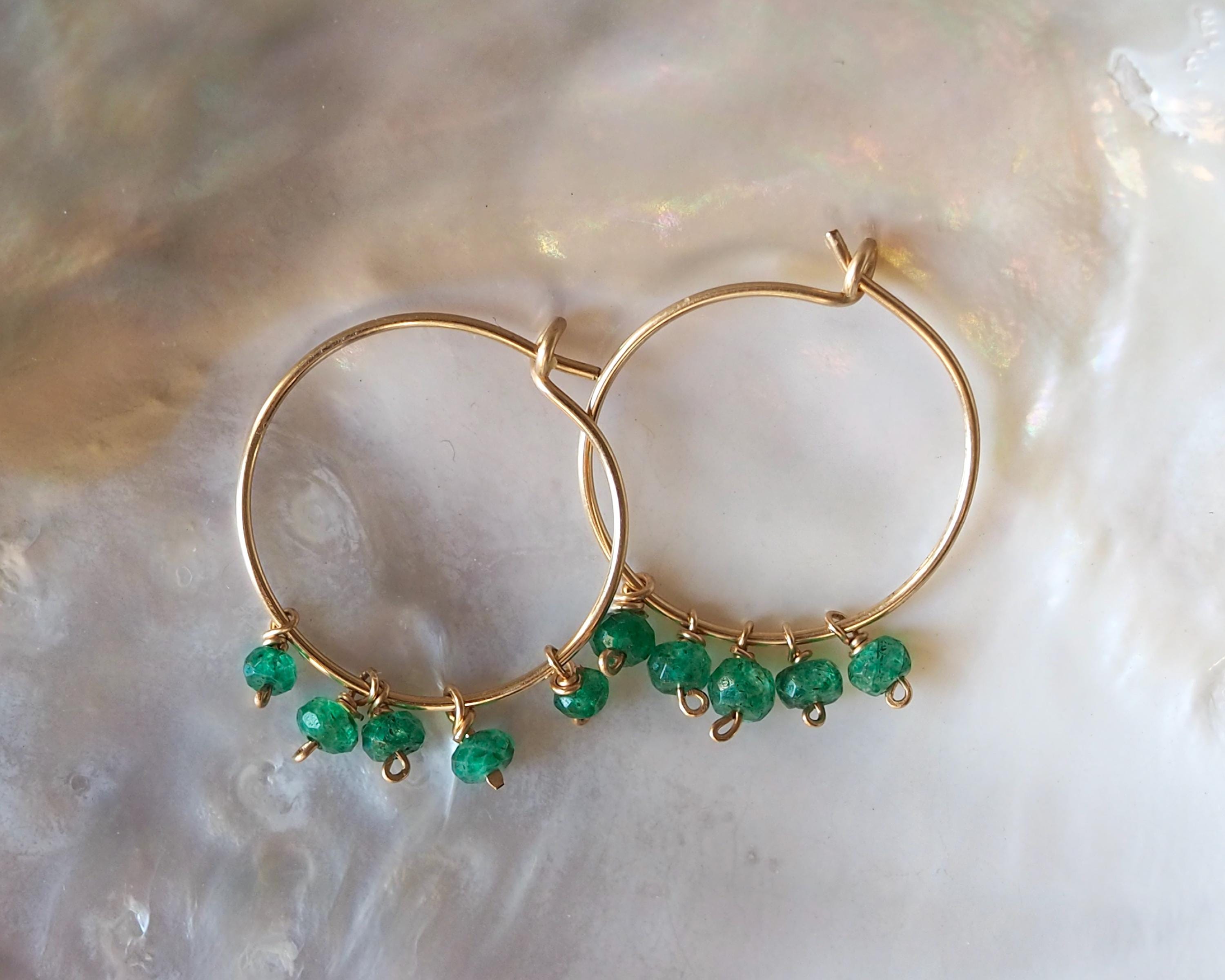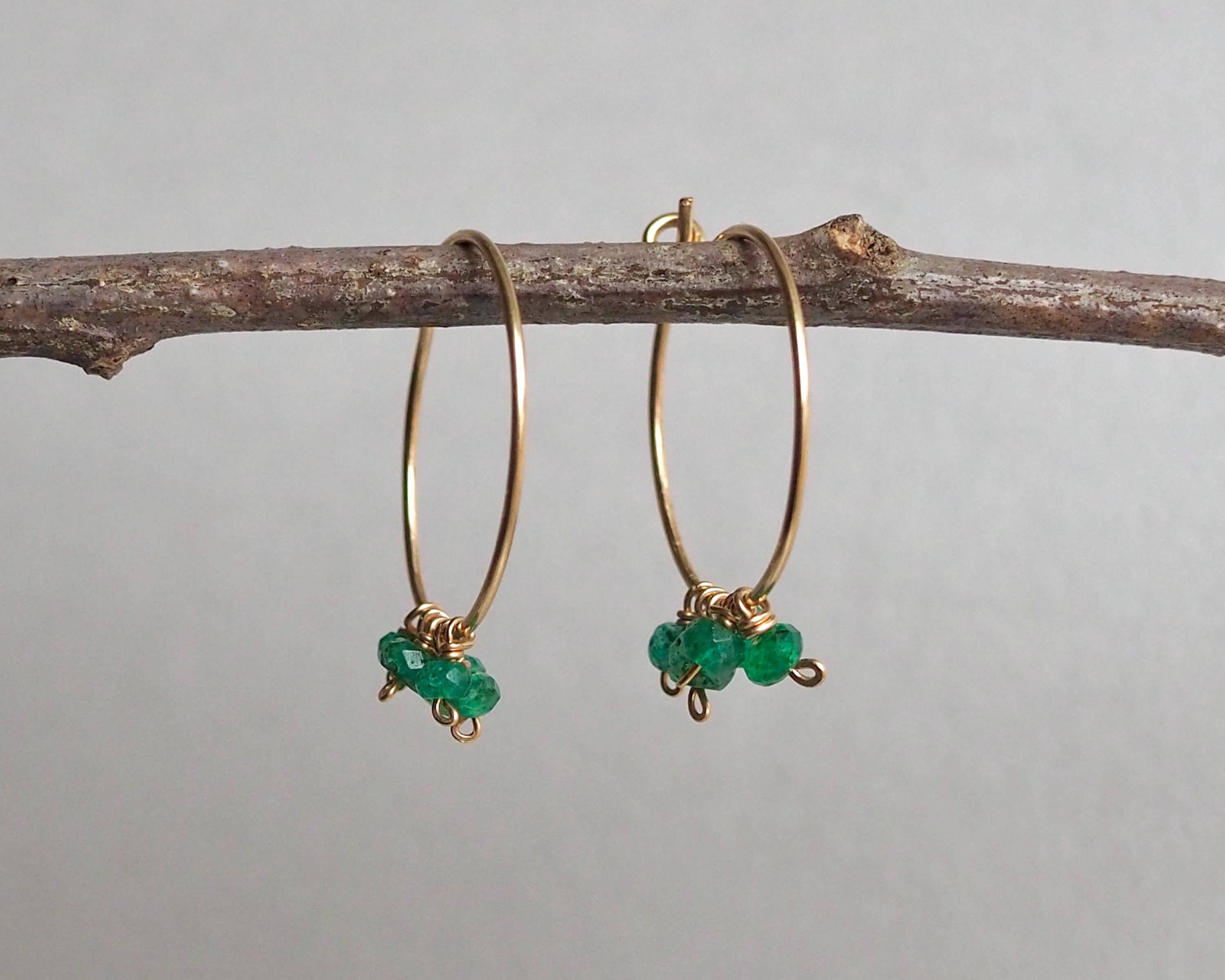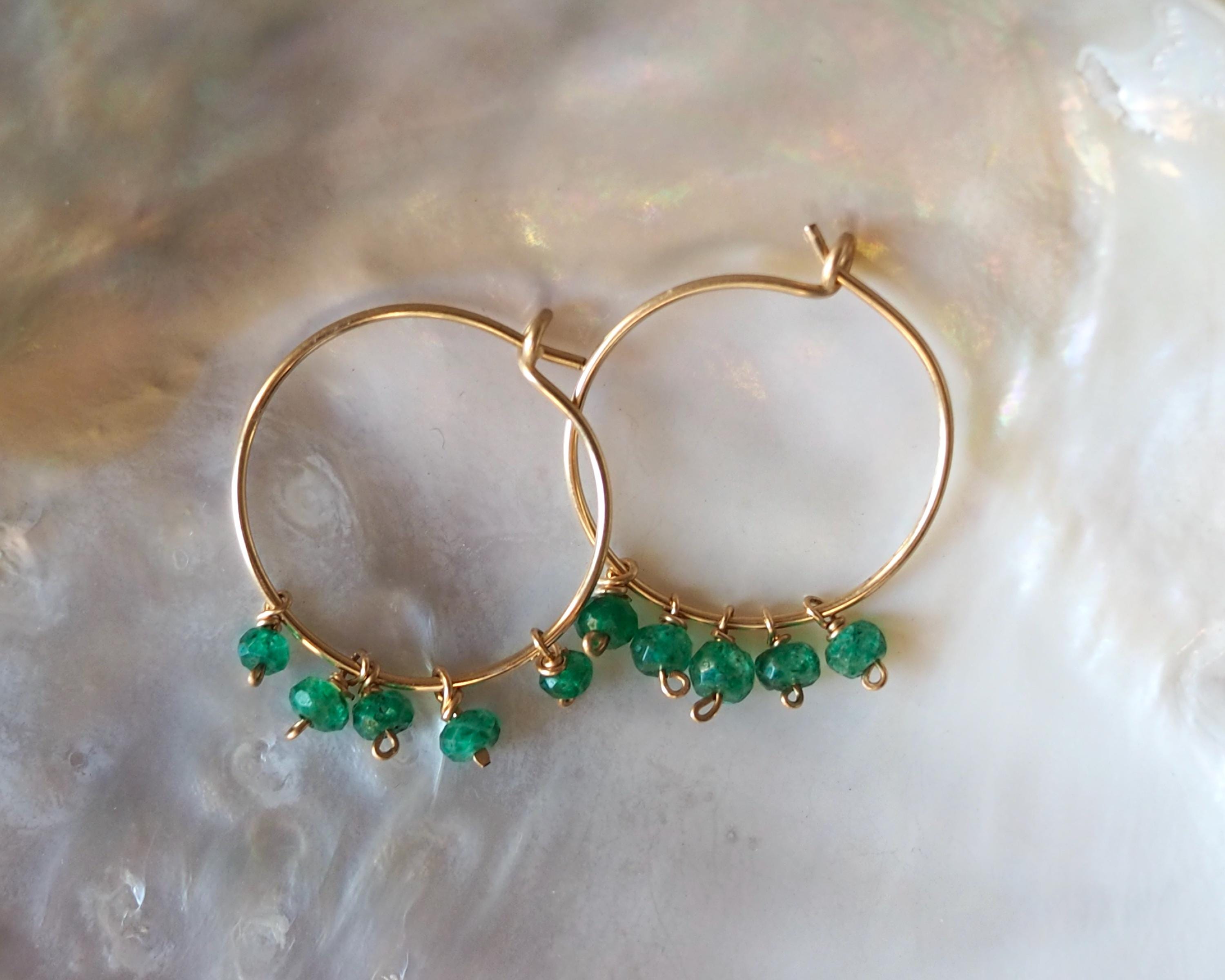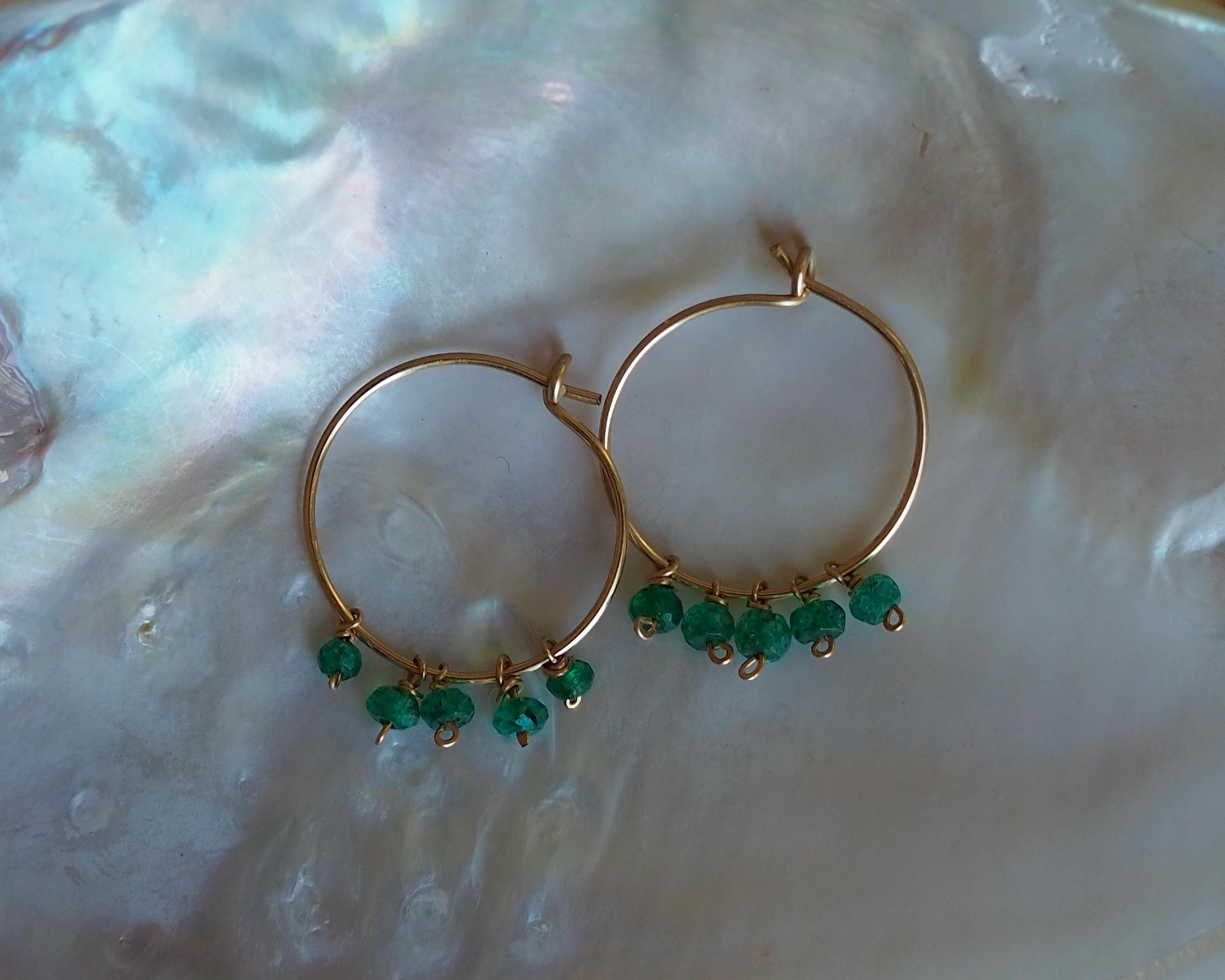 Each handmade gold filled hoop is adorned with five vibrant green emerald dangles. These beautiful, little faceted beads sparkle with the slightest move and add a lovely and cheerful pop of color.