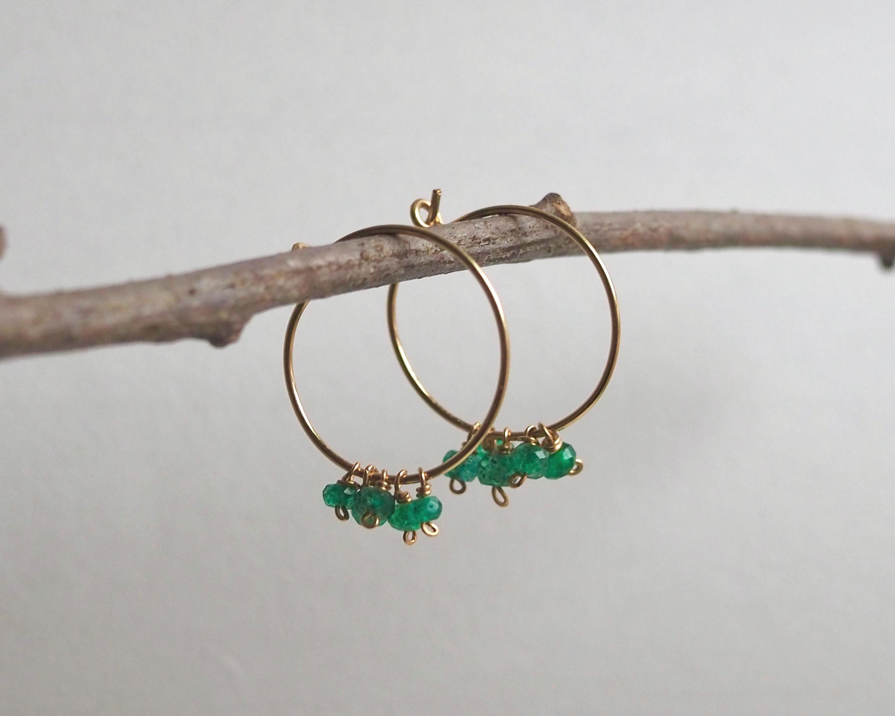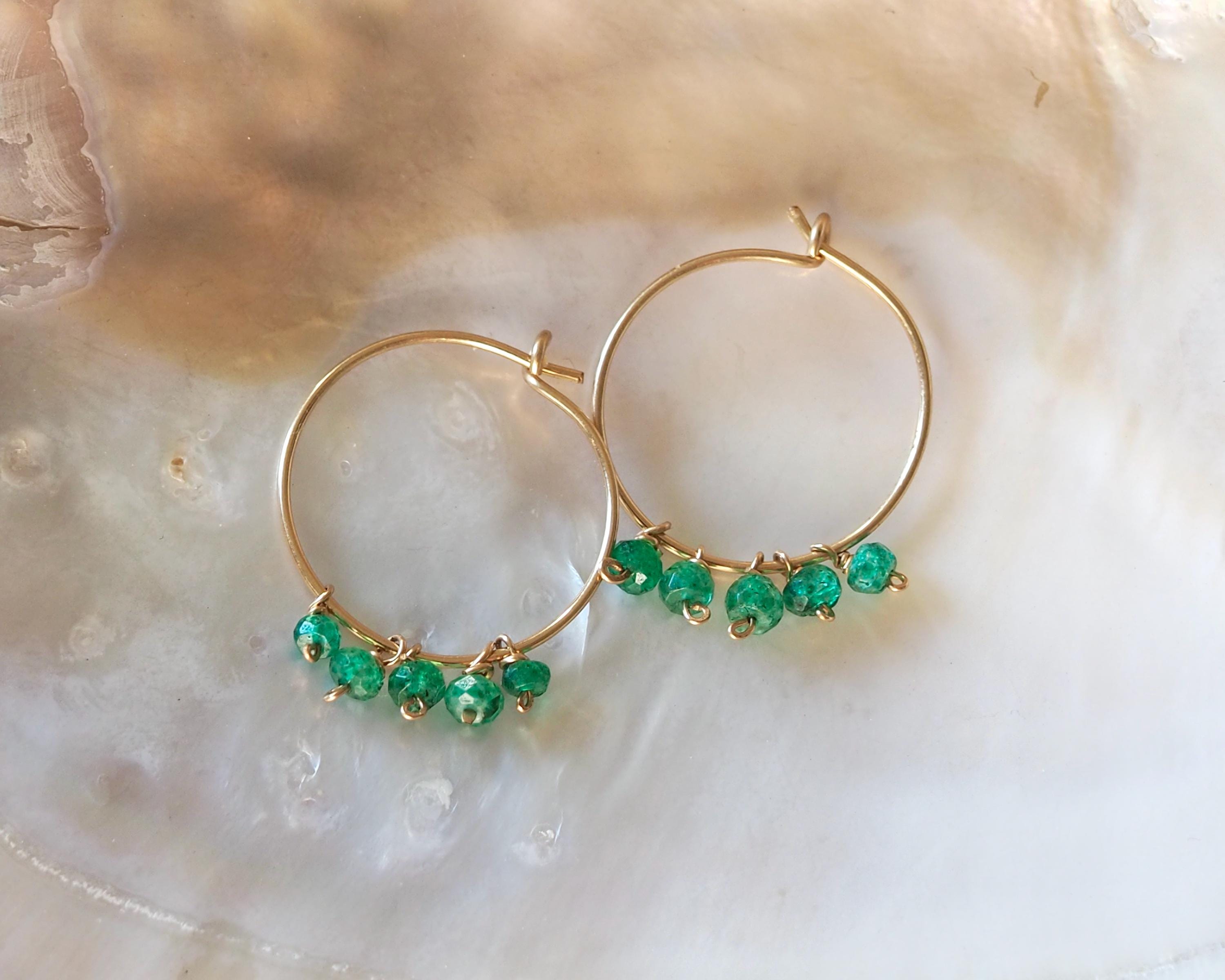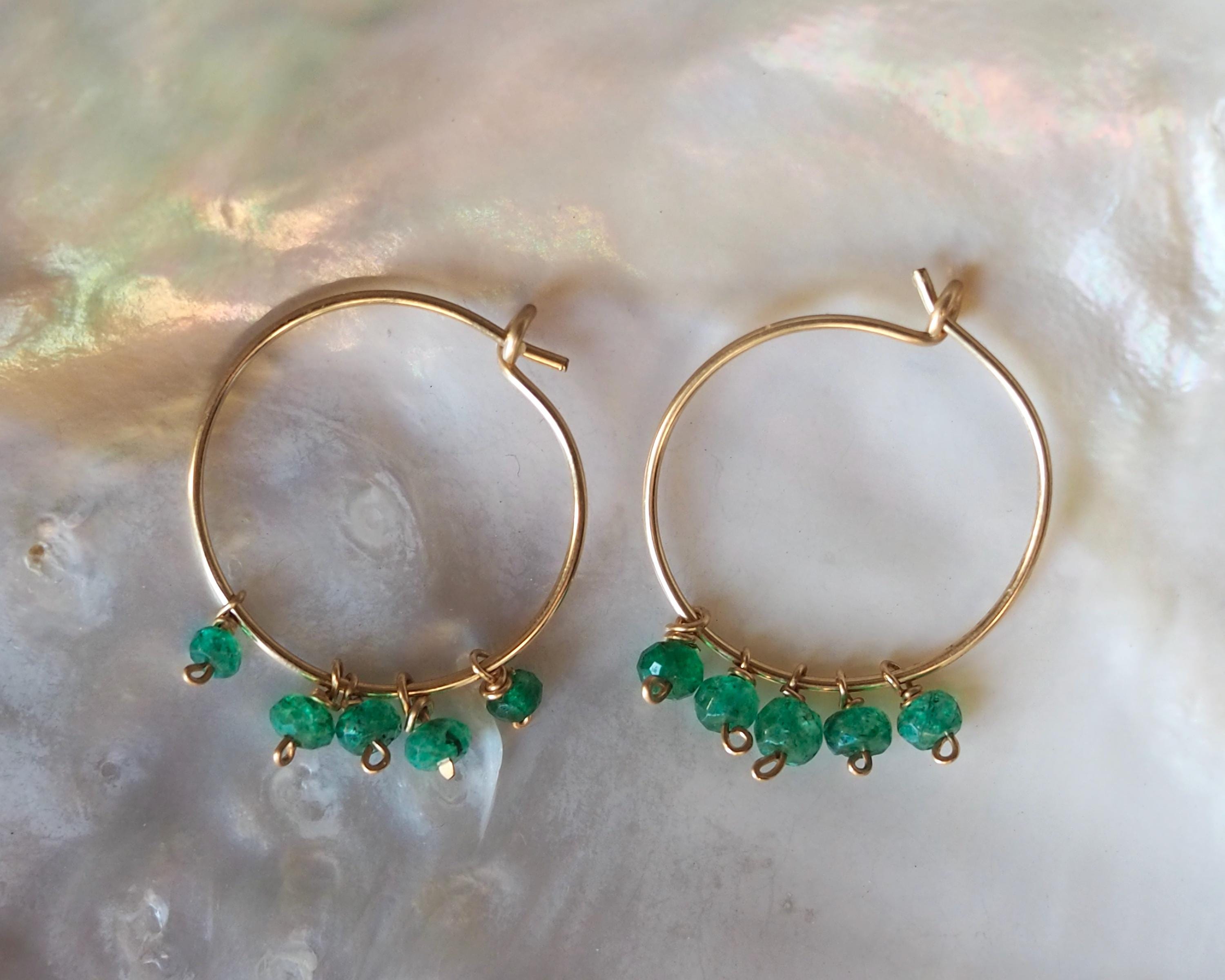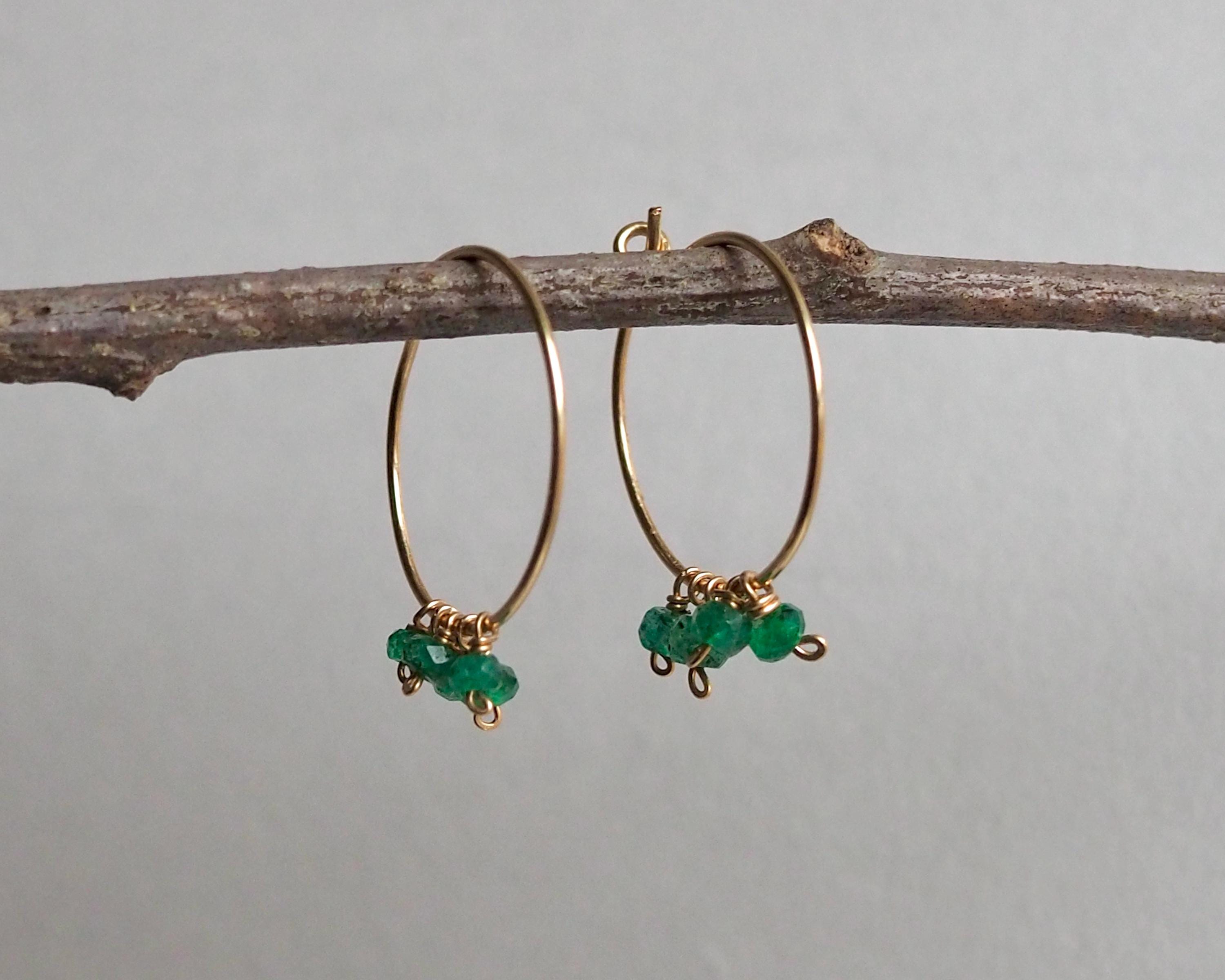 Each handmade gold filled hoop is adorned with five vibrant green emerald dangles. These beautiful, little faceted beads sparkle with the slightest move and add a lovely and cheerful pop of color.