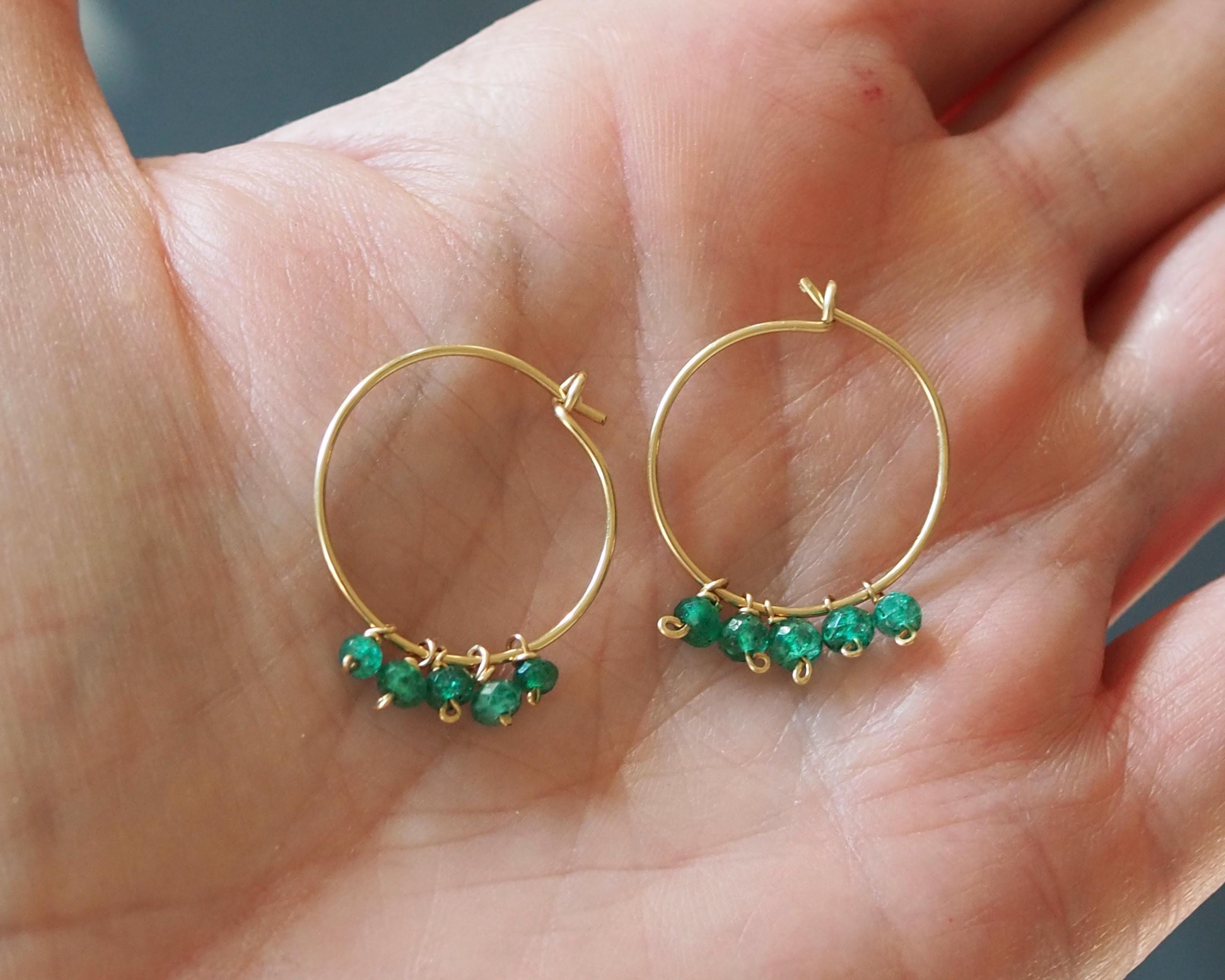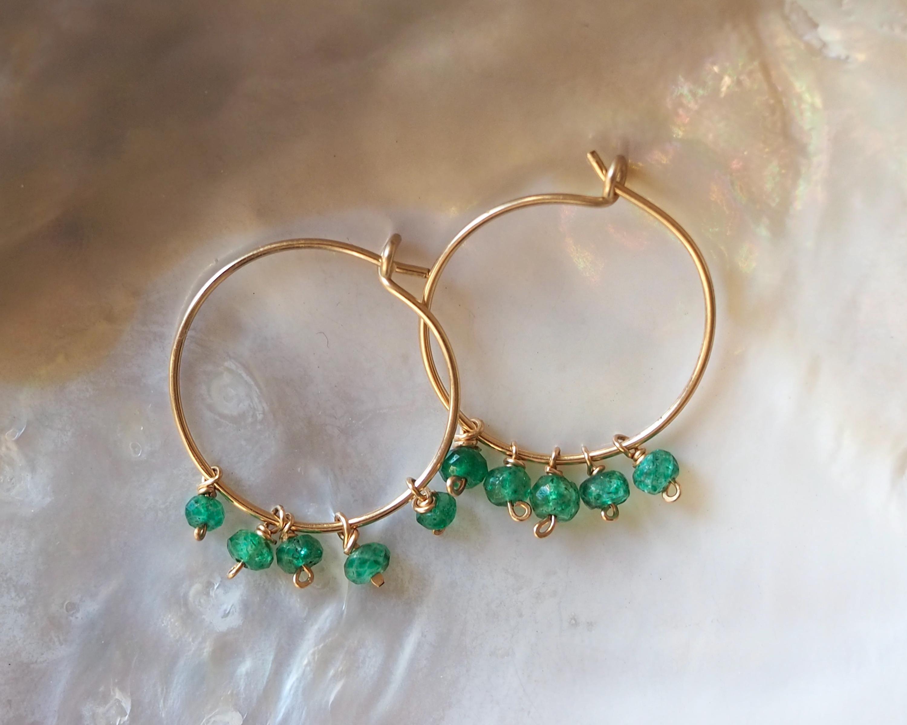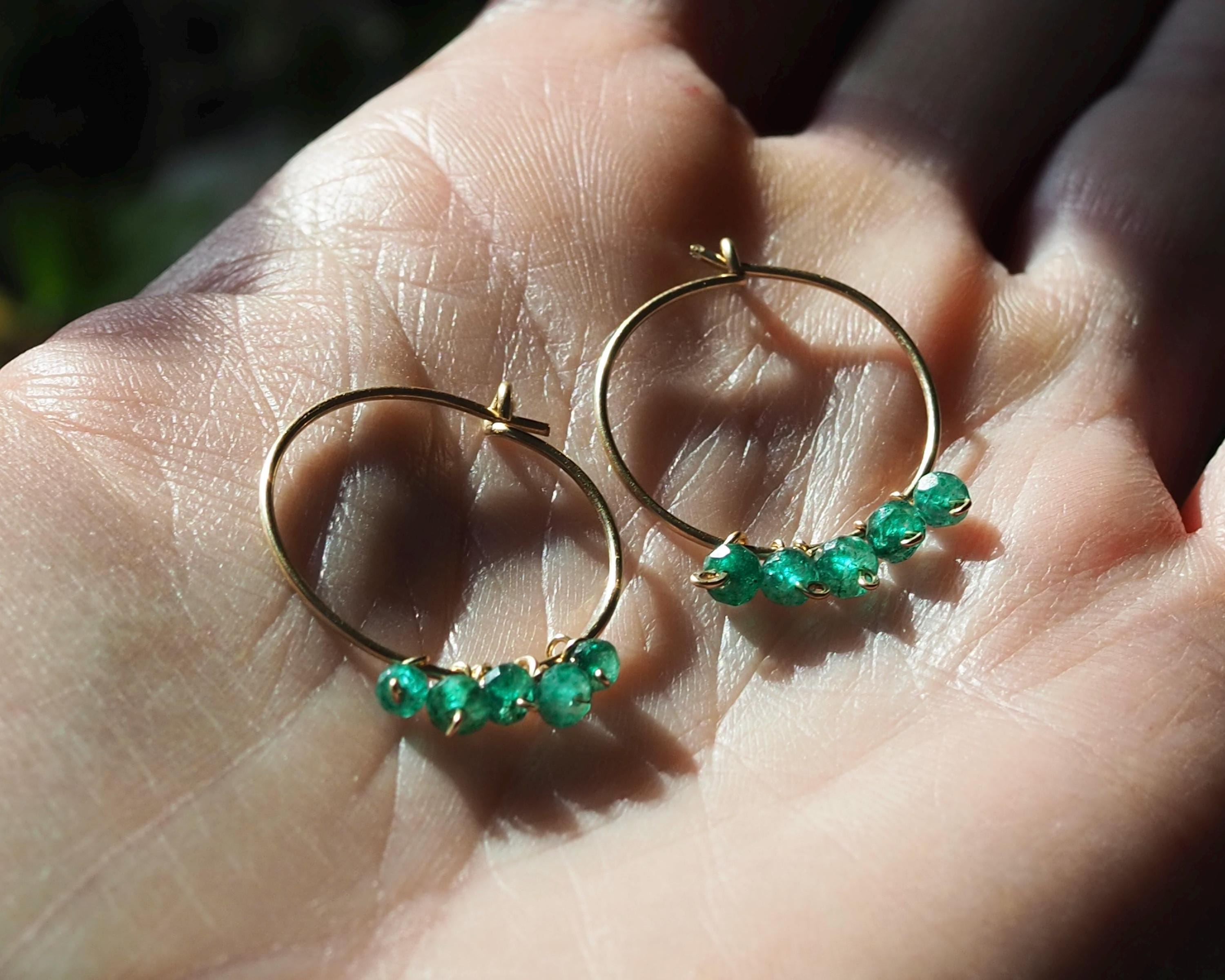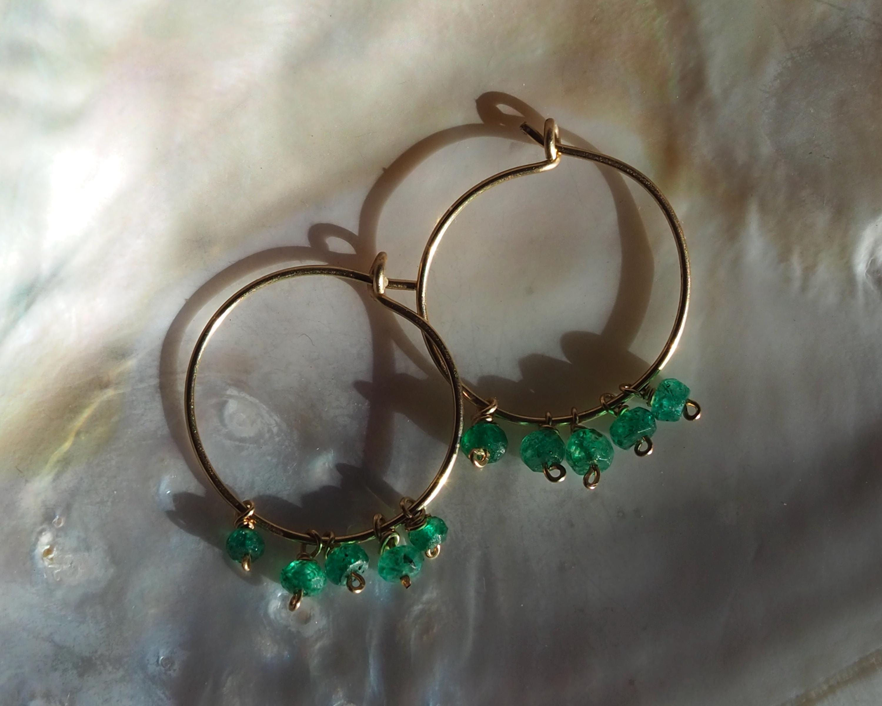 Each handmade gold filled hoop is adorned with five vibrant green emerald dangles. These beautiful, little faceted beads sparkle with the slightest move and add a lovely and cheerful pop of color.